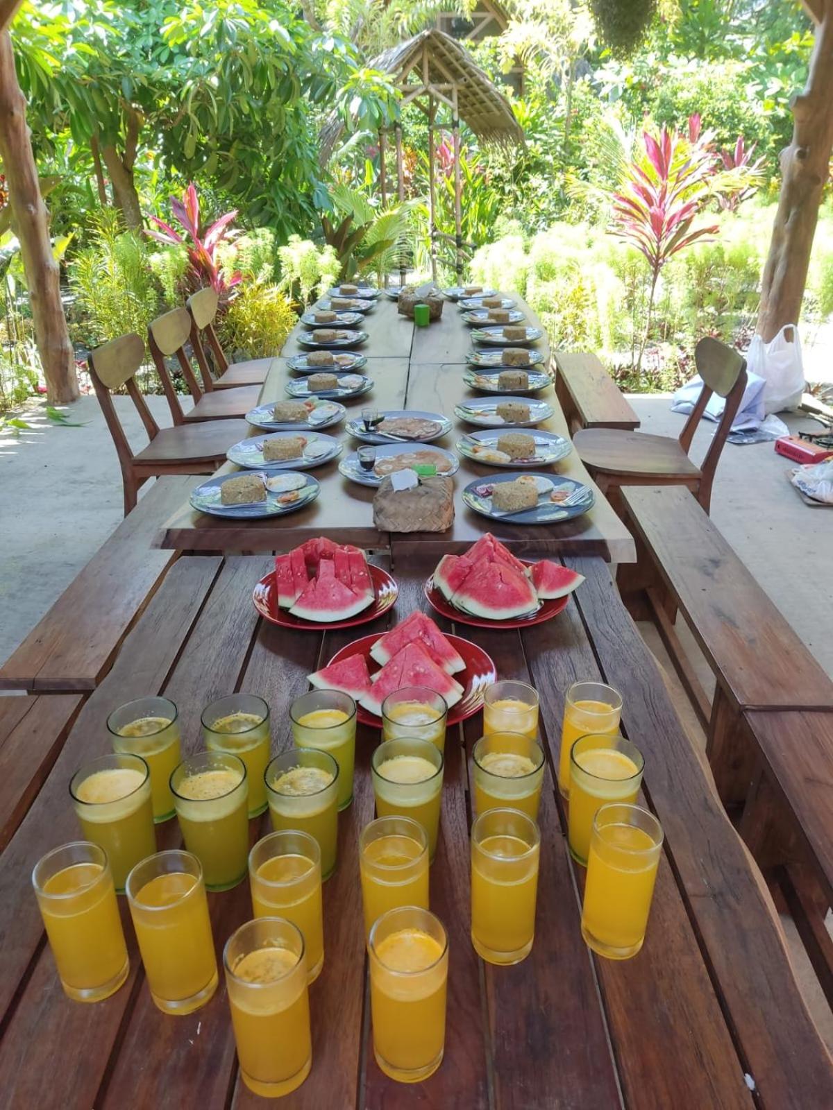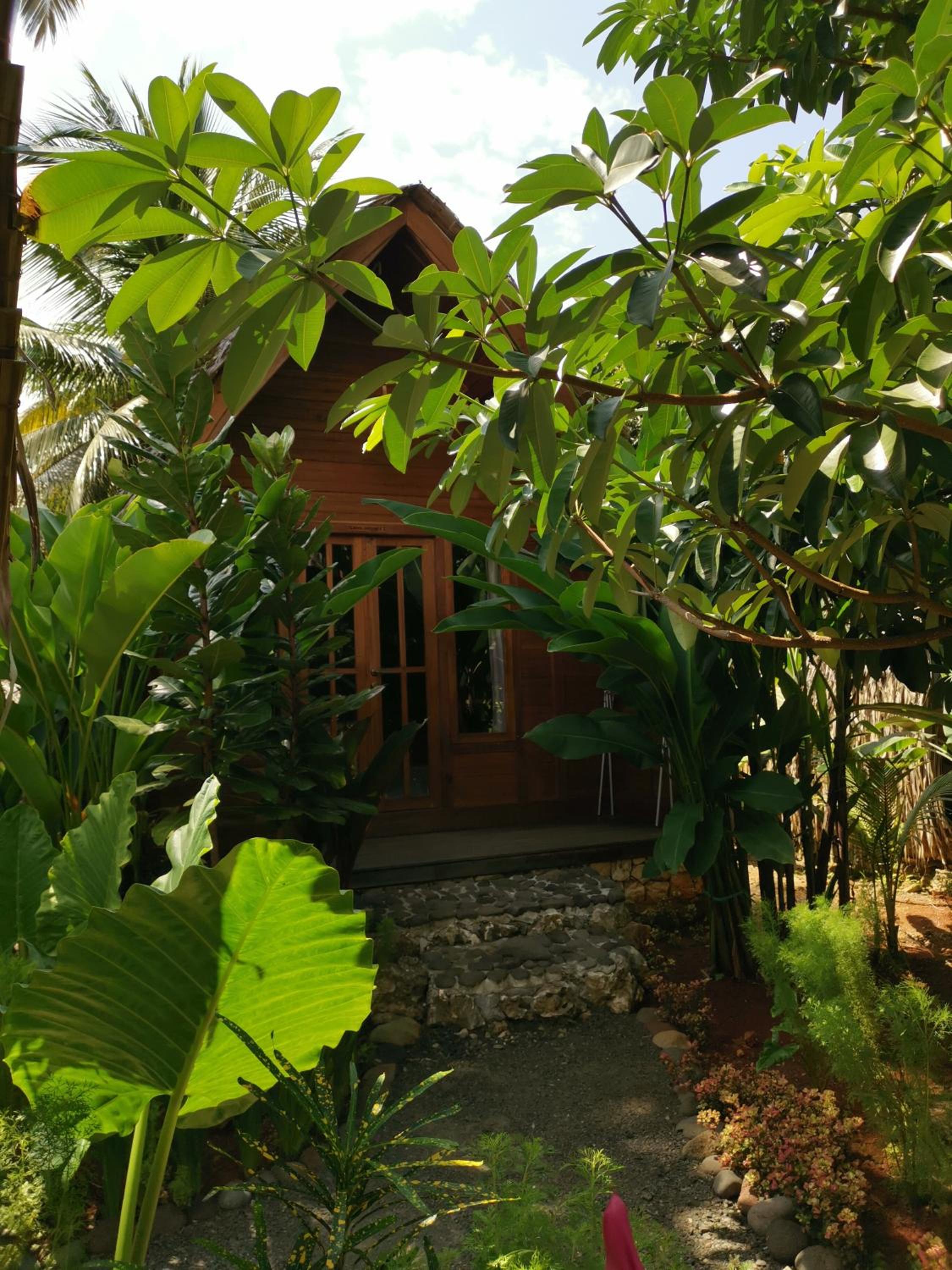 De Cottages liggen in een prachtige tuin. De vrouw van onze conciërge heeft gekookt. Heerlijk!