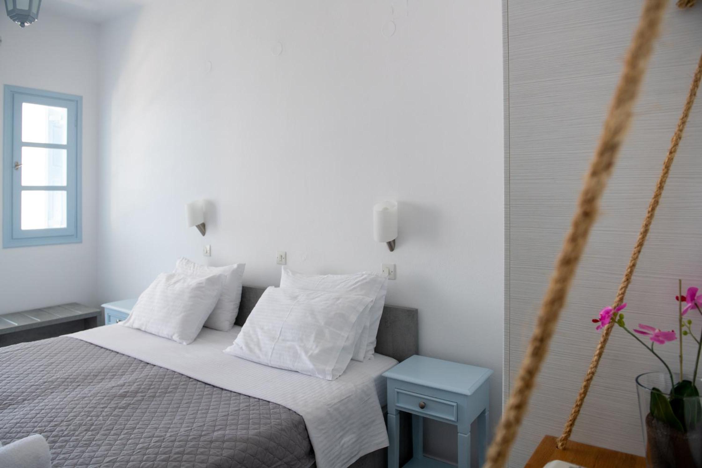 Nestled on the Santorini caldera, Blu offers rooms with stunning views of the volcano and Aegean Sea. The blue and white decor creates a serene ambiance, complemented by modern amenities like air conditioning, fridge, and TV.