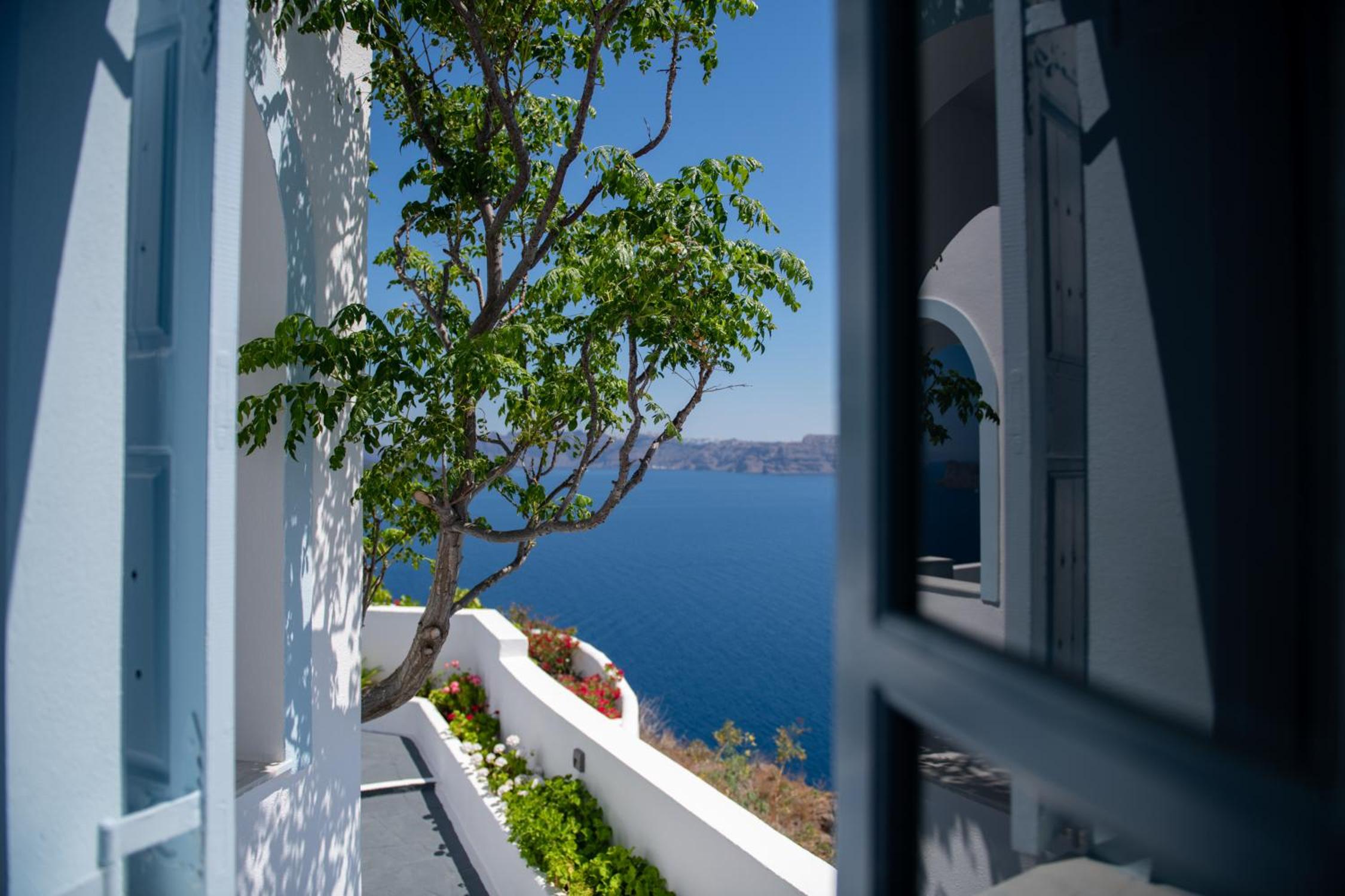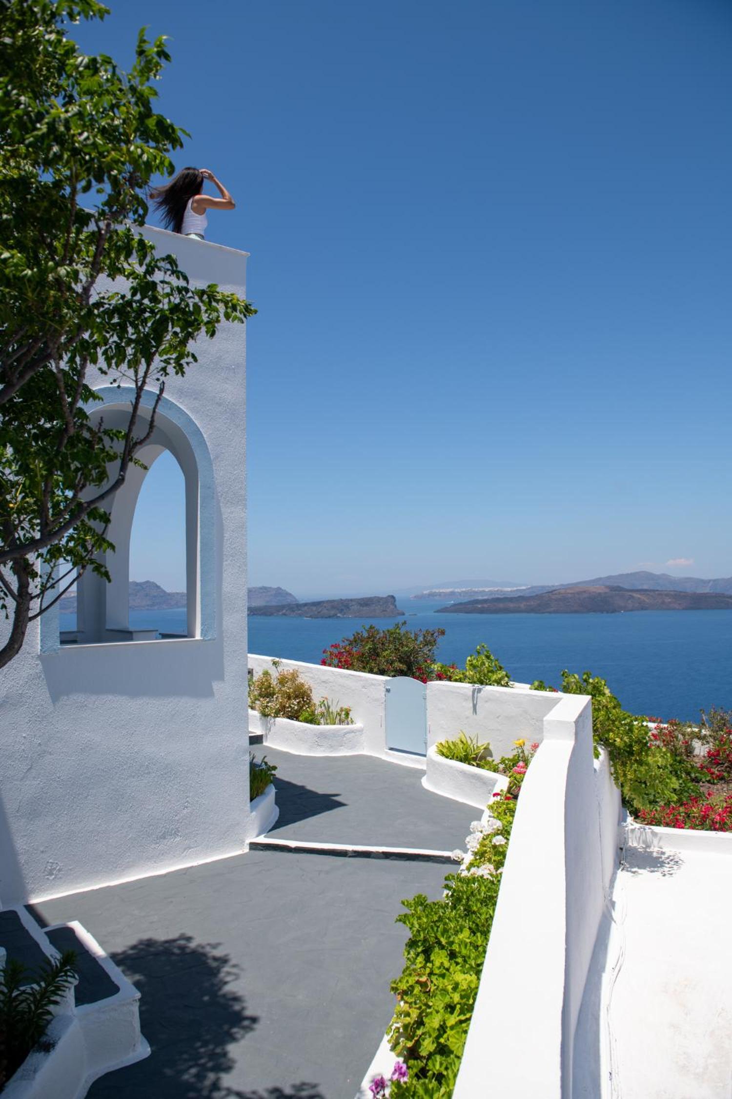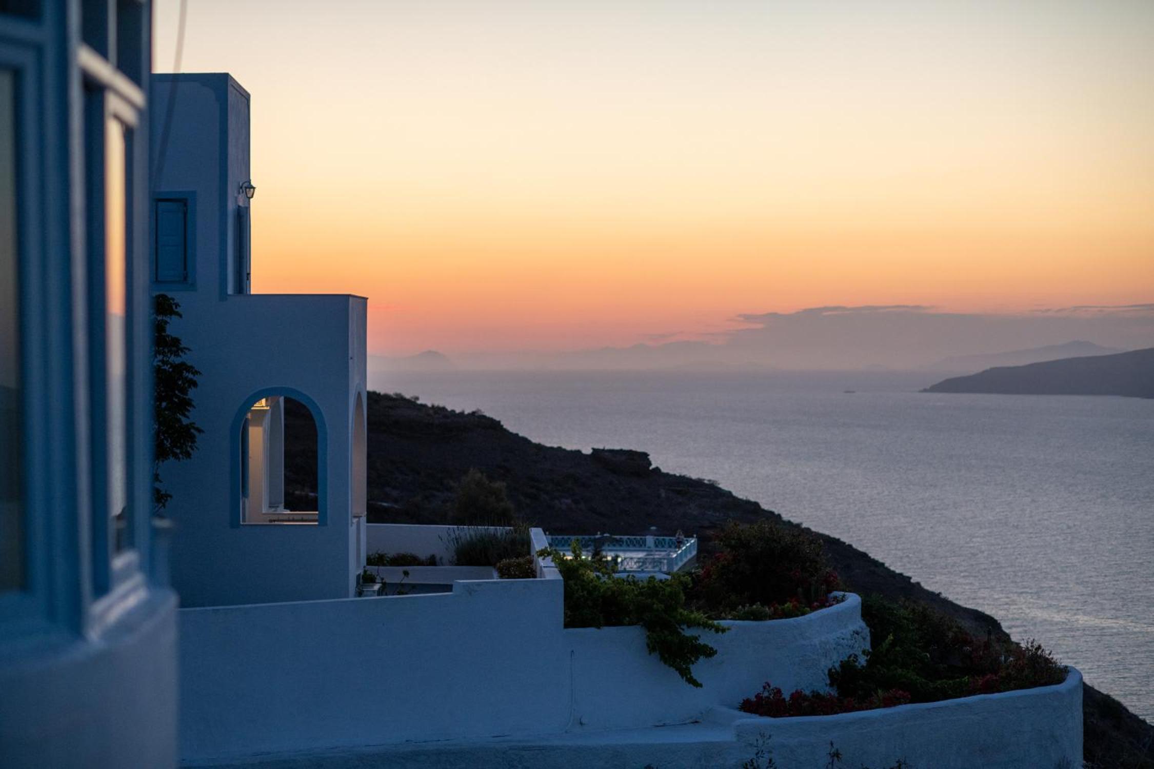 Guests can unwind by the pool overlooking the caldera or enjoy a delicious breakfast in the elegant dining area with sea views. The homemade jams and local products add a touch of authenticity to the dining experience.
