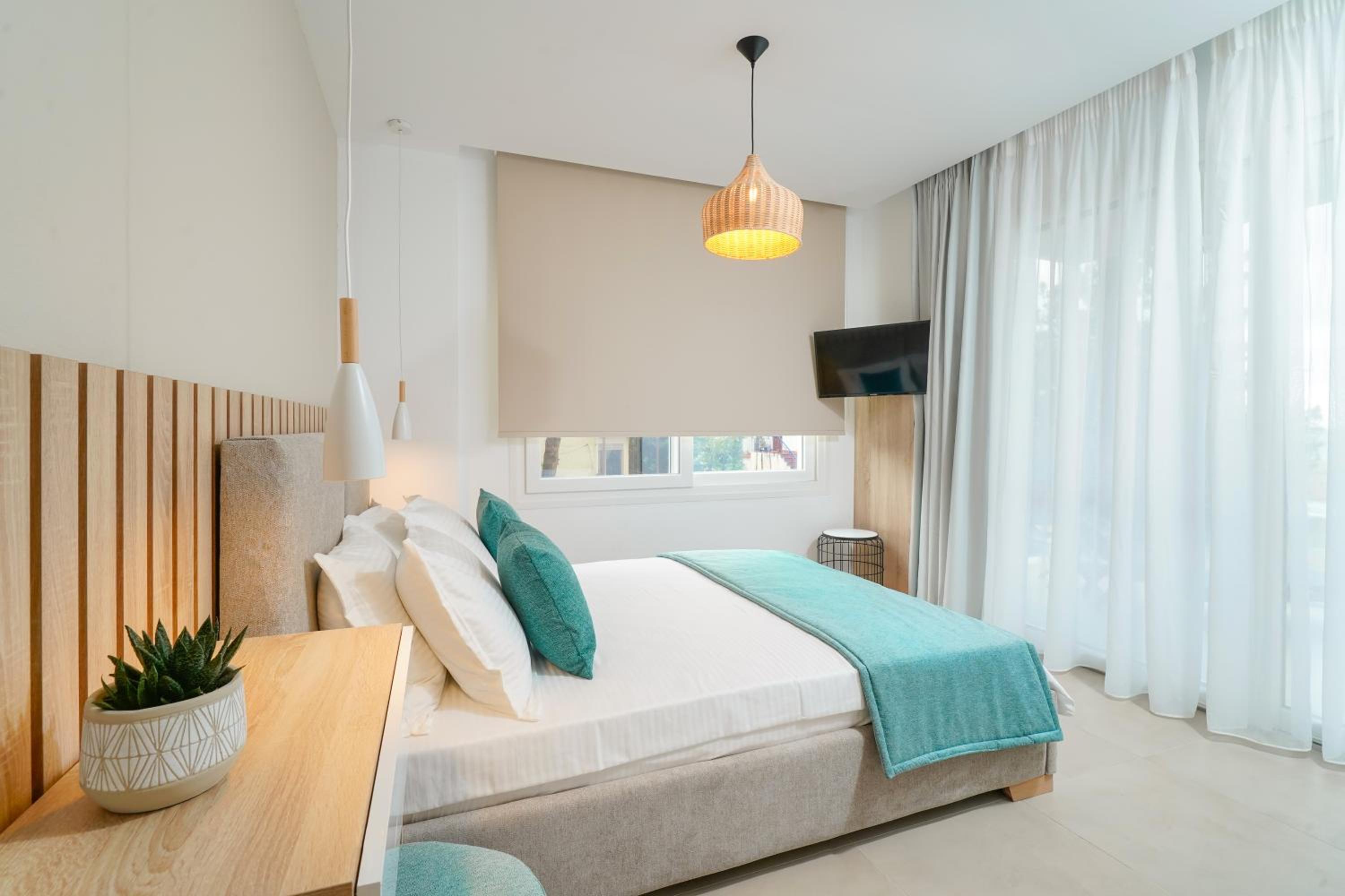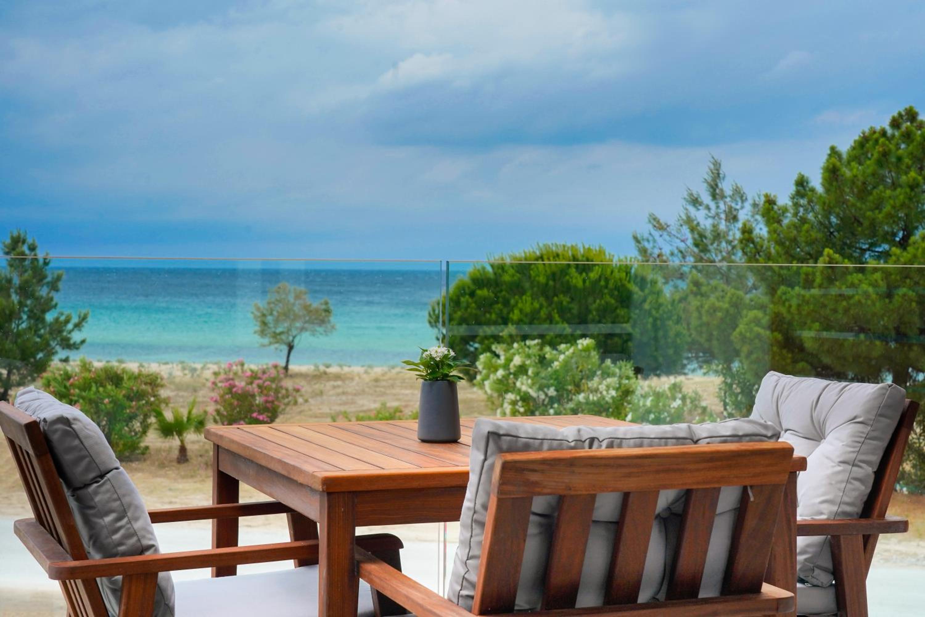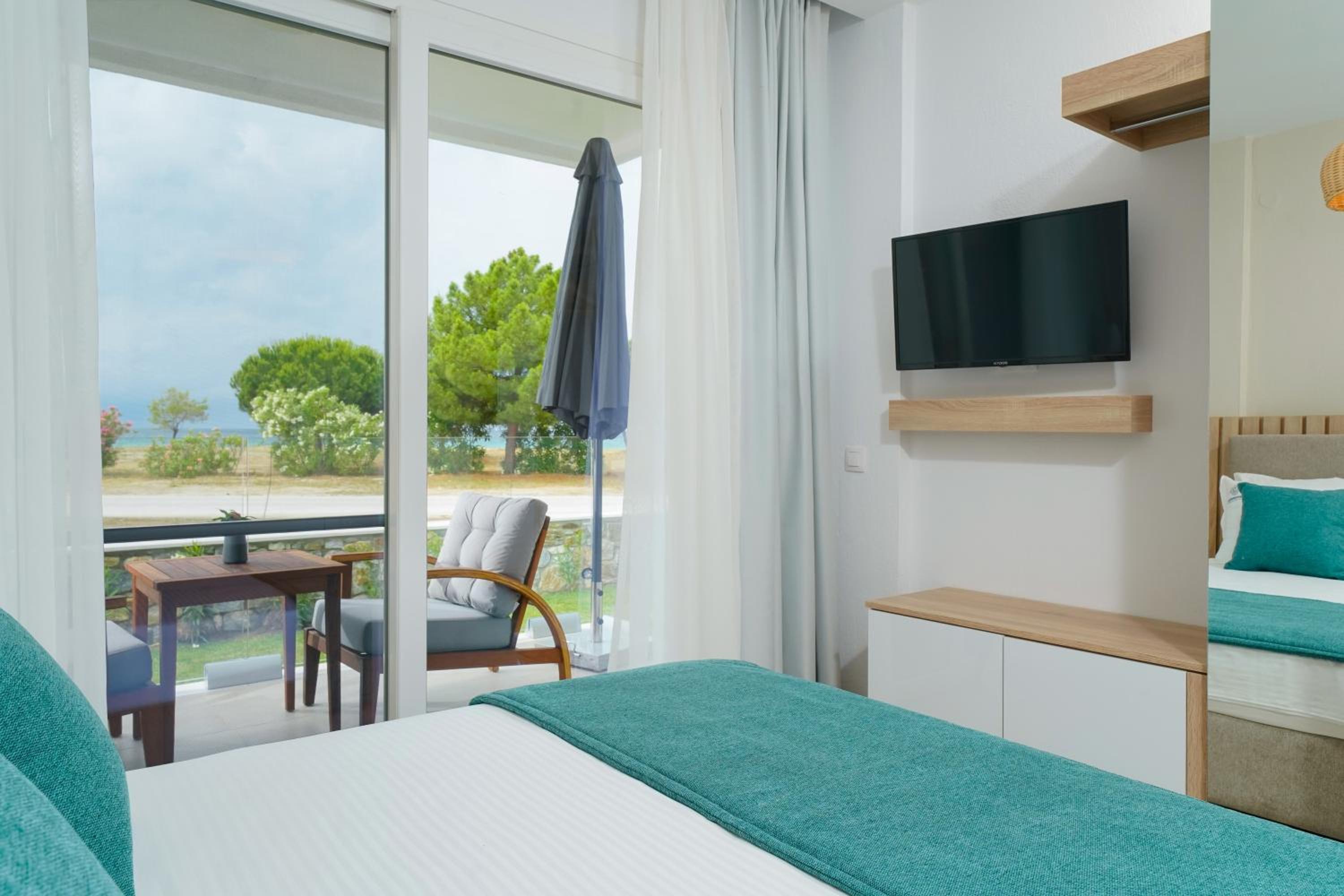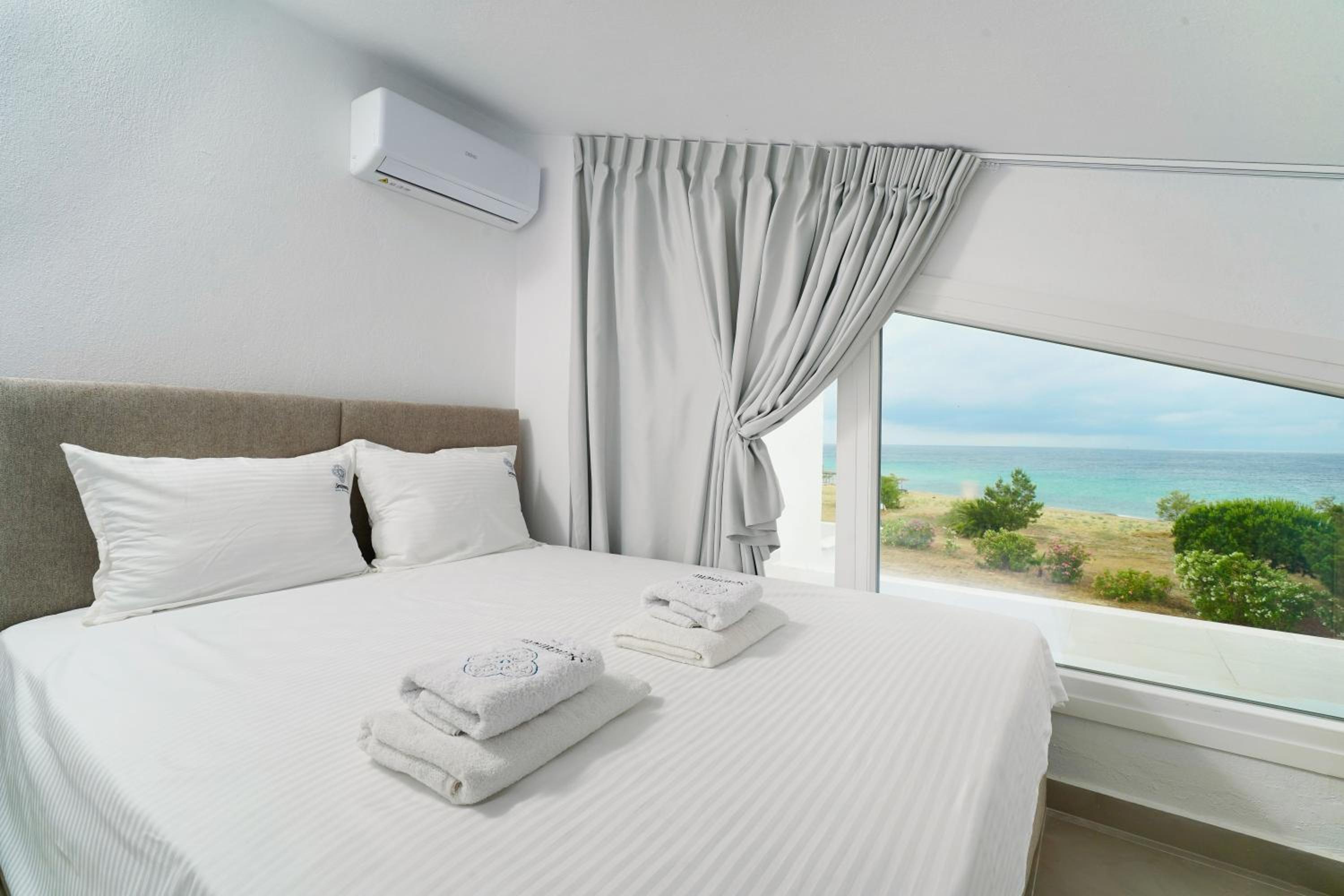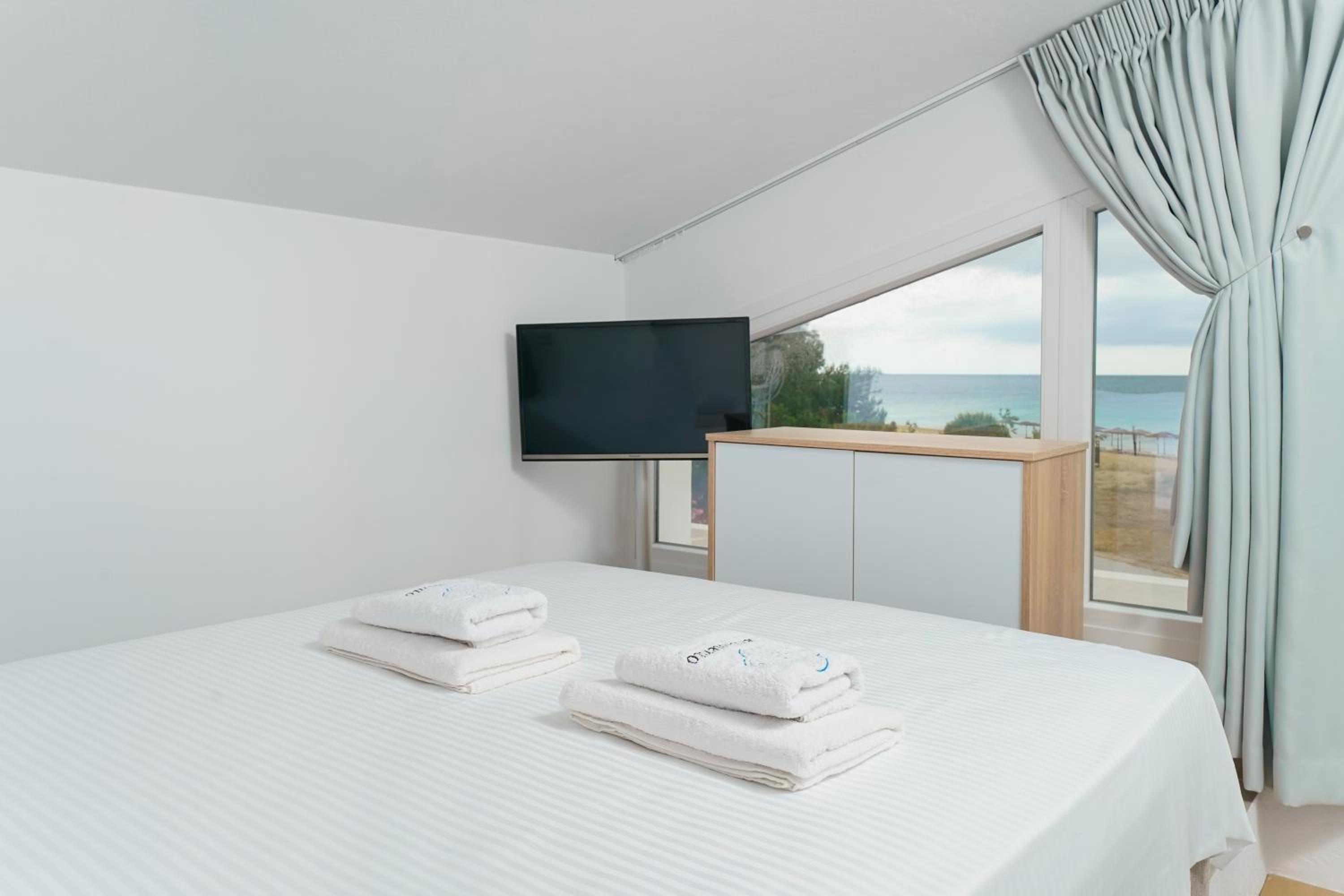 Everything was great! Stylishly decorated rooms that brought relaxation to mind. Loads of amenities - mosquito-nets, hair dryer, iron, sandwich maker + you could even choose between pillows. Spacious balconies with a partial sea-view, equipped with comfy patio furniture. The cleaning crew was meticulous with attention to detail. Staff was friendly and helpful. We were pleasantly surprised by a Greek night with live music and traditional food on our last night. Almost forgot - a cute little black and white cat that actively greeted us whenever we returned. Vast beach with calm water even on windy days just a few meters from the property. Good restaurants nearby. Satisfied with our choice.