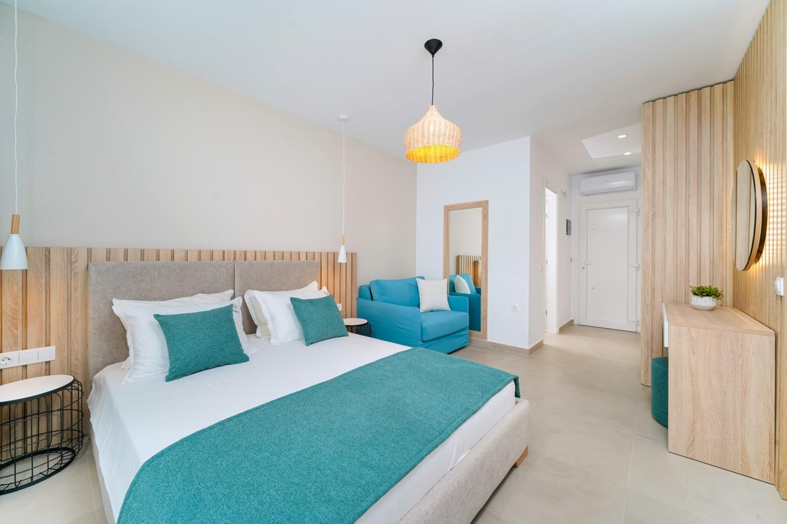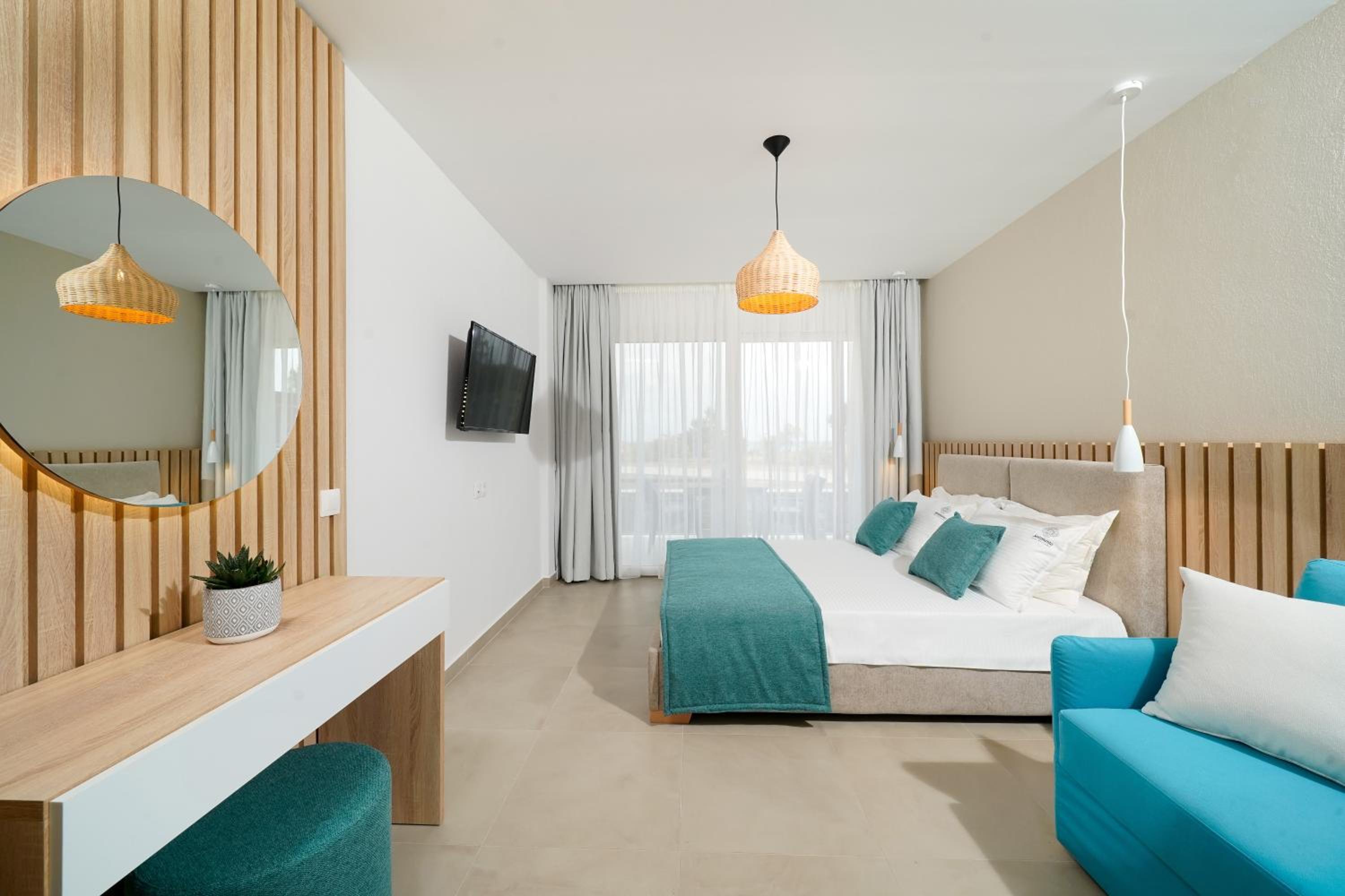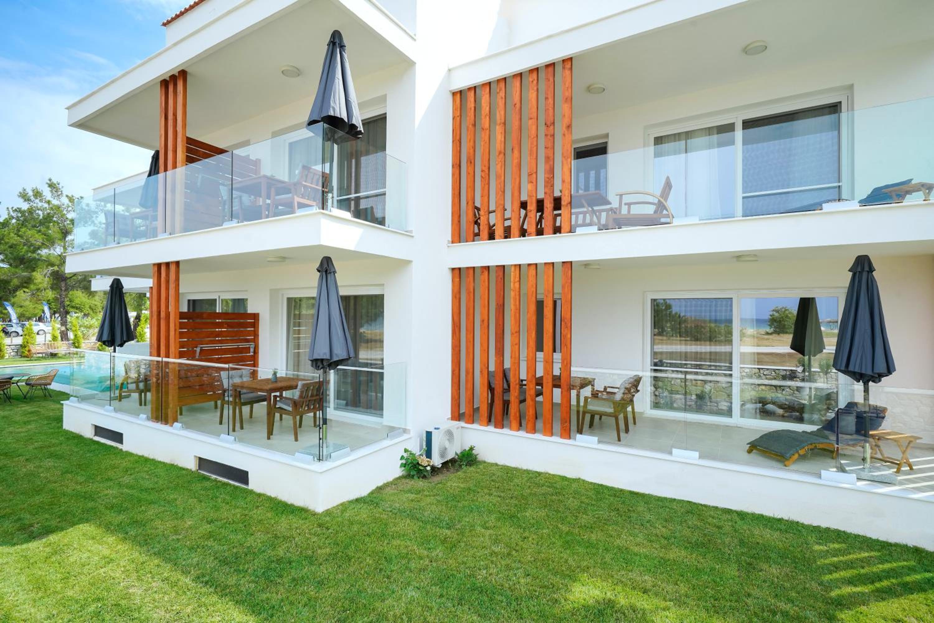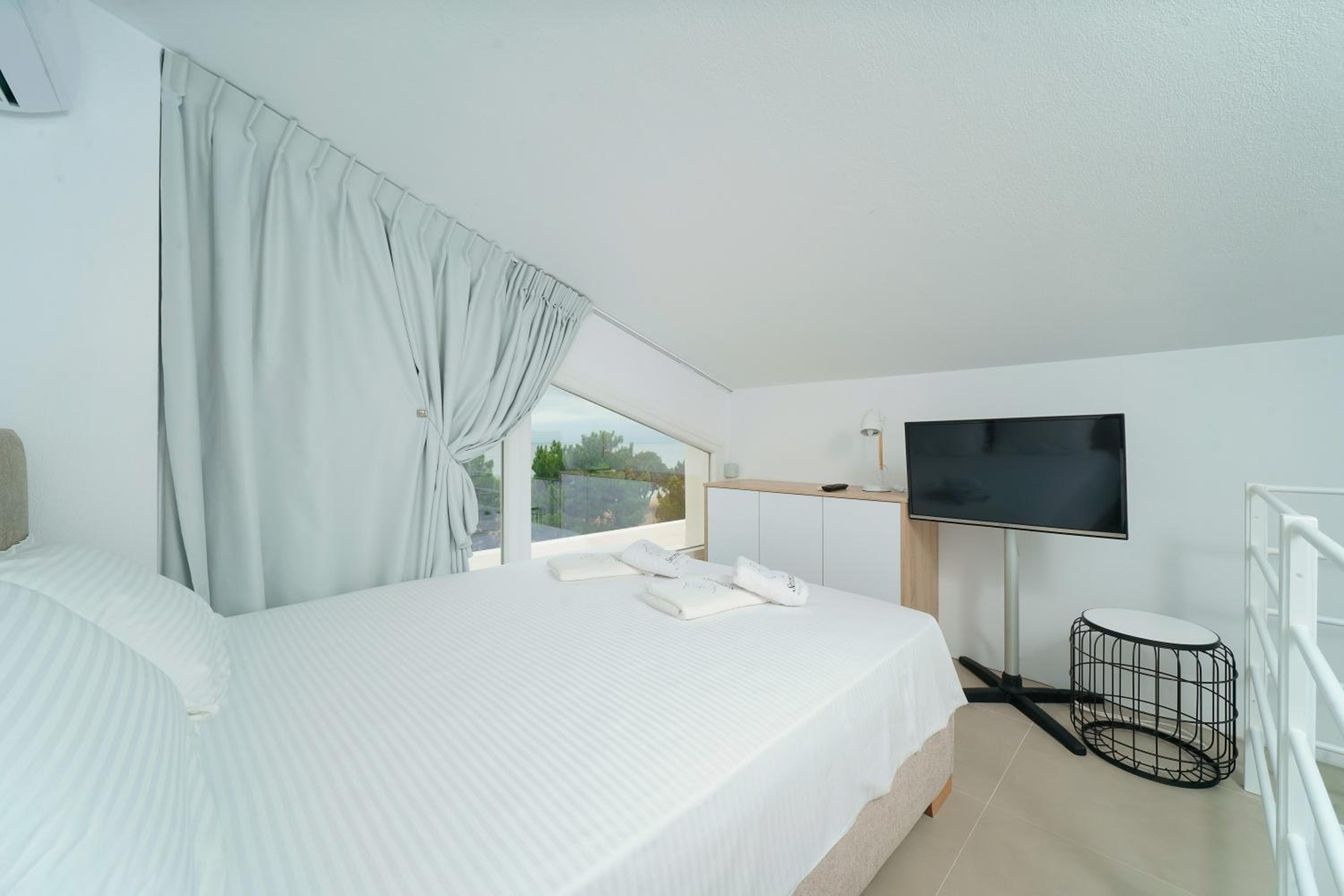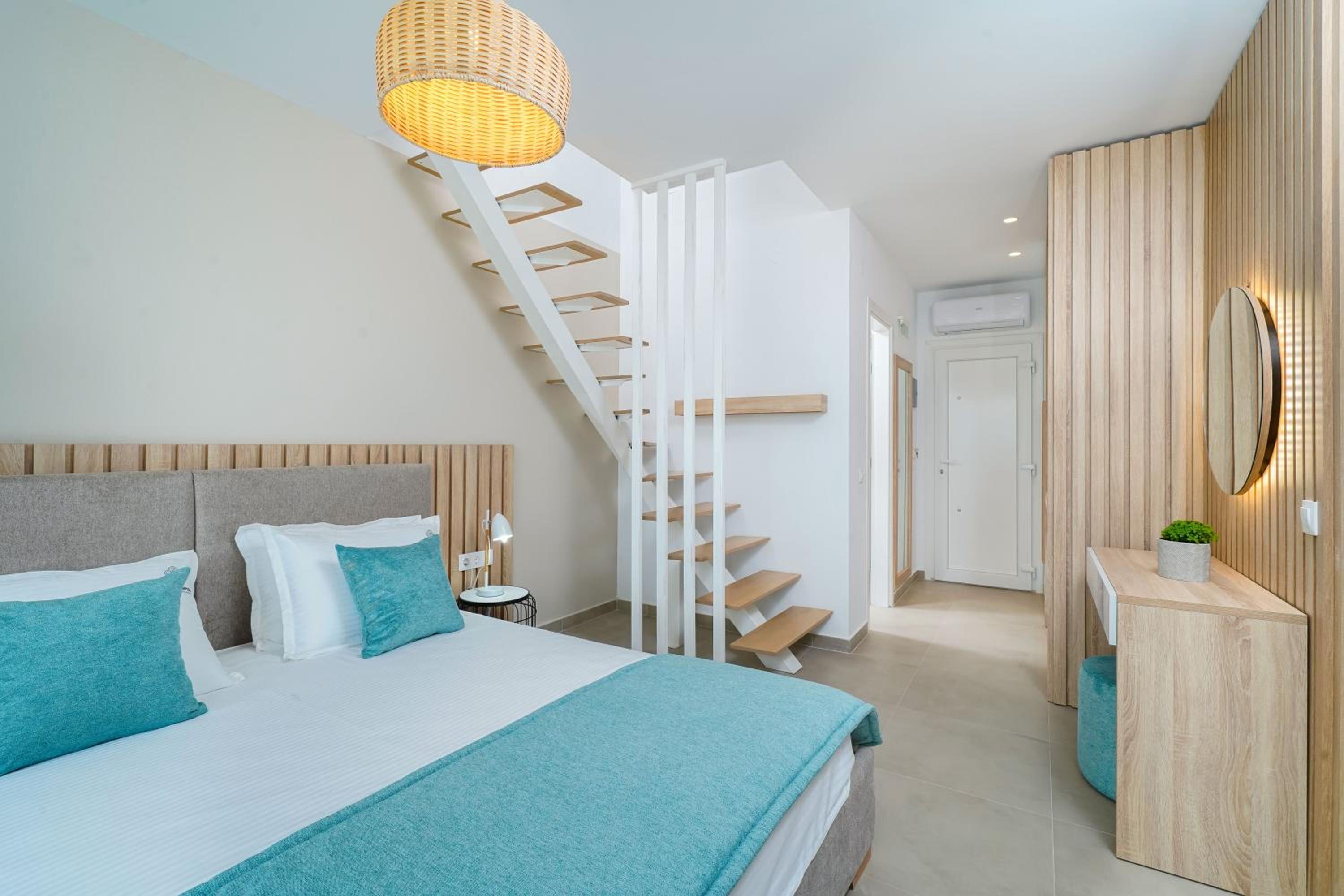 Everything was great! Stylishly decorated rooms that brought relaxation to mind. Loads of amenities - mosquito-nets, hair dryer, iron, sandwich maker + you could even choose between pillows. Spacious balconies with a partial sea-view, equipped with comfy patio furniture. The cleaning crew was meticulous with attention to detail. Staff was friendly and helpful. We were pleasantly surprised by a Greek night with live music and traditional food on our last night. Almost forgot - a cute little black and white cat that actively greeted us whenever we returned. Vast beach with calm water even on windy days just a few meters from the property. Good restaurants nearby. Satisfied with our choice.