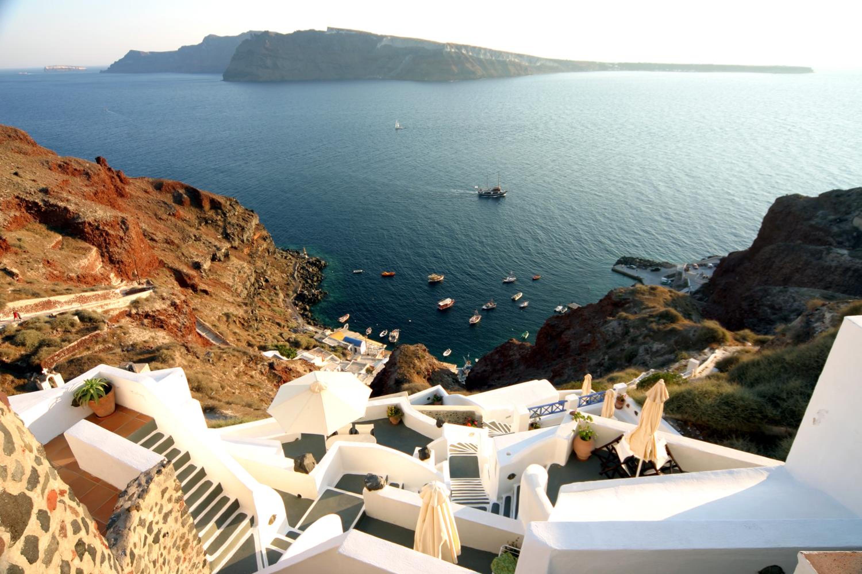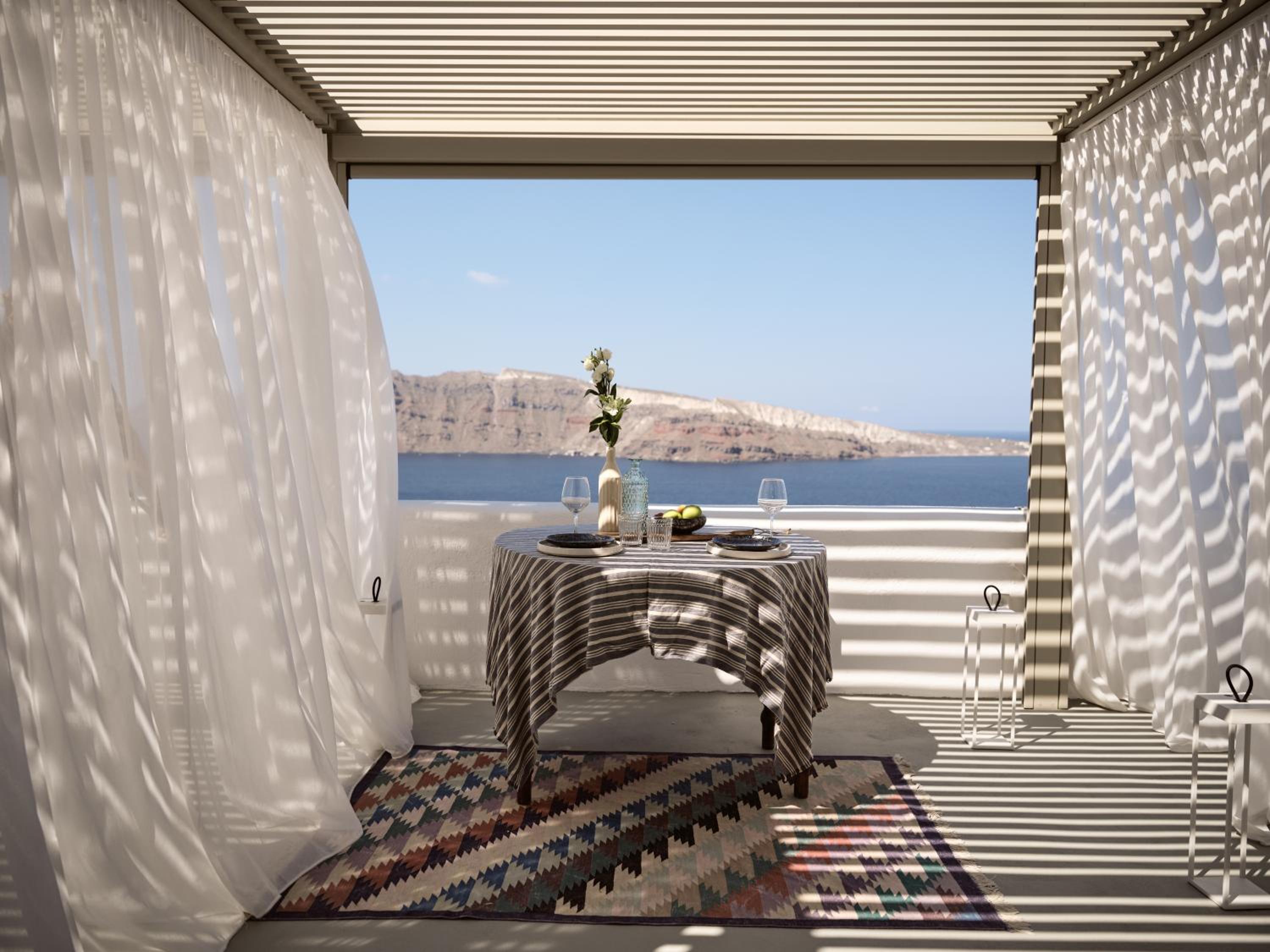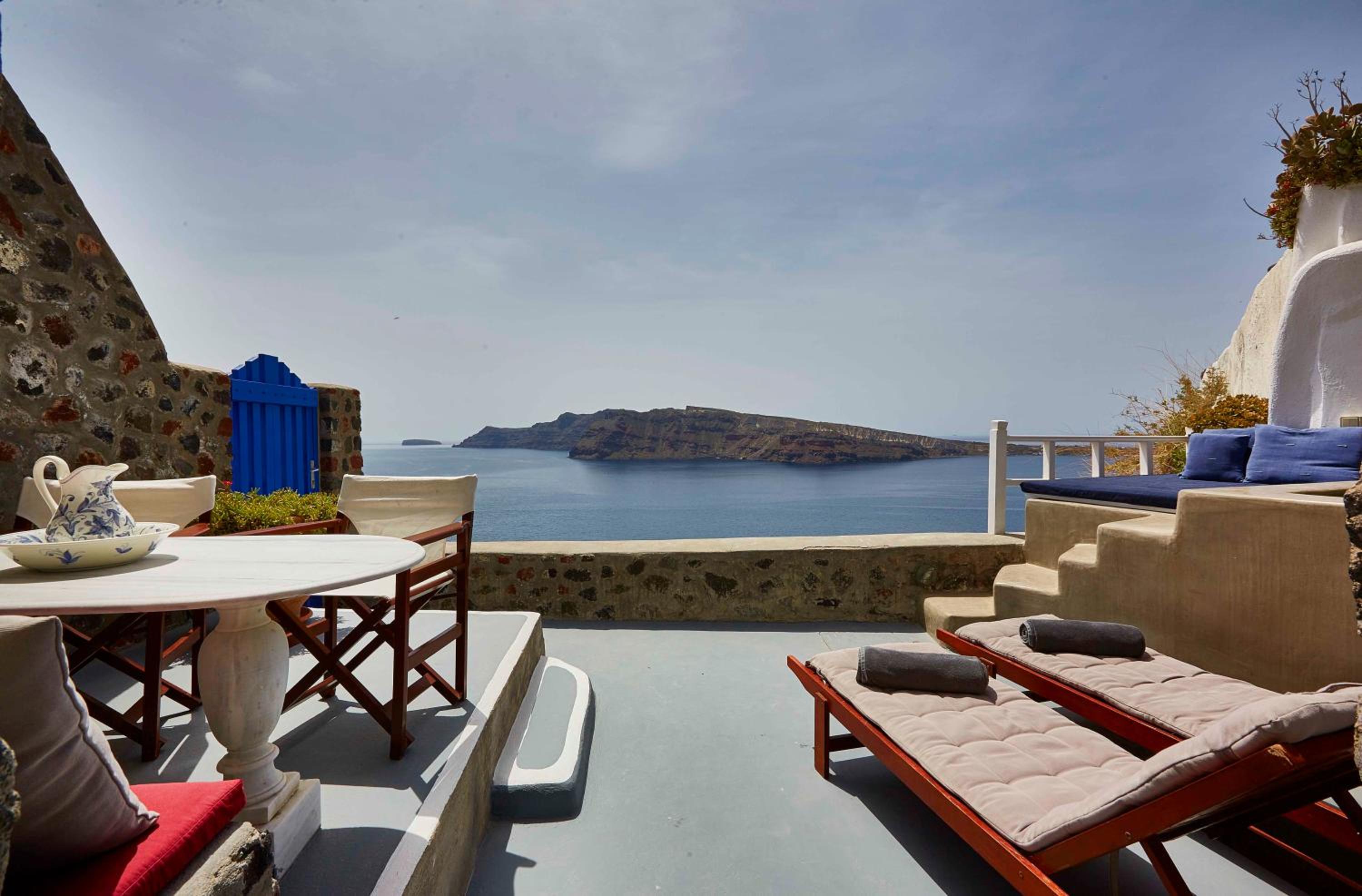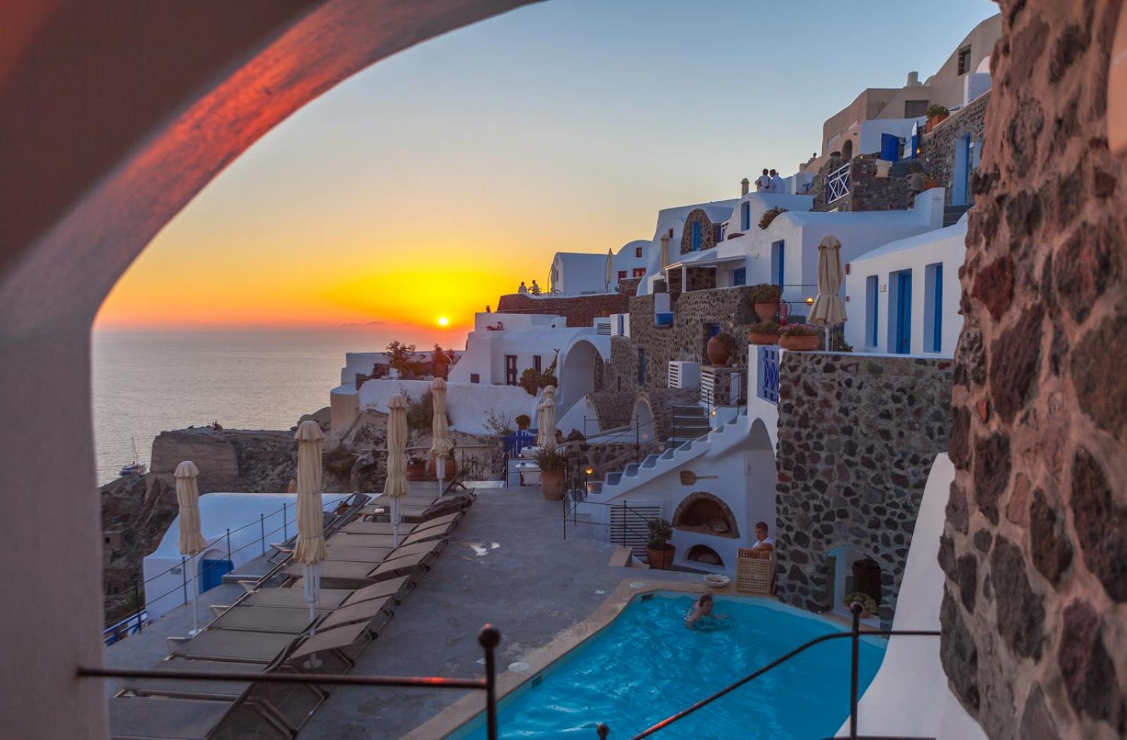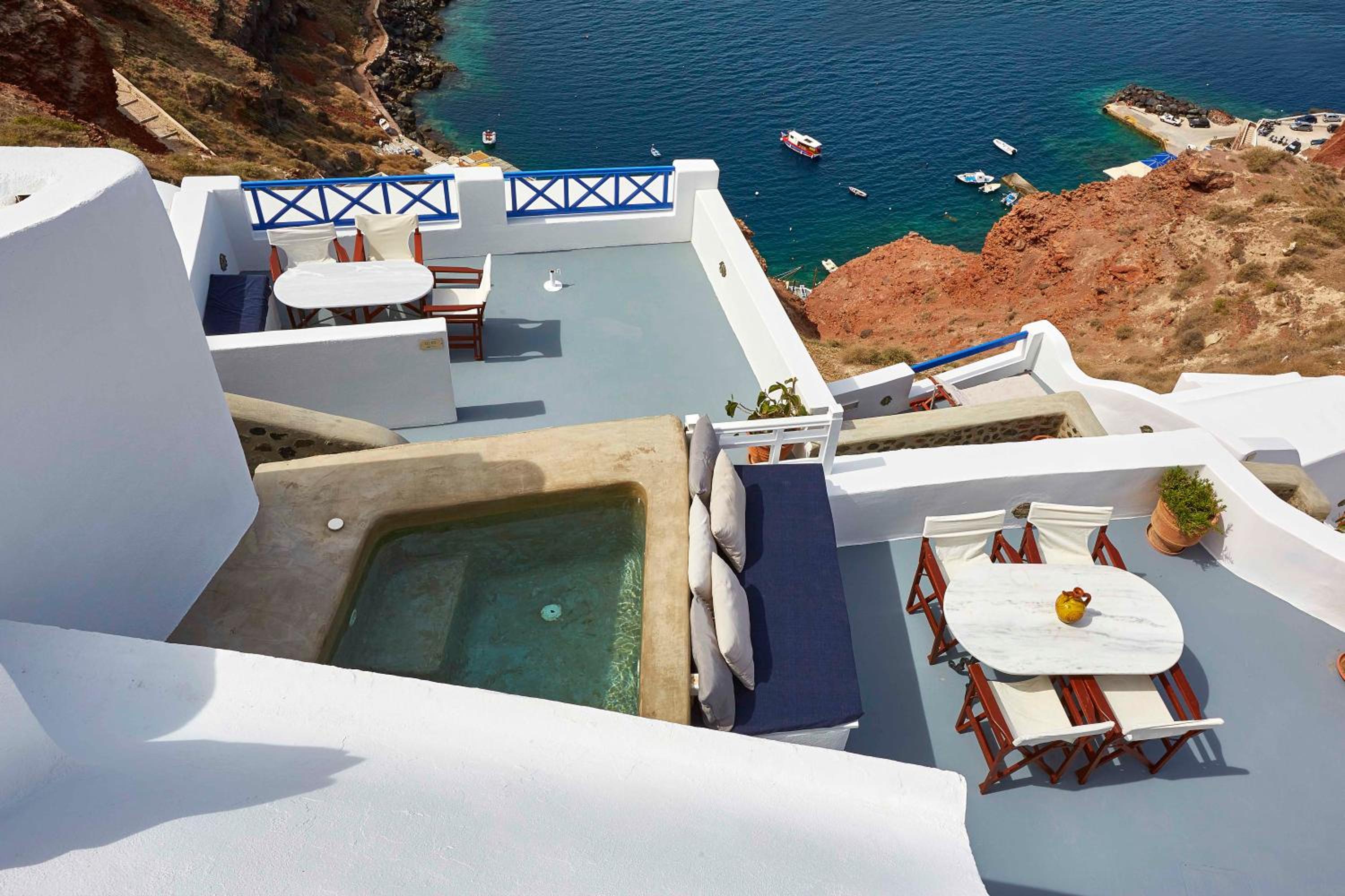Nestled on a cliff overlooking the volcano and islets, Esperas in Oia offers a unique experience with its carved-into-the-rock pool and unparalleled vistas of the Aegean Sea.
