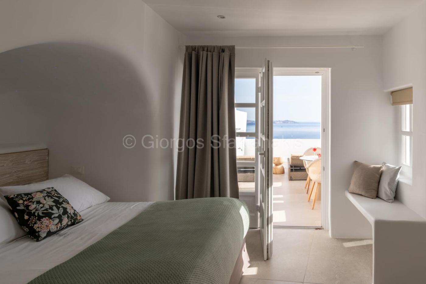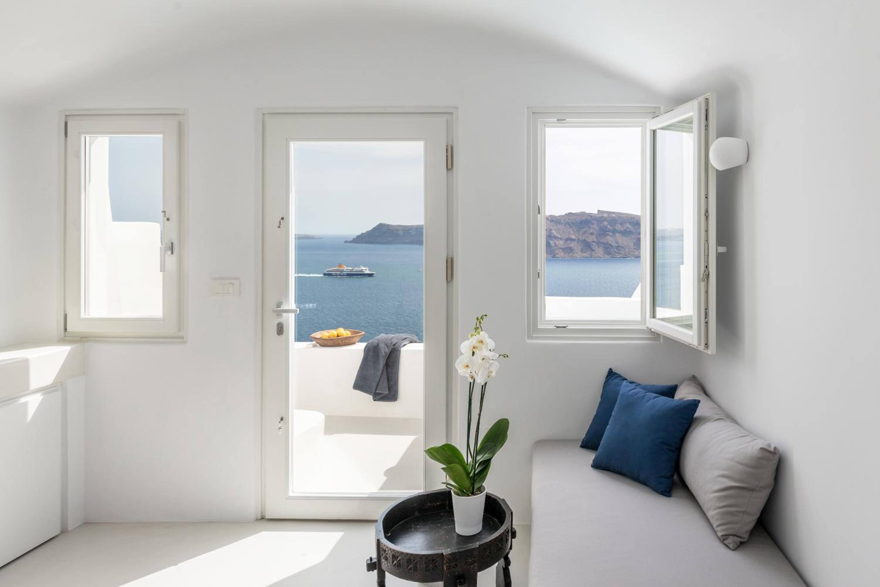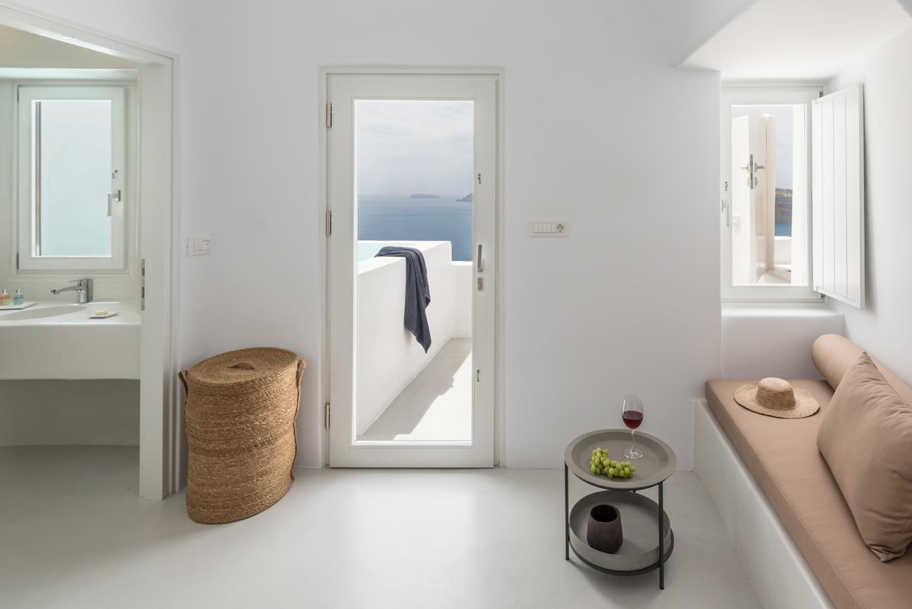 The location is spectacular, right in front of the Caldera — the view is simply breathtaking. The room was sparkling white, in perfect Cycladic style with beautiful minimalism.