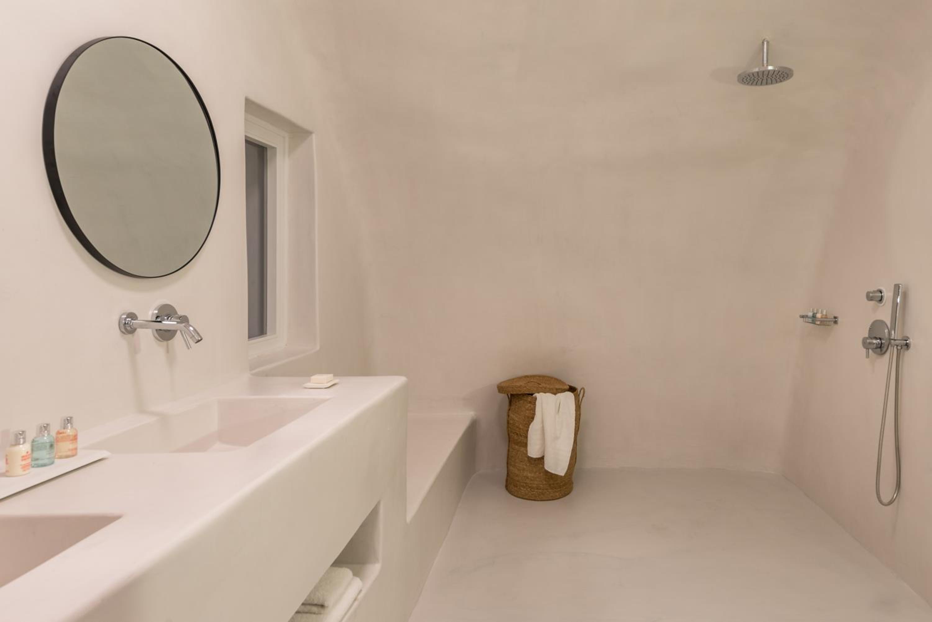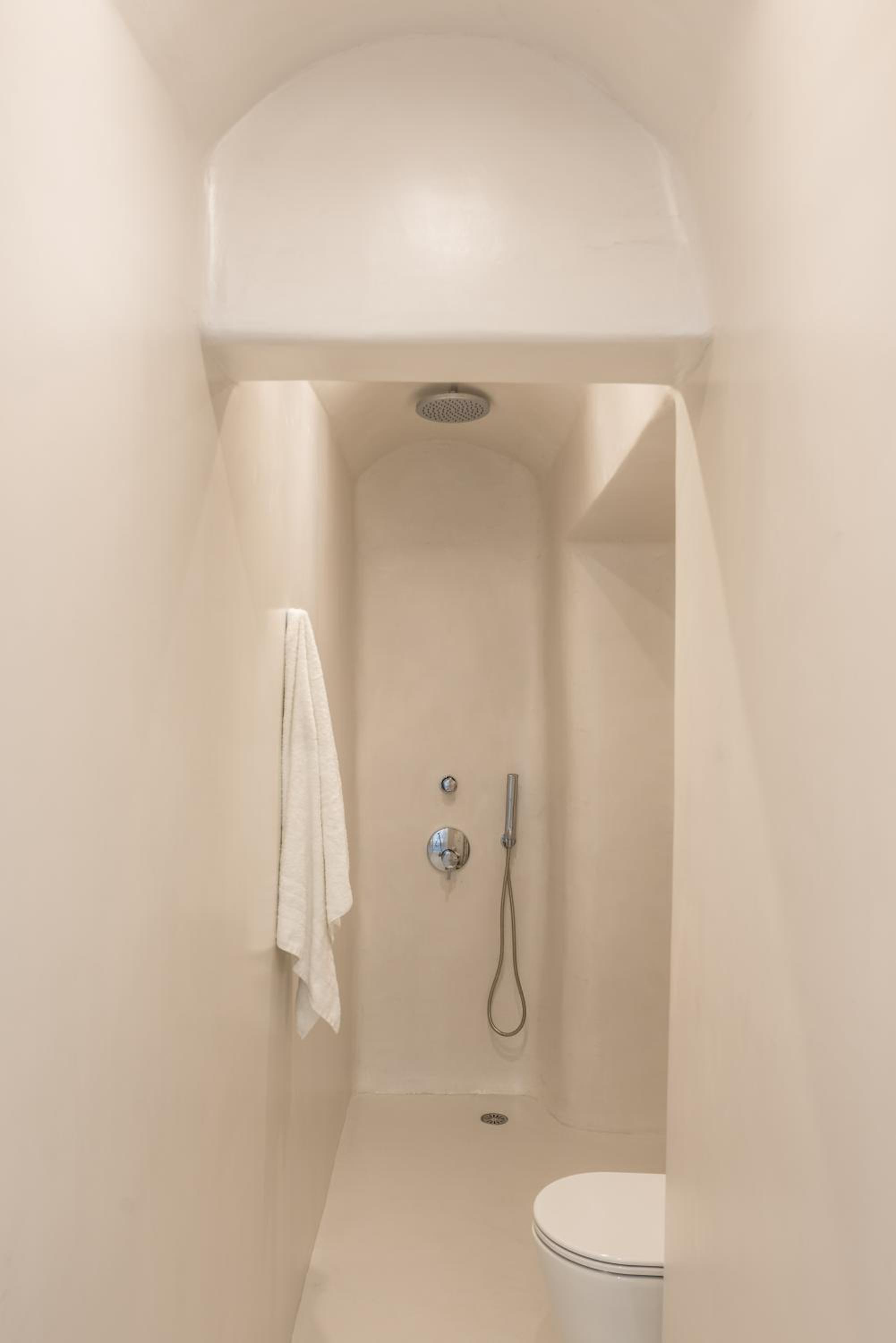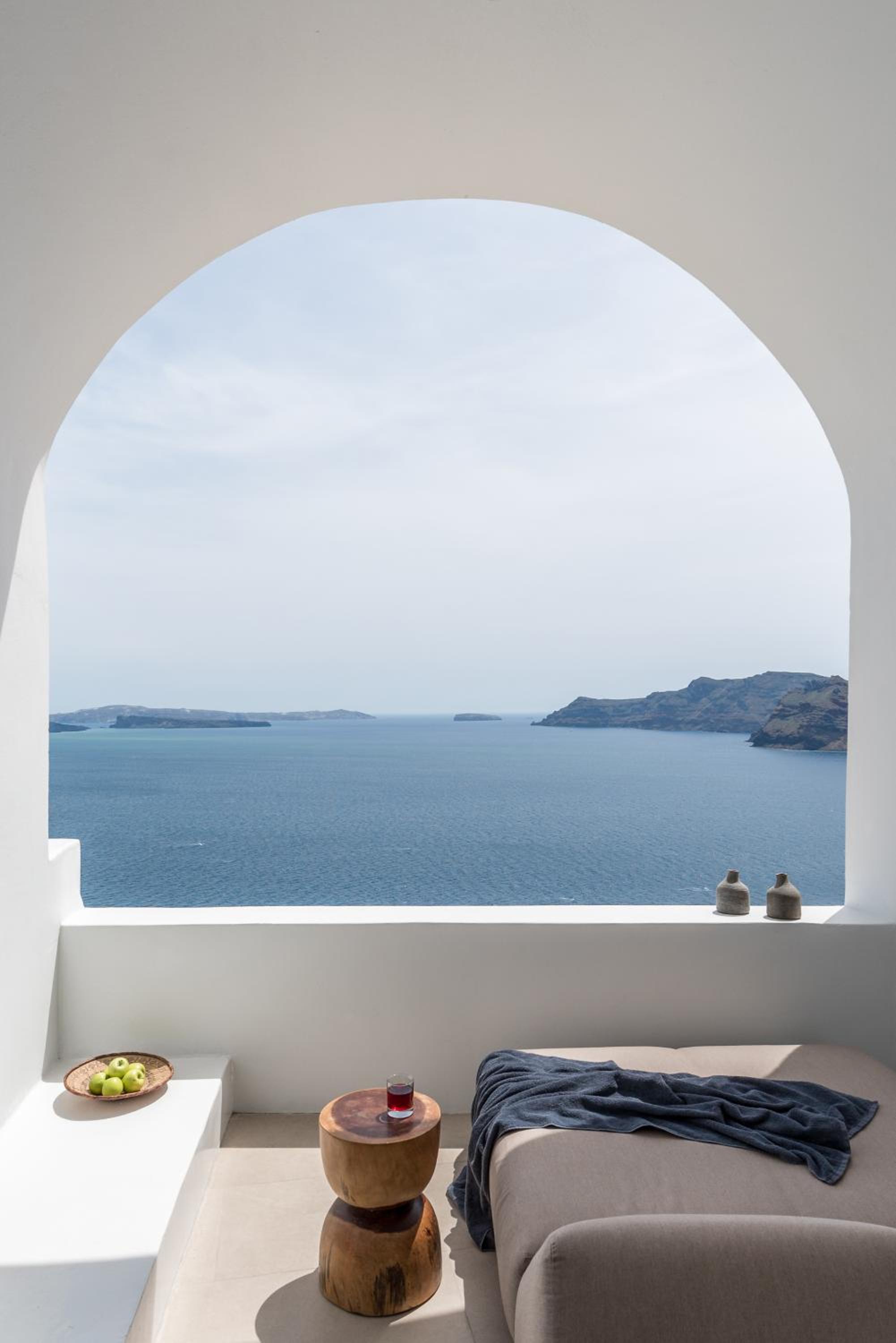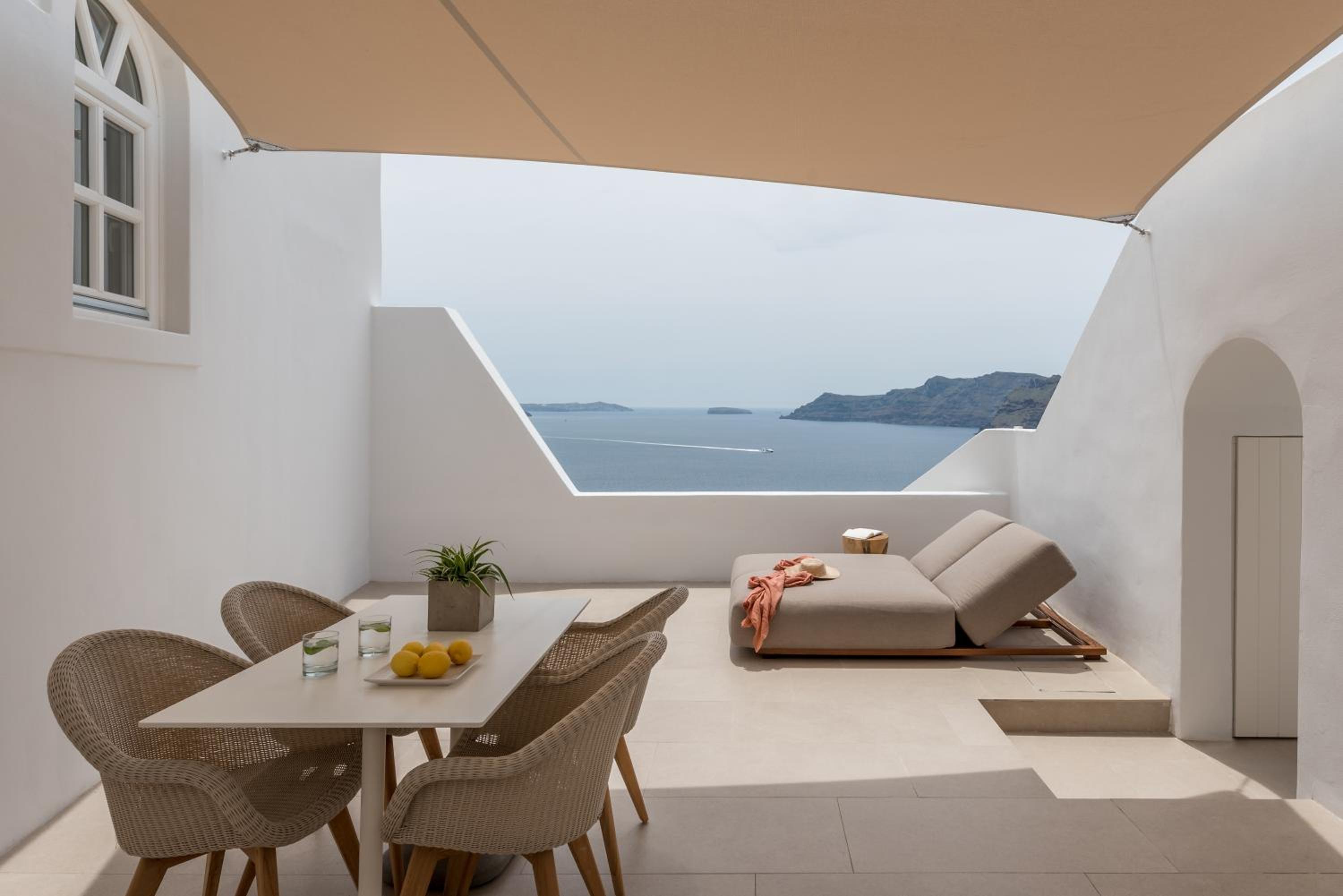 The location is spectacular, right in front of the Caldera — the view is simply breathtaking. The room was sparkling white, in perfect Cycladic style with beautiful minimalism.