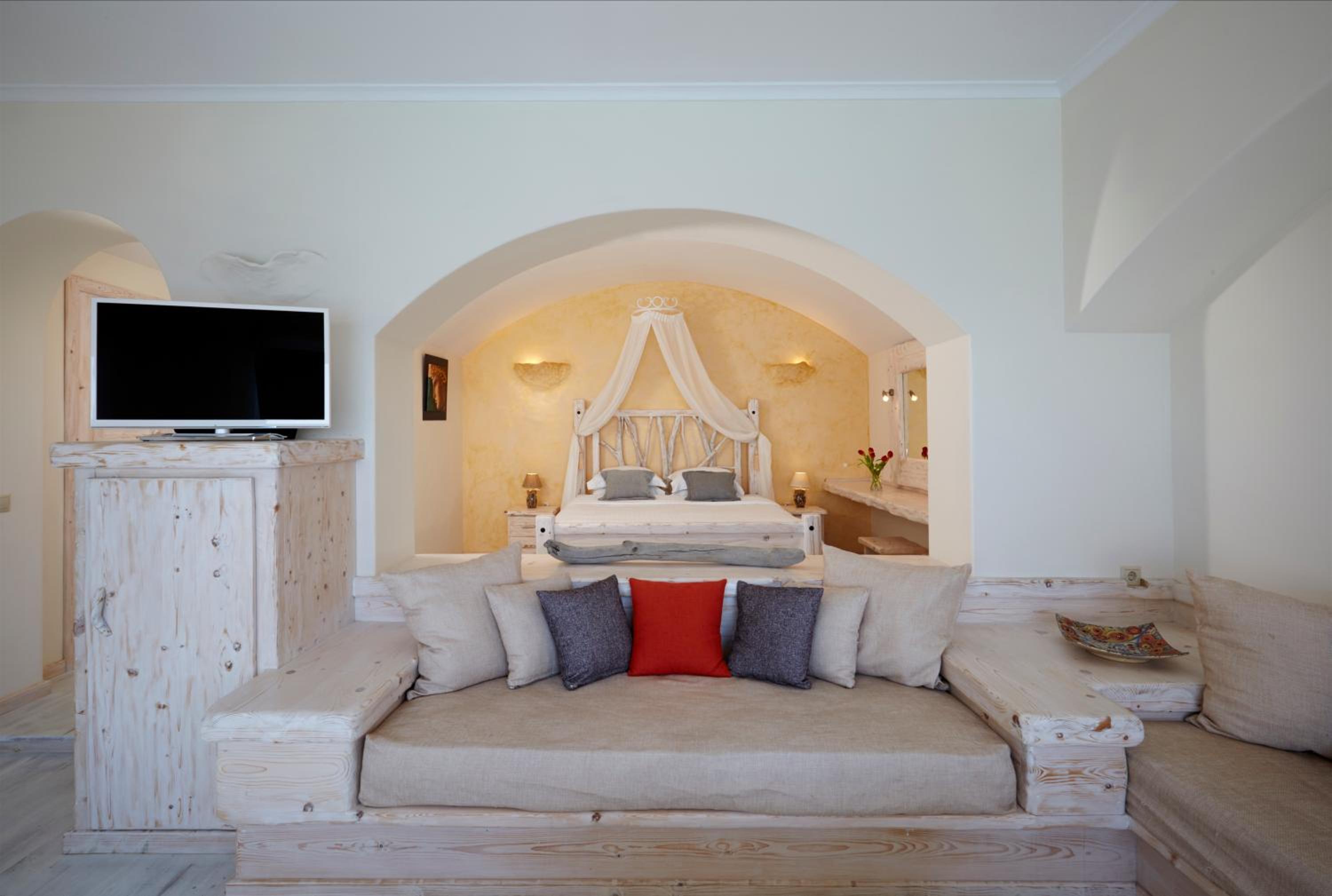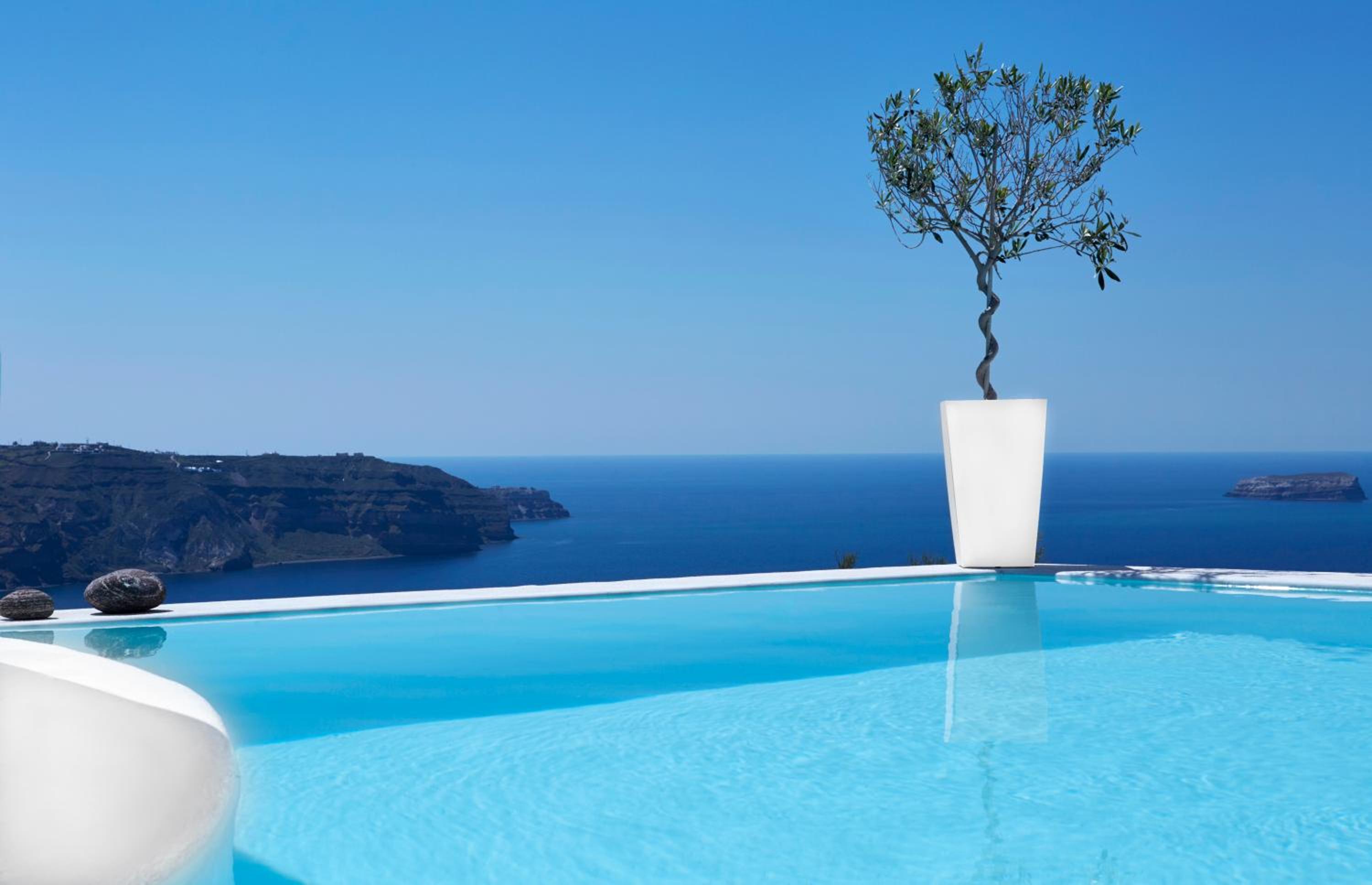 Boasting Aegean Sea and Caldera views, Athermi in Megalochori offers luxurious suites with handcrafted white furnishings and driftwood details. Enjoy the pool, sun terrace, and poolside snack bar while taking in the stunning surroundings.
