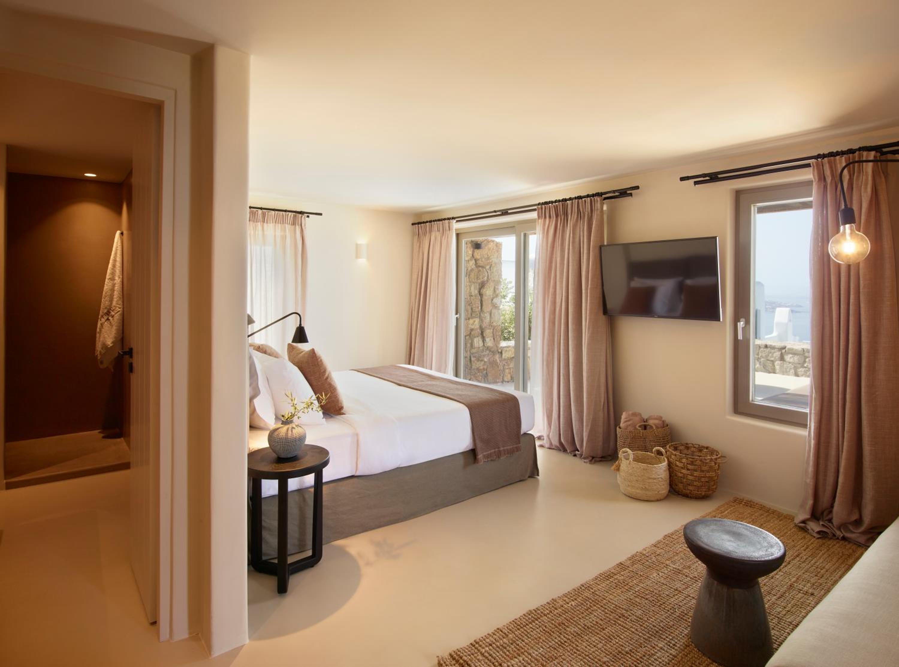 Collini Suites & Villas Mykonos offers air-conditioned rooms with modern amenities such as a coffee machine, minibar, and flat-screen TV. Guests can enjoy sea views from select rooms and relax on the private terrace. The hotel ensures a comfortable stay with complimentary WiFi, room service, and a 24-hour front desk.