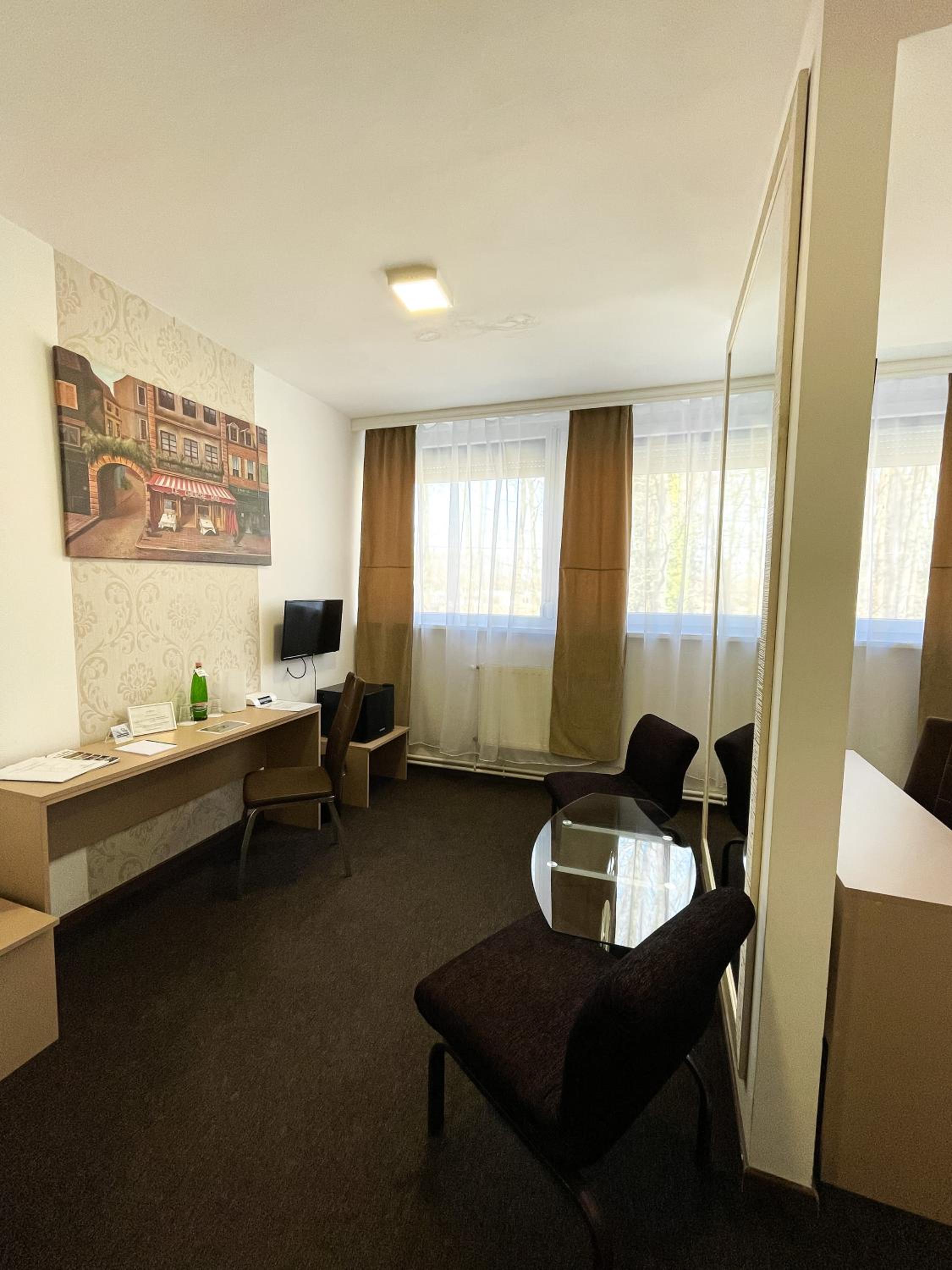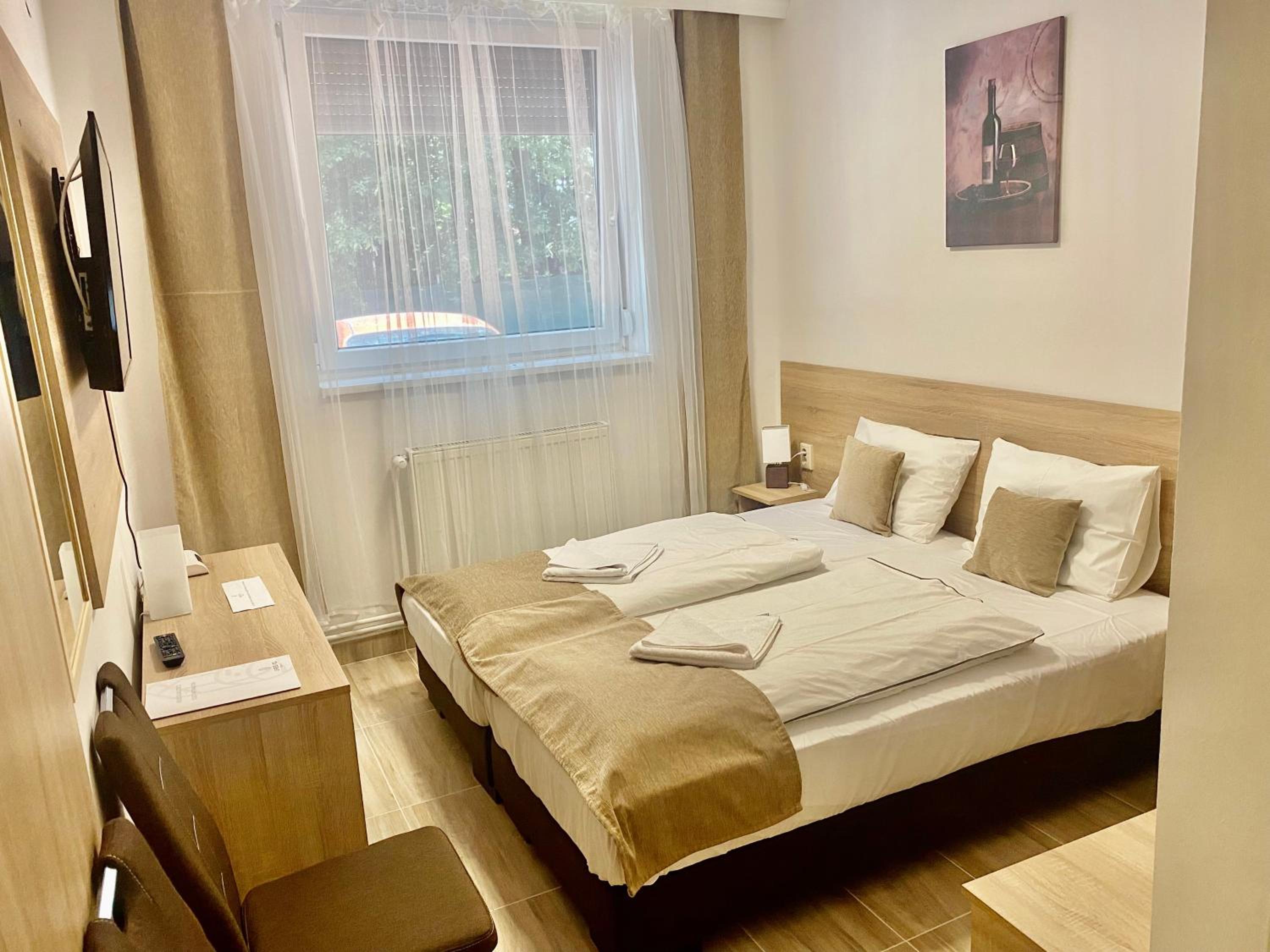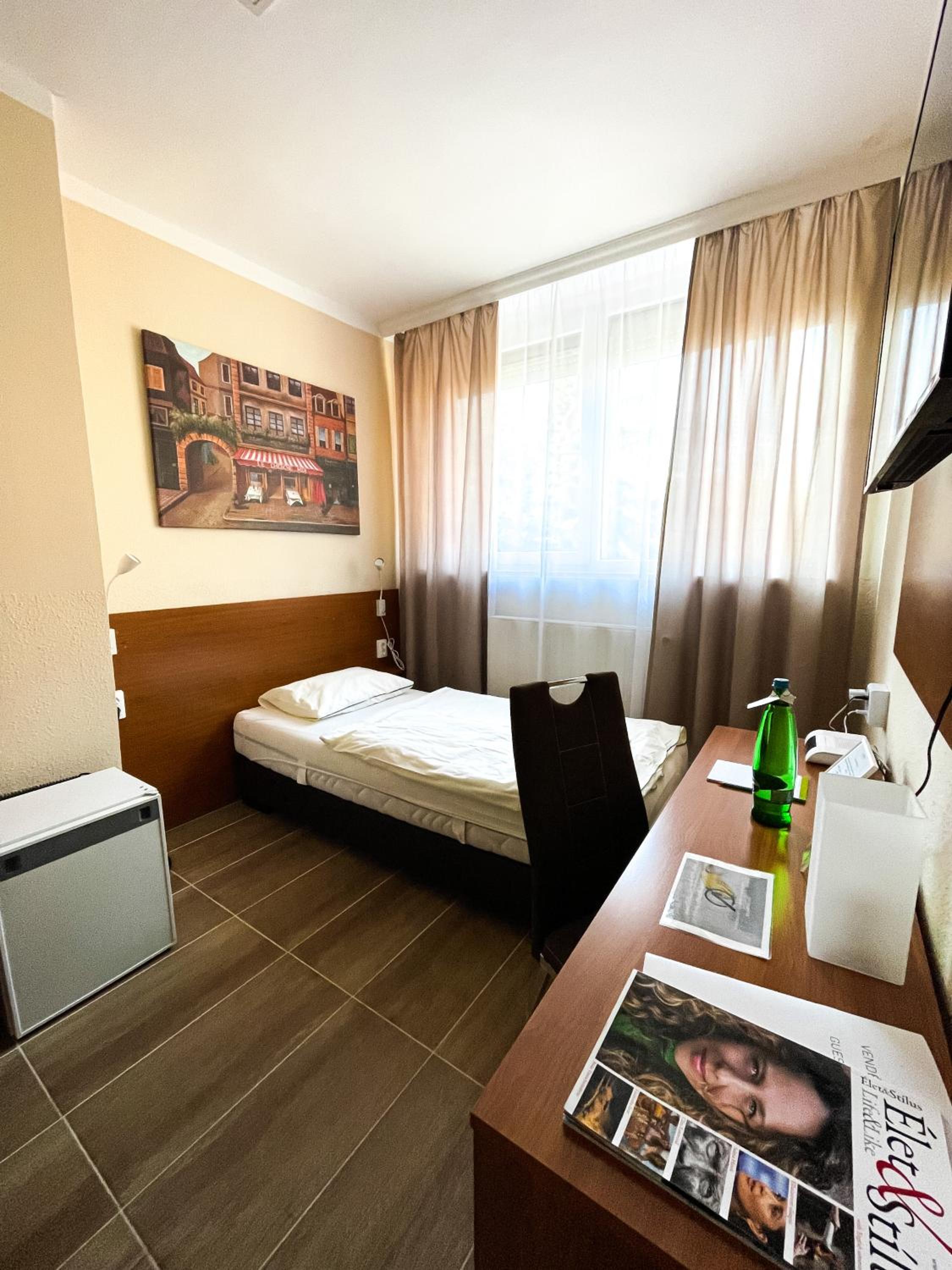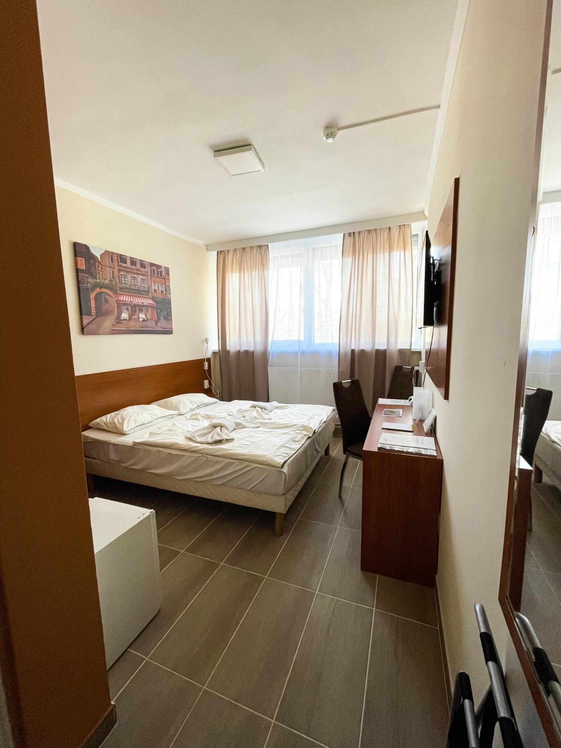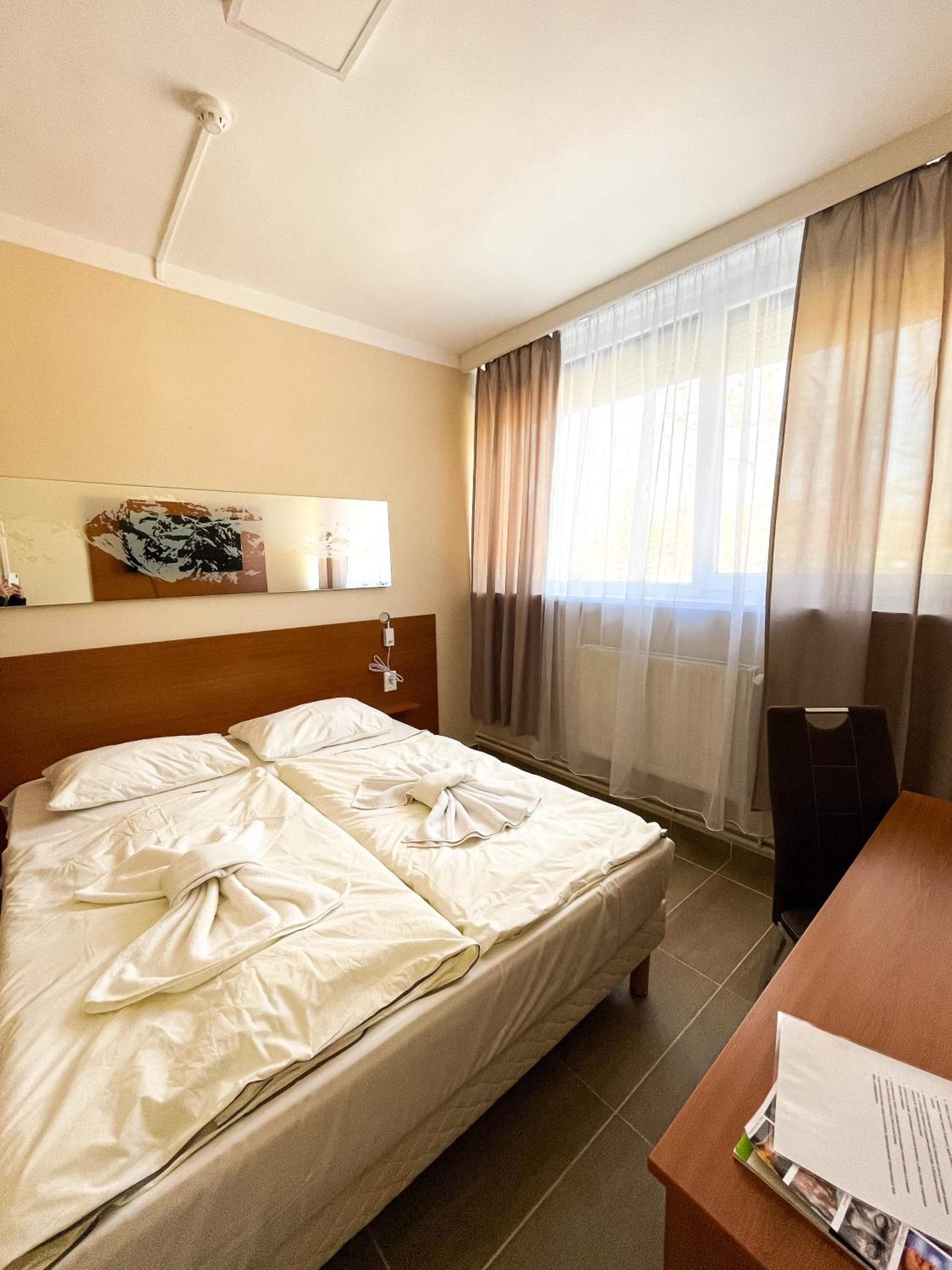 Erkezeskor eloszor nem a foglalasnak megfelelo szombat kaptuk,ezt kedvesen es azonnal korrigalta a recepcios Holgy,amikor jeleztuj. Az ujonnan kapott szoba igy viszont nem volt atszelloztetve,ami nem keltett rogton ja benyomast. A szobai szek huzata foltos volt, az ablaknal a falon oriasi azasnyom egtelenkedett.