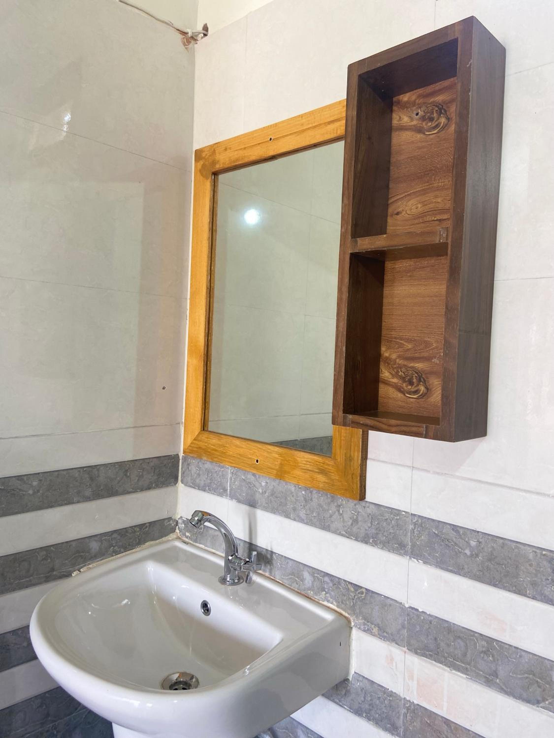 If exhaust fan is fitted in the wash room. Facility of hanger is provided in the room, as no wardrobe in the room.