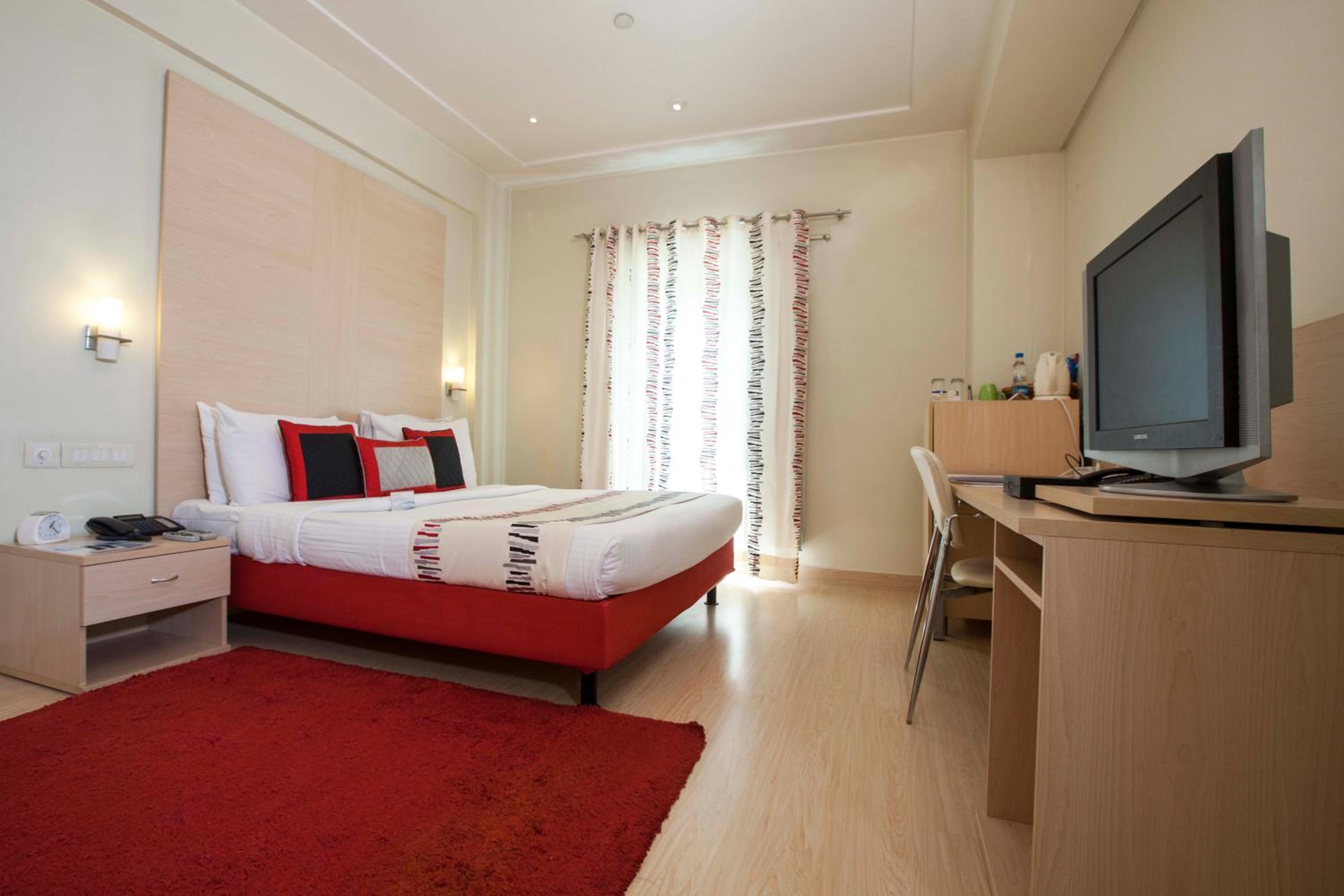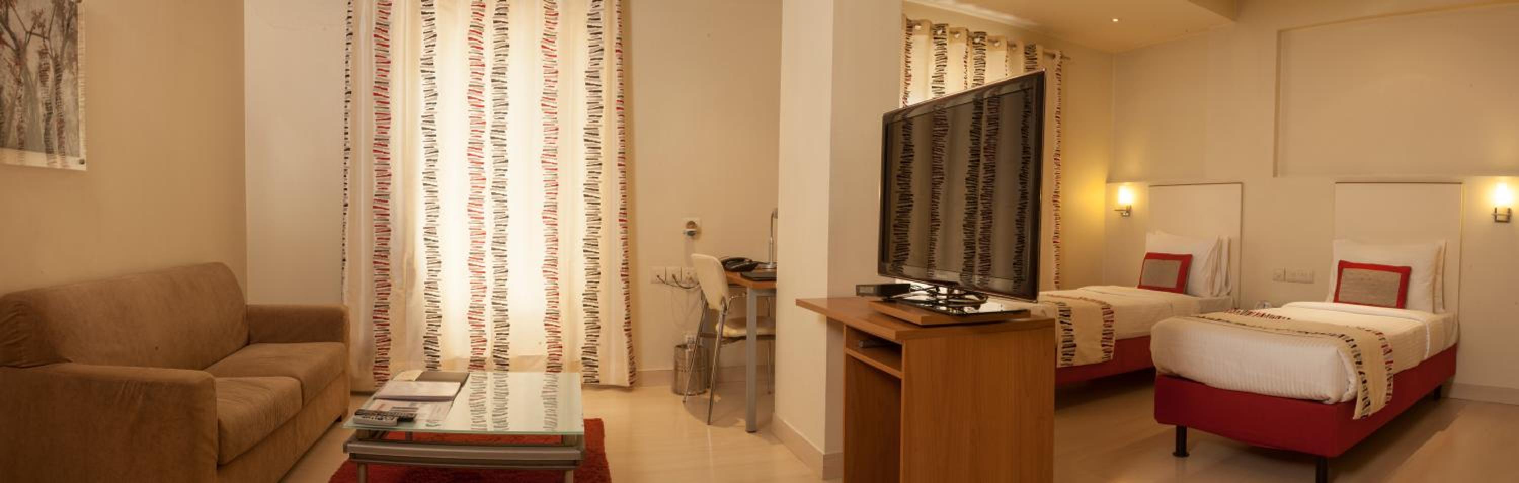 Luxurious Accommodation: The Avalon Courtyard Residence Suites in New Delhi offers elegant rooms with modern amenities, including a flat-screen TV and stylish bathrooms with complimentary toiletries.