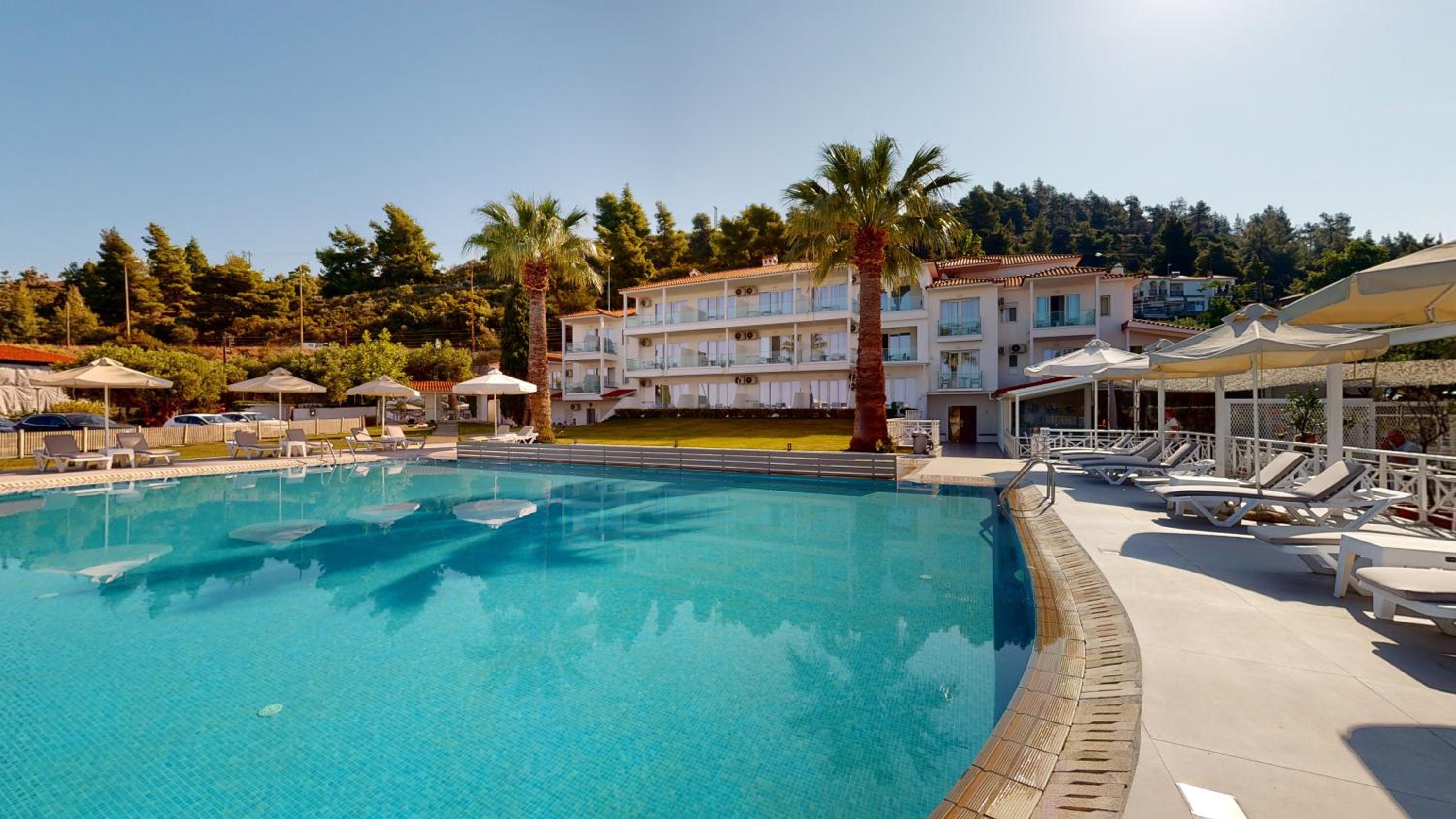 Enjoy a freshwater pool with a separate children’s area, perfect for both relaxation and play. Explore nearby Nikiti Village (11 km) and the famous Vourvourou Beach (20 km) for more adventure.