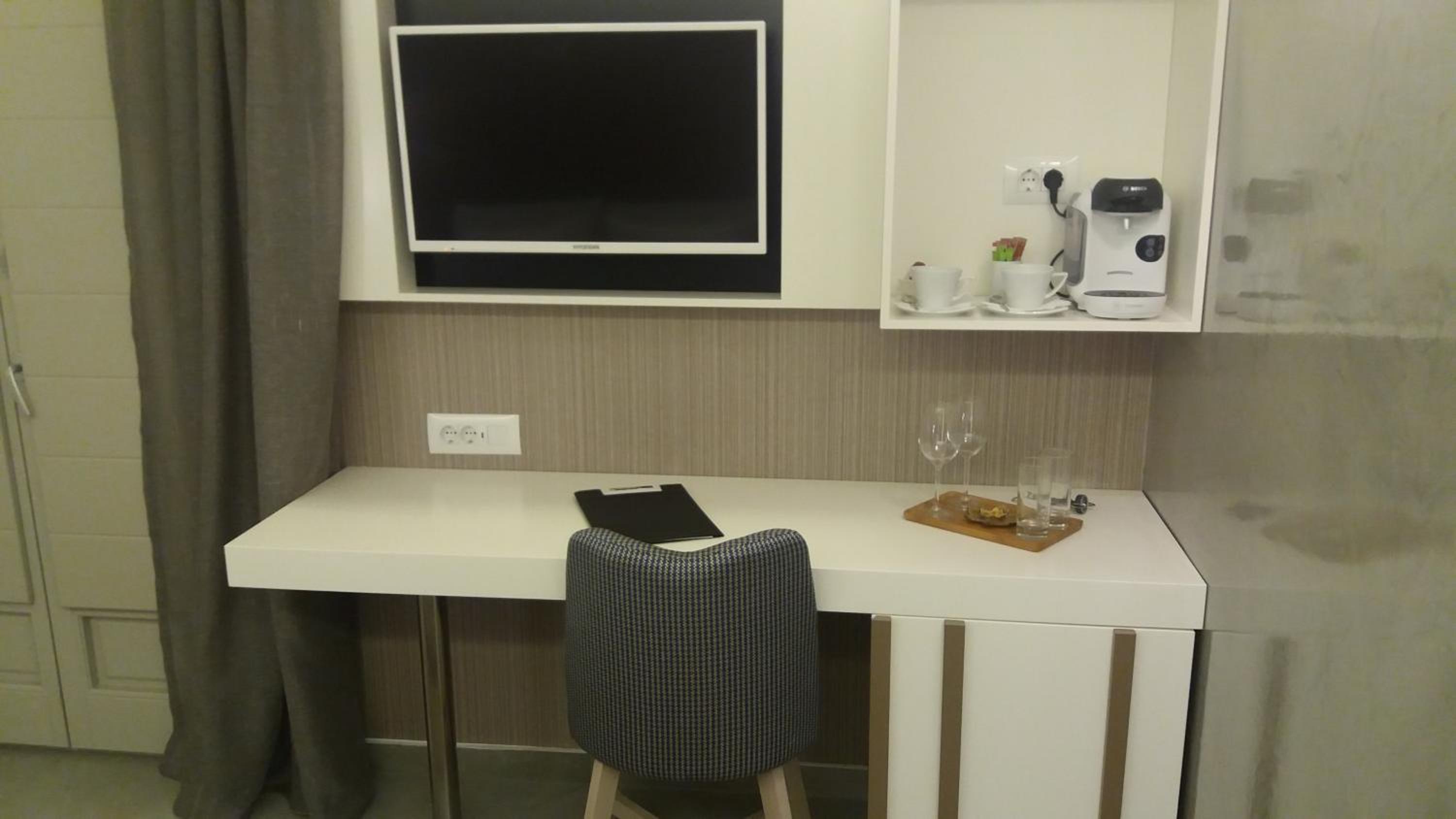 Ótima localização, na região central de Fira!! O quarto apesar de pequeno está bem cuidado. Banheiro bom!