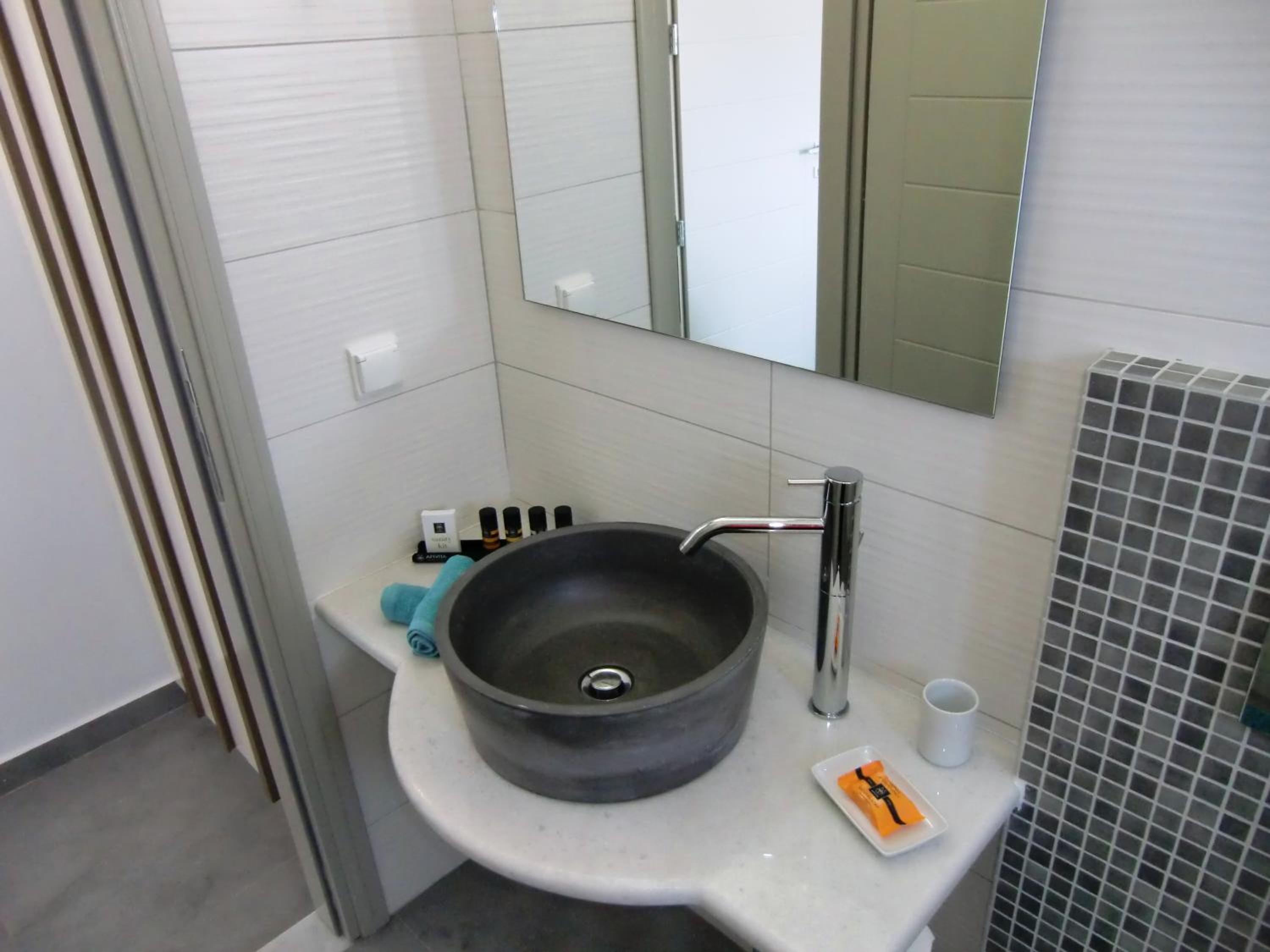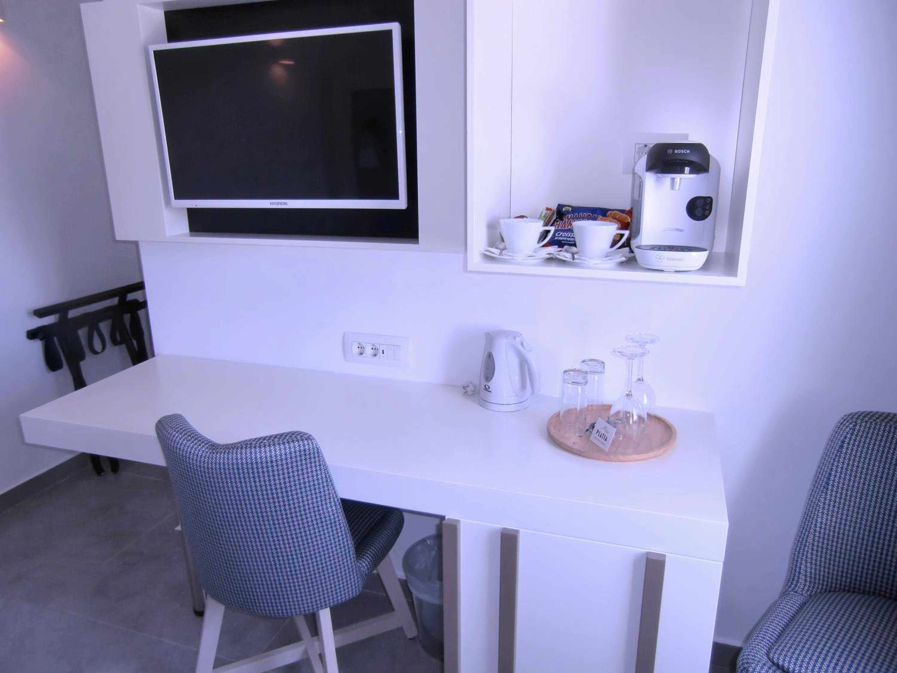 Platia offers modern, air-conditioned rooms with balconies boasting town views. Each room is equipped with a smart TV, coffee machine, kettle, and fridge. The spacious bathrooms feature walk-in showers, hairdryers, slippers, bathrobes, and luxury toiletries.