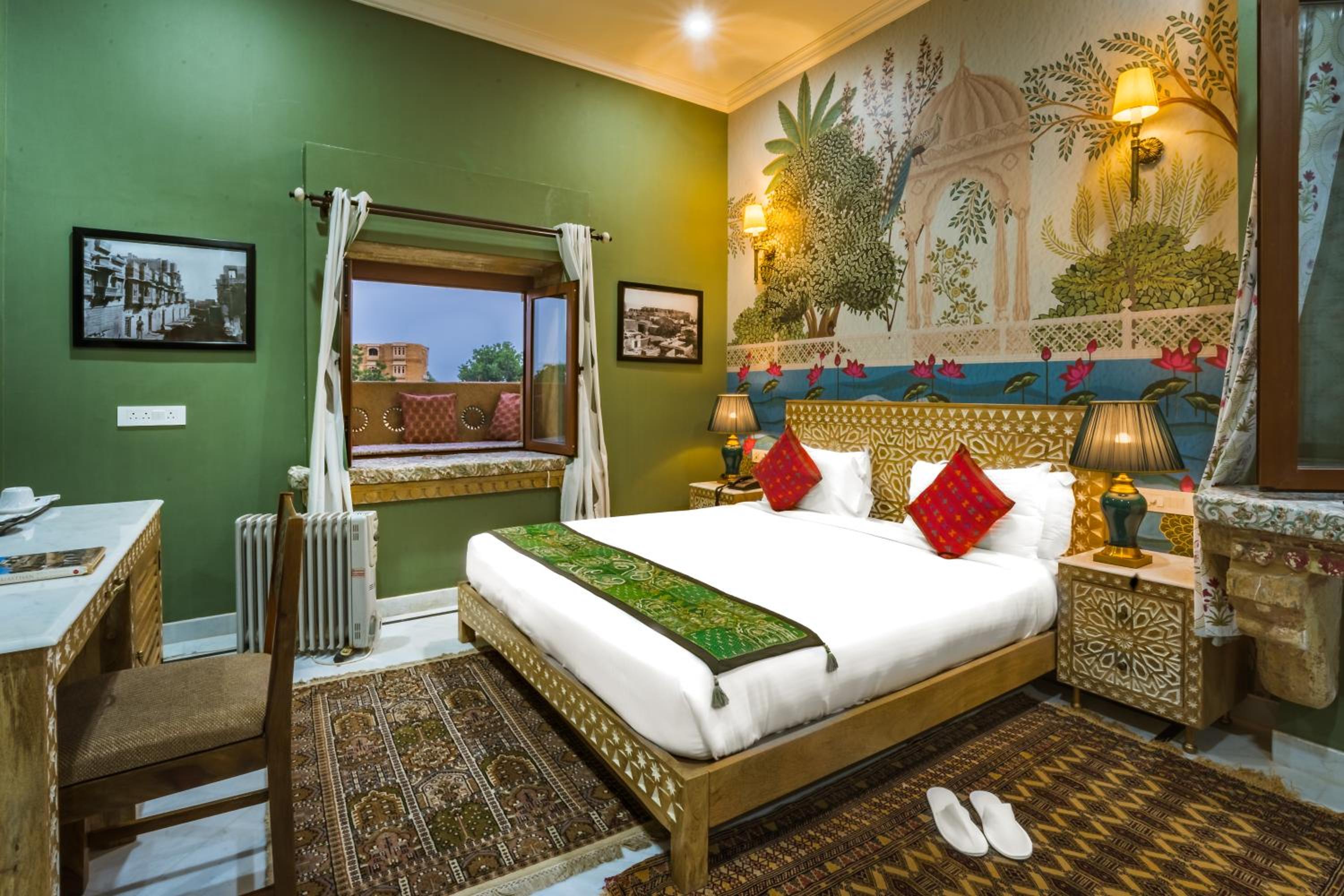 Beautiful building (inside and outside), spotlessly clean, has a mesmerising rooftop view of the fort, is a short enough walk to the fort and Gadisar lake, has friendly and helpful staff (especially Atul), and offers a very good price/quality ratio.