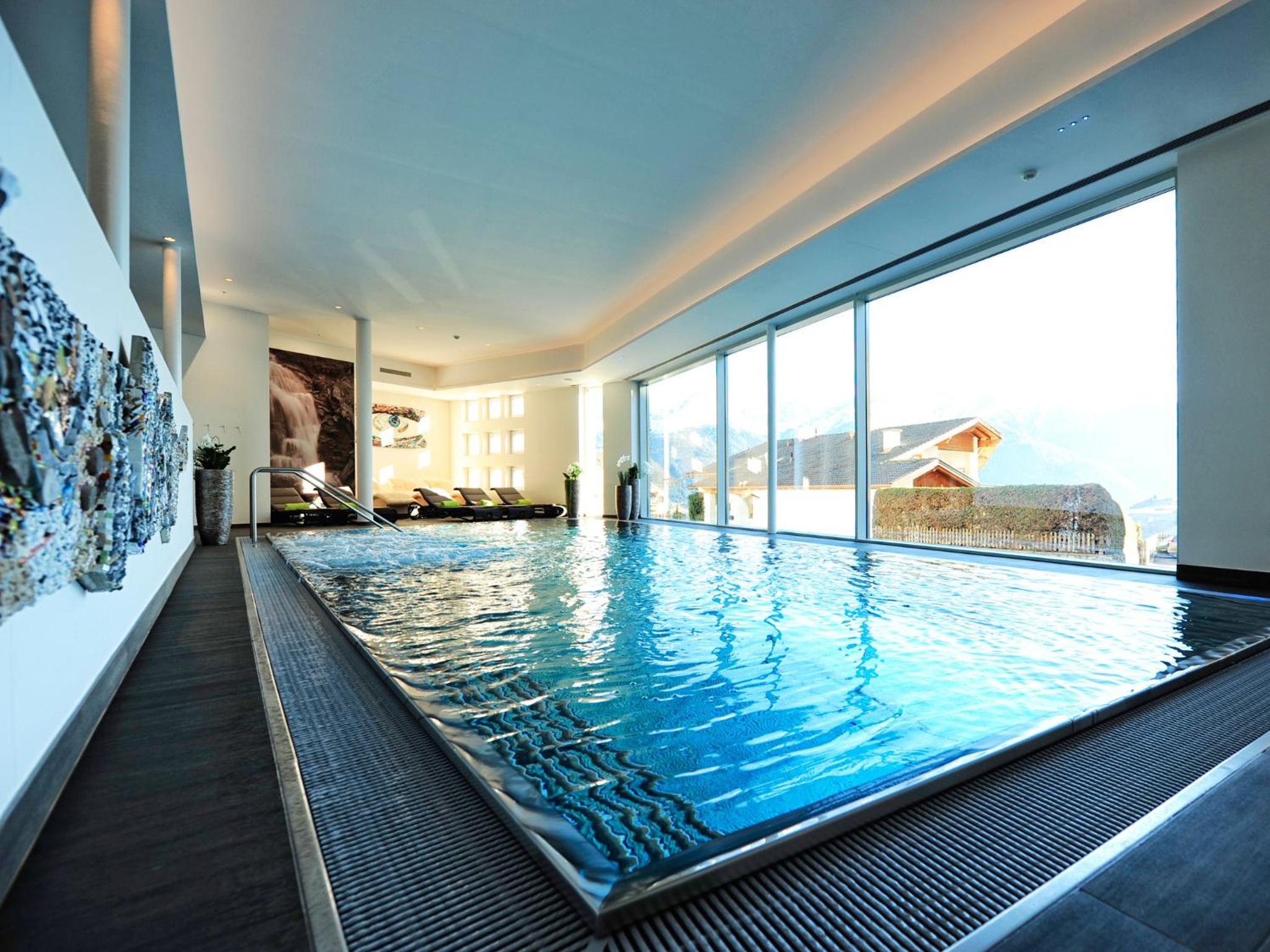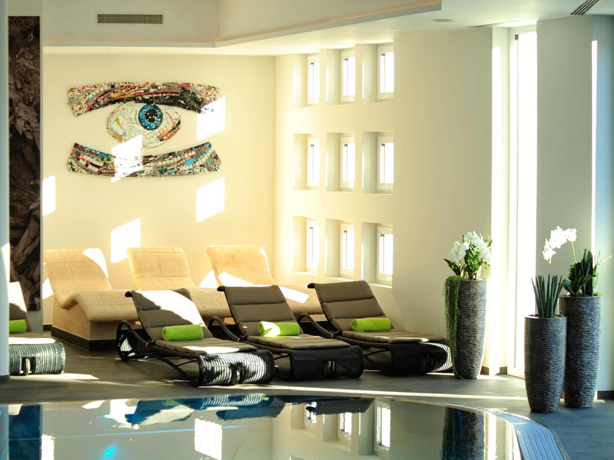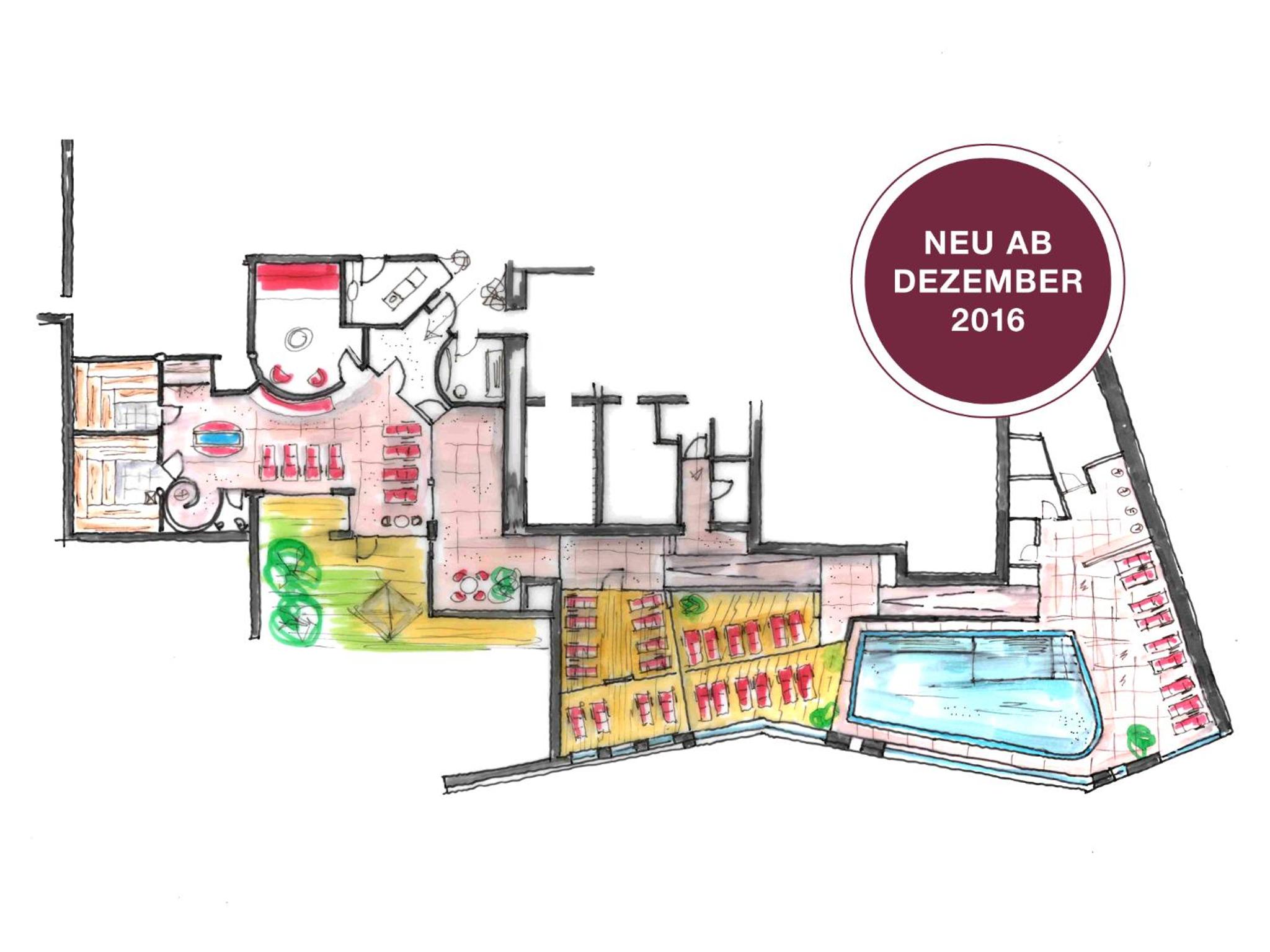 The wellness area includes a swimming pool with a jacuzzi, sauna area, relaxation area, and solarium.
