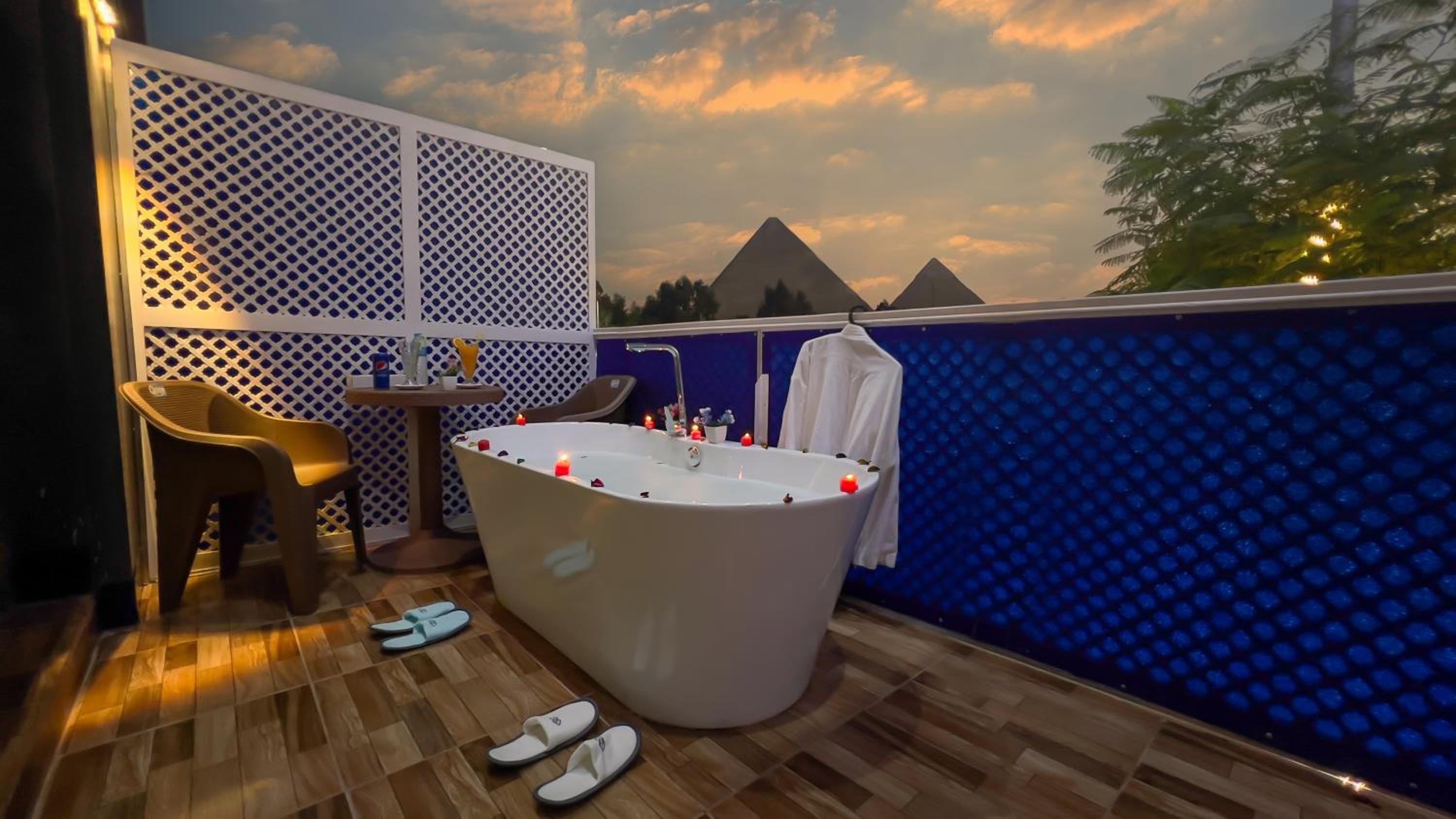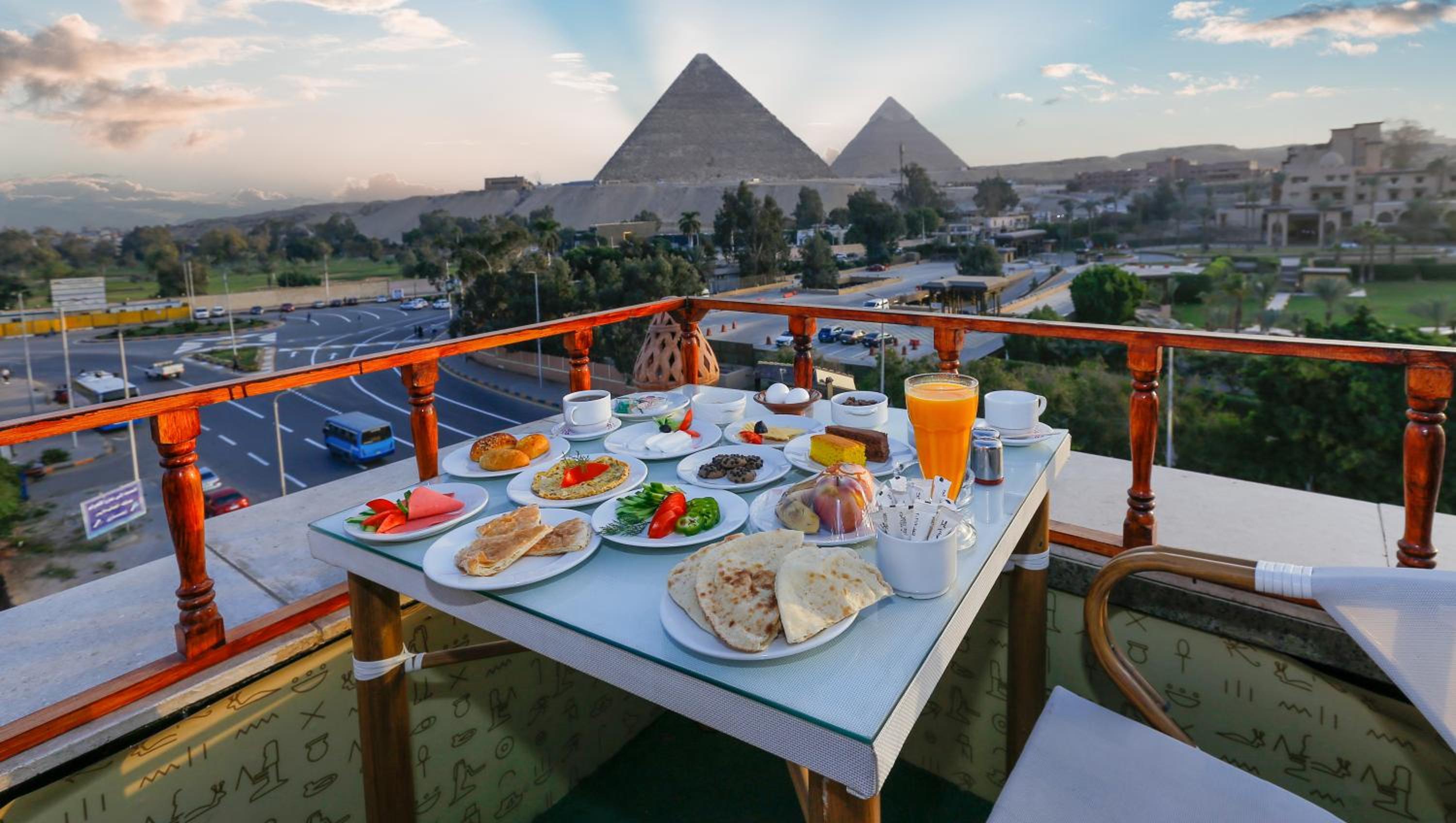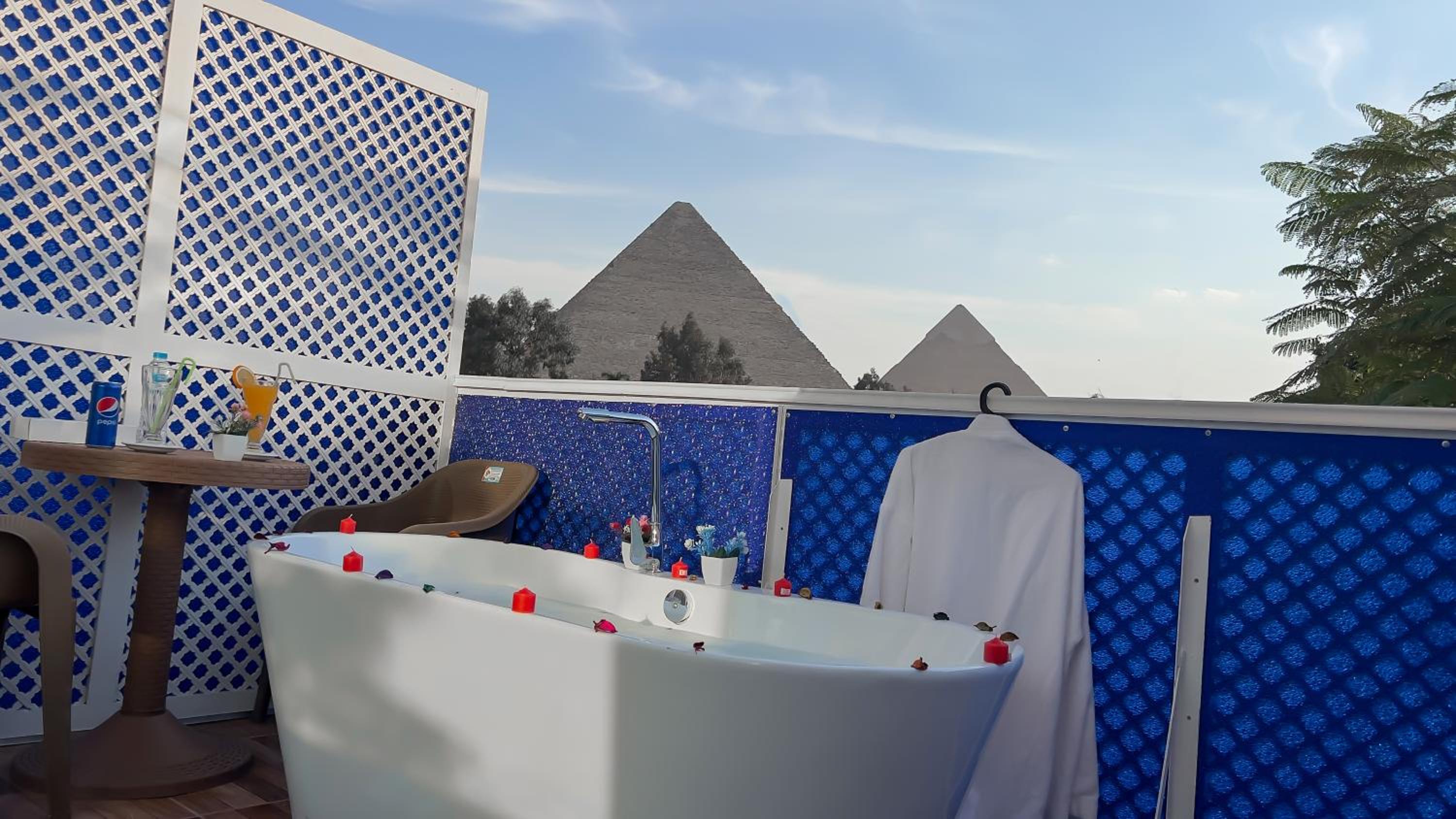 L’emplacement et la vue depuis la chambre sur les pyramides. Le rooftop. Les jus frais de l’hôtel.