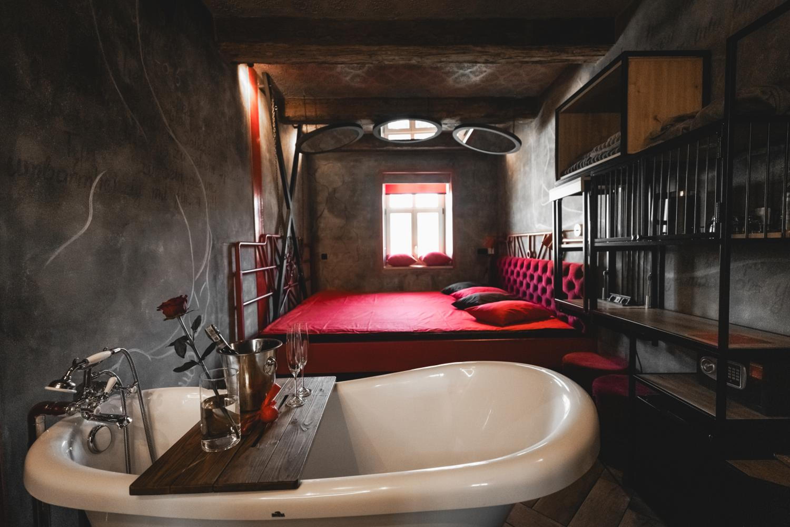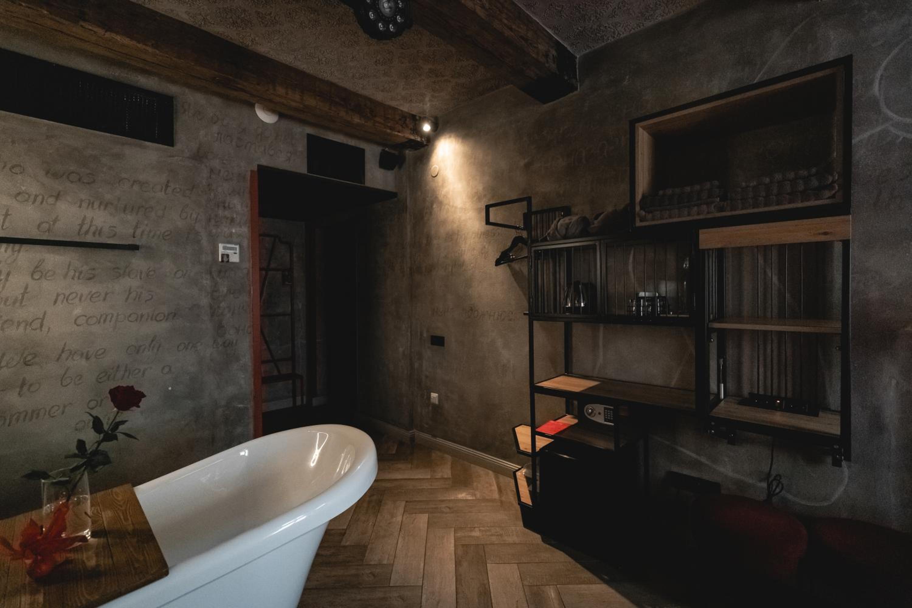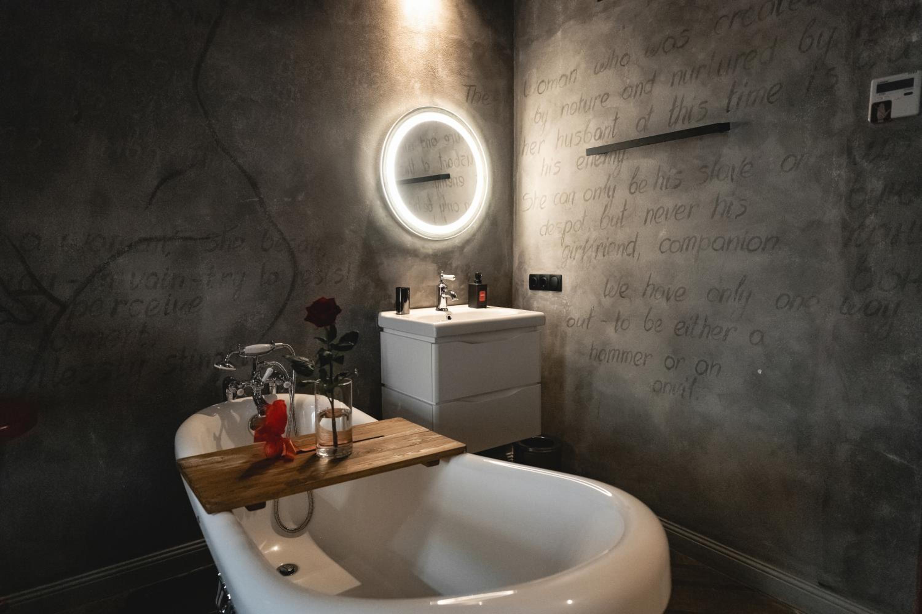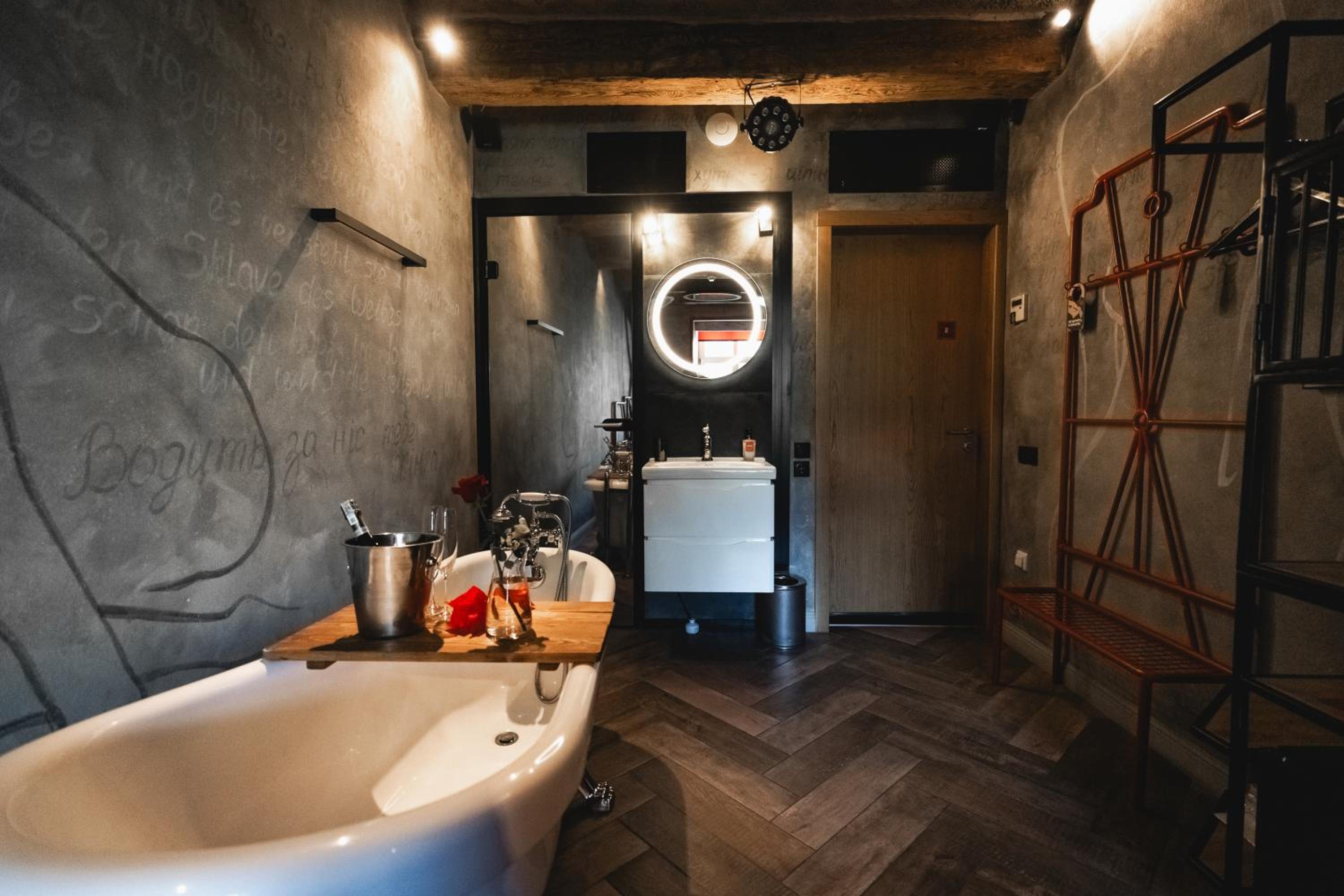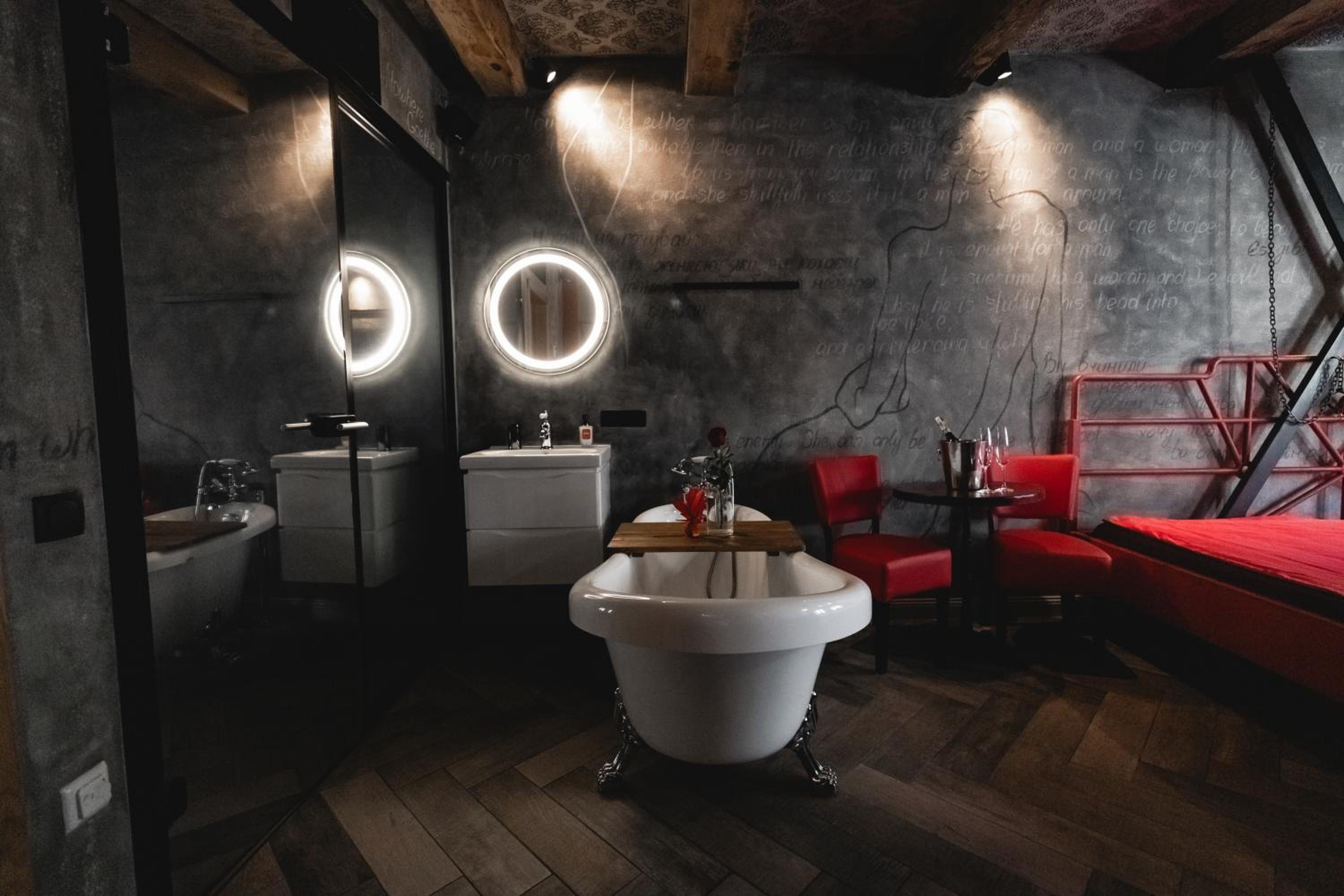 Nieoczywisty wustroj pokoju pasujacy do tematyki lokalu, wanna.