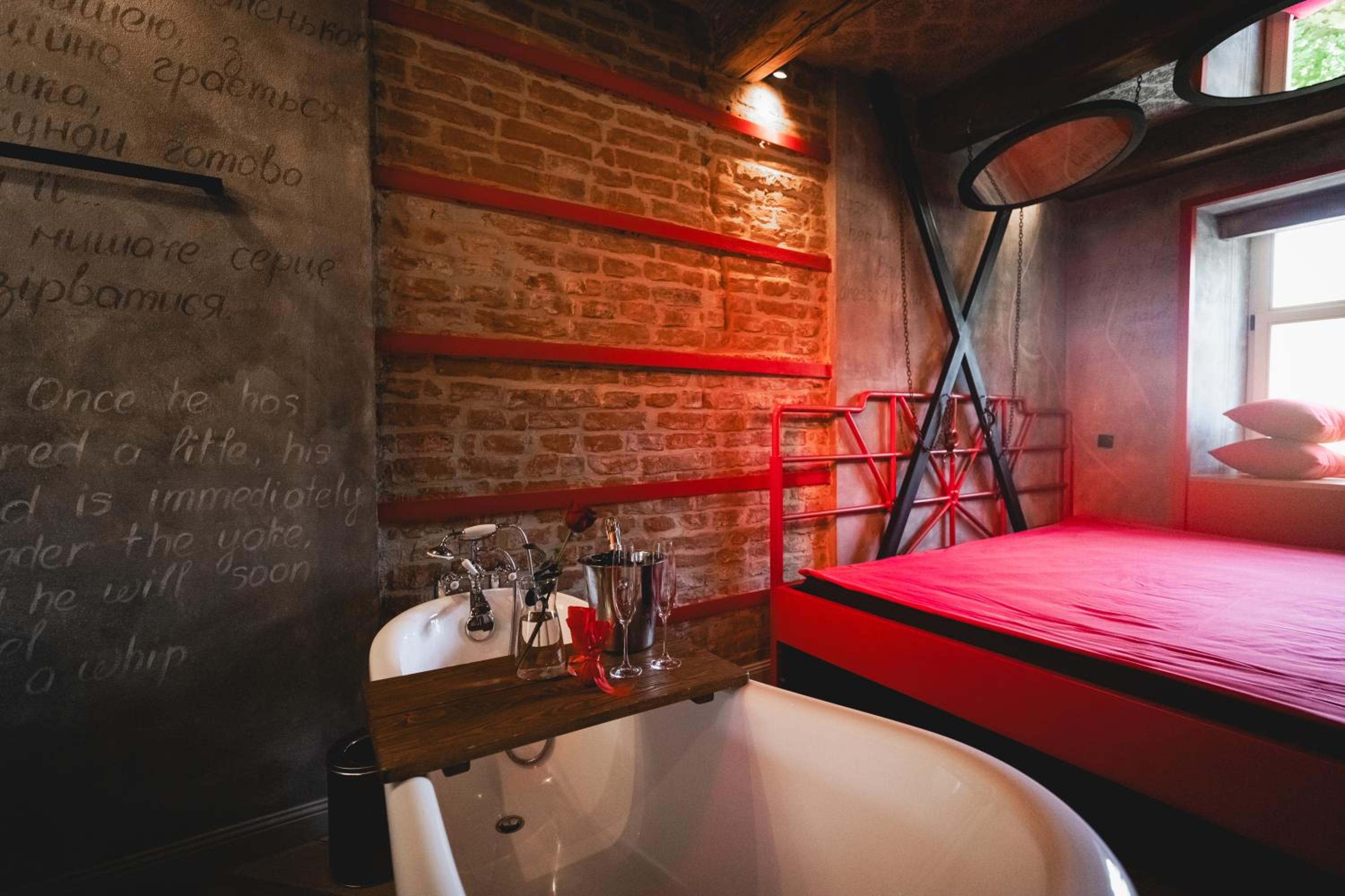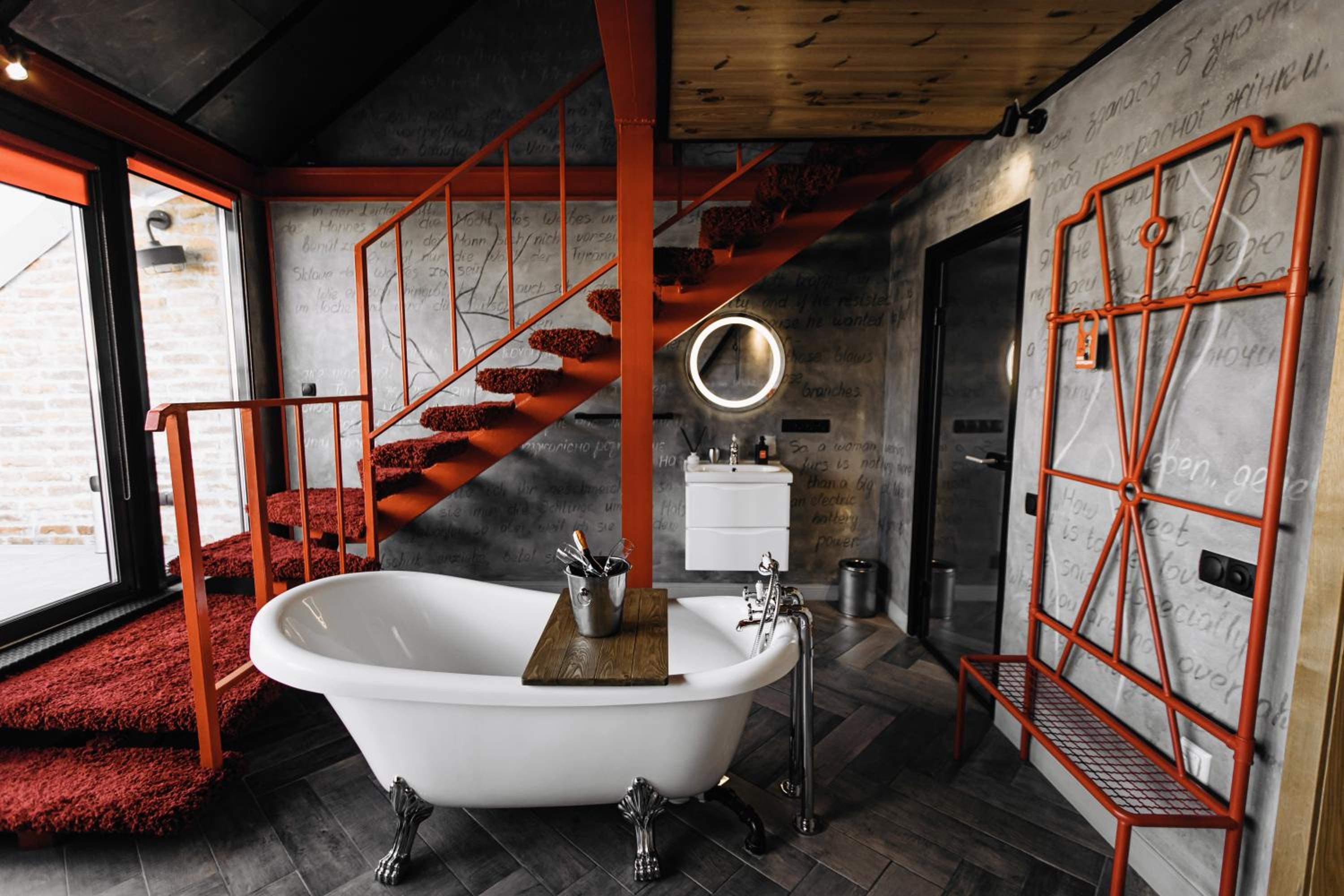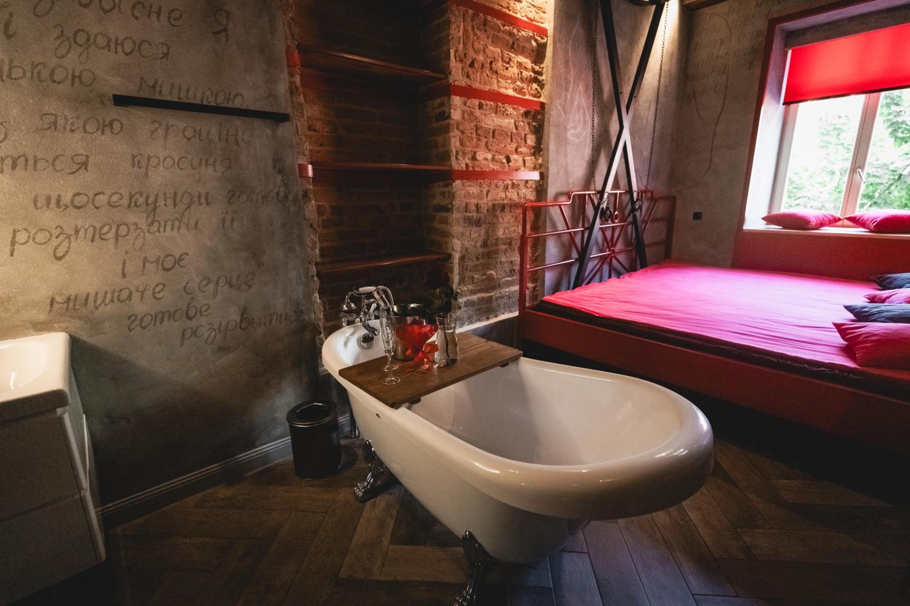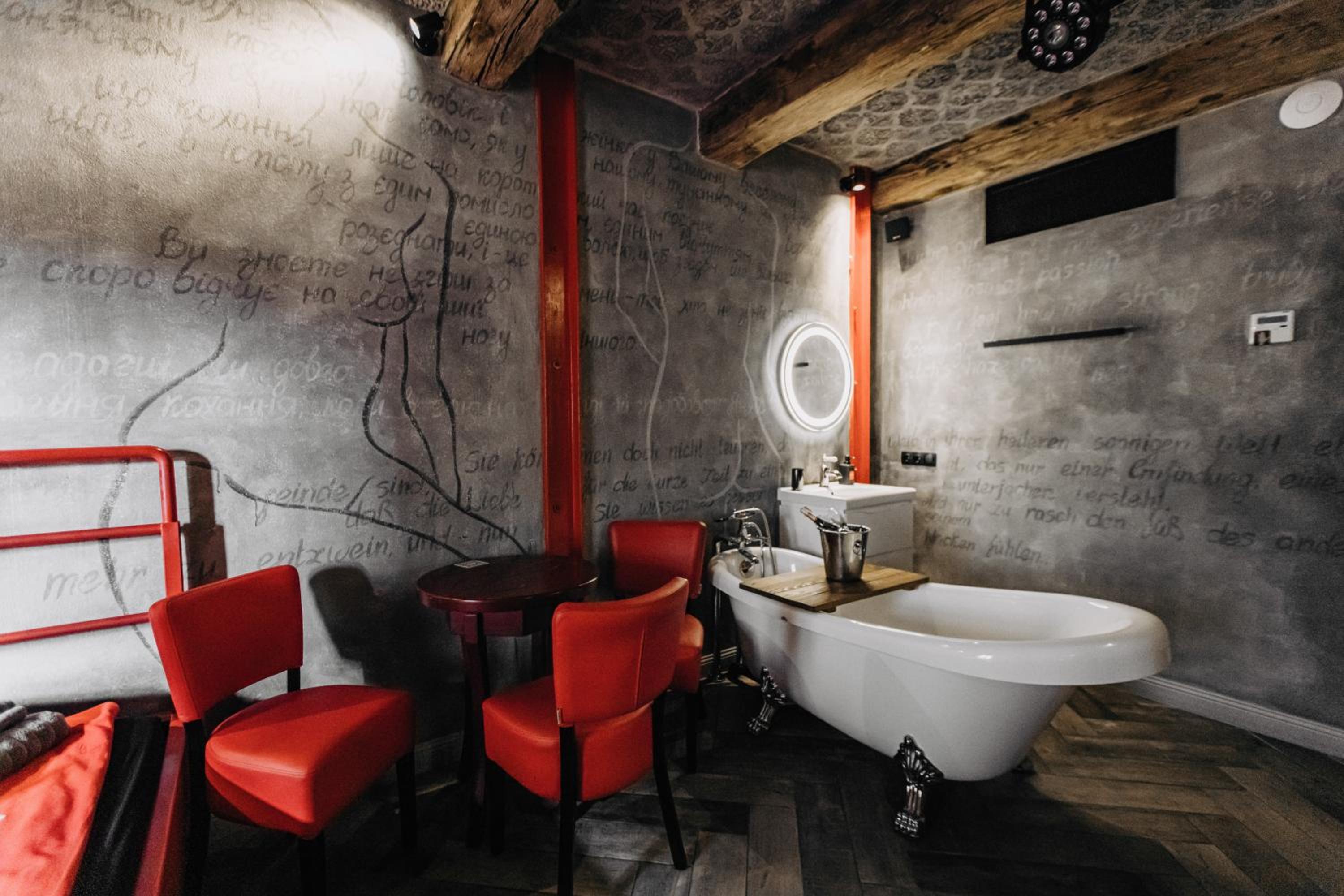 Nieoczywisty wustroj pokoju pasujacy do tematyki lokalu, wanna.