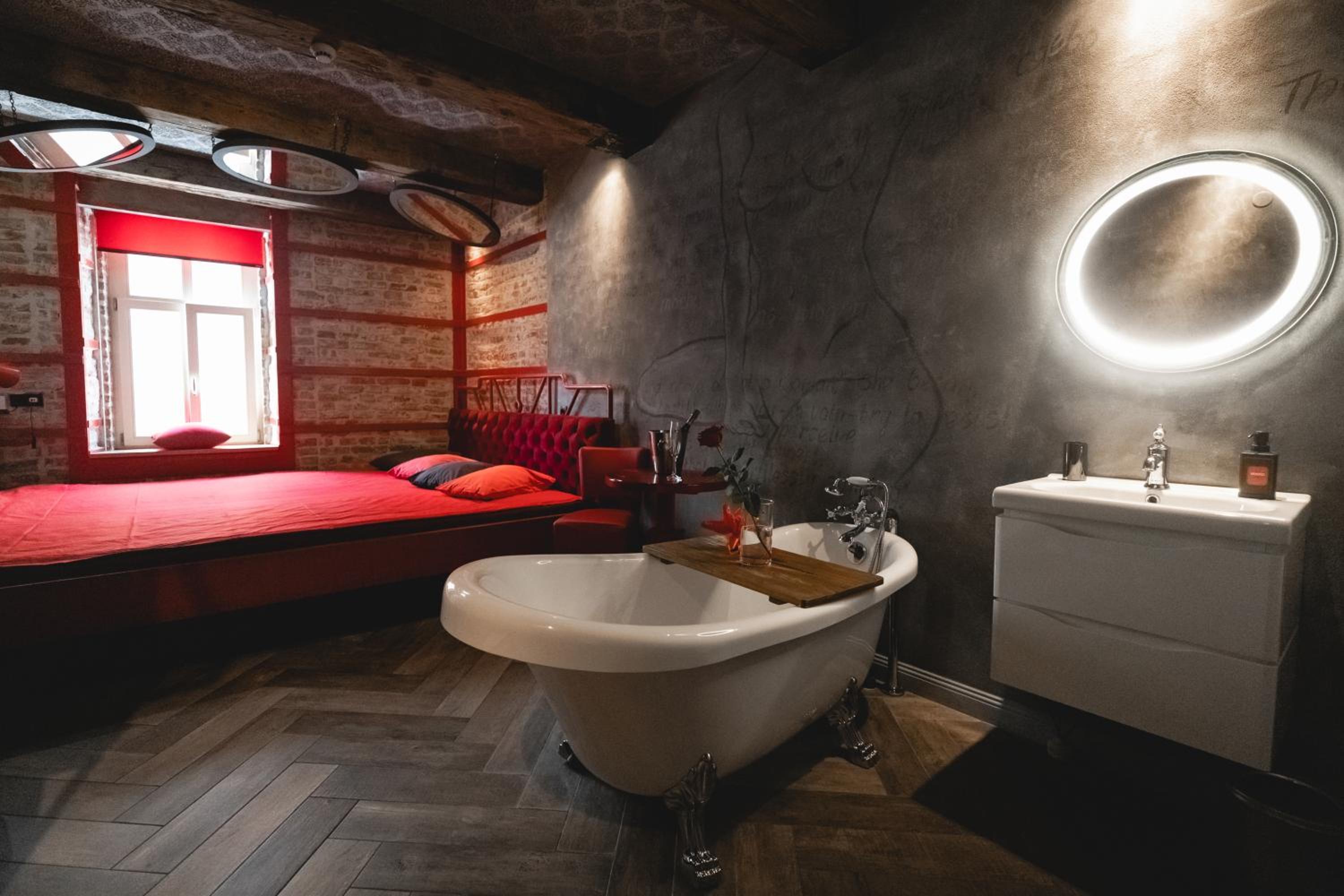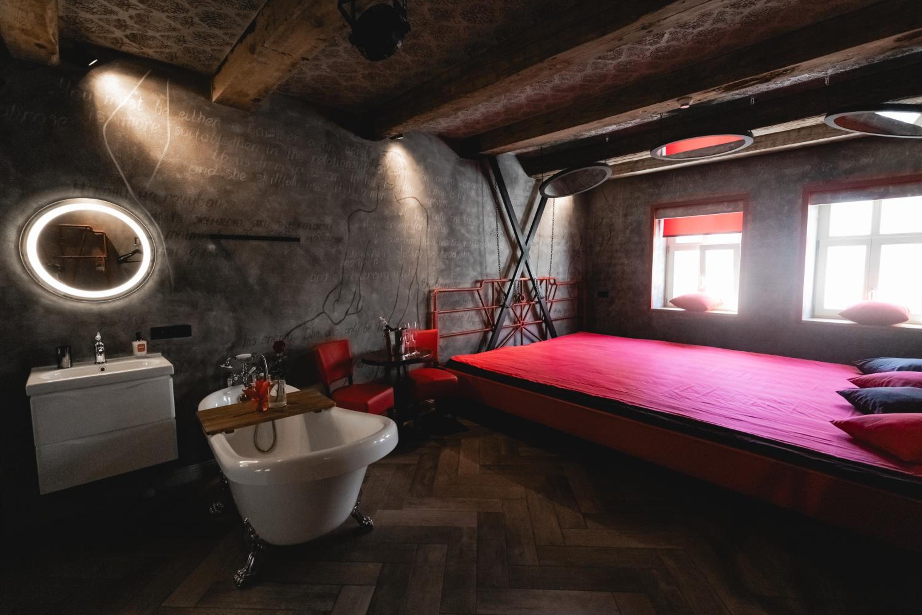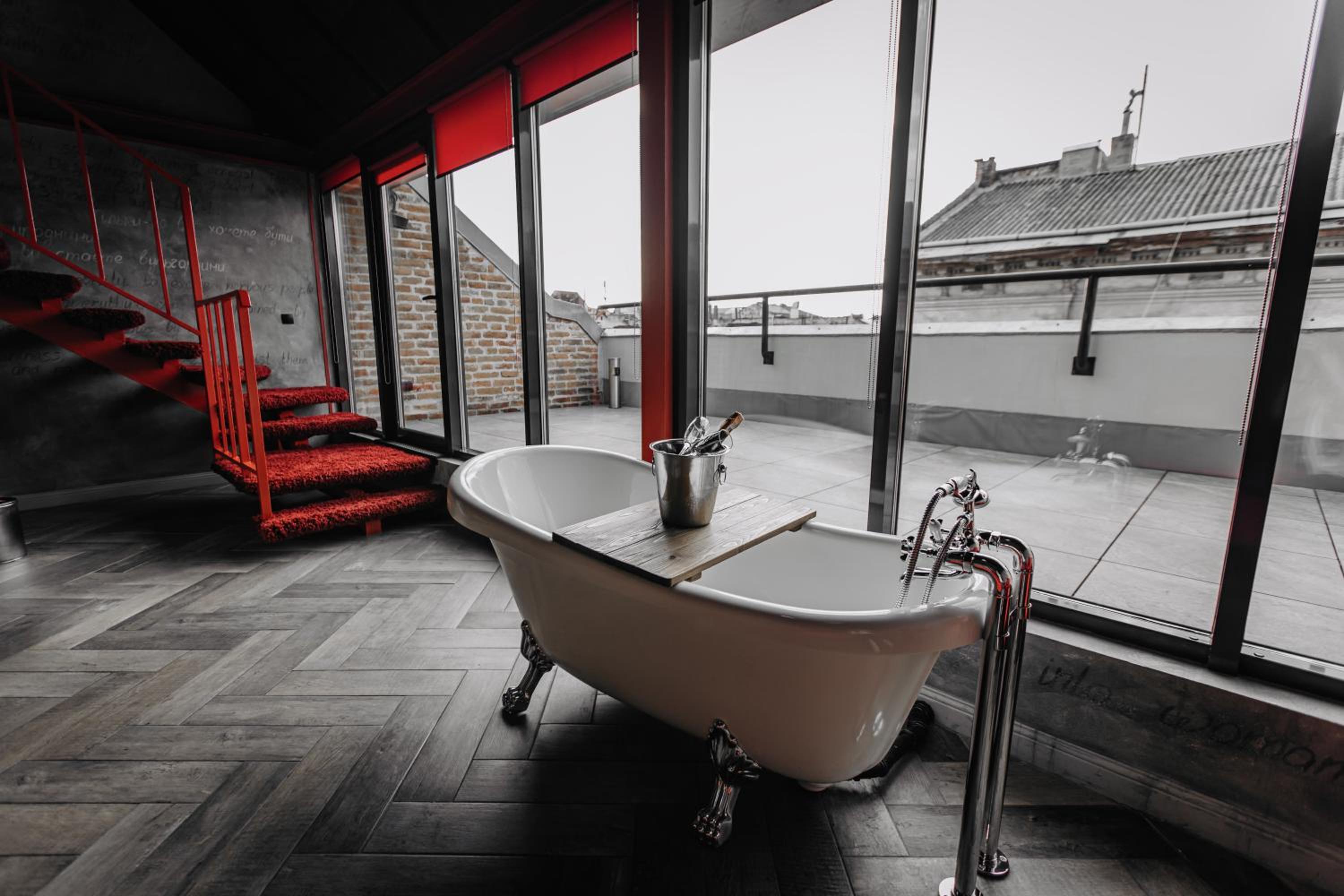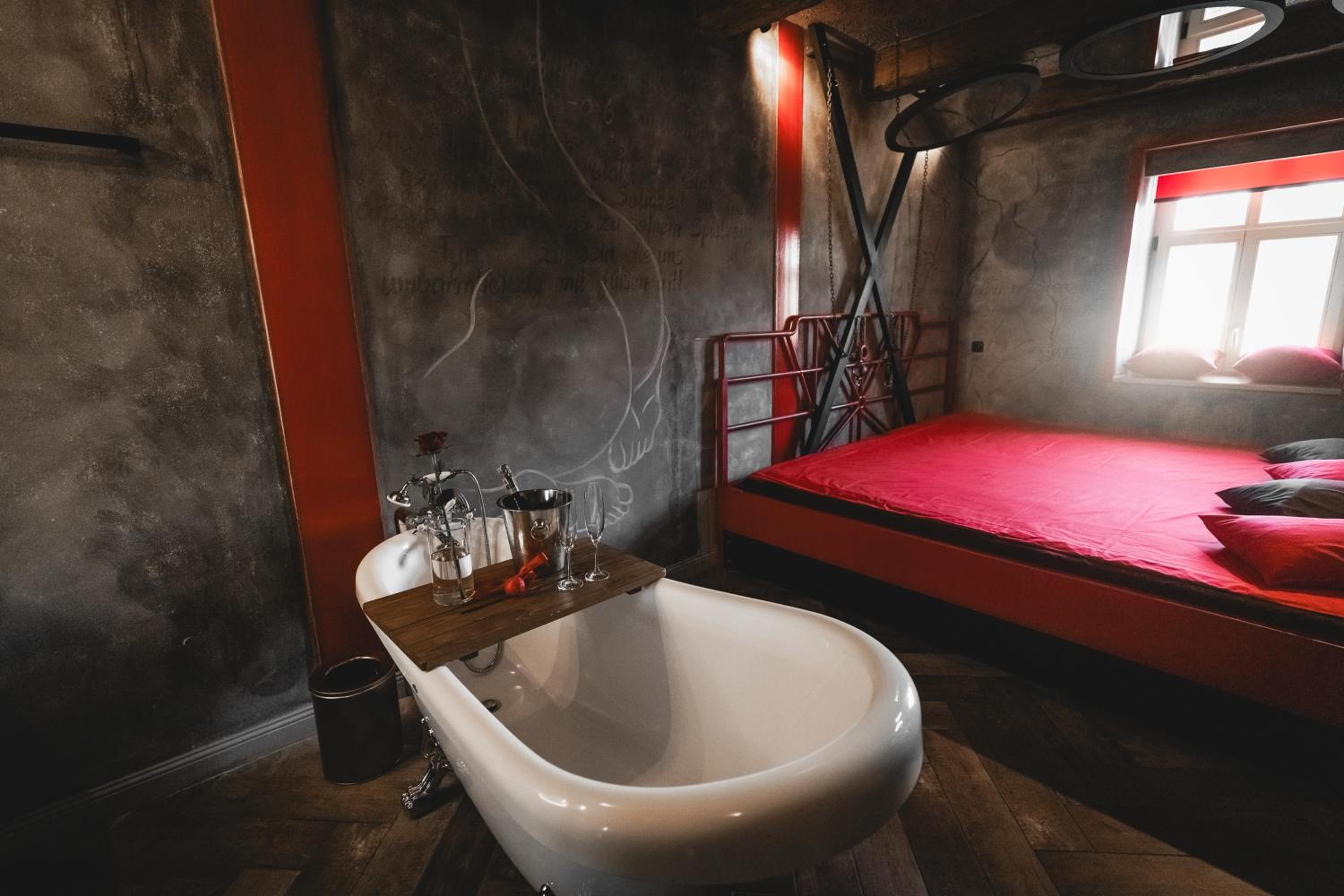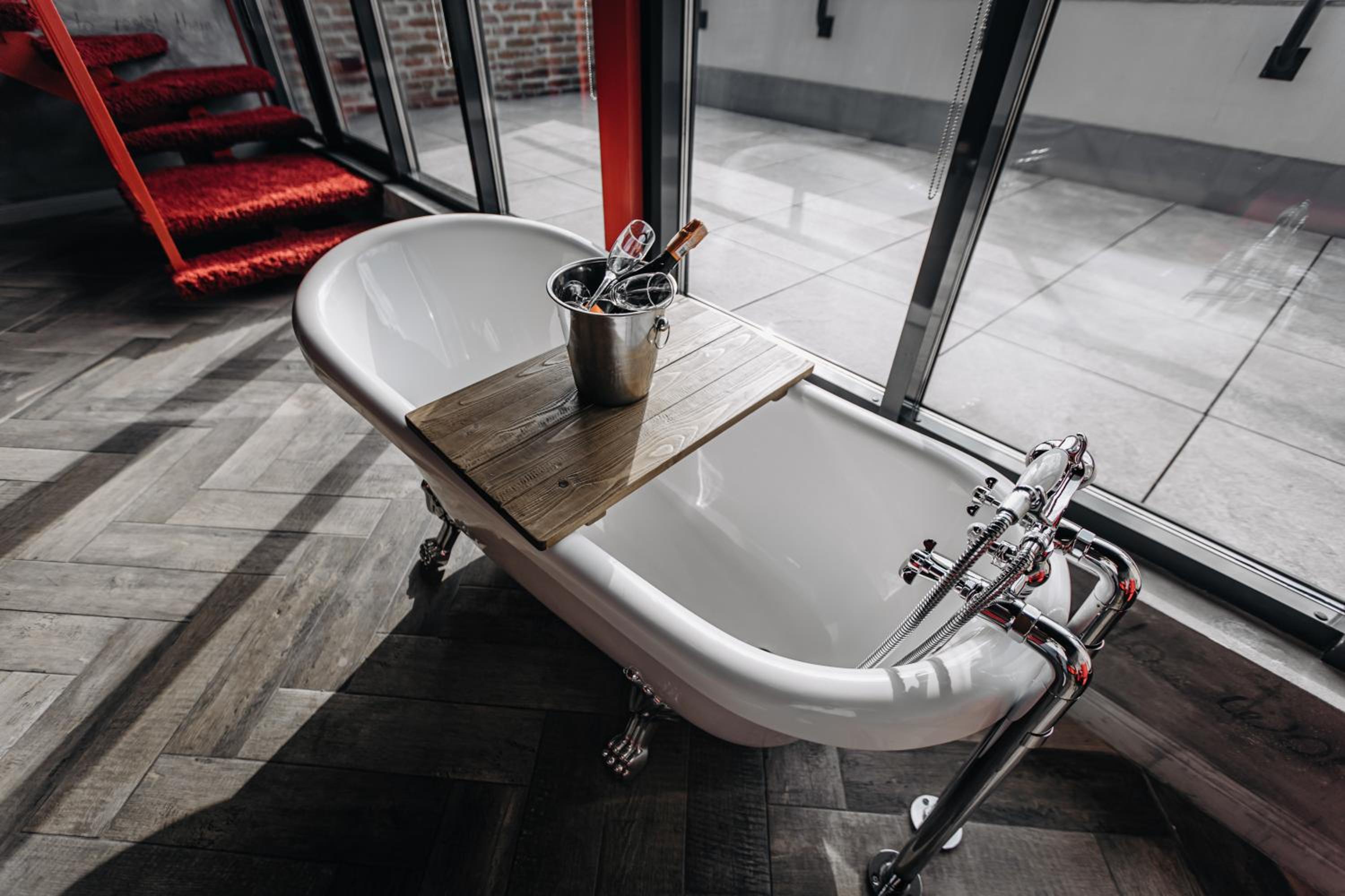 Nieoczywisty wustroj pokoju pasujacy do tematyki lokalu, wanna.