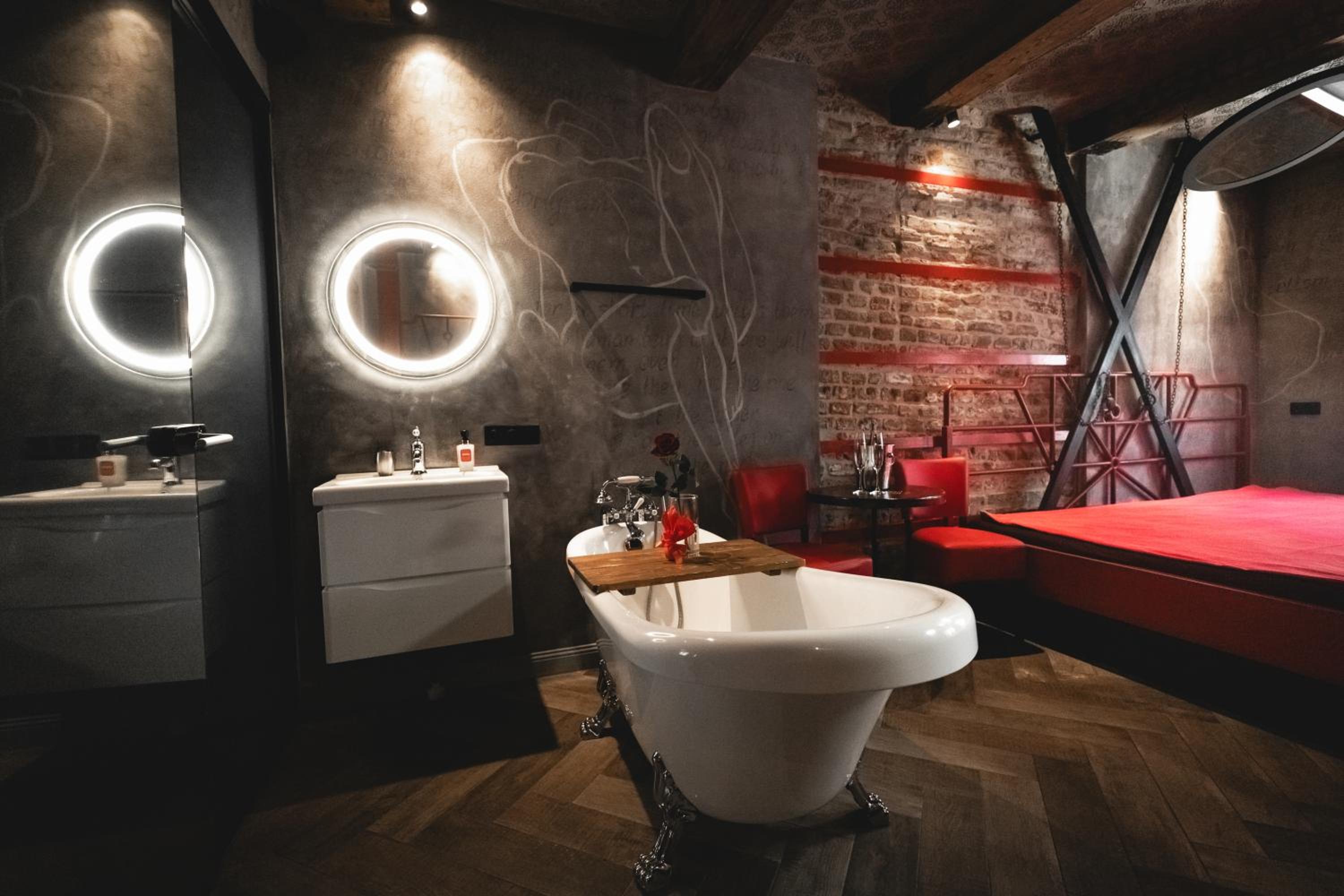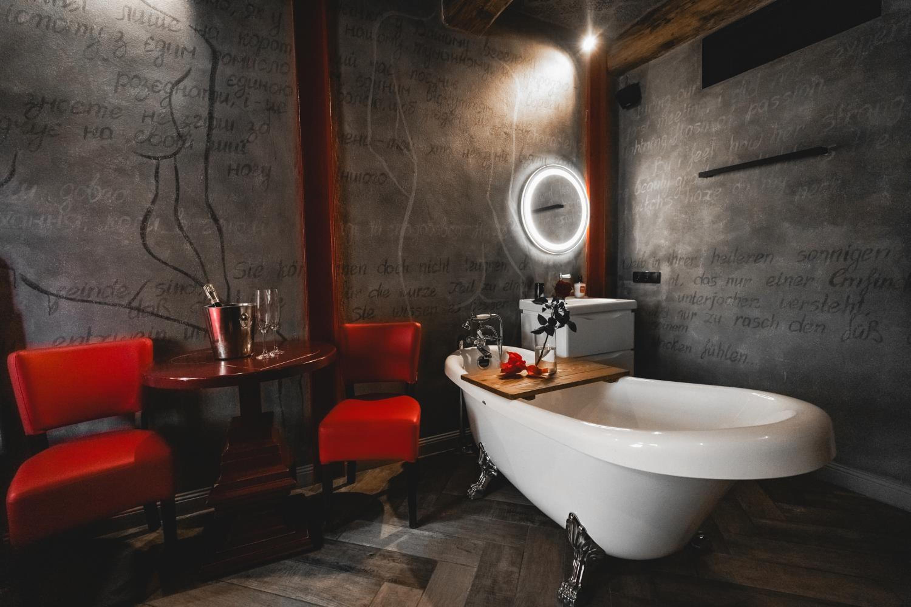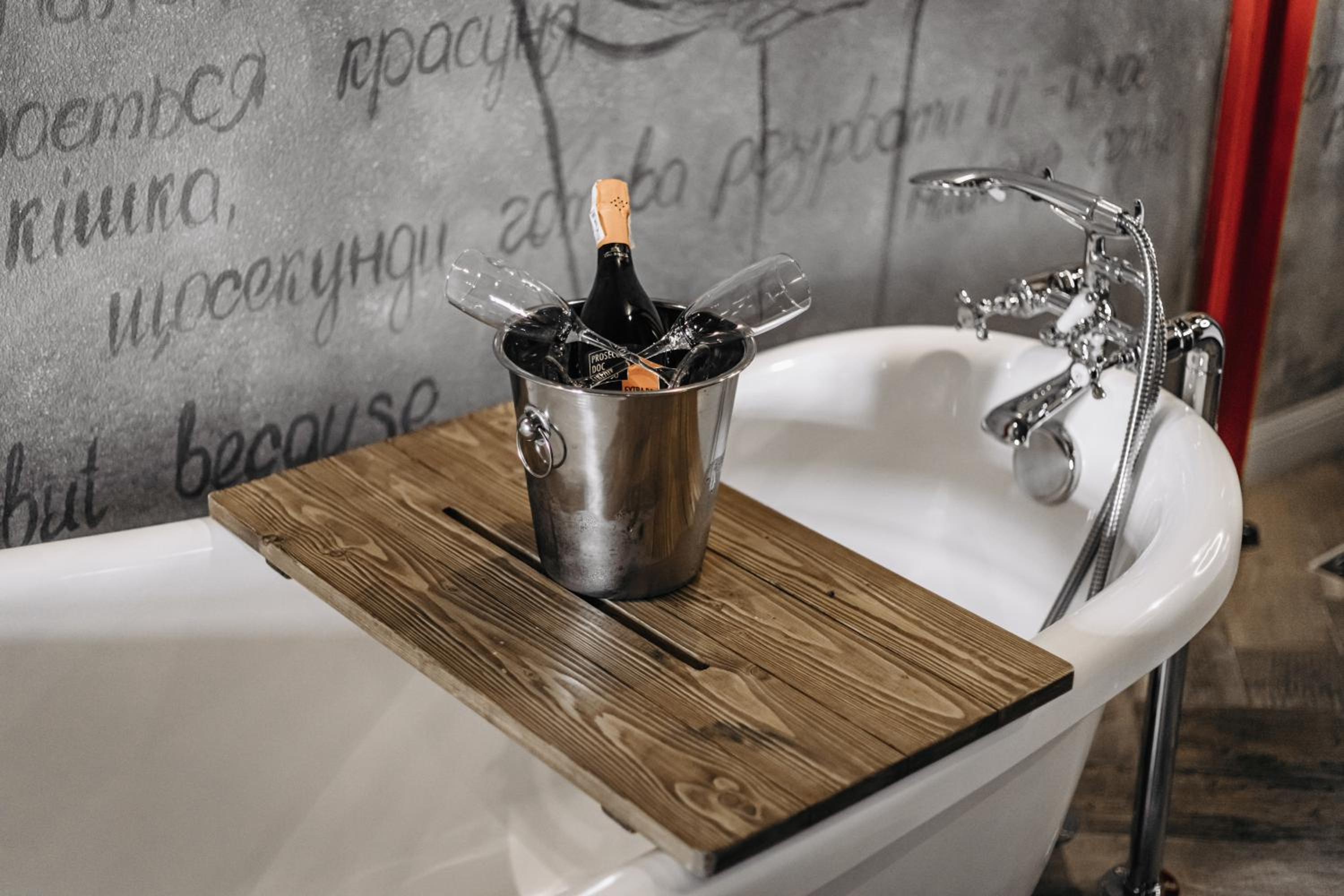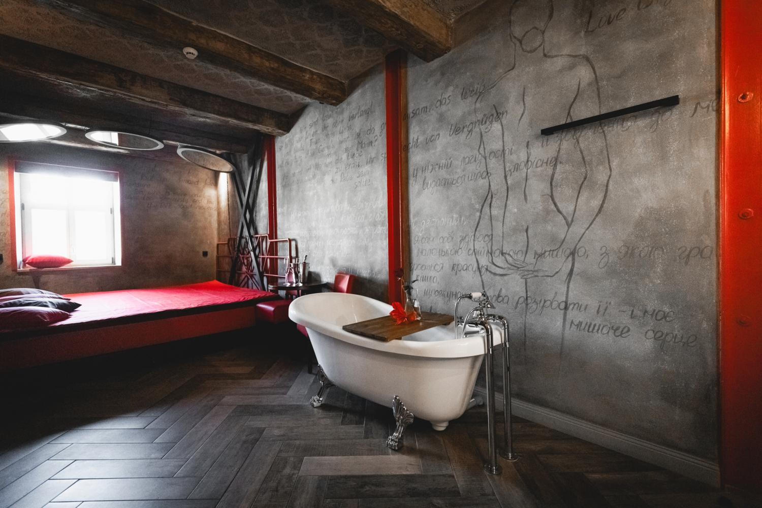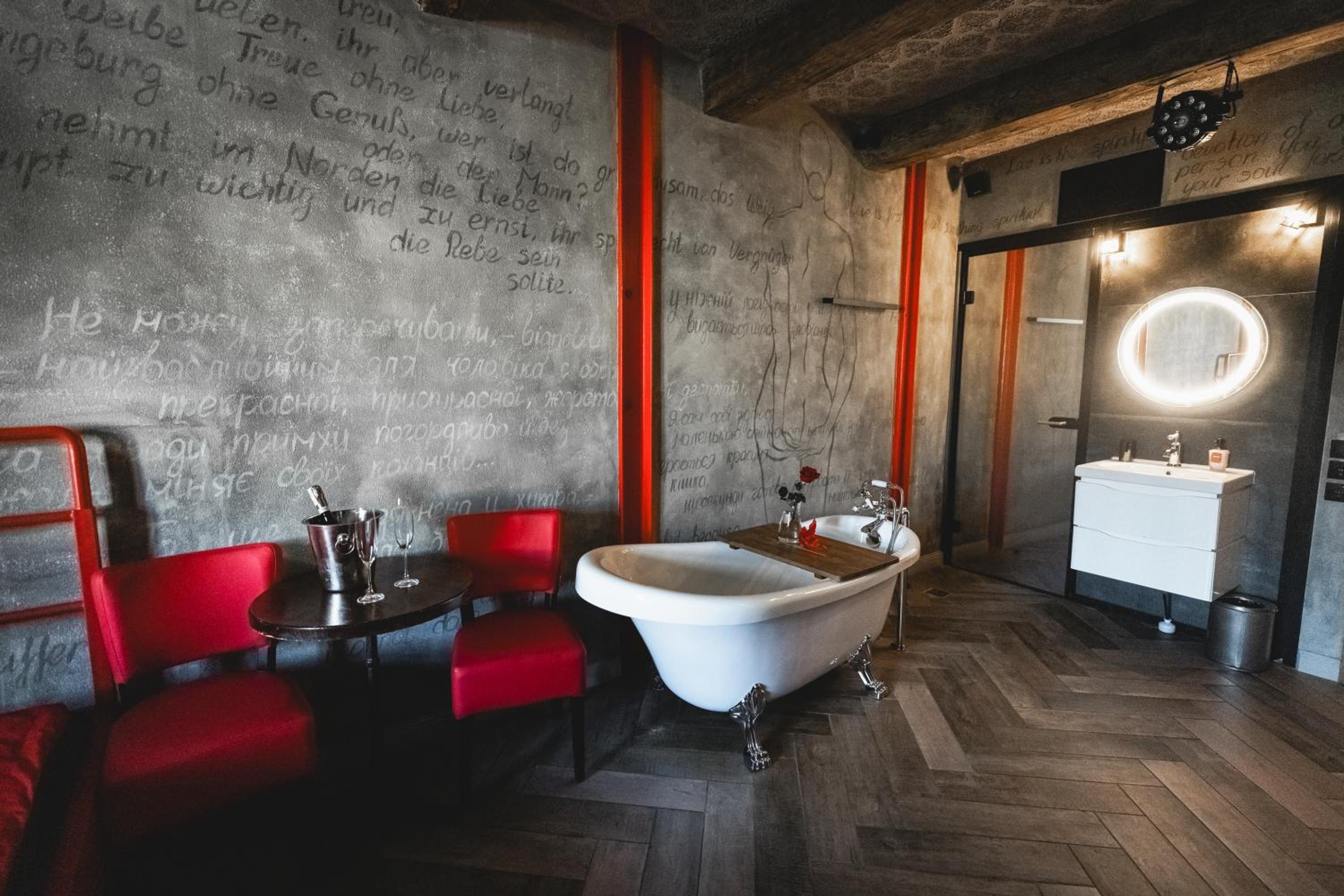 Nieoczywisty wustroj pokoju pasujacy do tematyki lokalu, wanna.