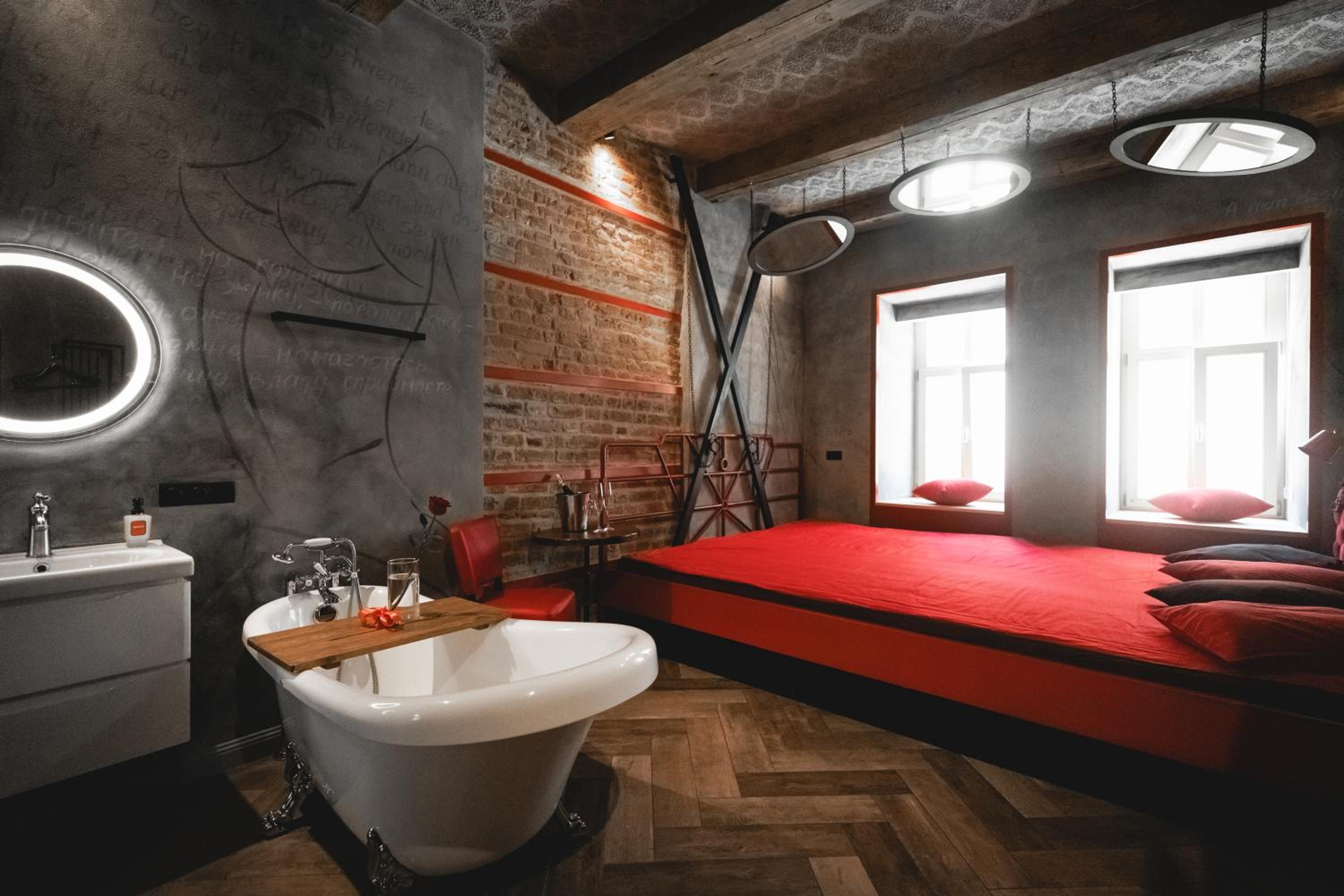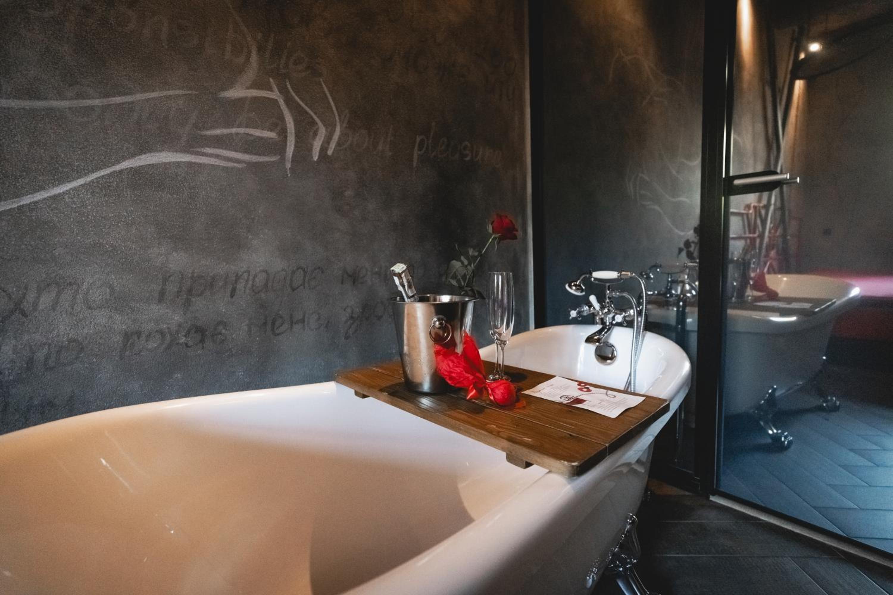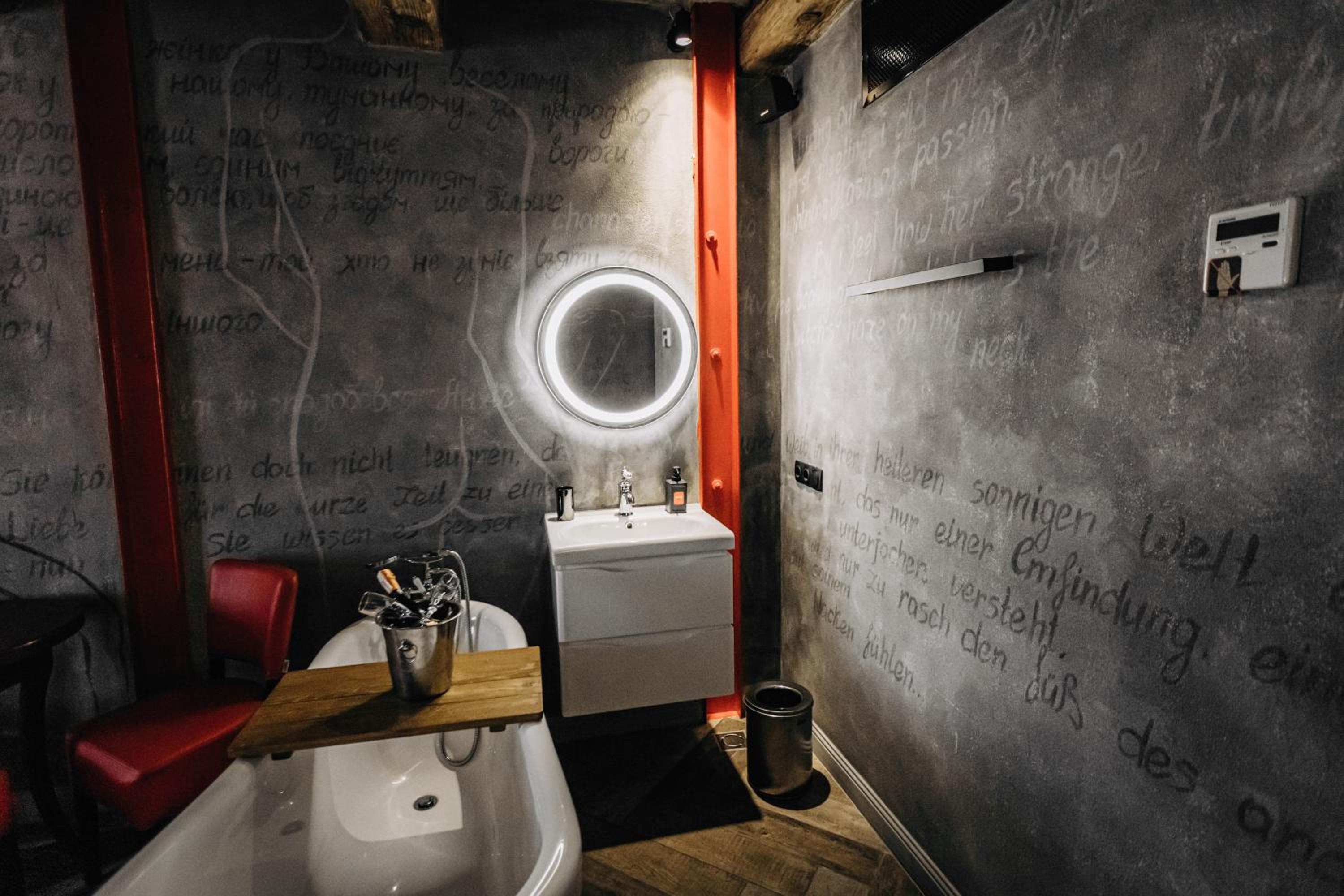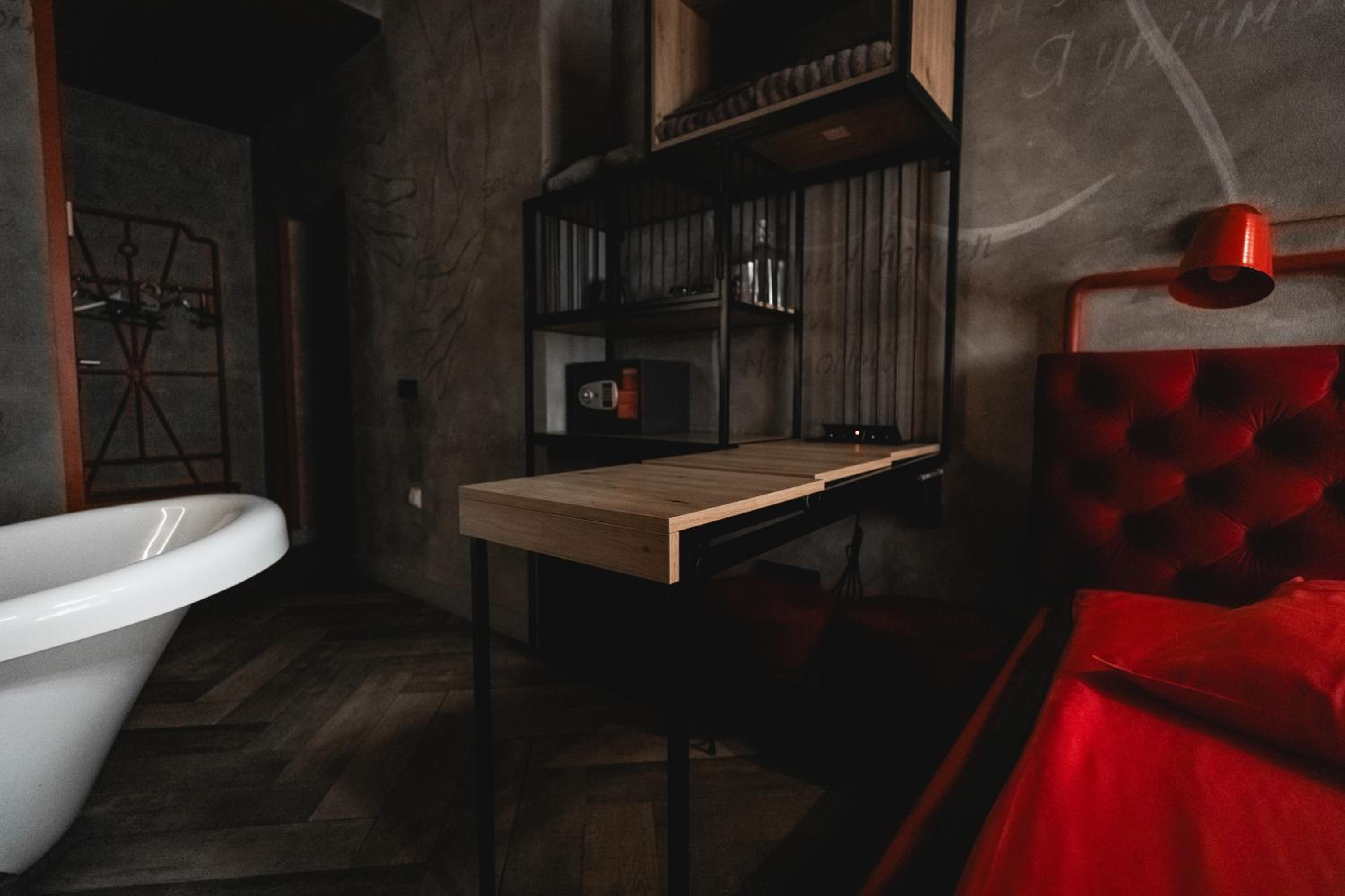 Nieoczywisty wustroj pokoju pasujacy do tematyki lokalu, wanna.