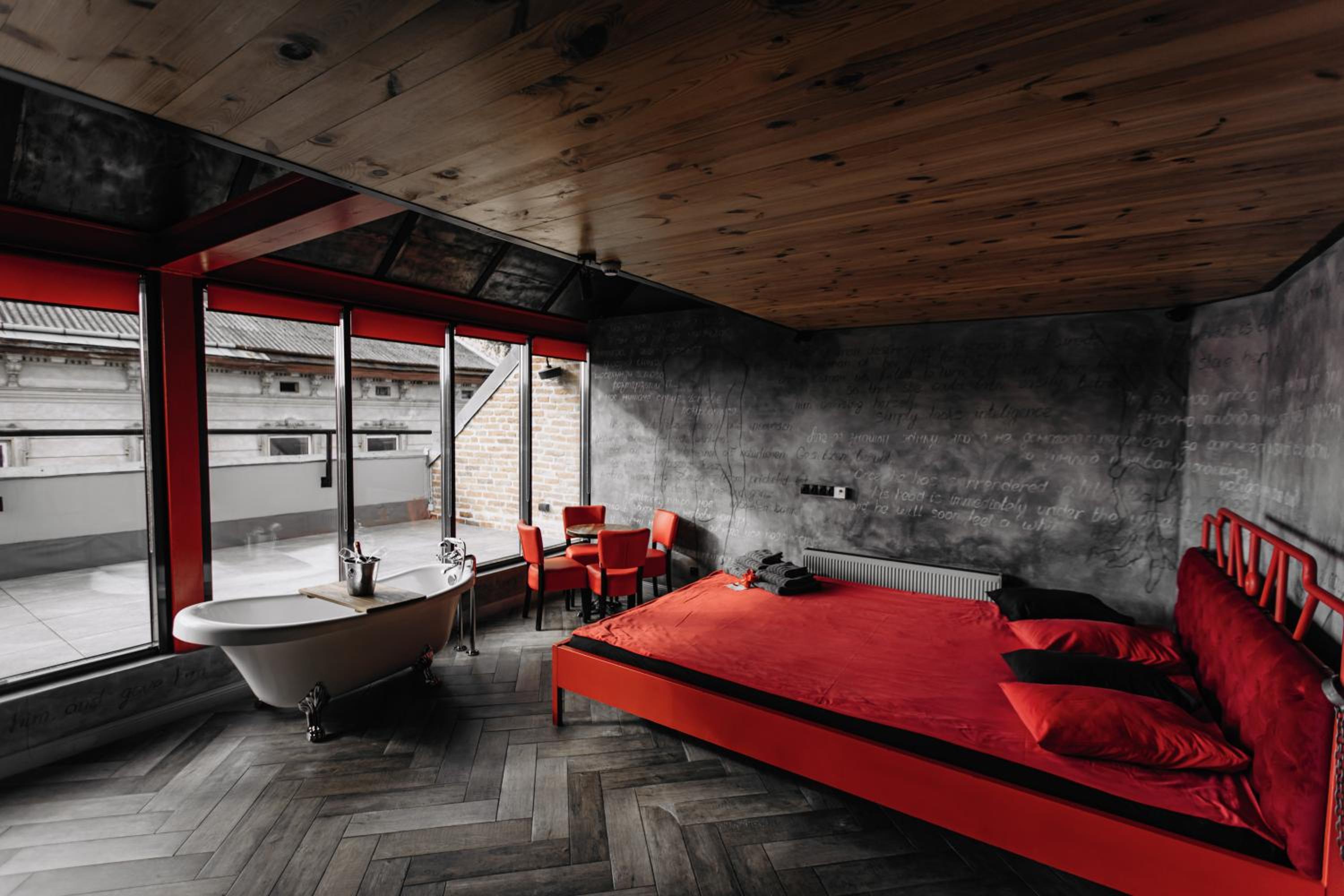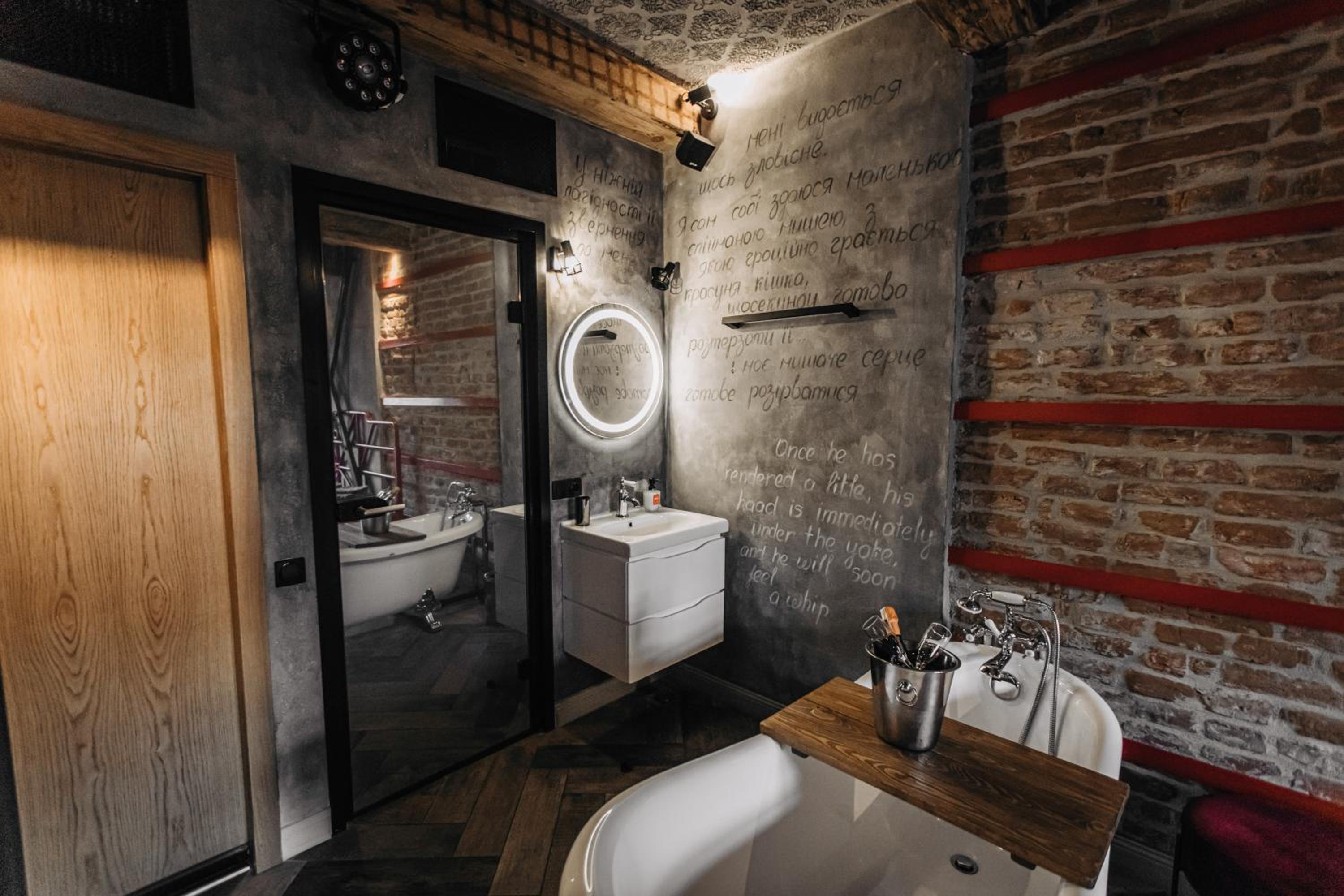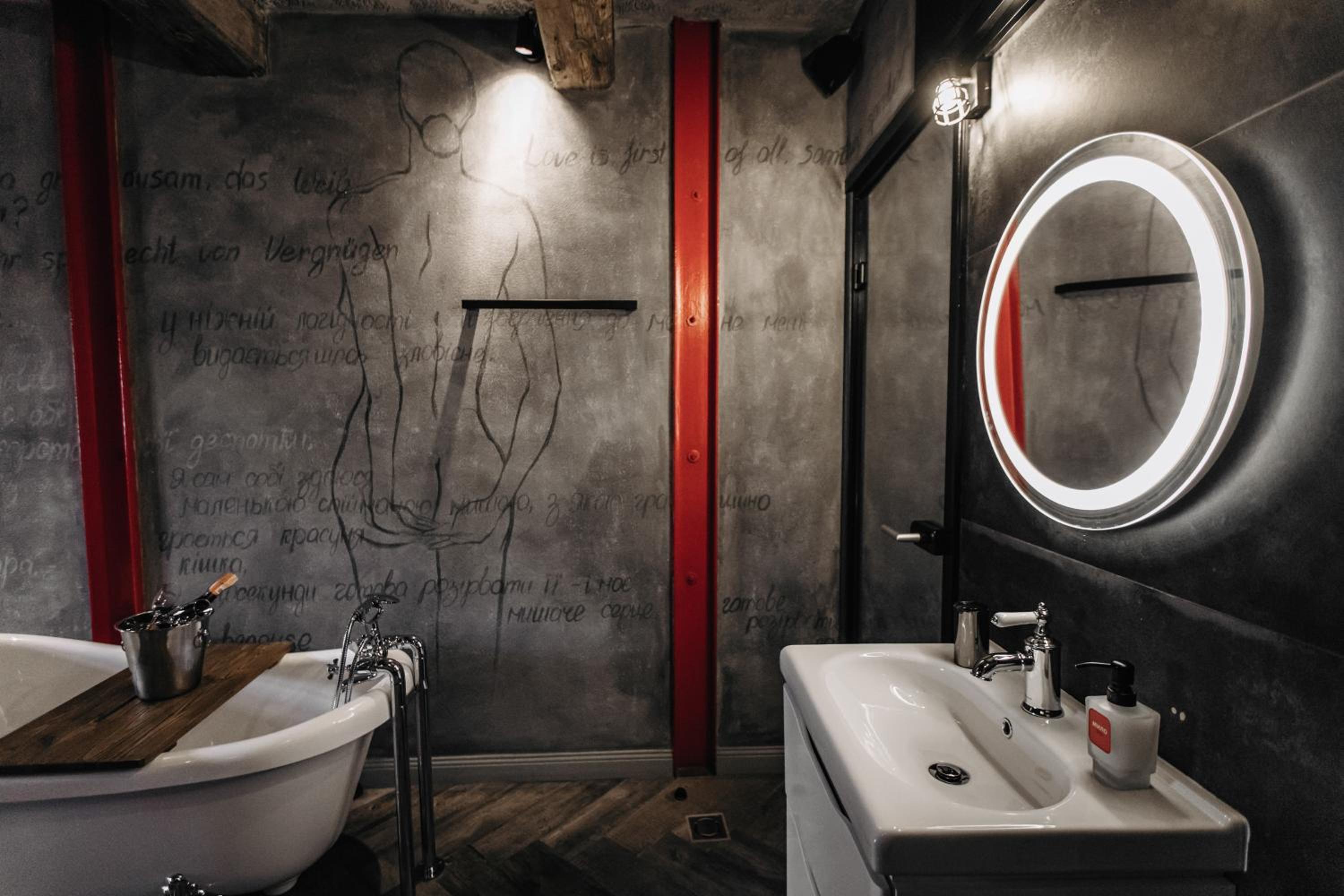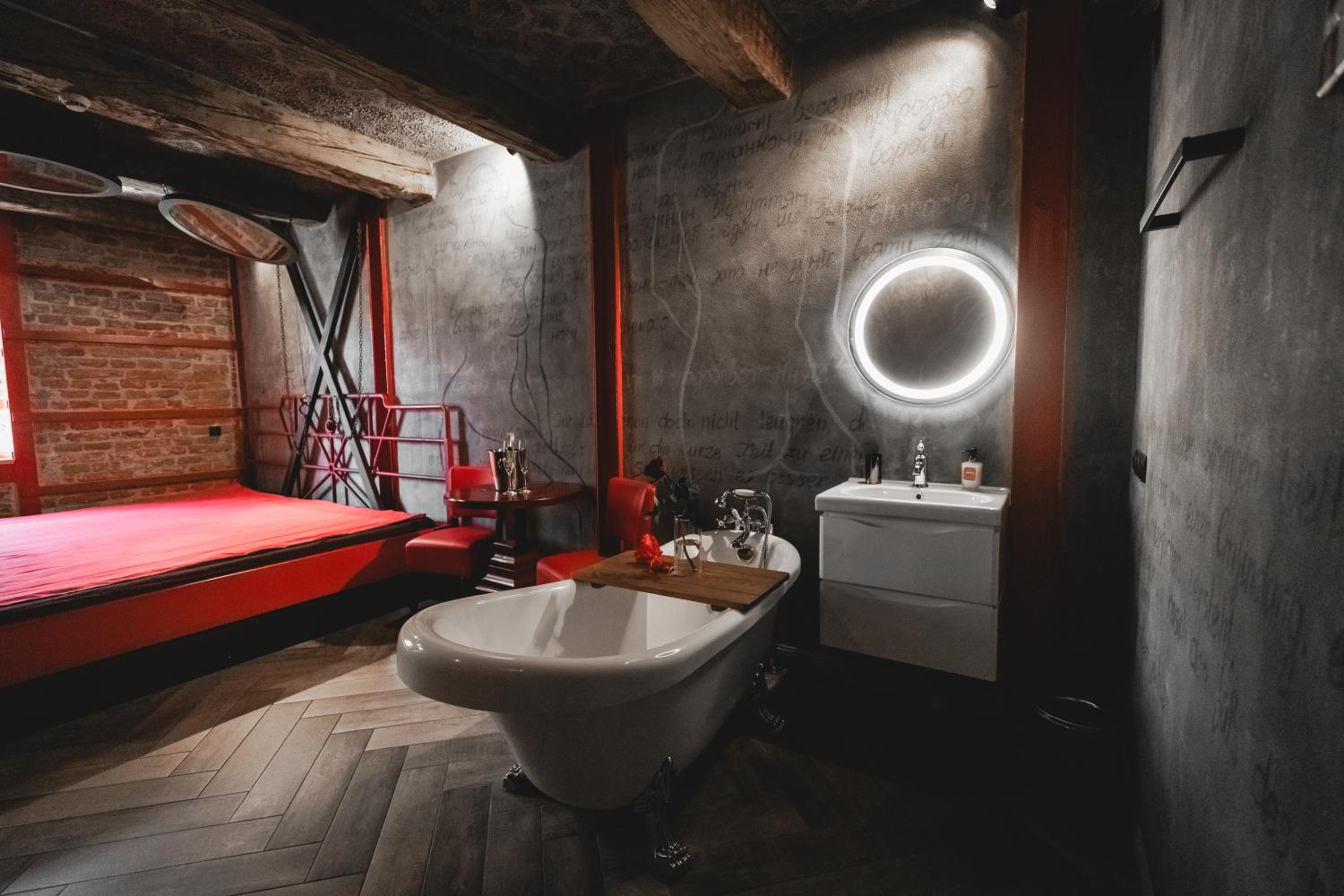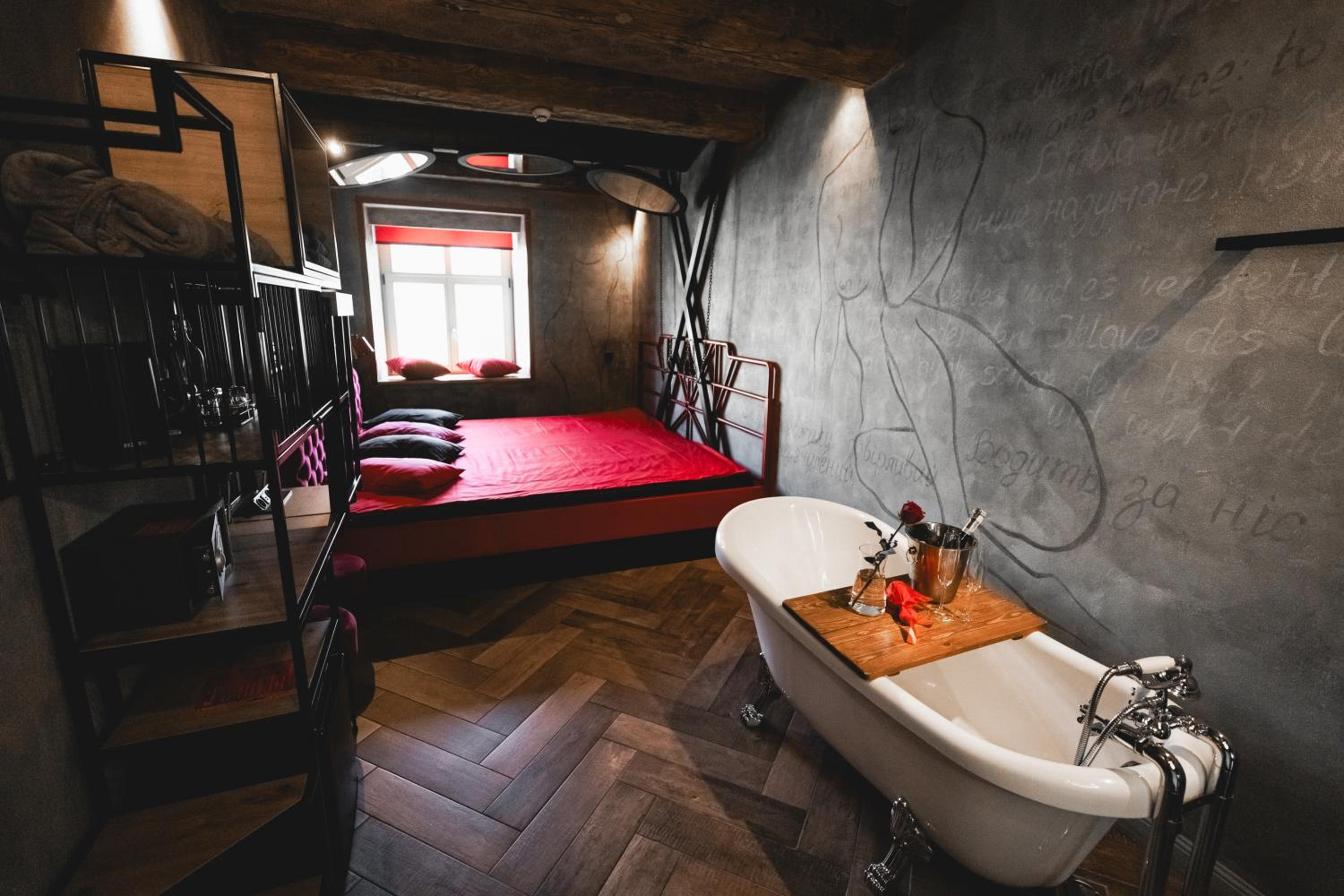 Nieoczywisty wustroj pokoju pasujacy do tematyki lokalu, wanna.