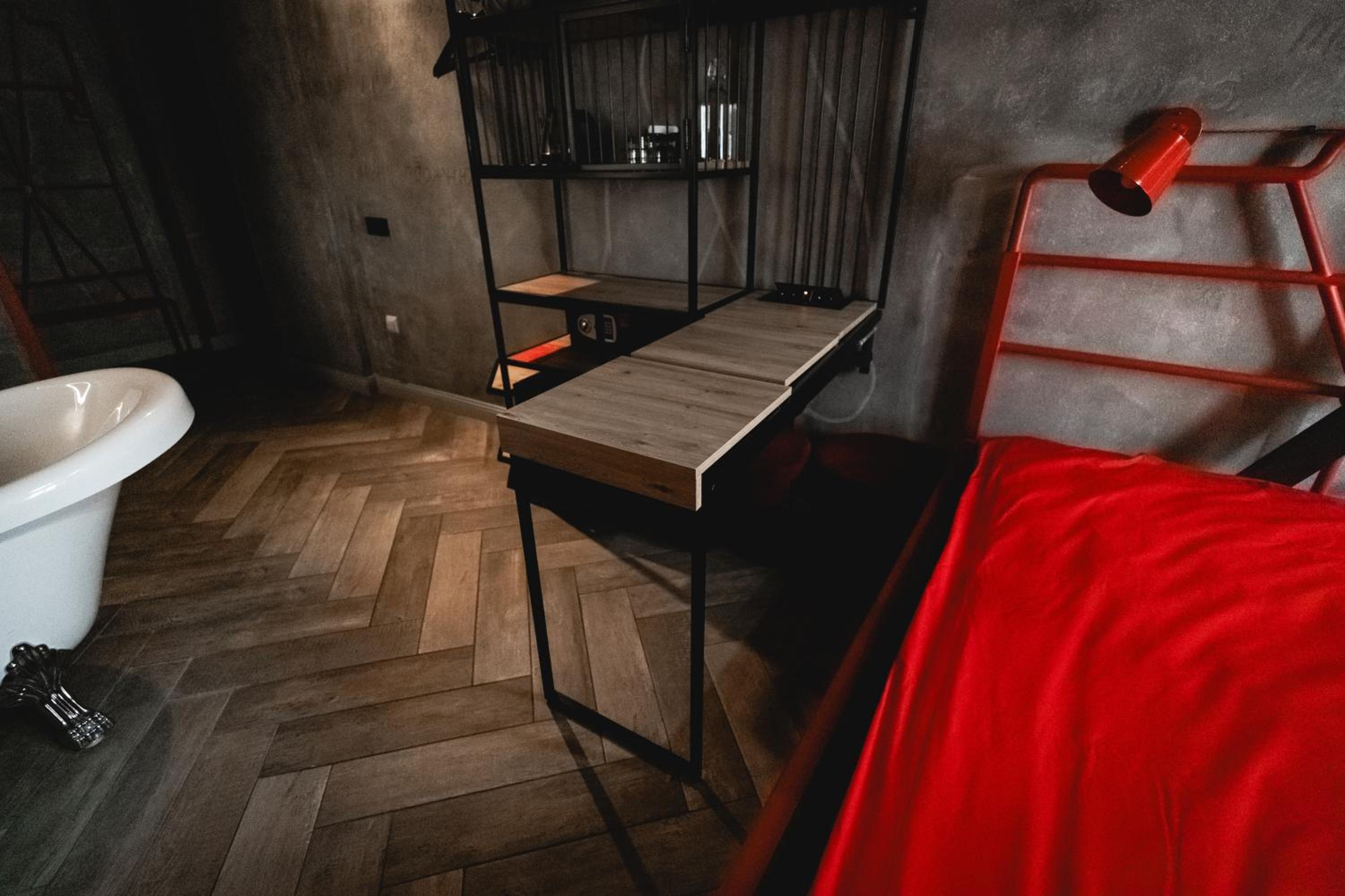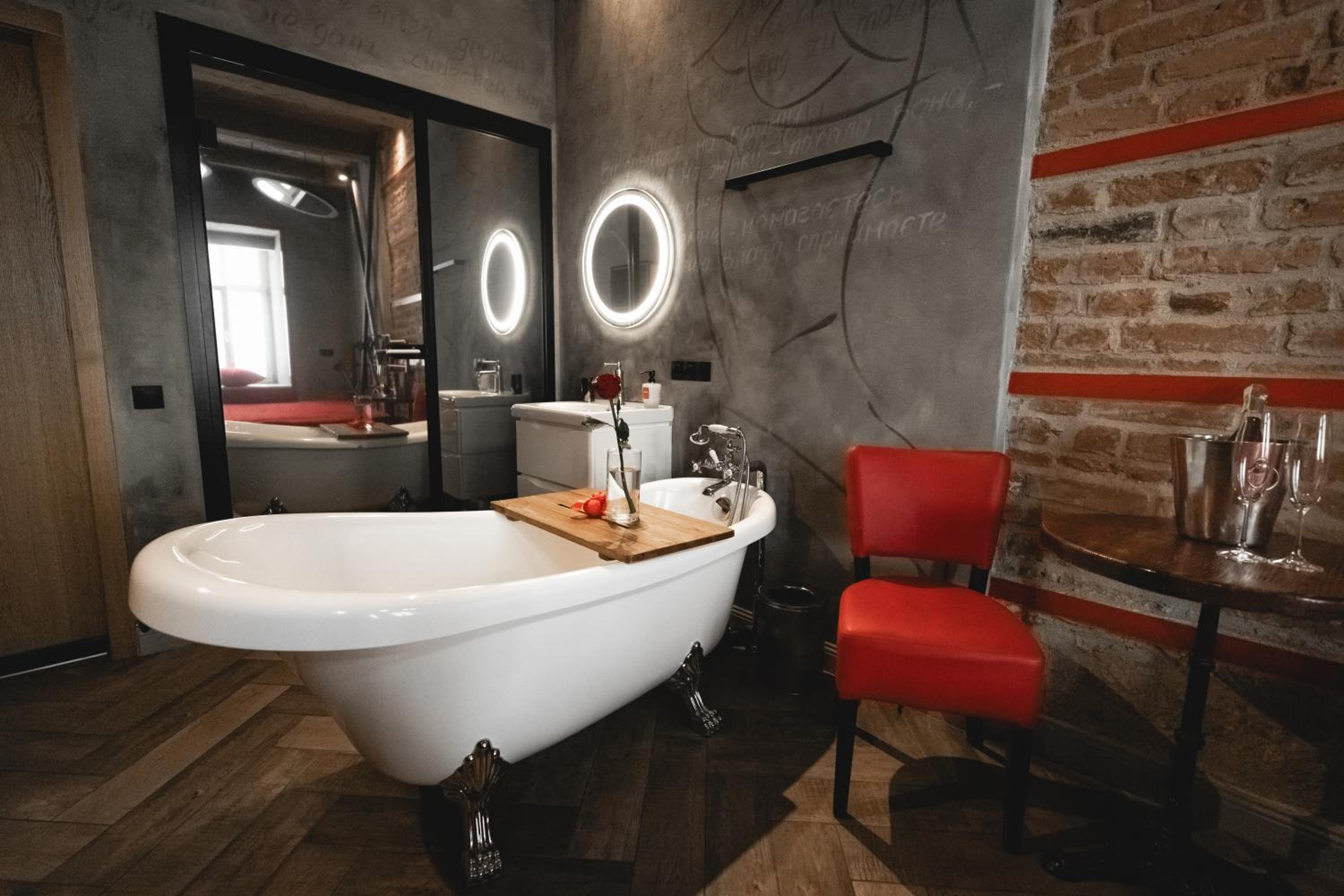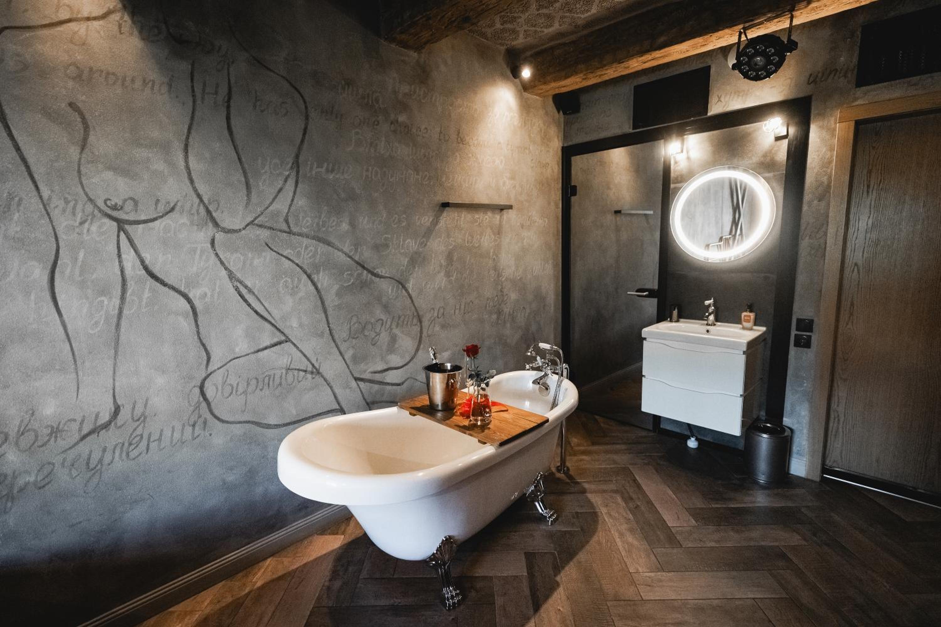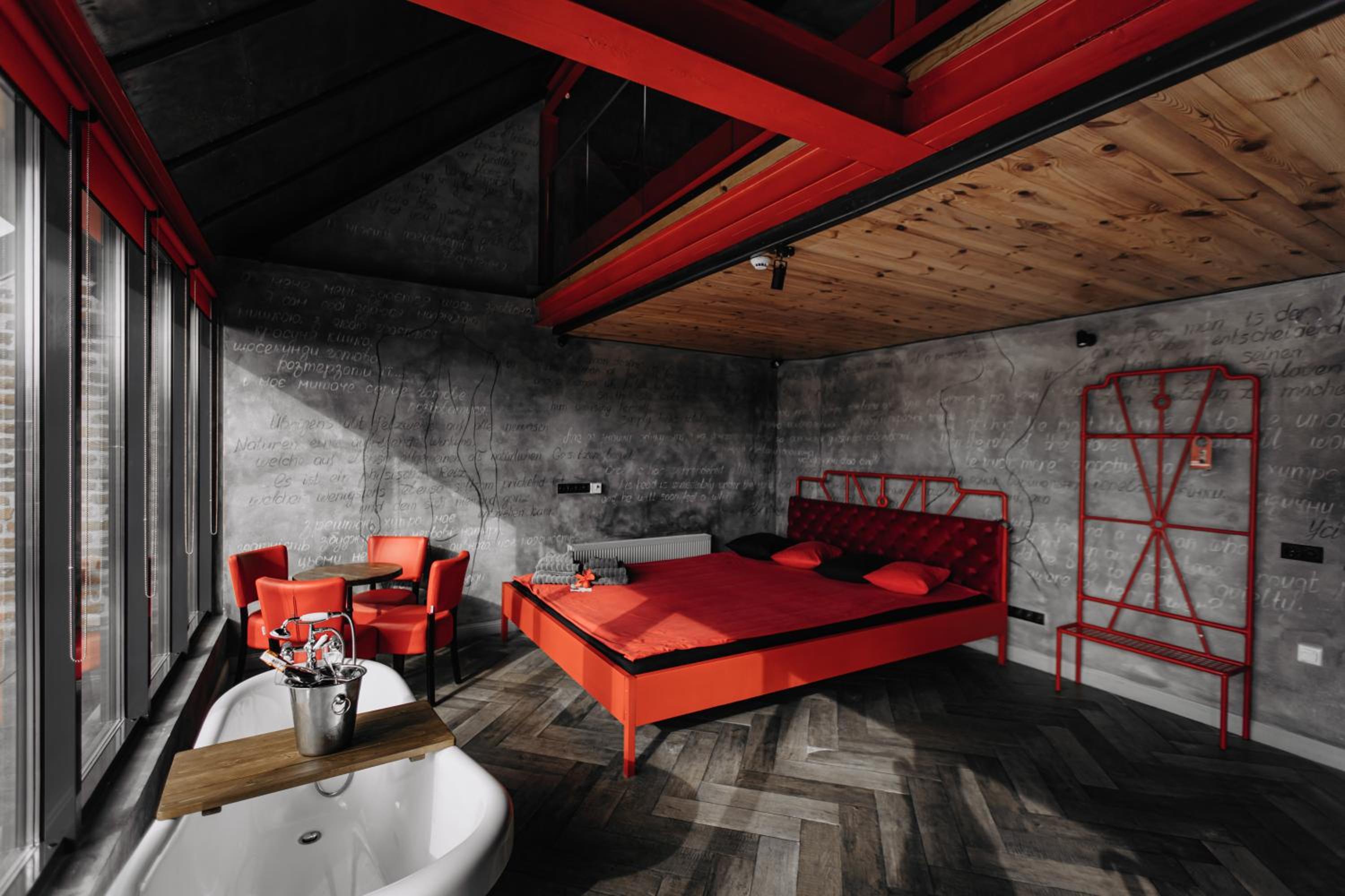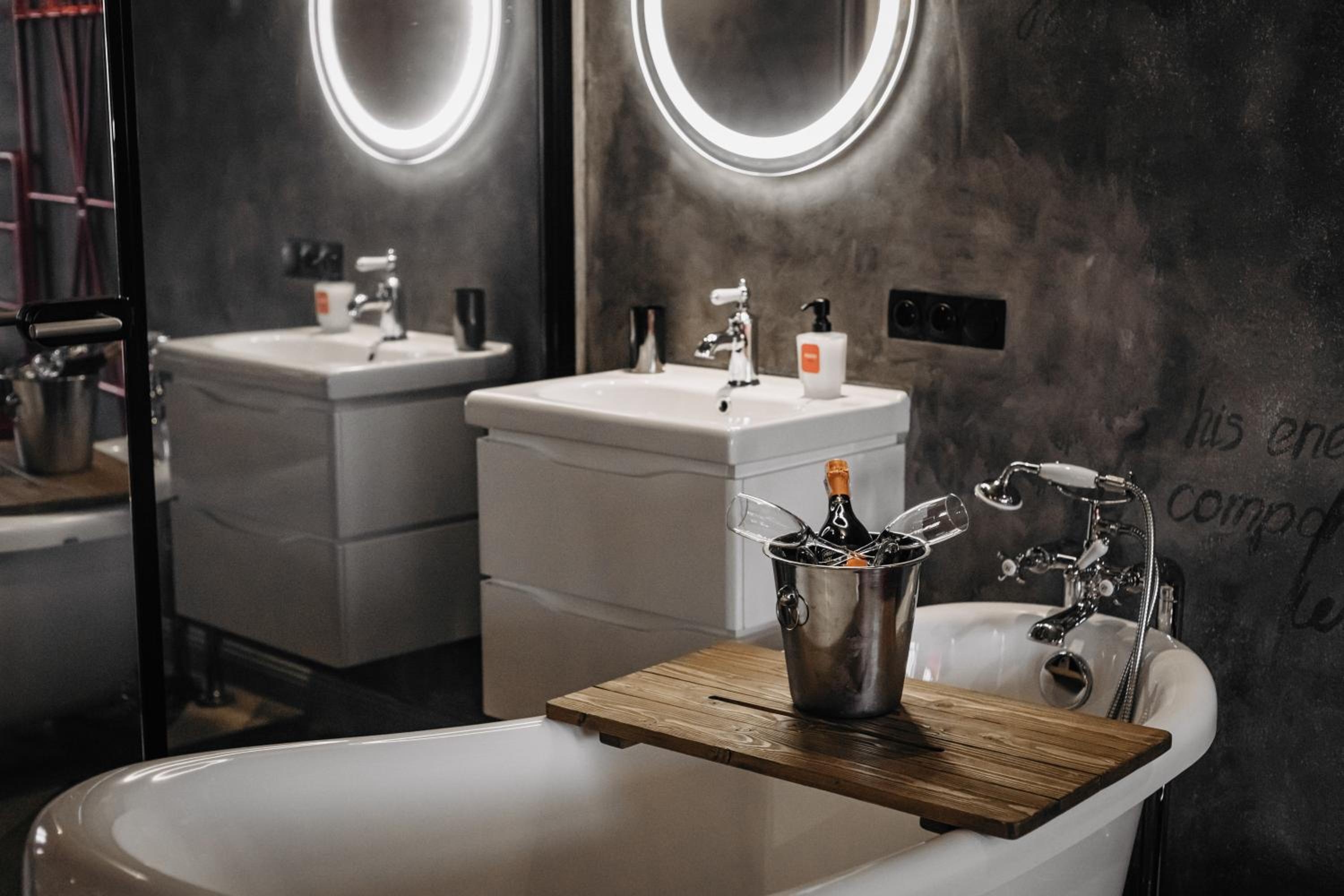 Nieoczywisty wustroj pokoju pasujacy do tematyki lokalu, wanna.
