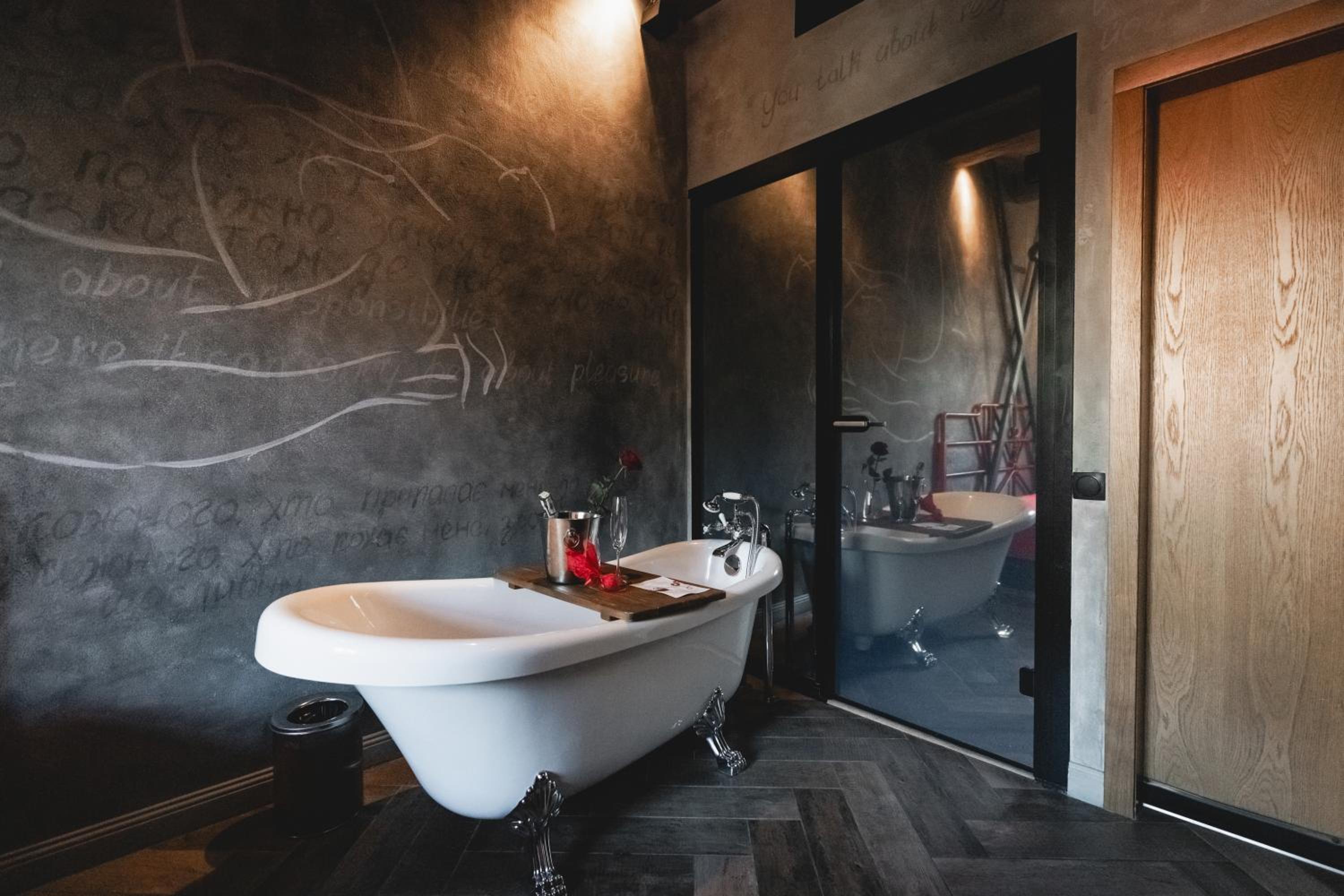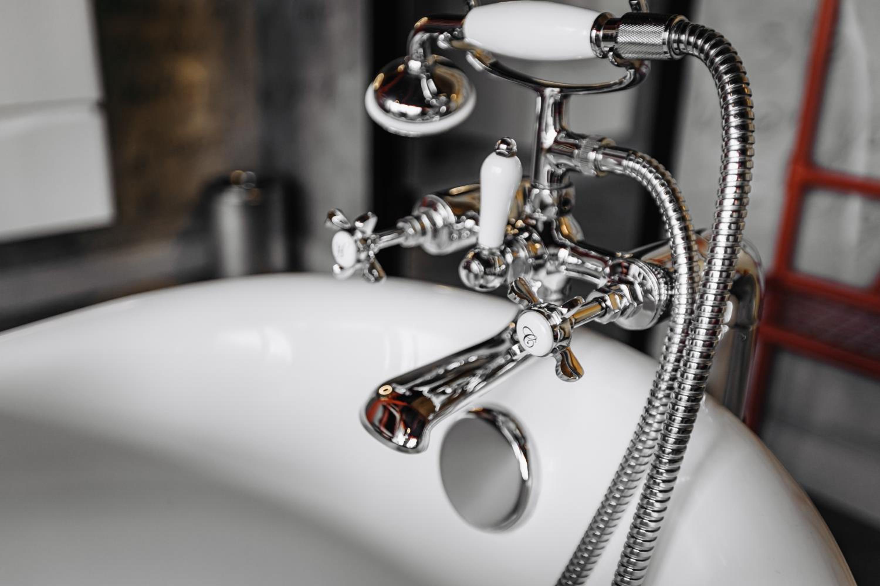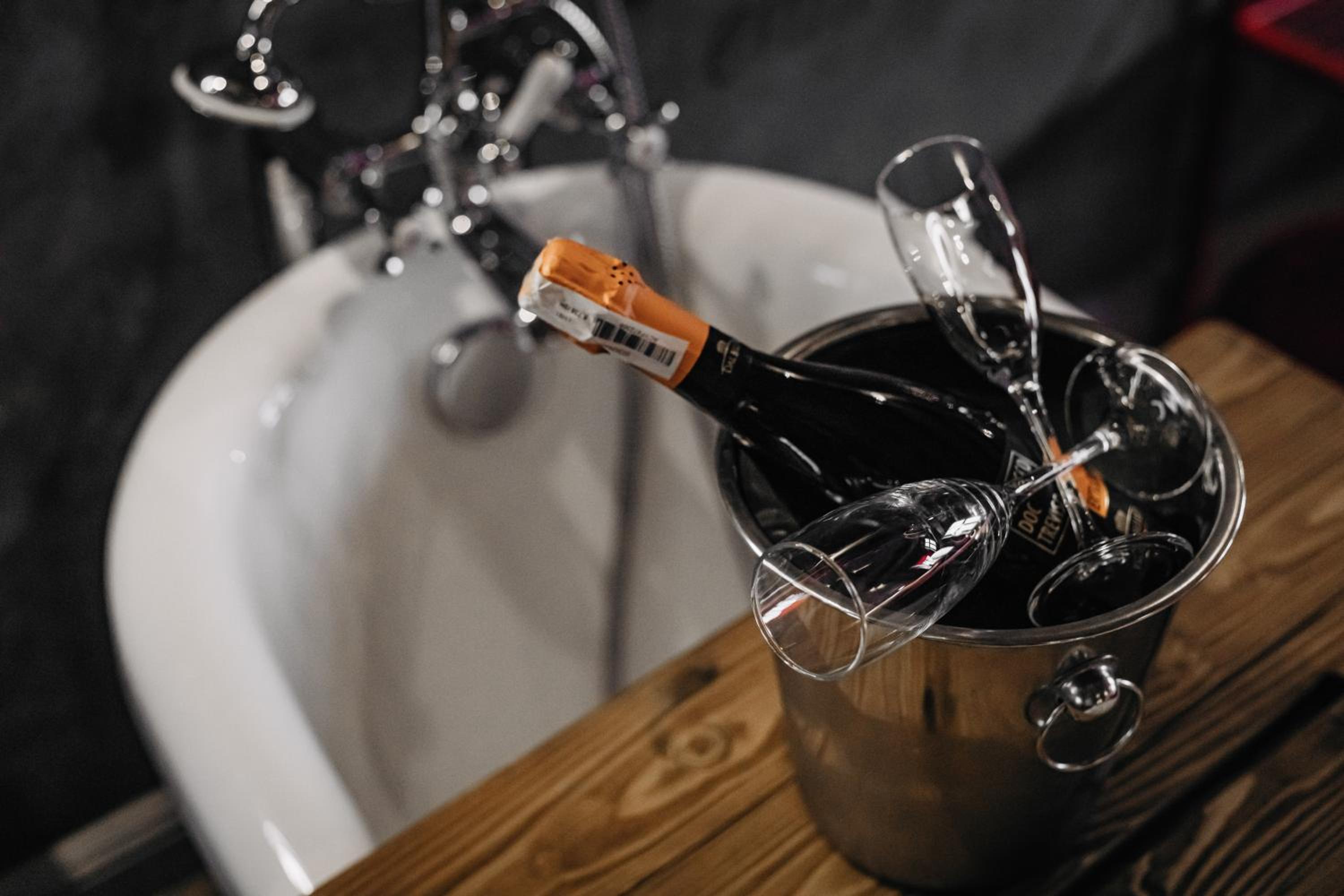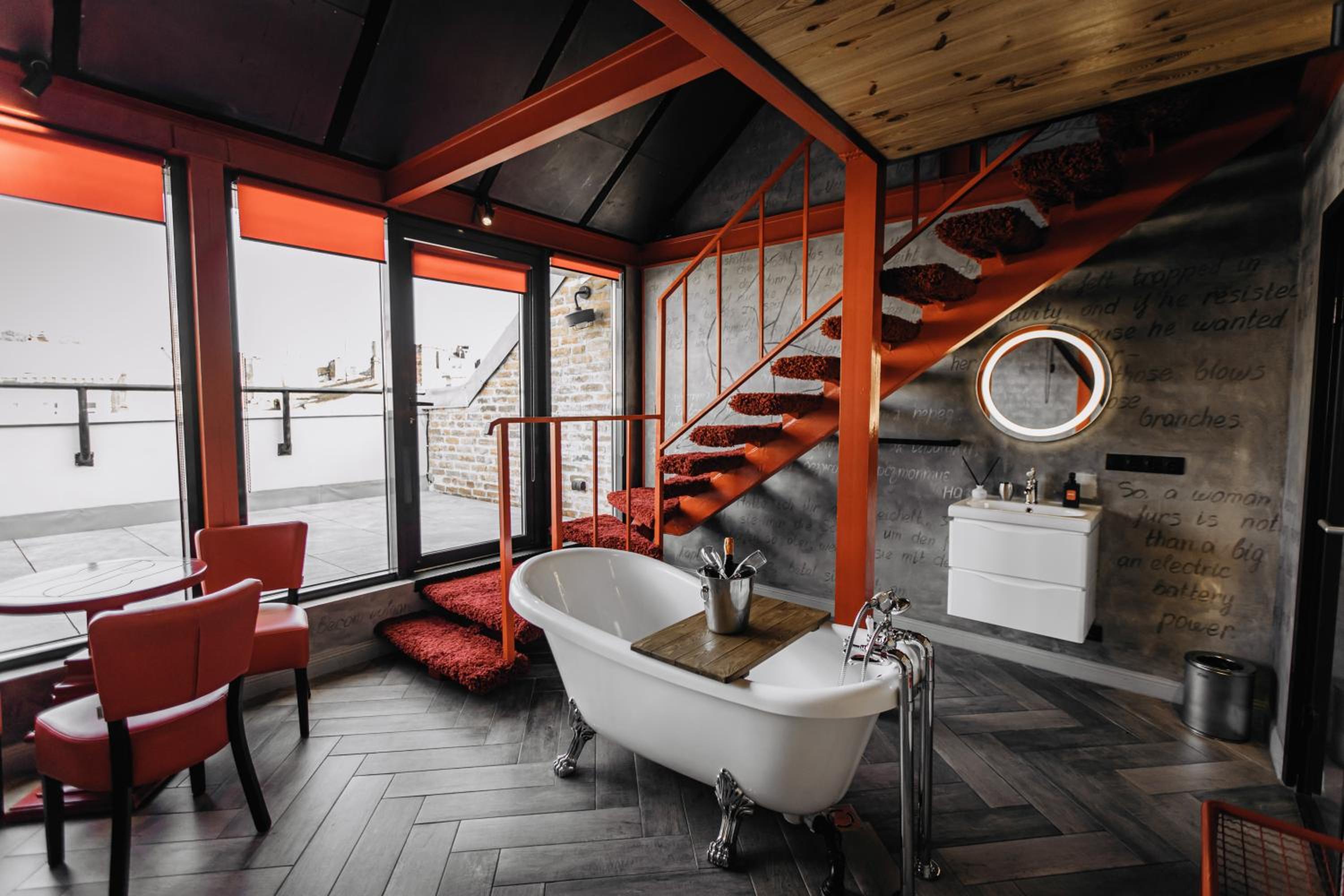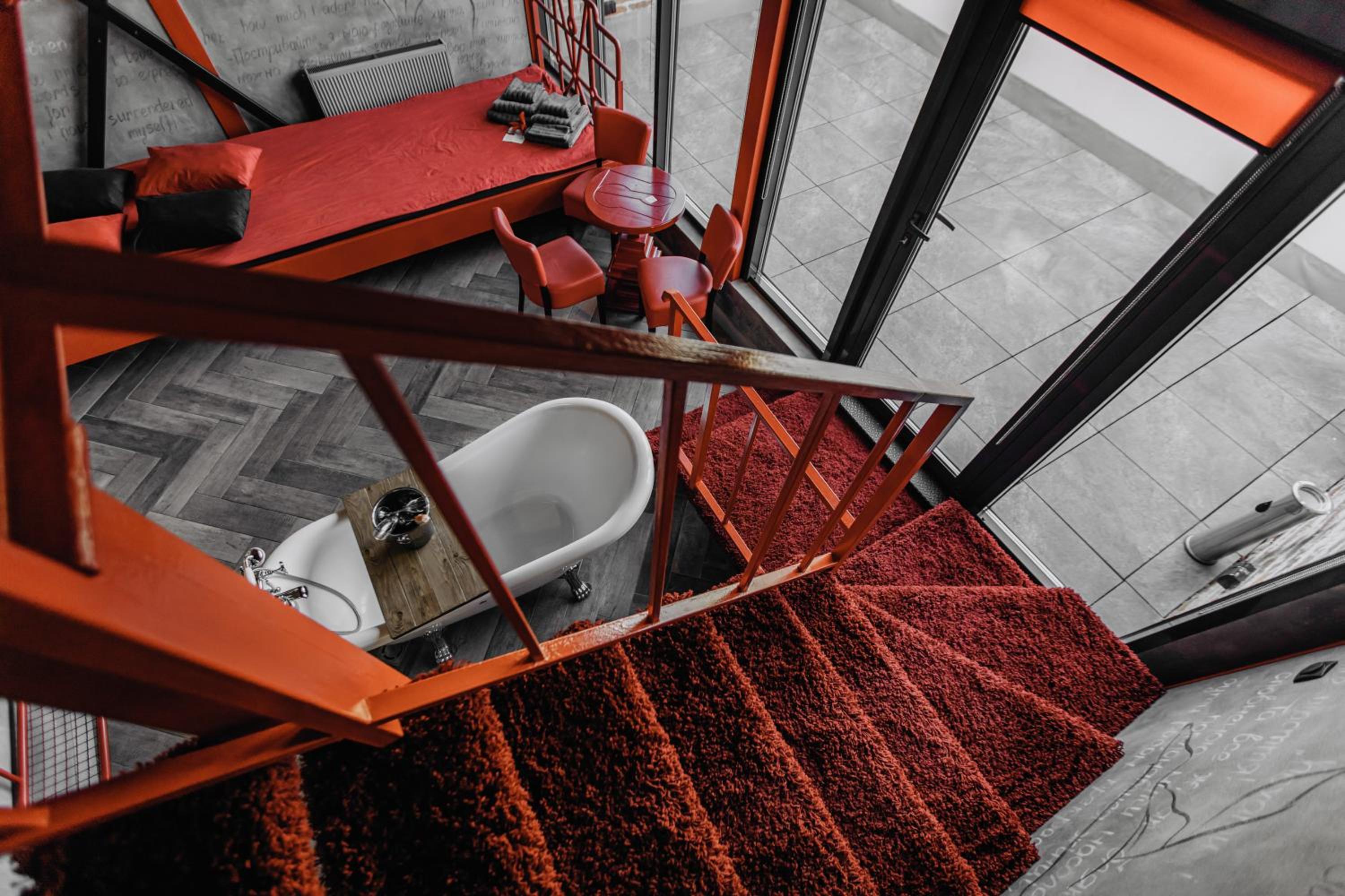 Nieoczywisty wustroj pokoju pasujacy do tematyki lokalu, wanna.