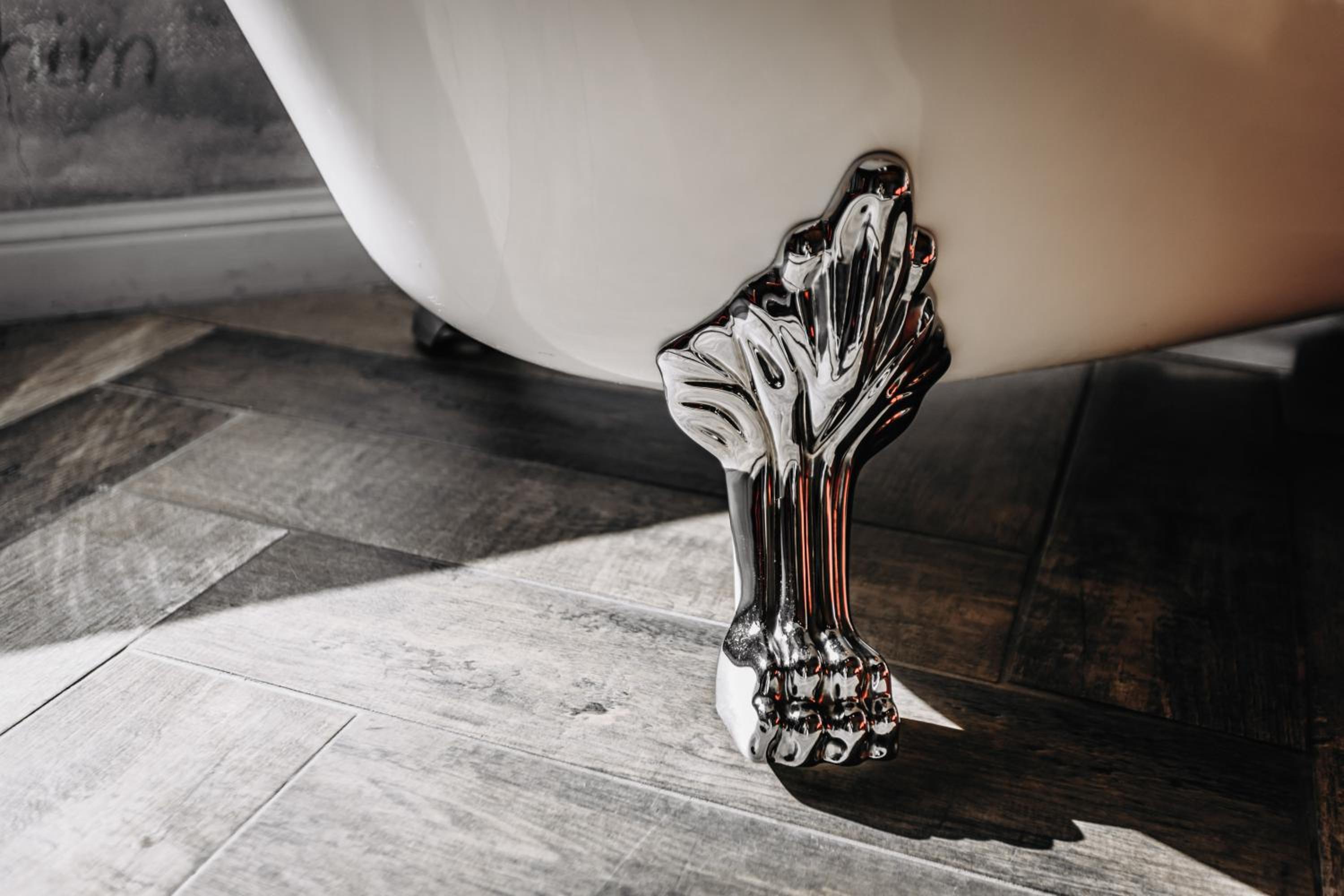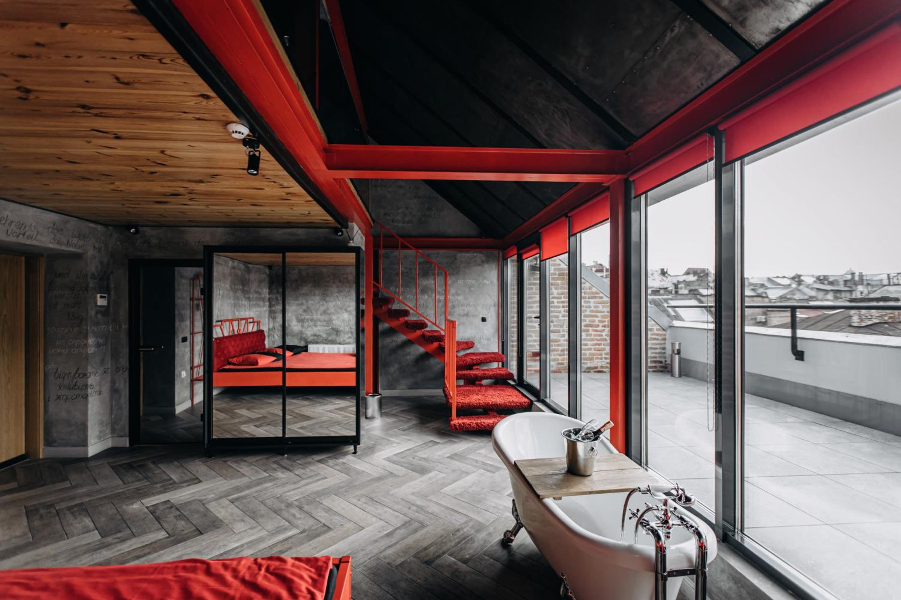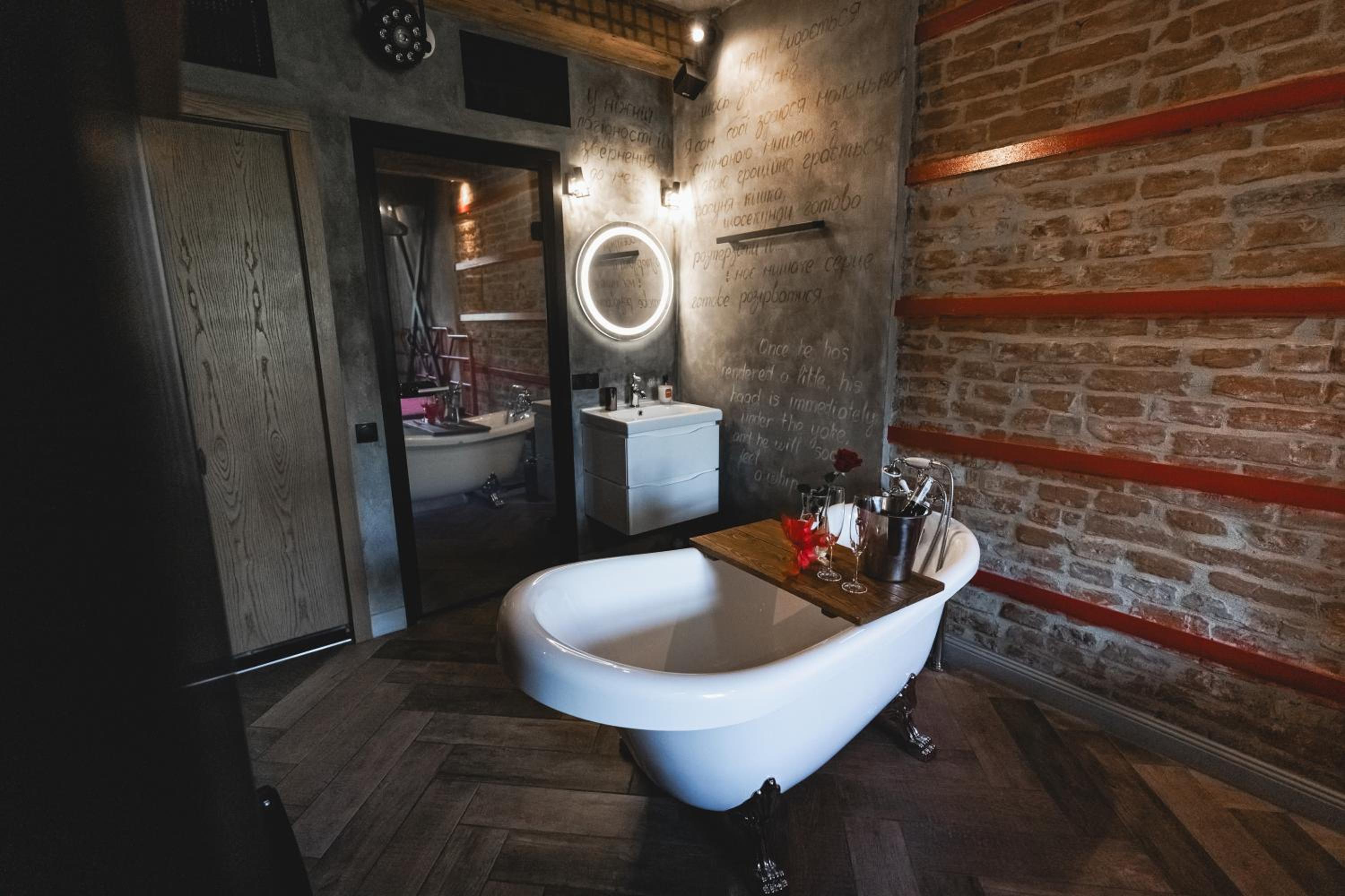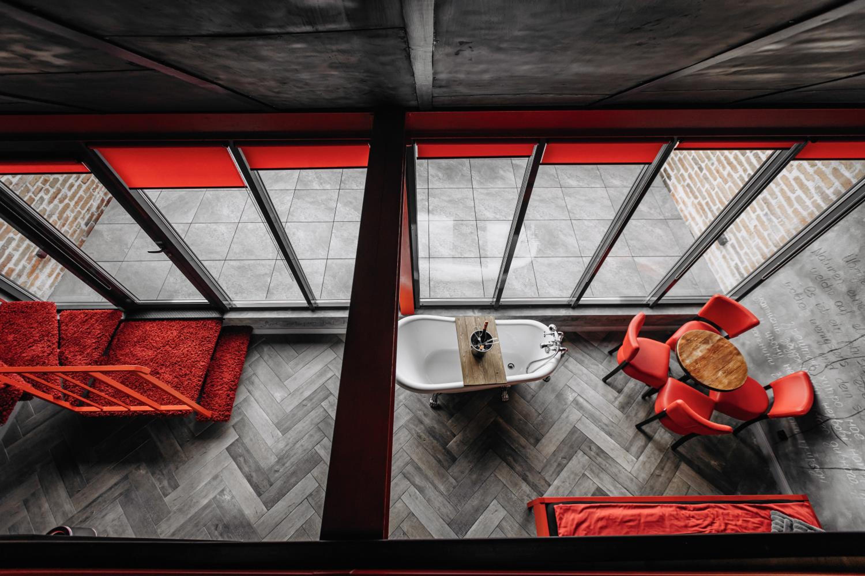 Nieoczywisty wustroj pokoju pasujacy do tematyki lokalu, wanna.