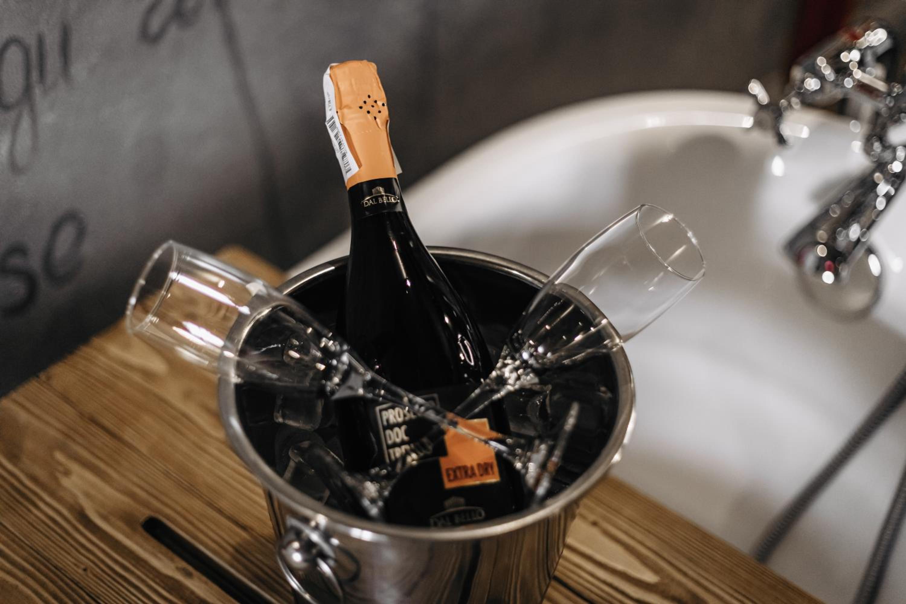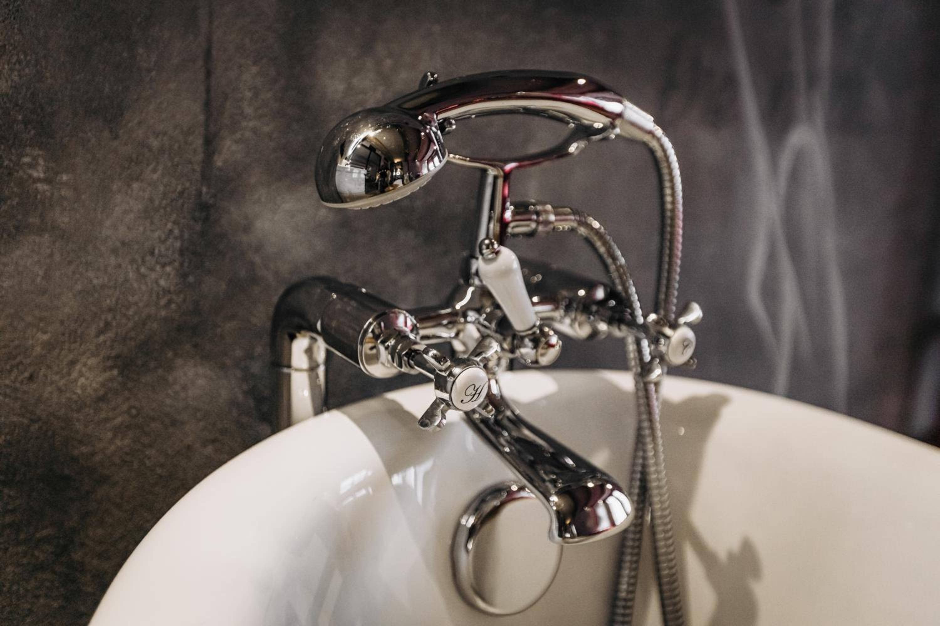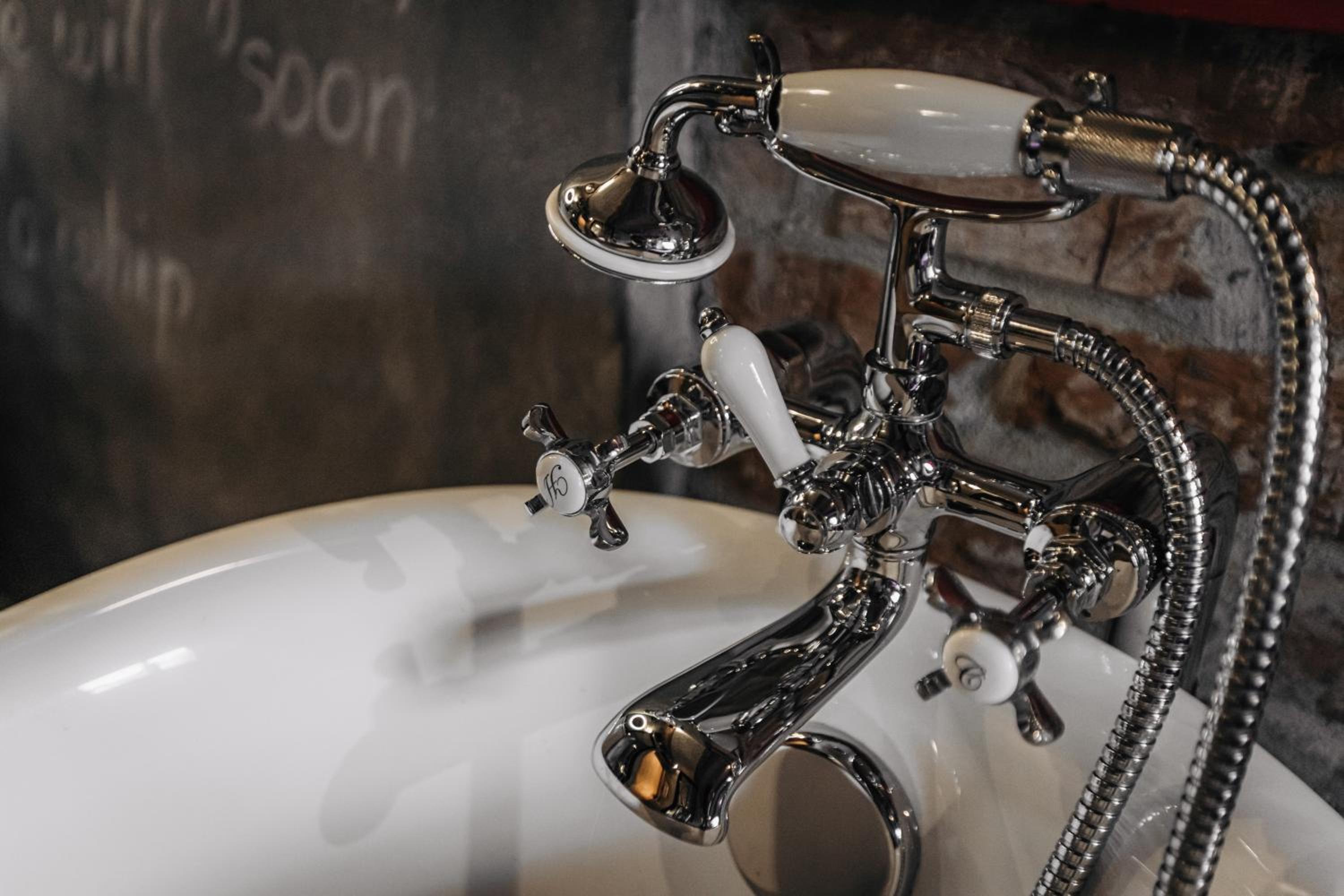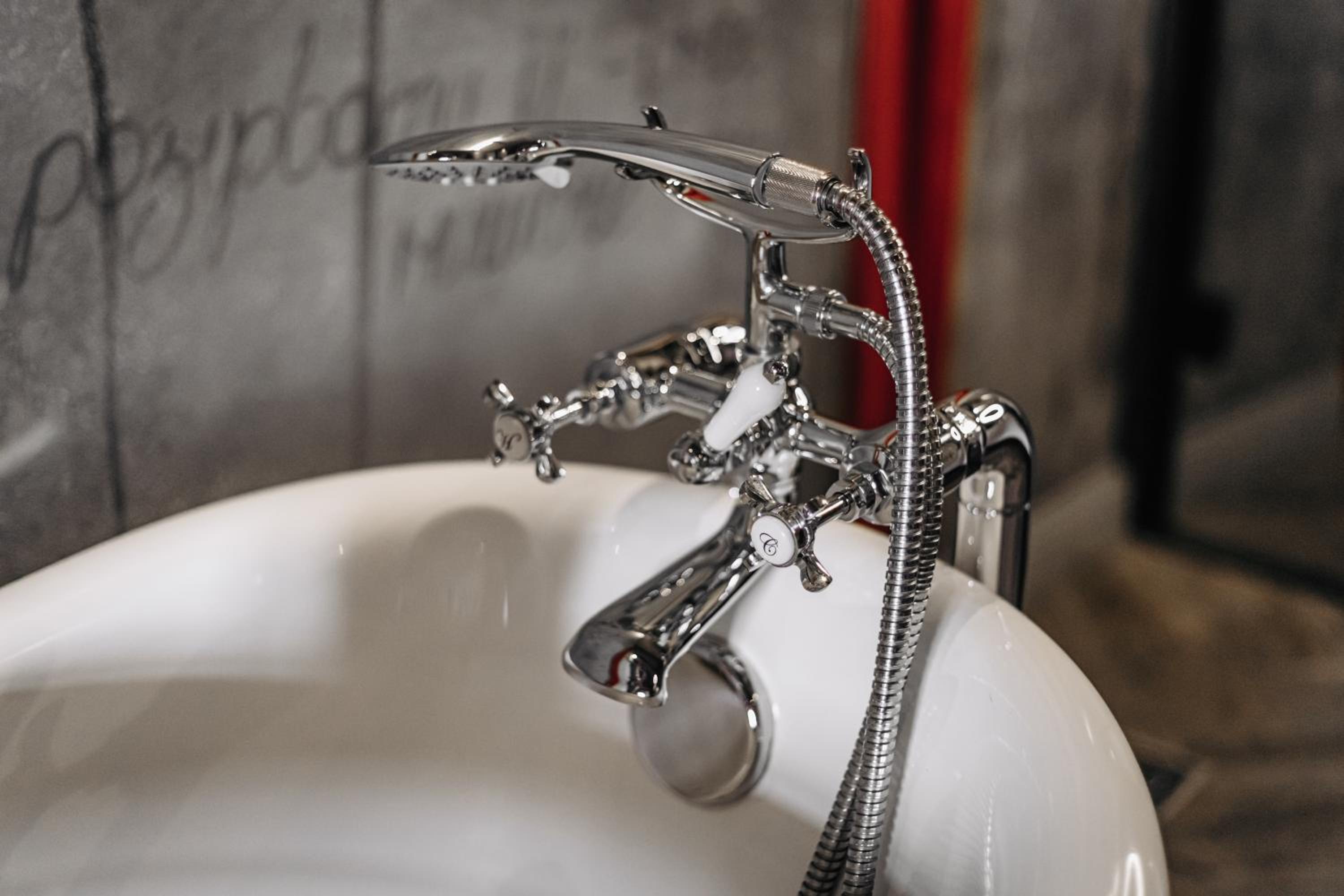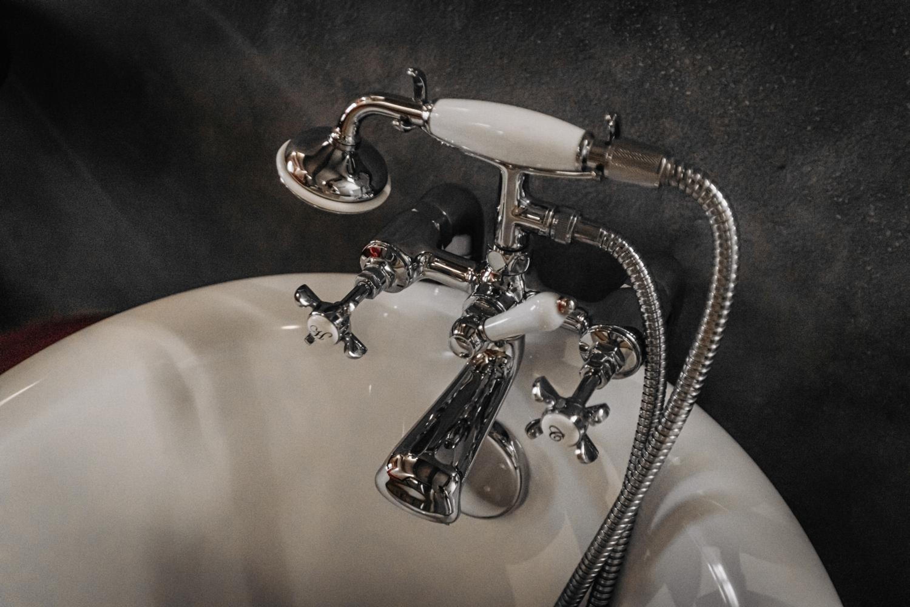 Nieoczywisty wustroj pokoju pasujacy do tematyki lokalu, wanna.