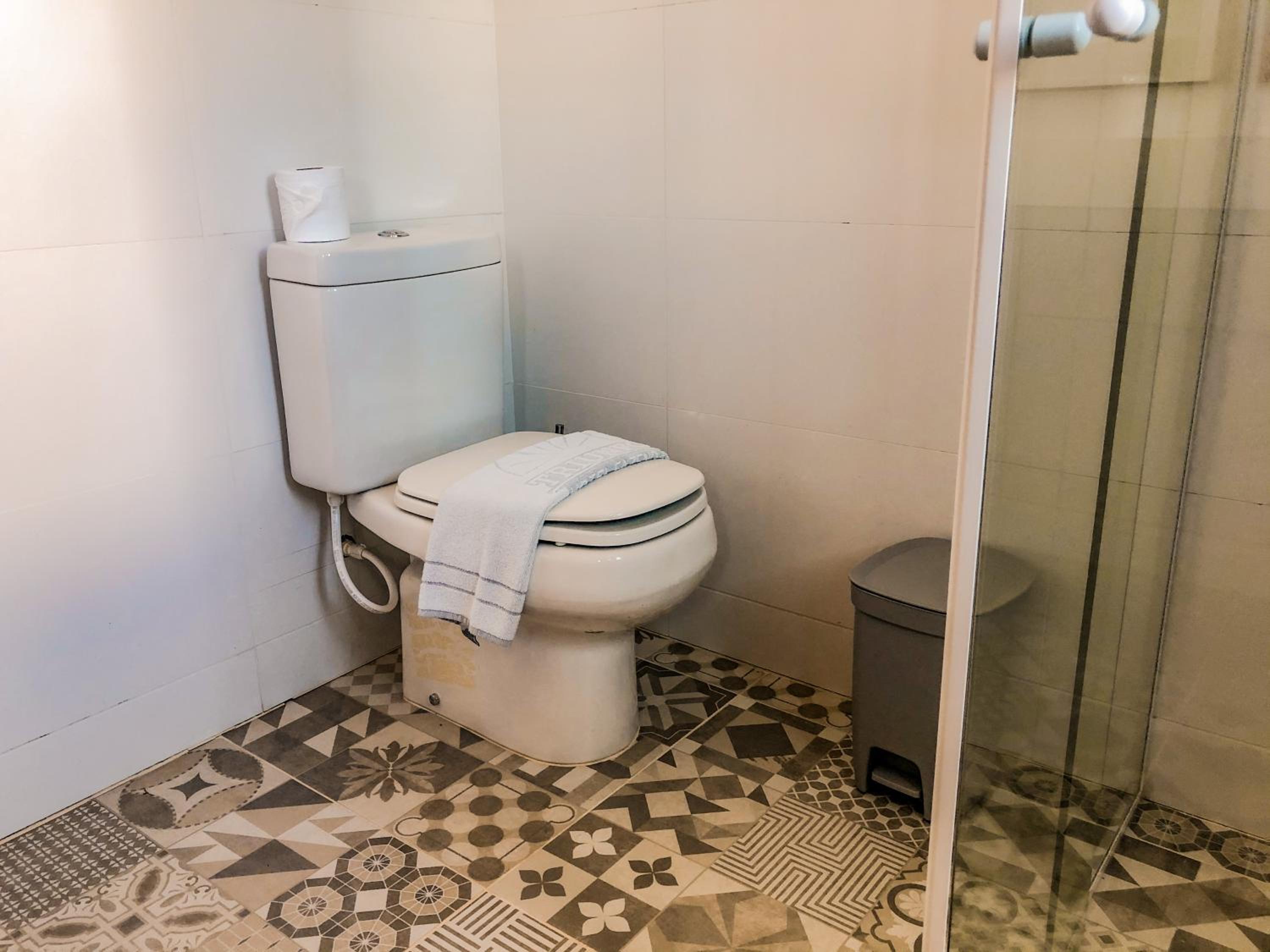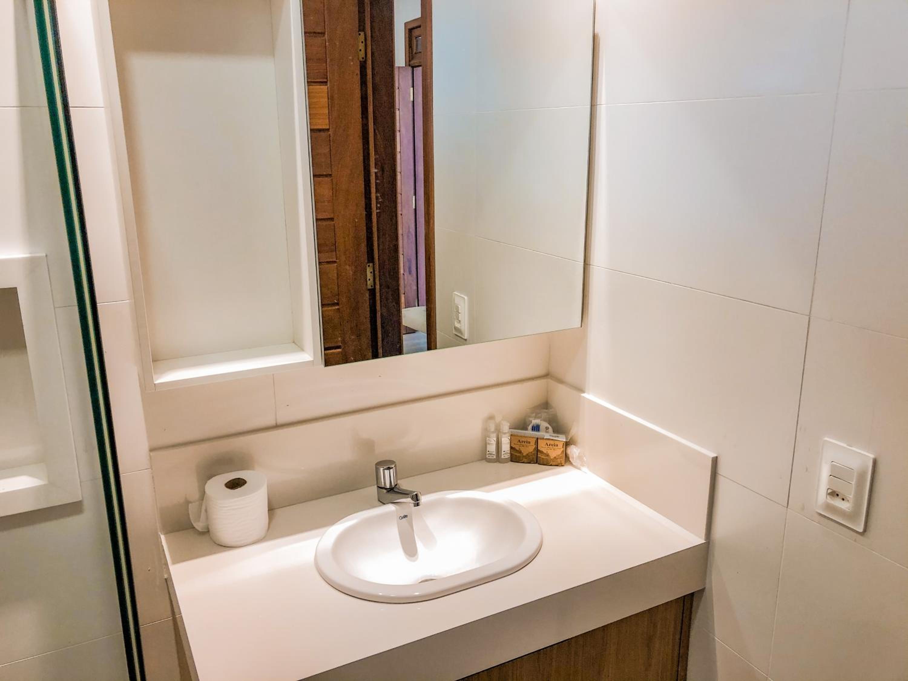 A aparência do banheiro e produtos expostos pareciam um pouco descuidados apenas usso