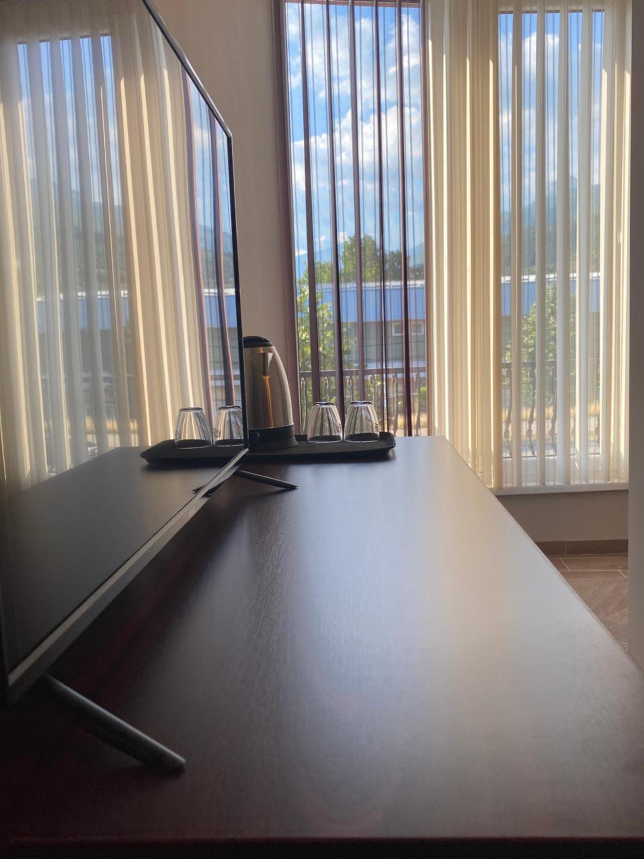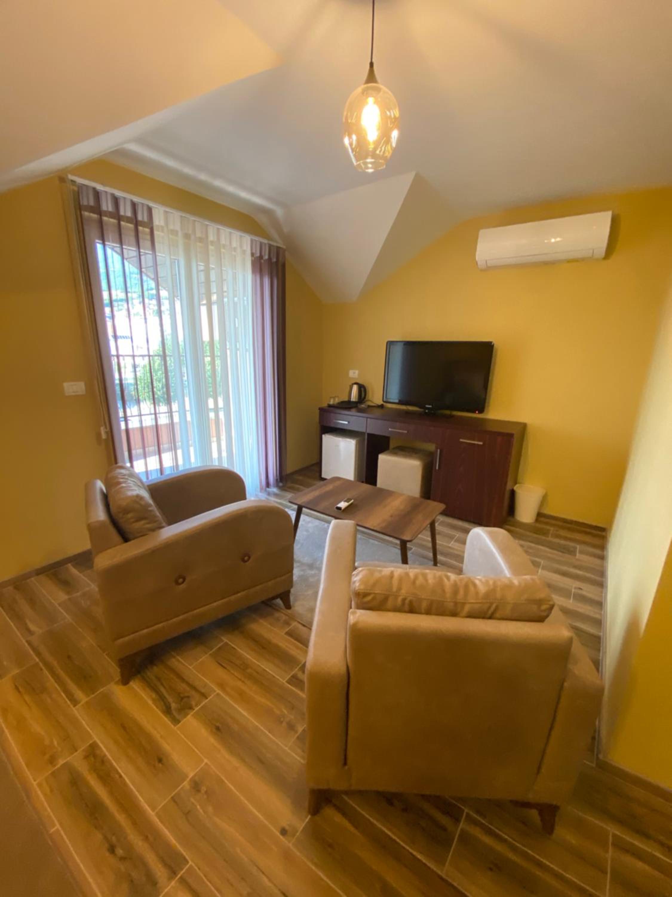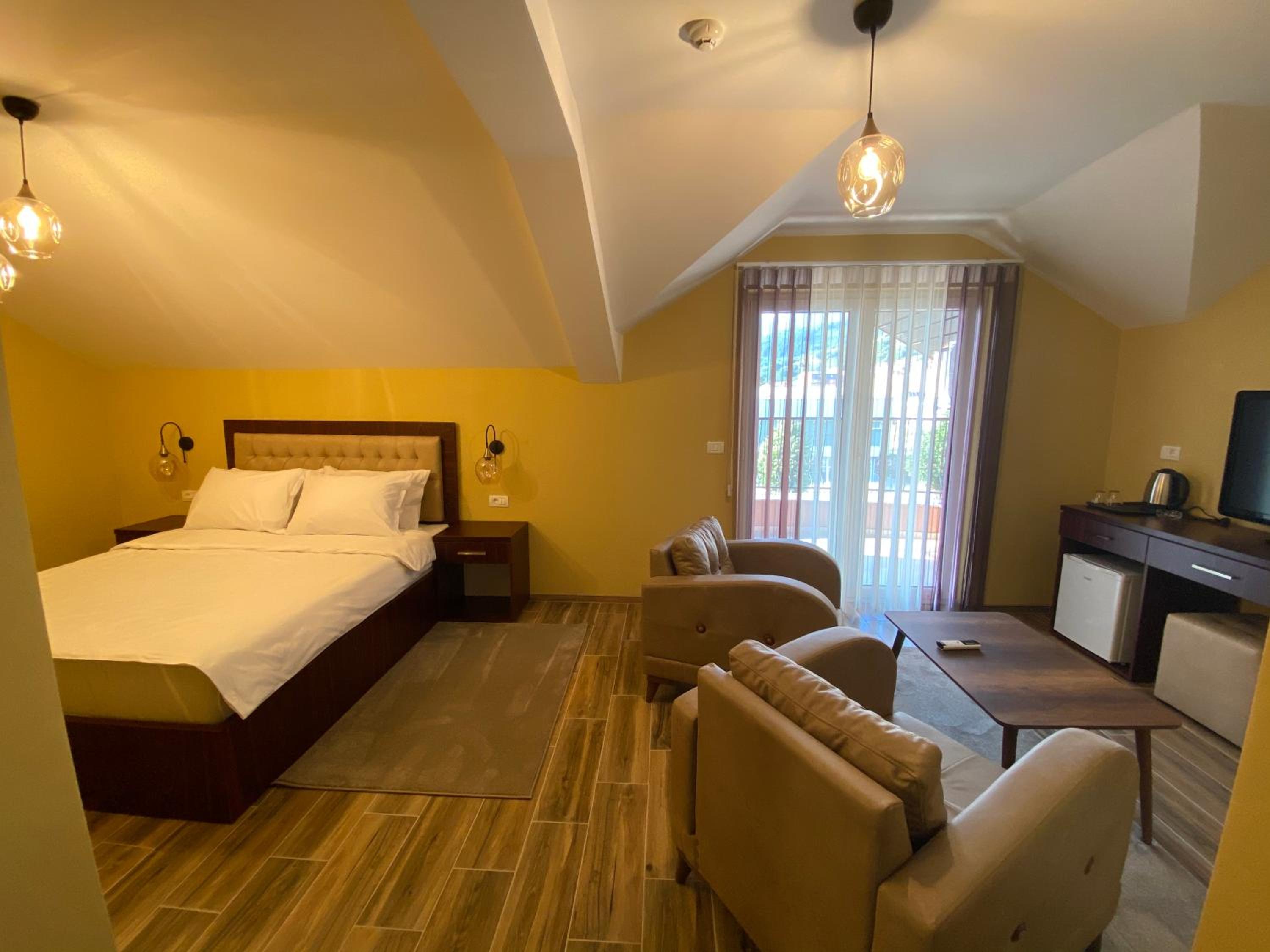 Each room at Hotel Kolonja's is equipped with modern amenities including air conditioning, a flat-screen TV, and a private balcony offering beautiful views.