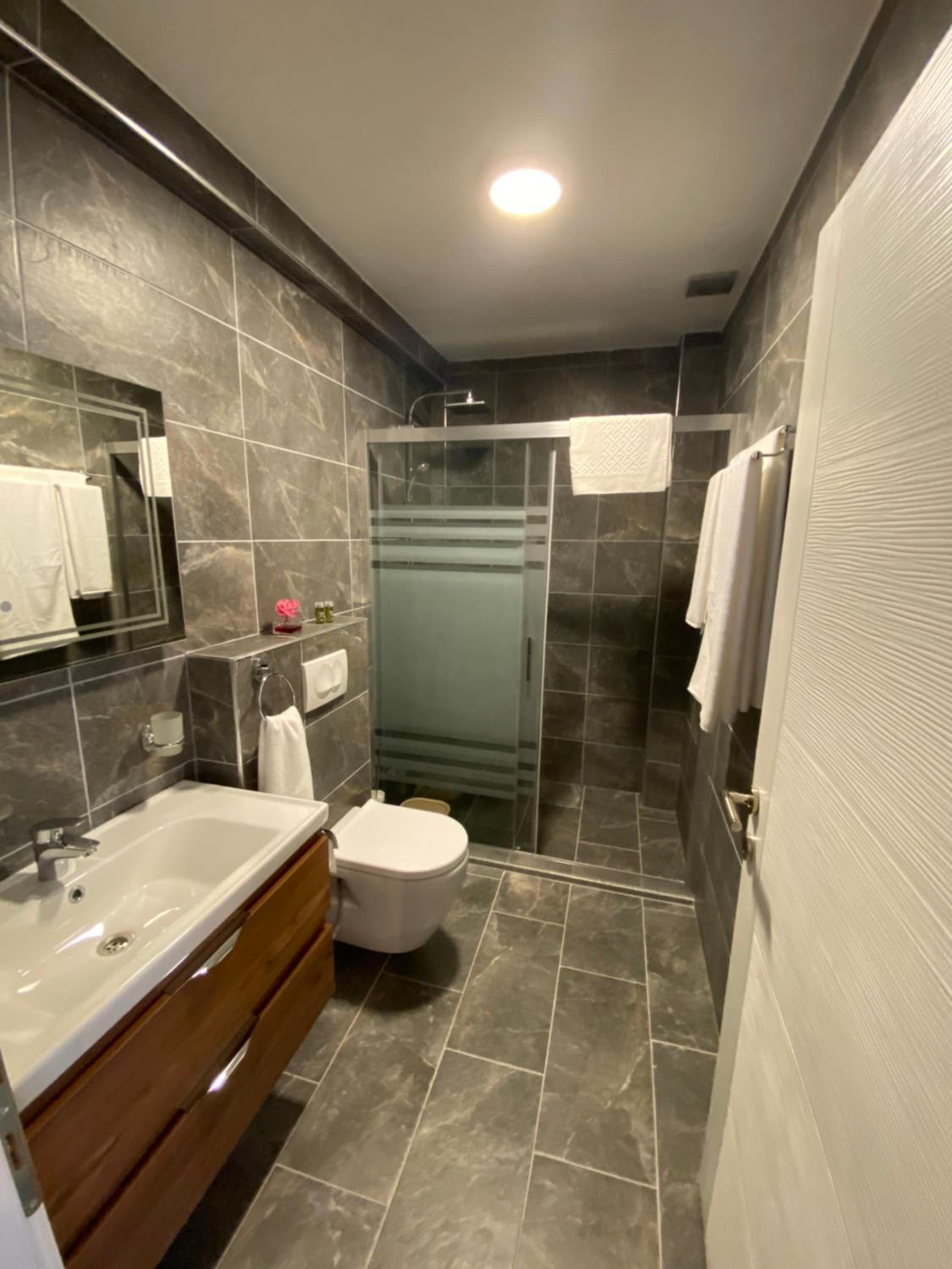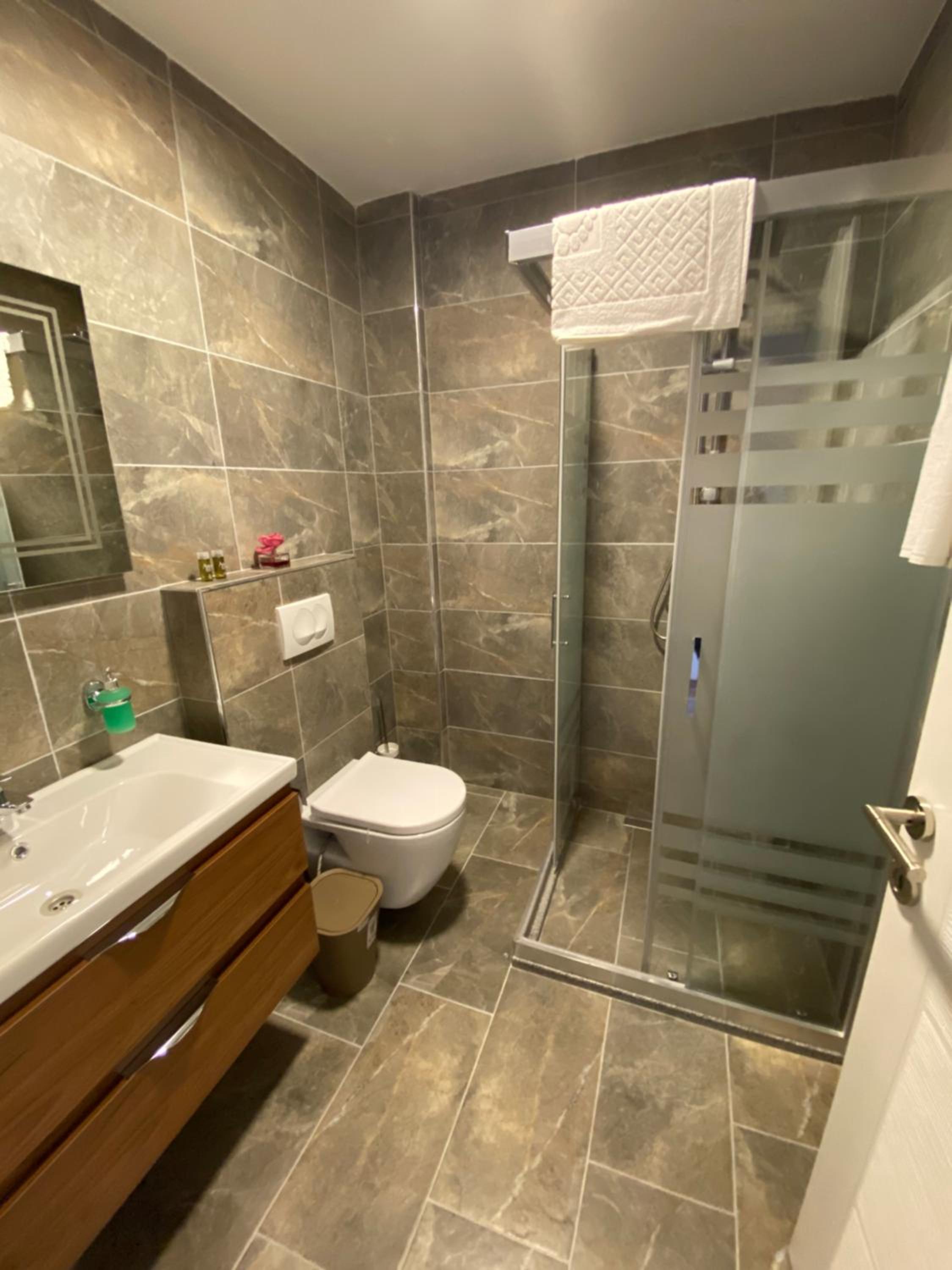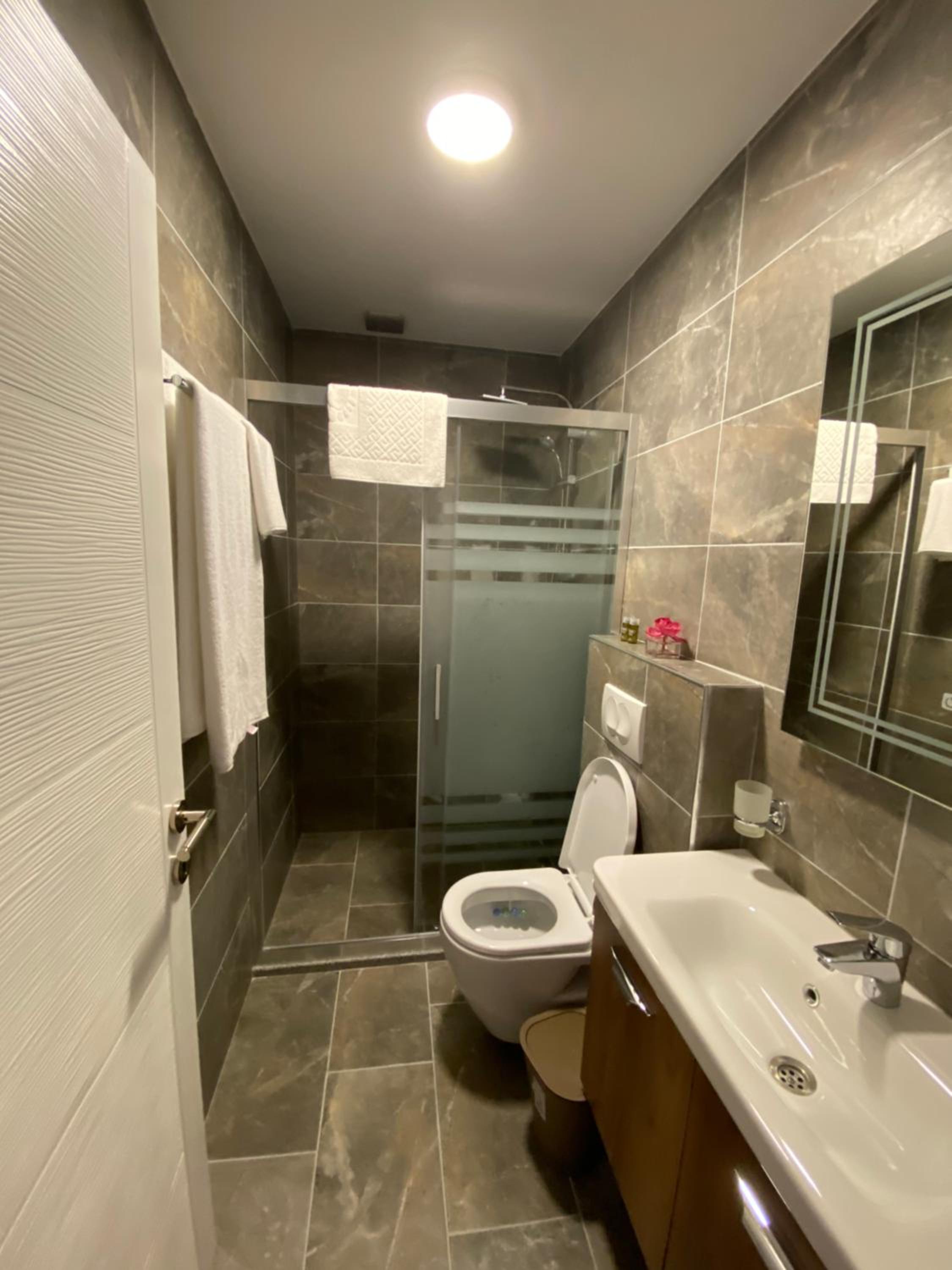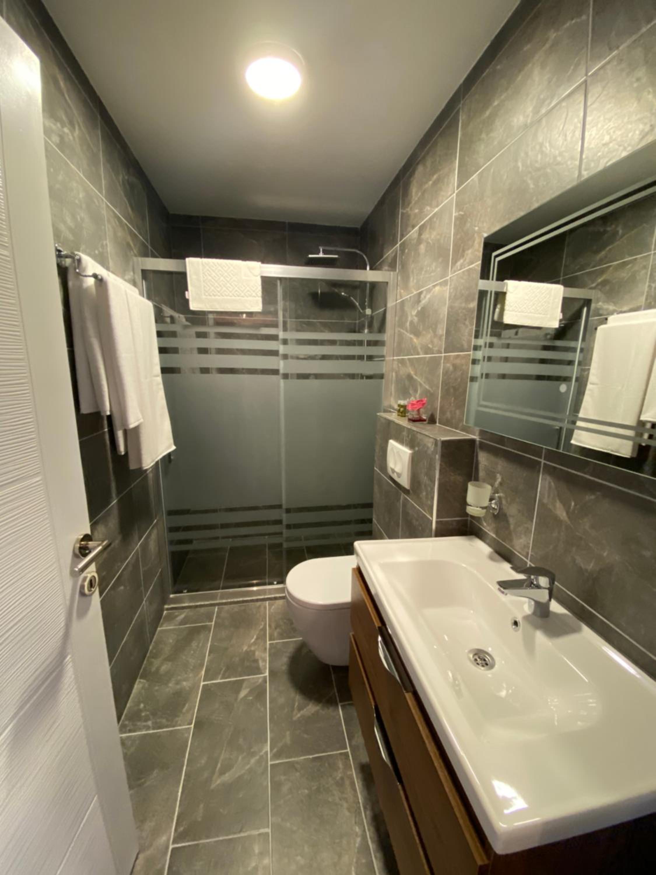 Tuvaletin pisliğinden rahatsız olduk. Klozetin çevresi ve şifon düğmesi pisti. Terlik de olmalıydı.
