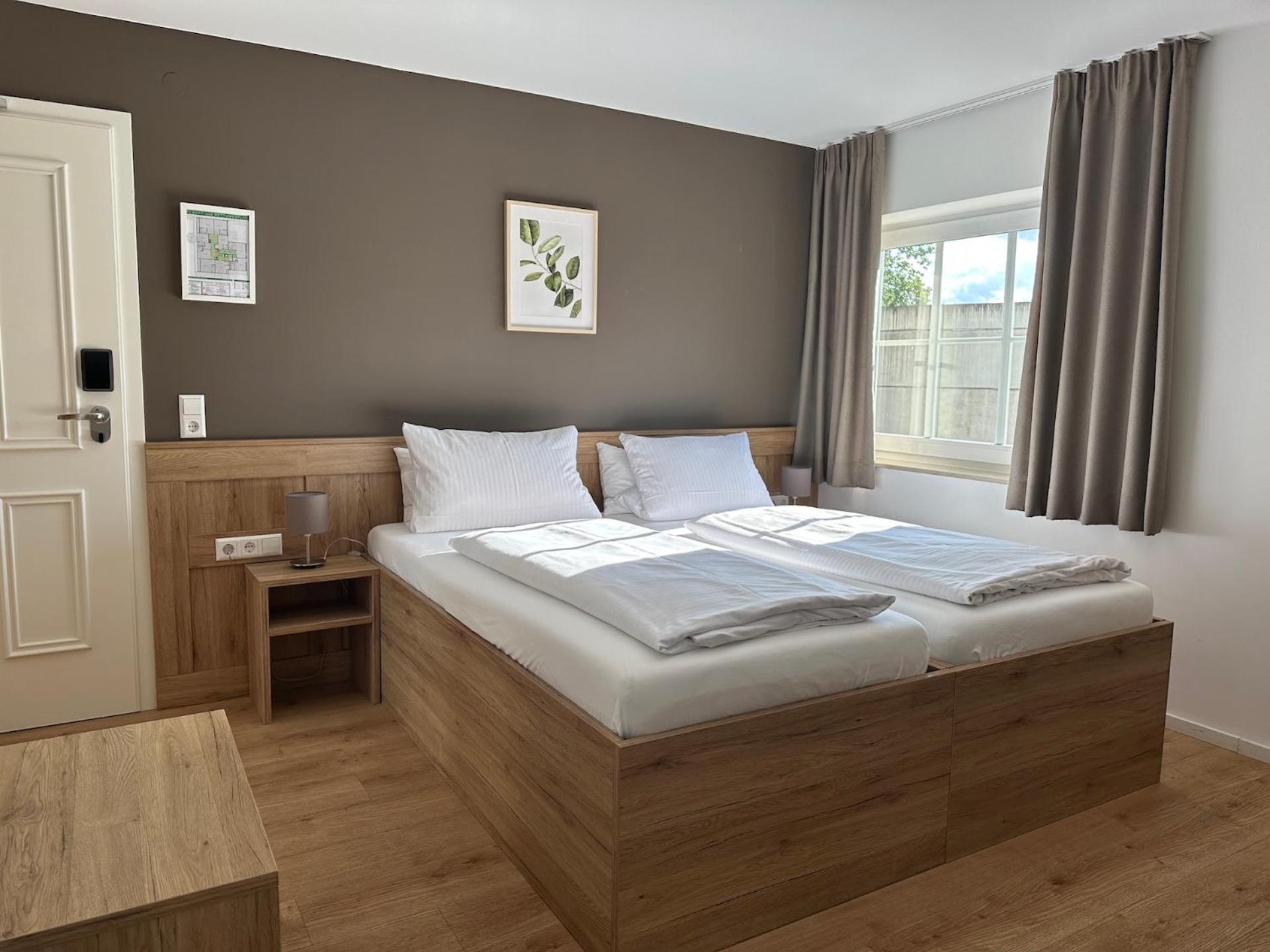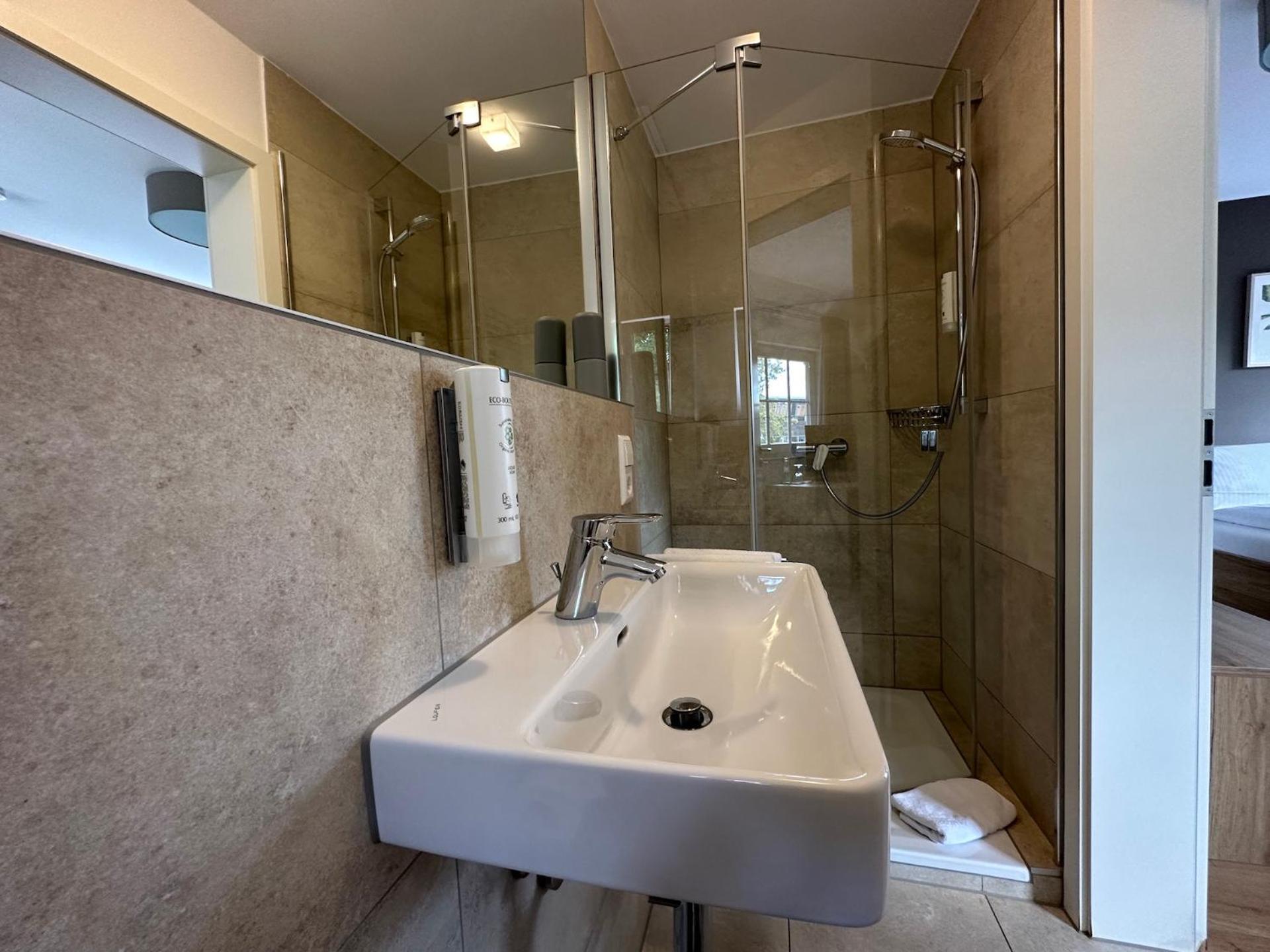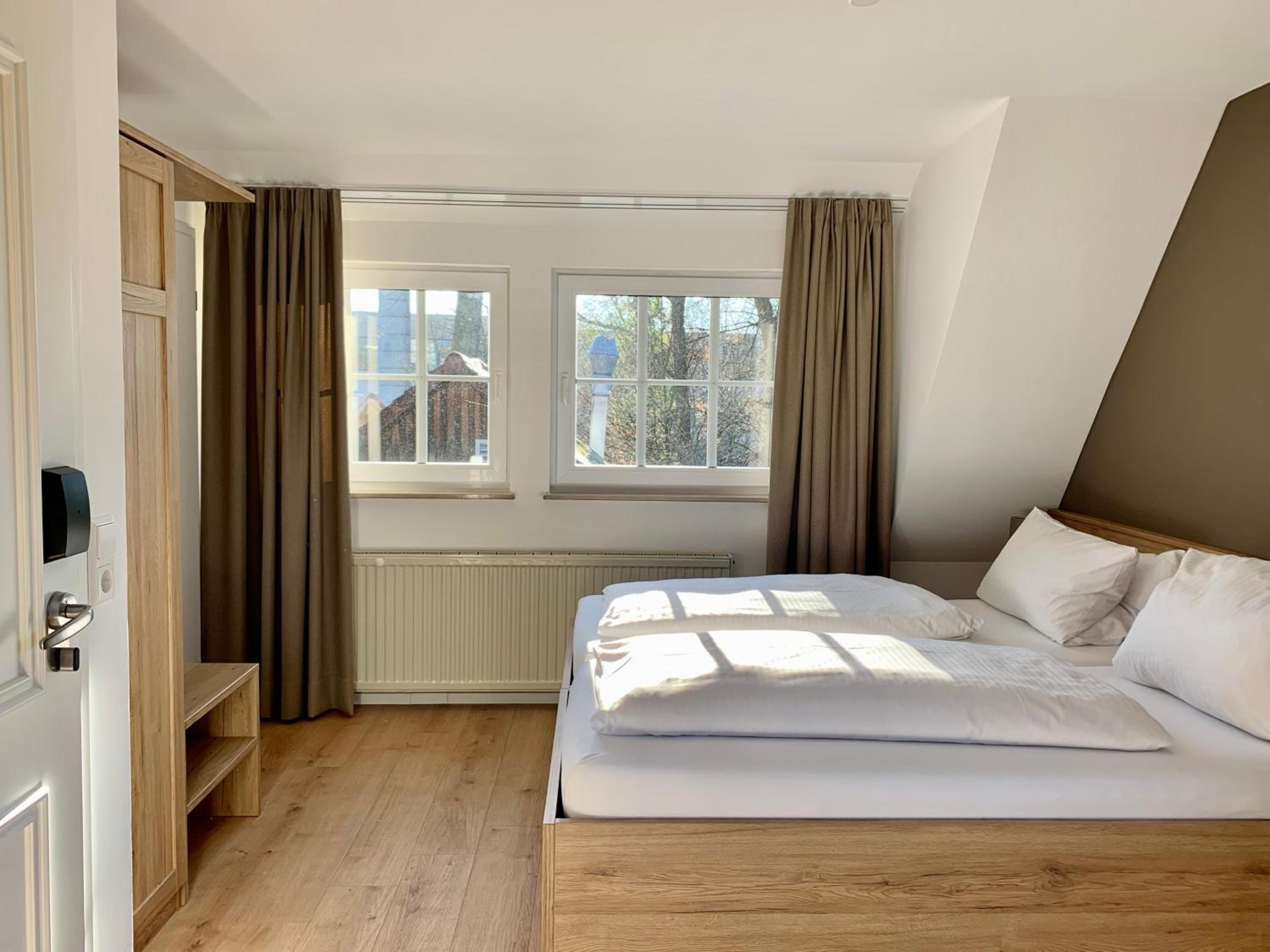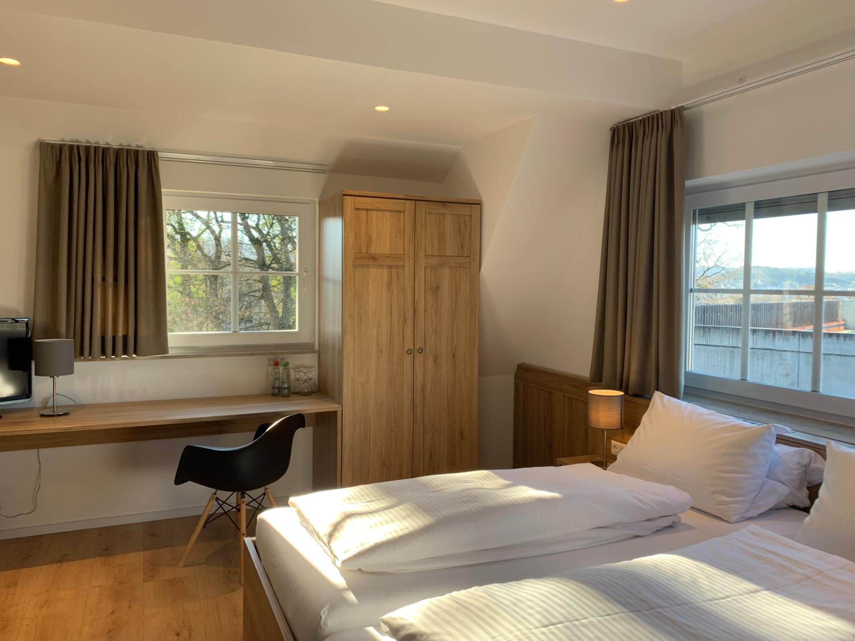 De ligging vlak naast een bospark en op loopafstand van het centrum. Een kleinschalig hotel met moderne kamerinrichting Makkelijk een restaurant beneden, waarin ook het genoeglijke ontbijt werd geserveerd..