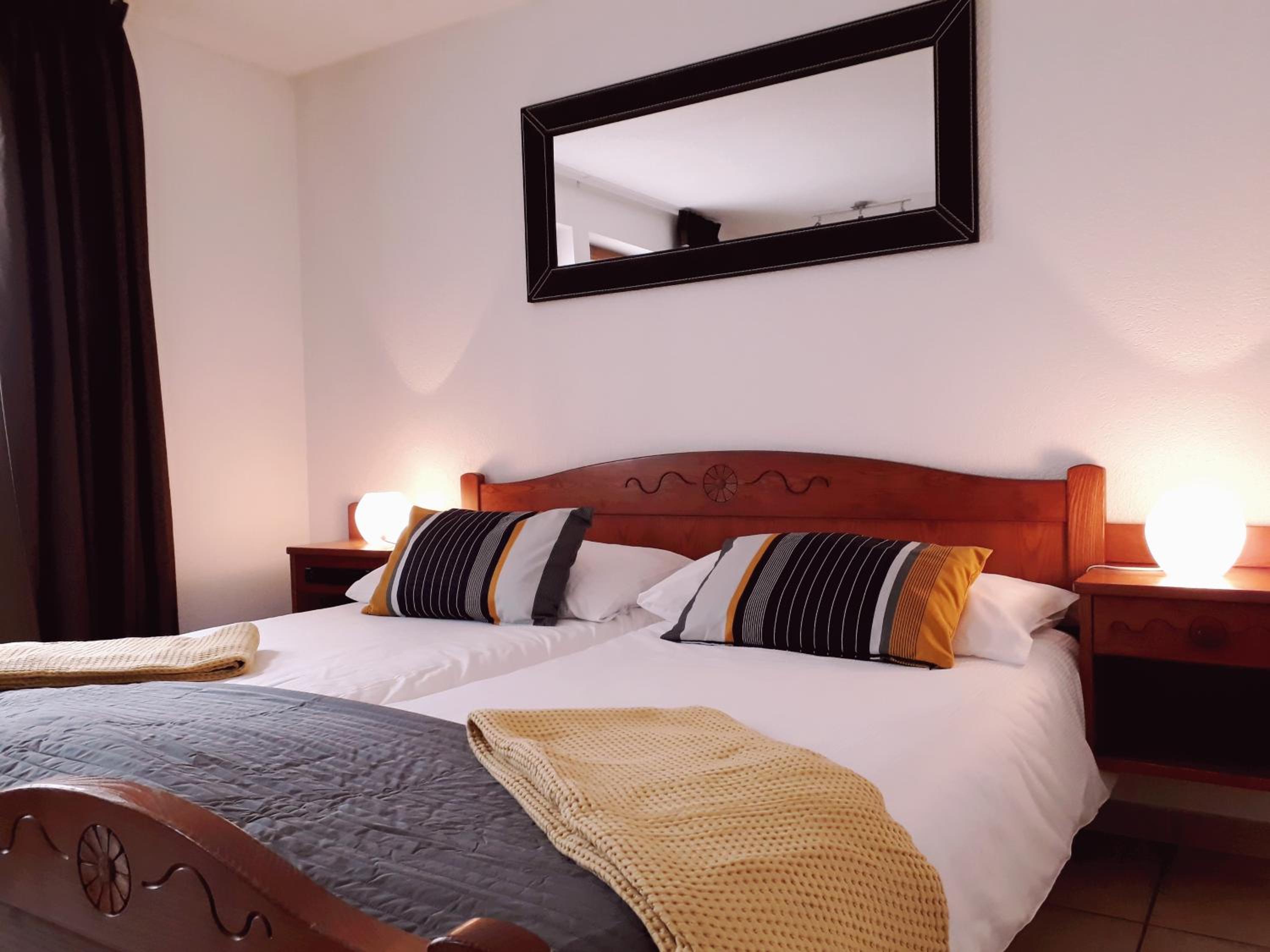 Experience comfort in our rooms adorned with traditional wooden furniture, equipped with modern amenities such as a flat-screen TV, coffee machine, minibar, and a shower in the bathroom, ensuring a pleasant stay for our guests.