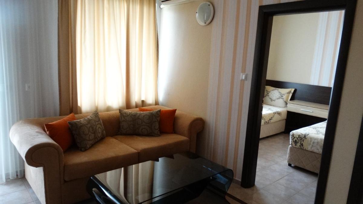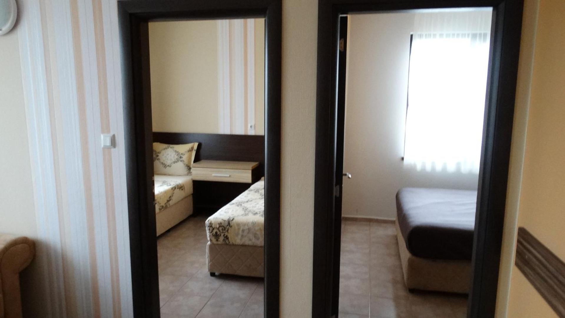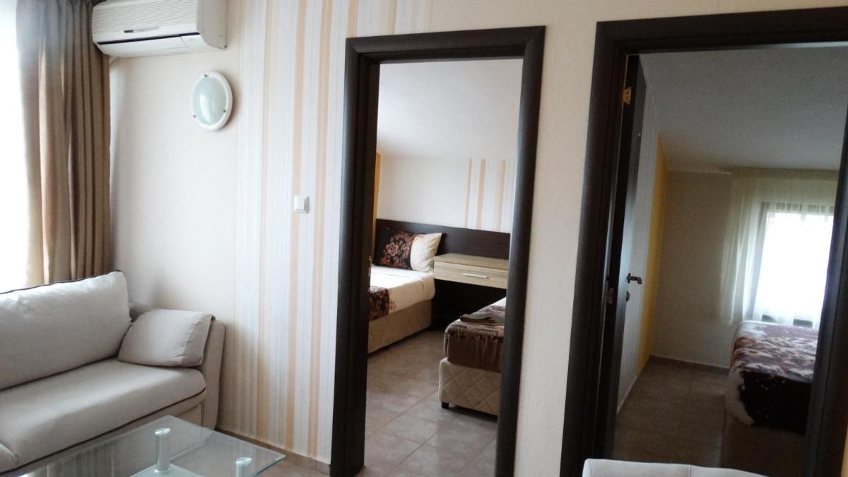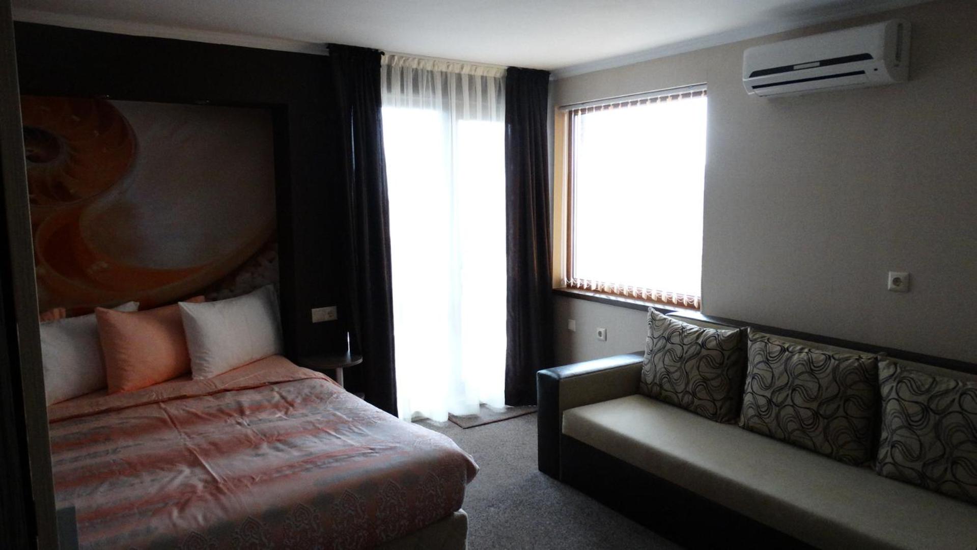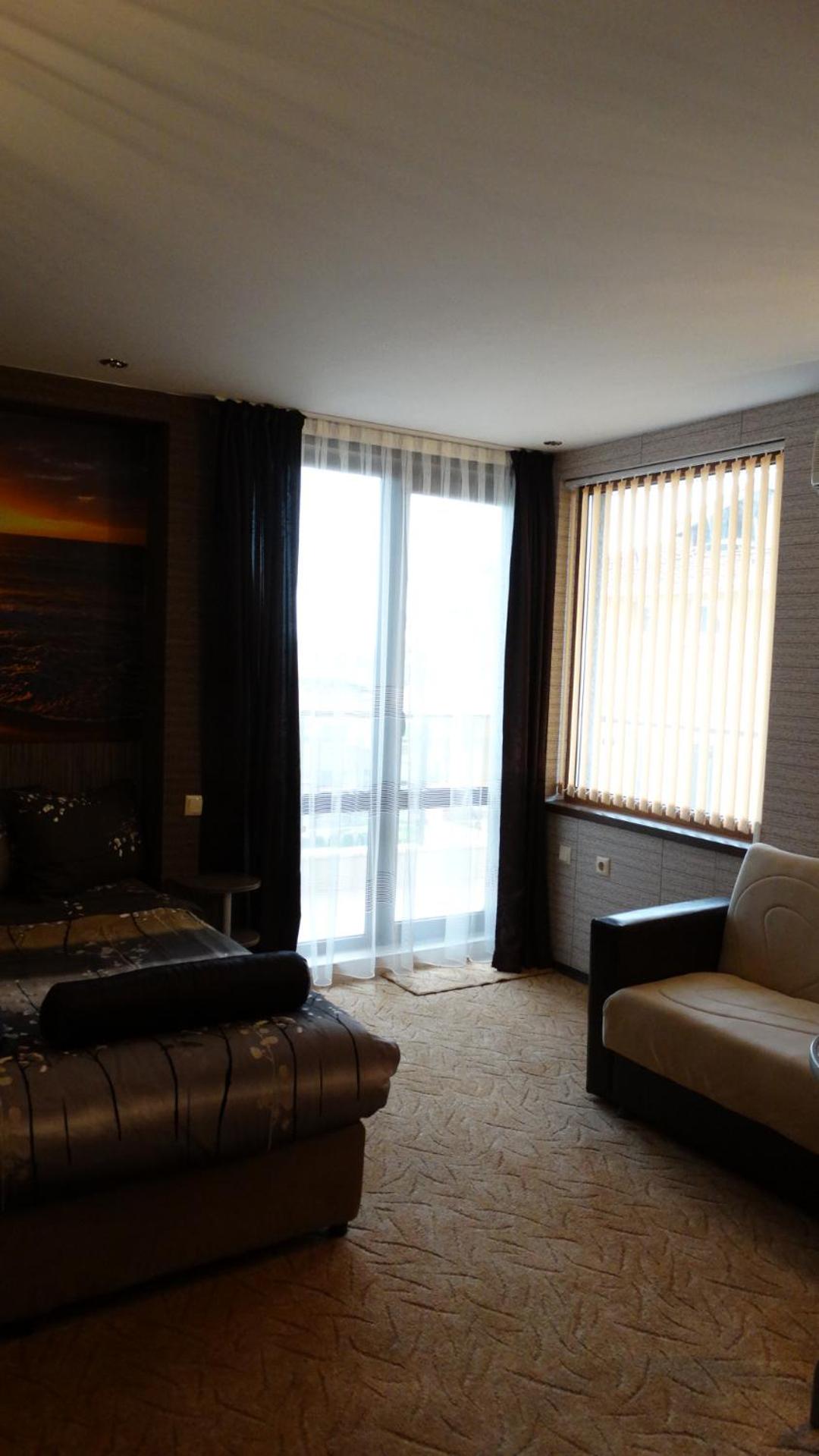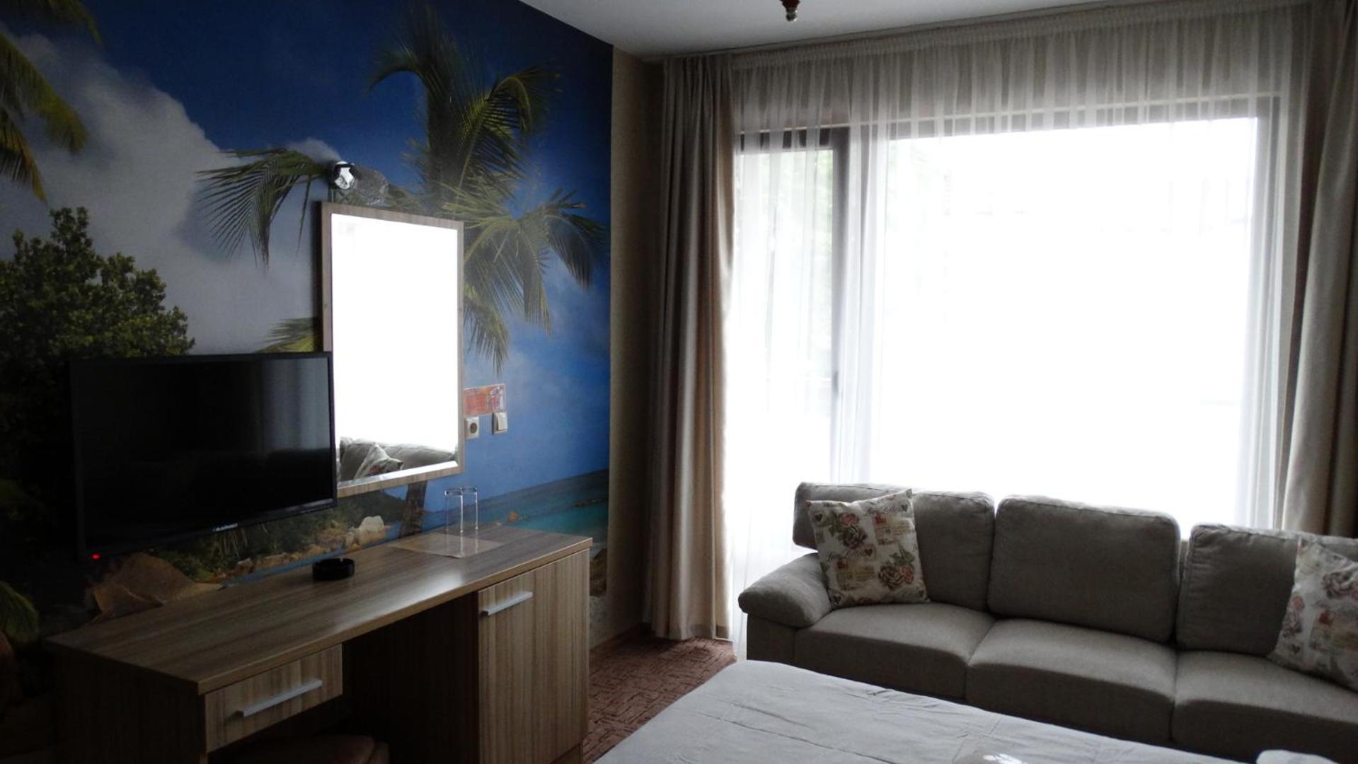 Hotel Lazur in Kiten offers comfortable rooms with air conditioning, balconies, and modern amenities. Some rooms even feature flat-screen TVs and spacious living areas, providing a luxurious stay for guests.