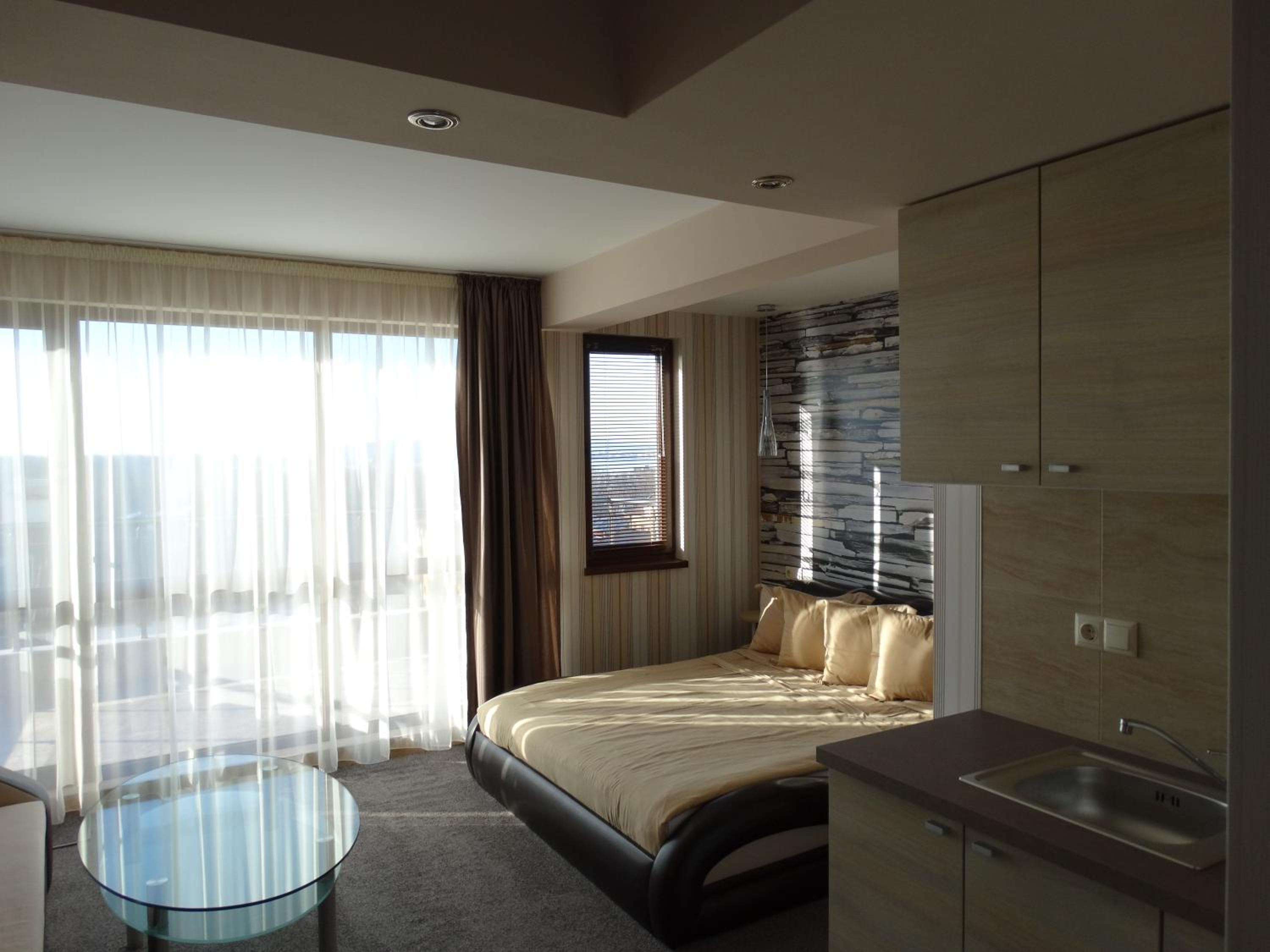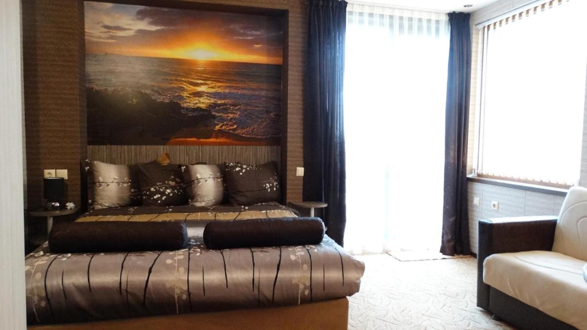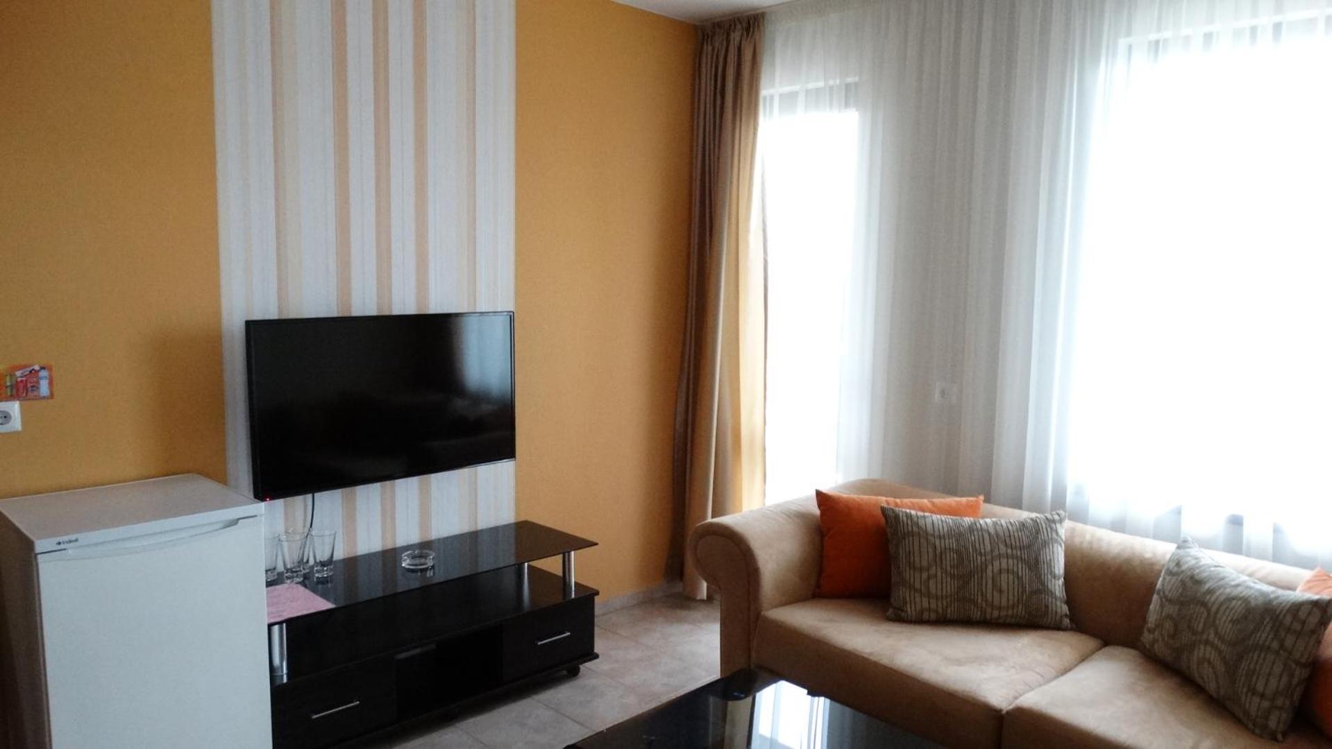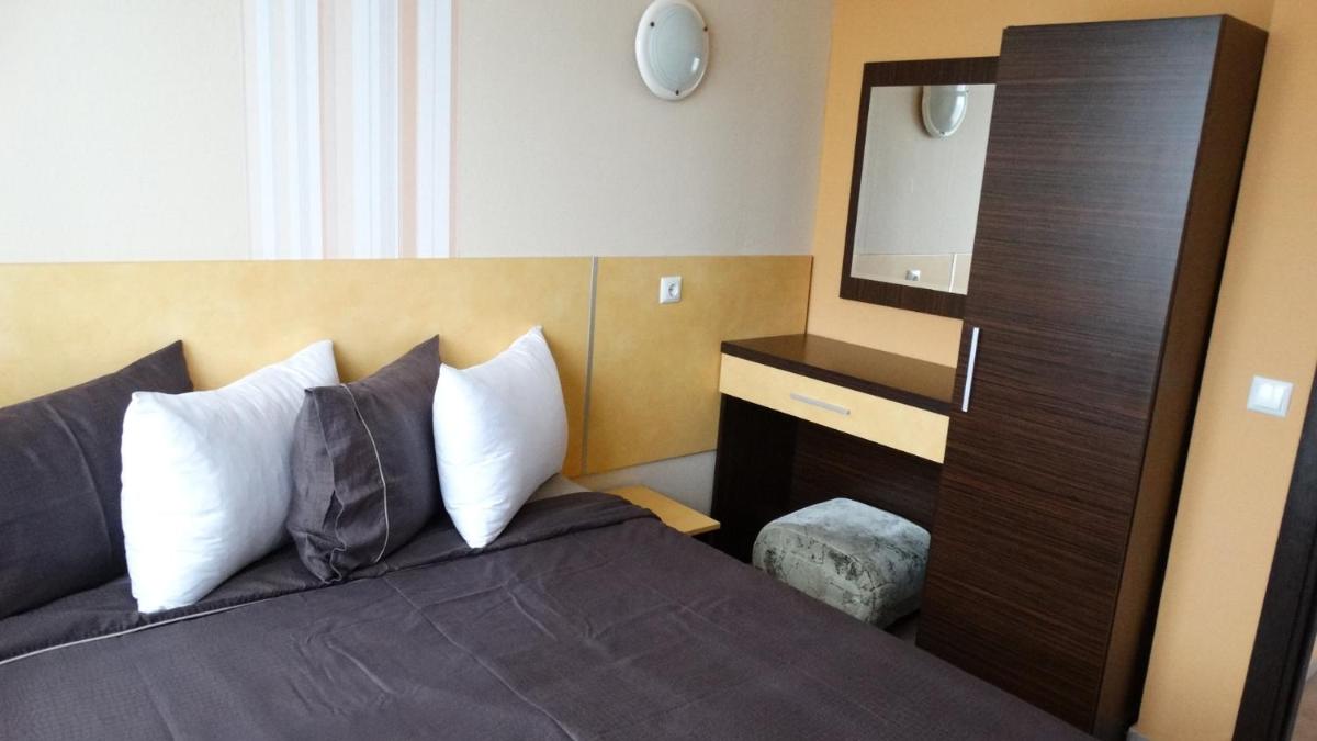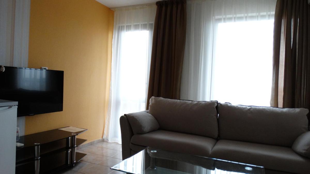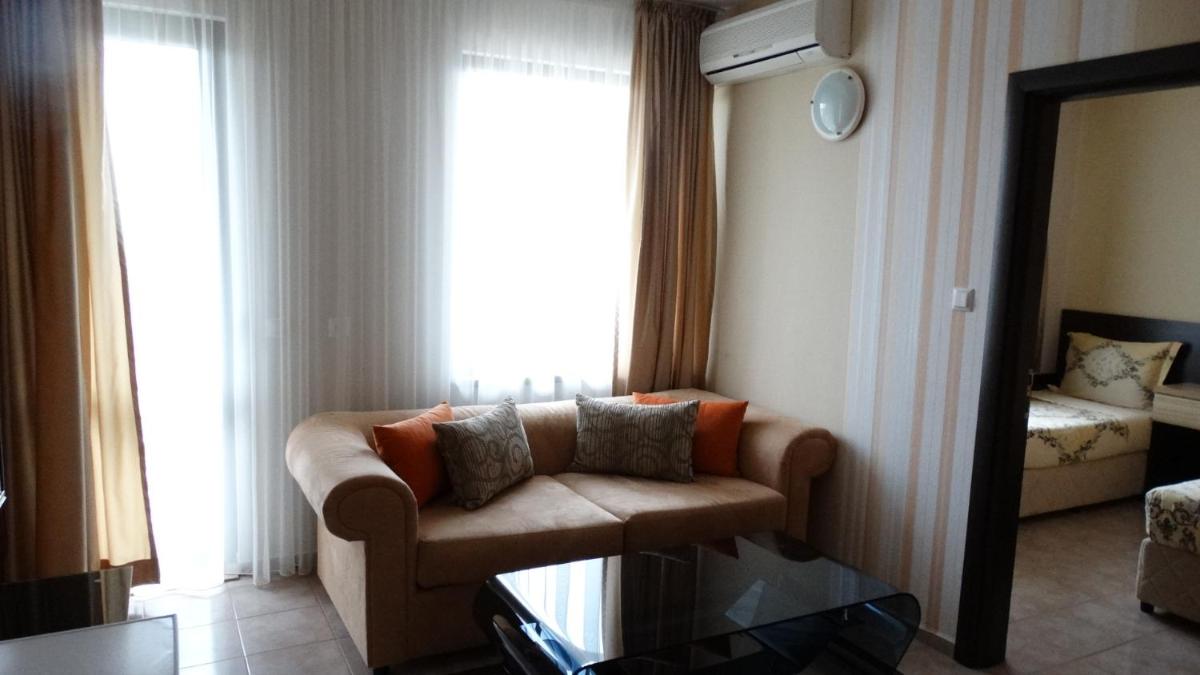 Hotel Lazur in Kiten offers comfortable rooms with air conditioning, balconies, and modern amenities. Some rooms even feature flat-screen TVs and spacious living areas, providing a luxurious stay for guests.