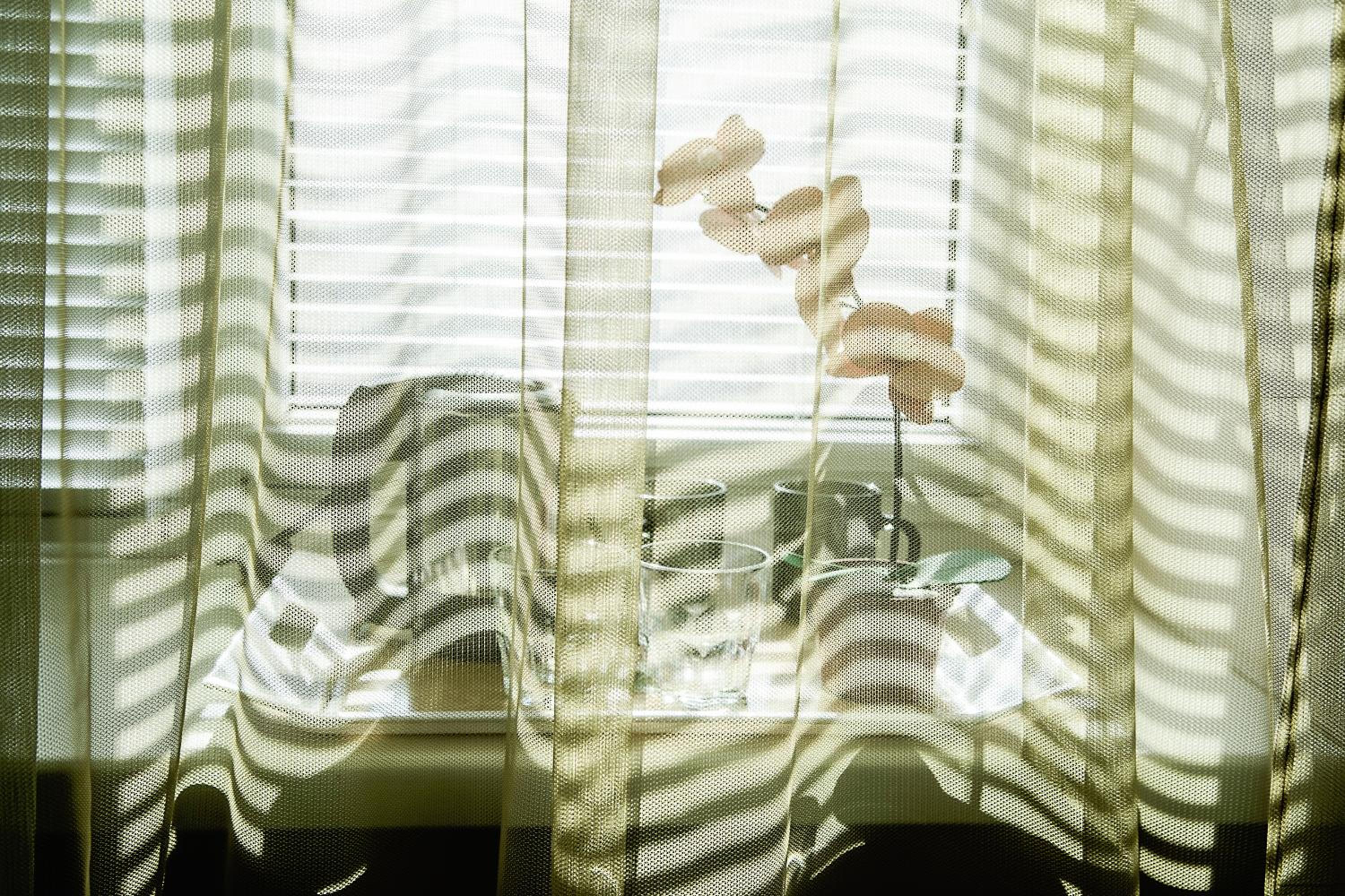 Москитная сетка есть, но она грязная, при открытии окна настеж низ оконной рамы в тёмных сгустках дорожной пыли + тканевые ролеты в разлитых пятнах бросающихся в глаза.
