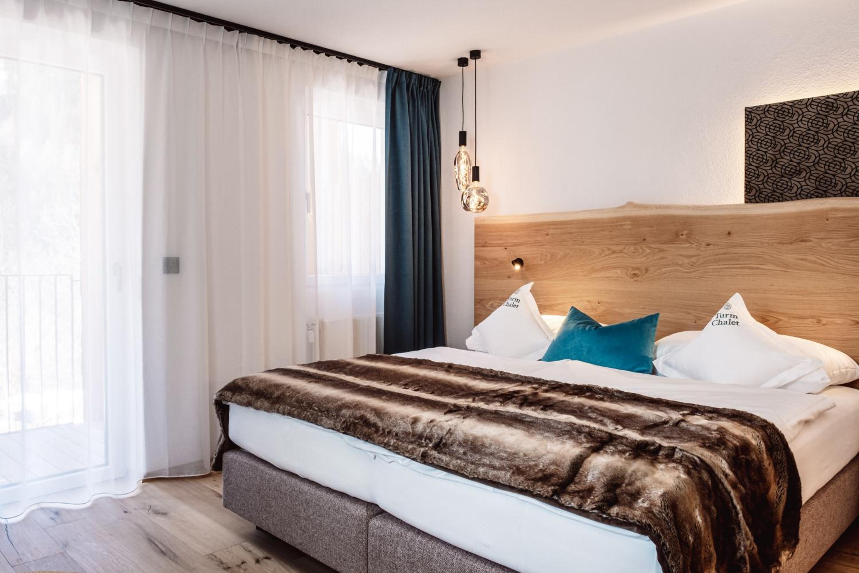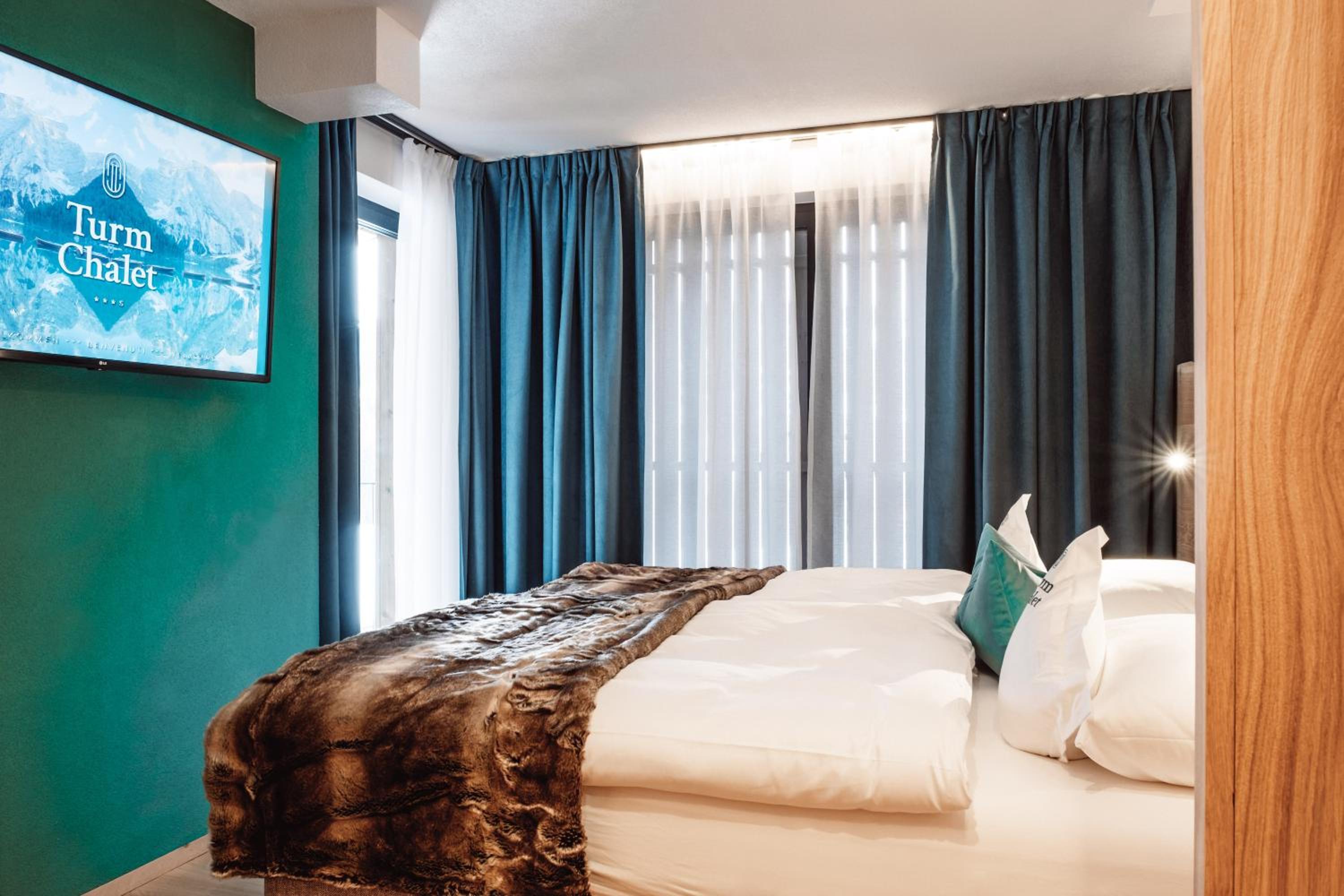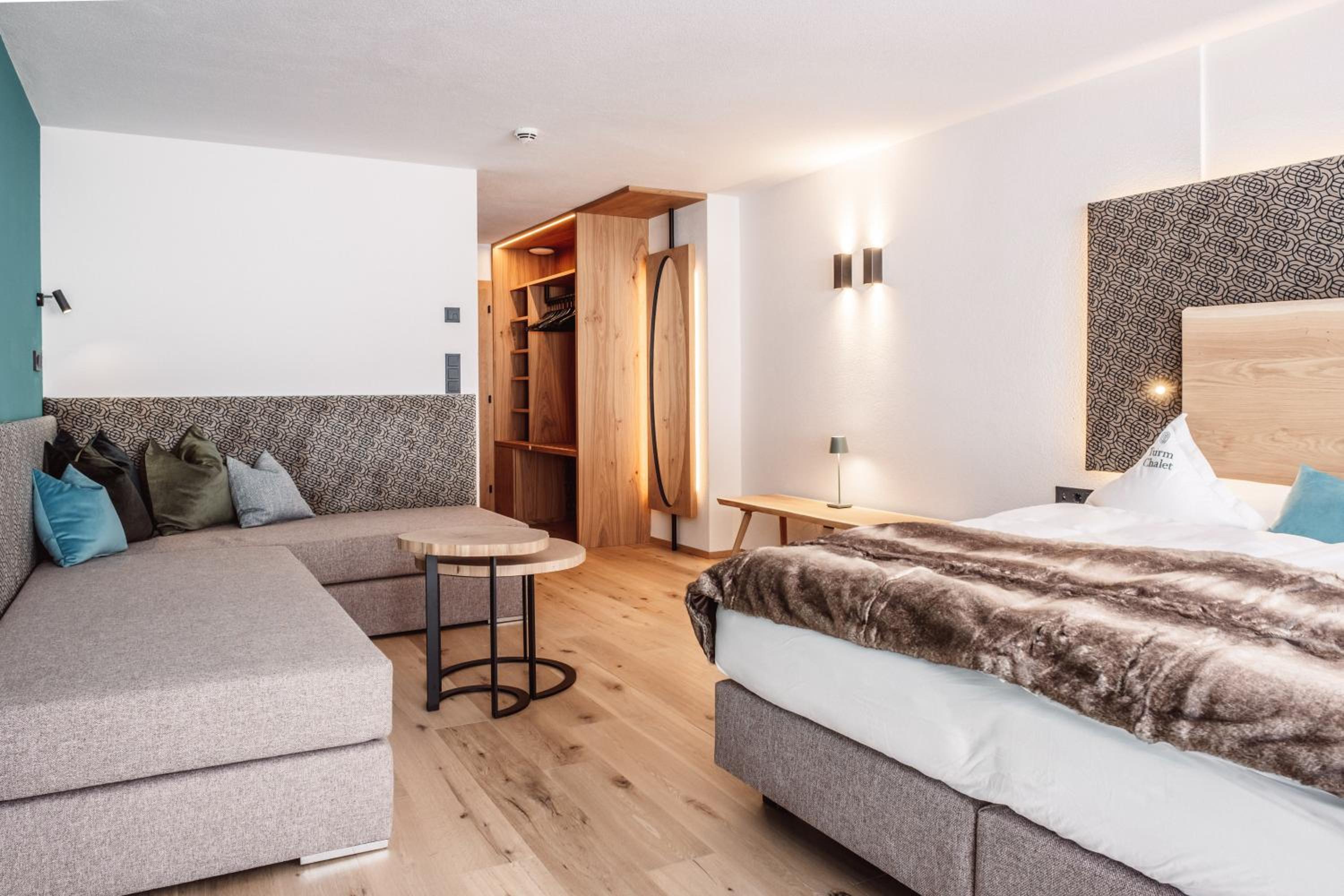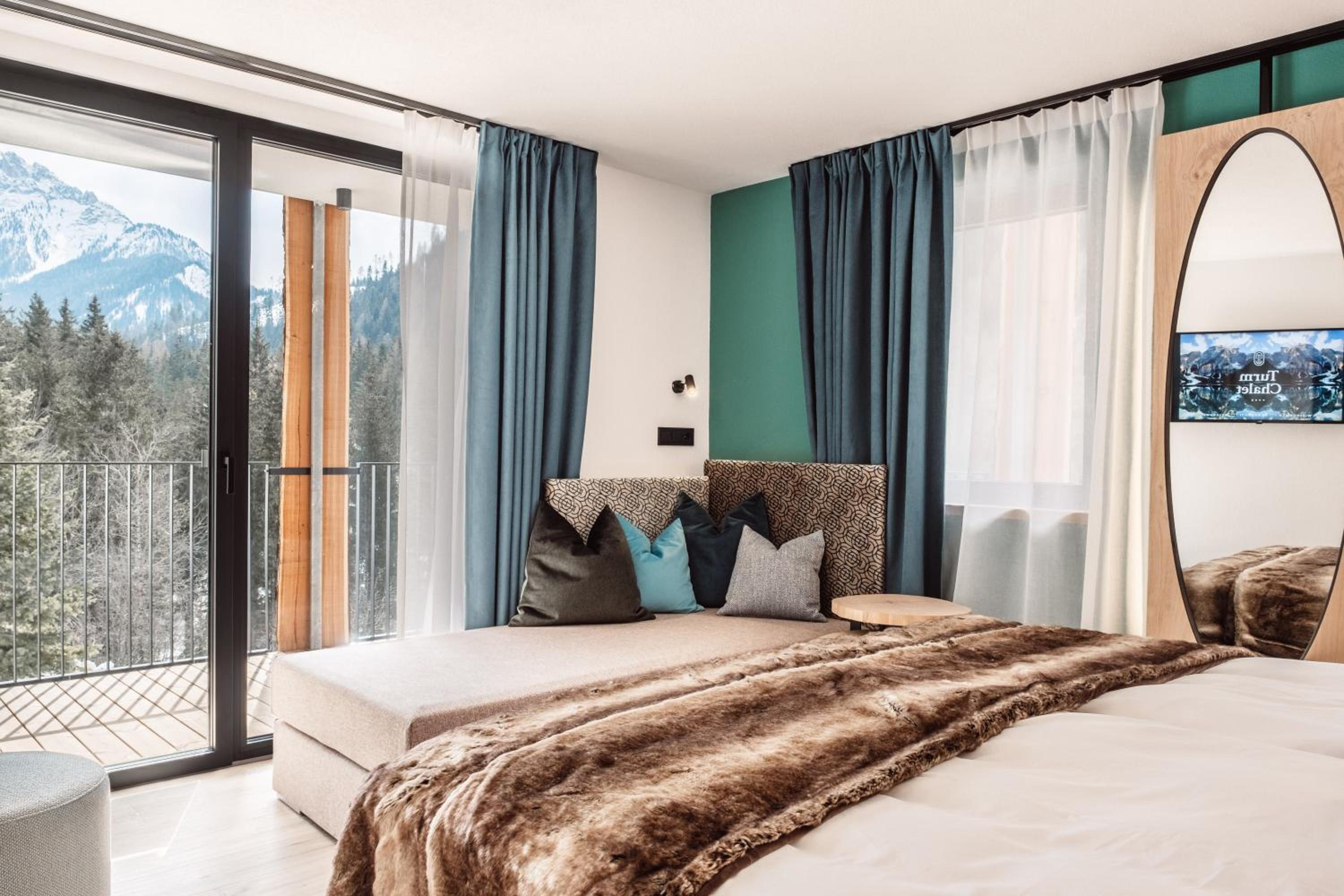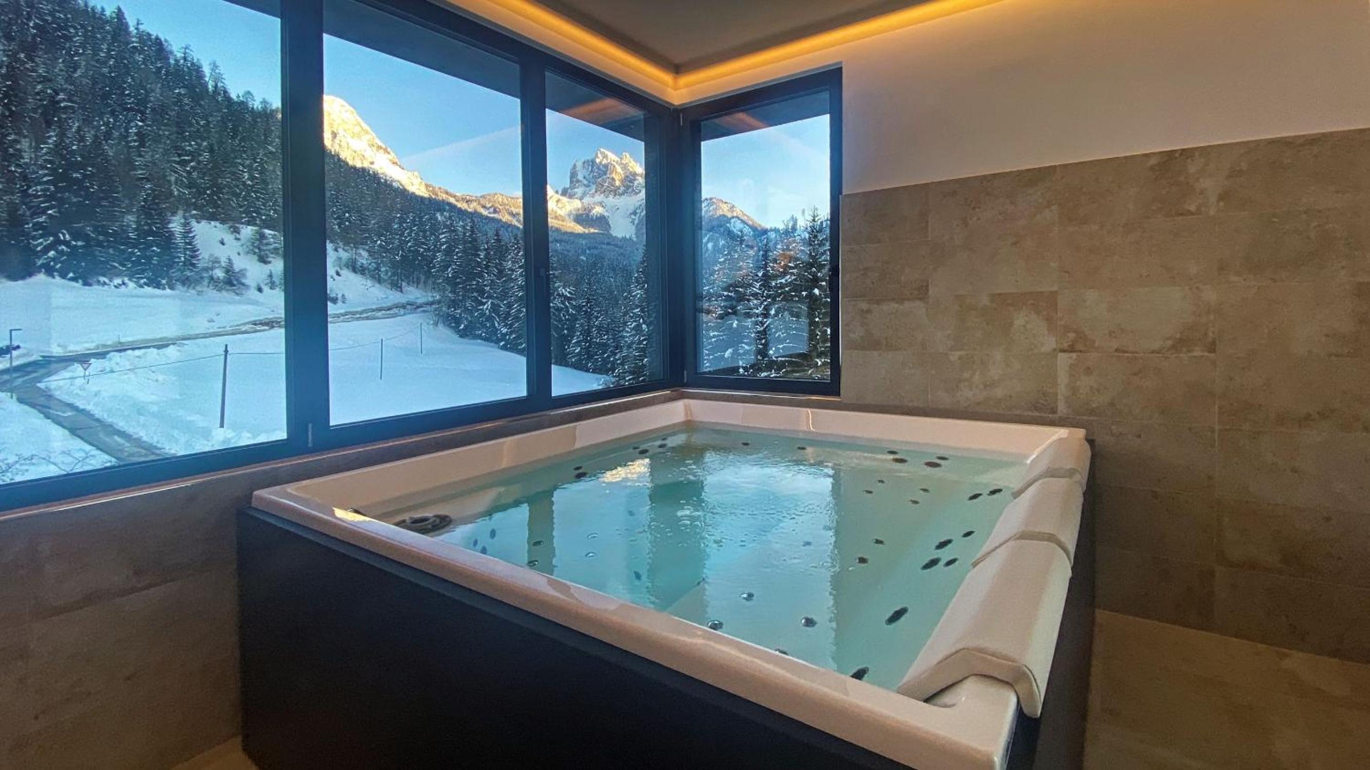 The family-run Turmchalet in Braies boasts a rooftop wellness area with a sauna, hot tub, and relaxation areas, perfect for unwinding after a day of outdoor activities.