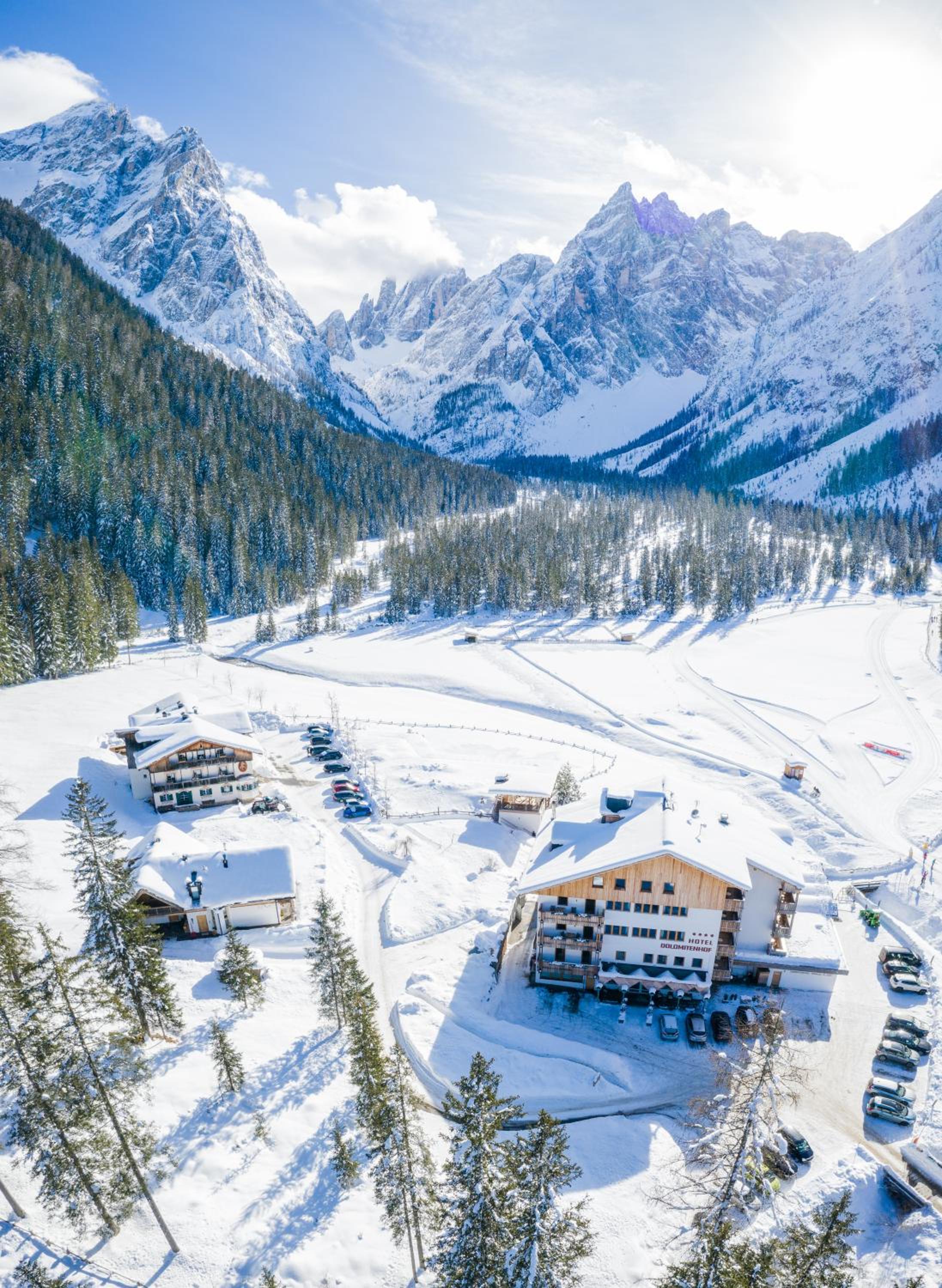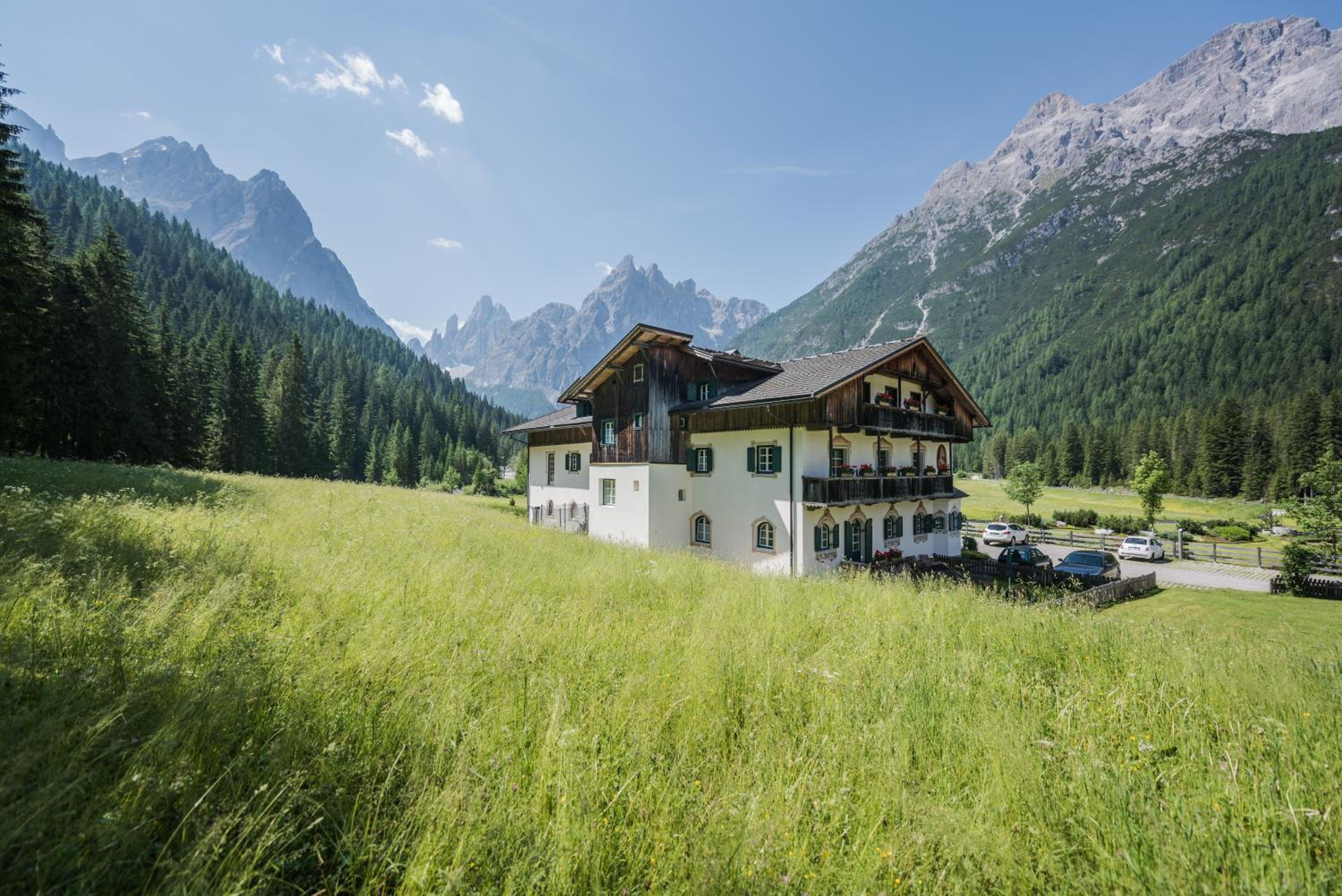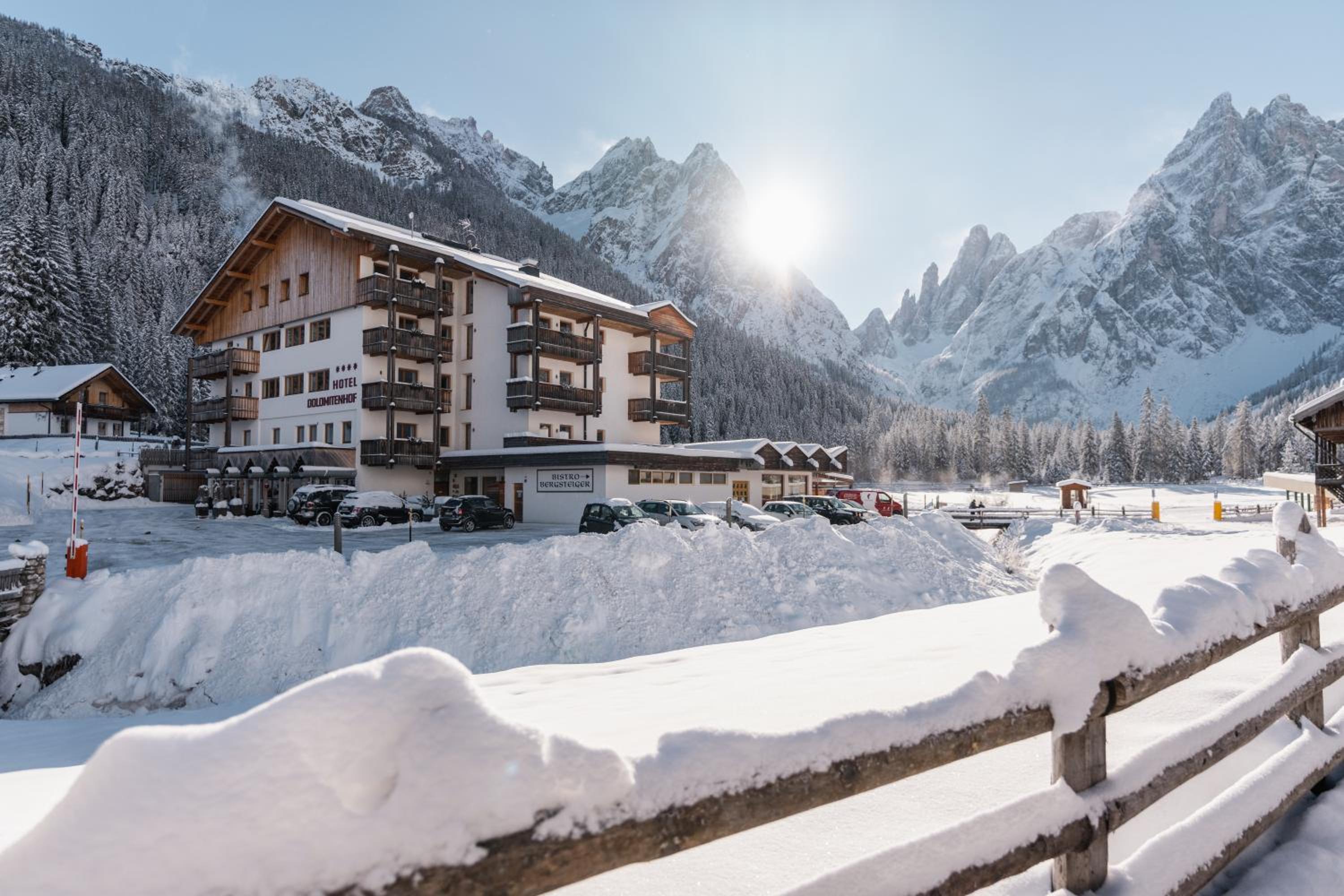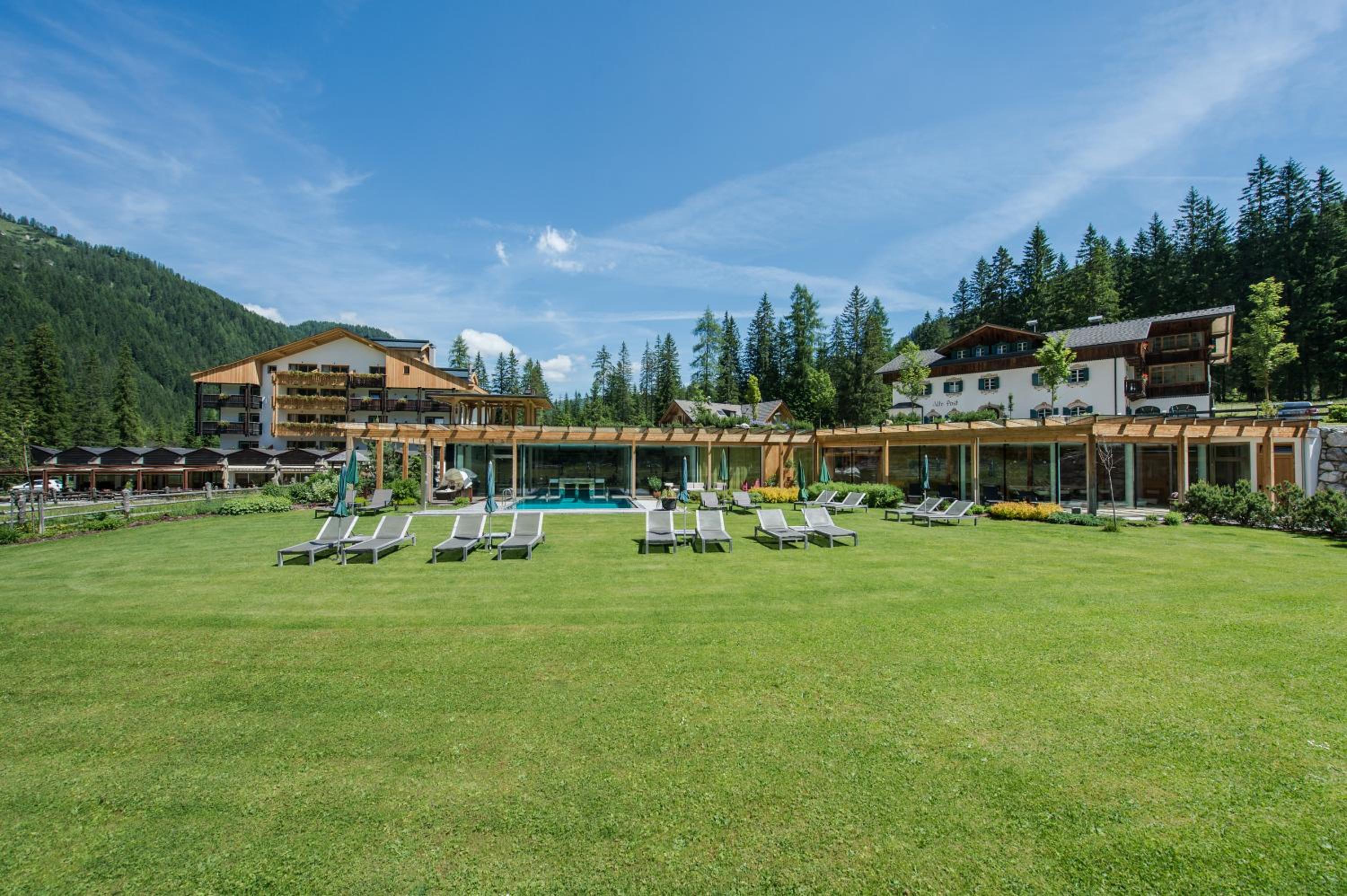 Nestled in the heart of Tre Cime National Park, Hotel Dolomitenhof & Chalet Alte Post offers a tranquil escape with its wellness center and two inviting swimming pools. The interconnected Dolomitenhof and Alte Post buildings boast comfortable rooms with modern amenities, some featuring stunning southern views. The authentic Swiss Stone Pine Wood furnishings in the Dolomitenhof and traditional alpine decor in the Chalet create a charming atmosphere for guests.