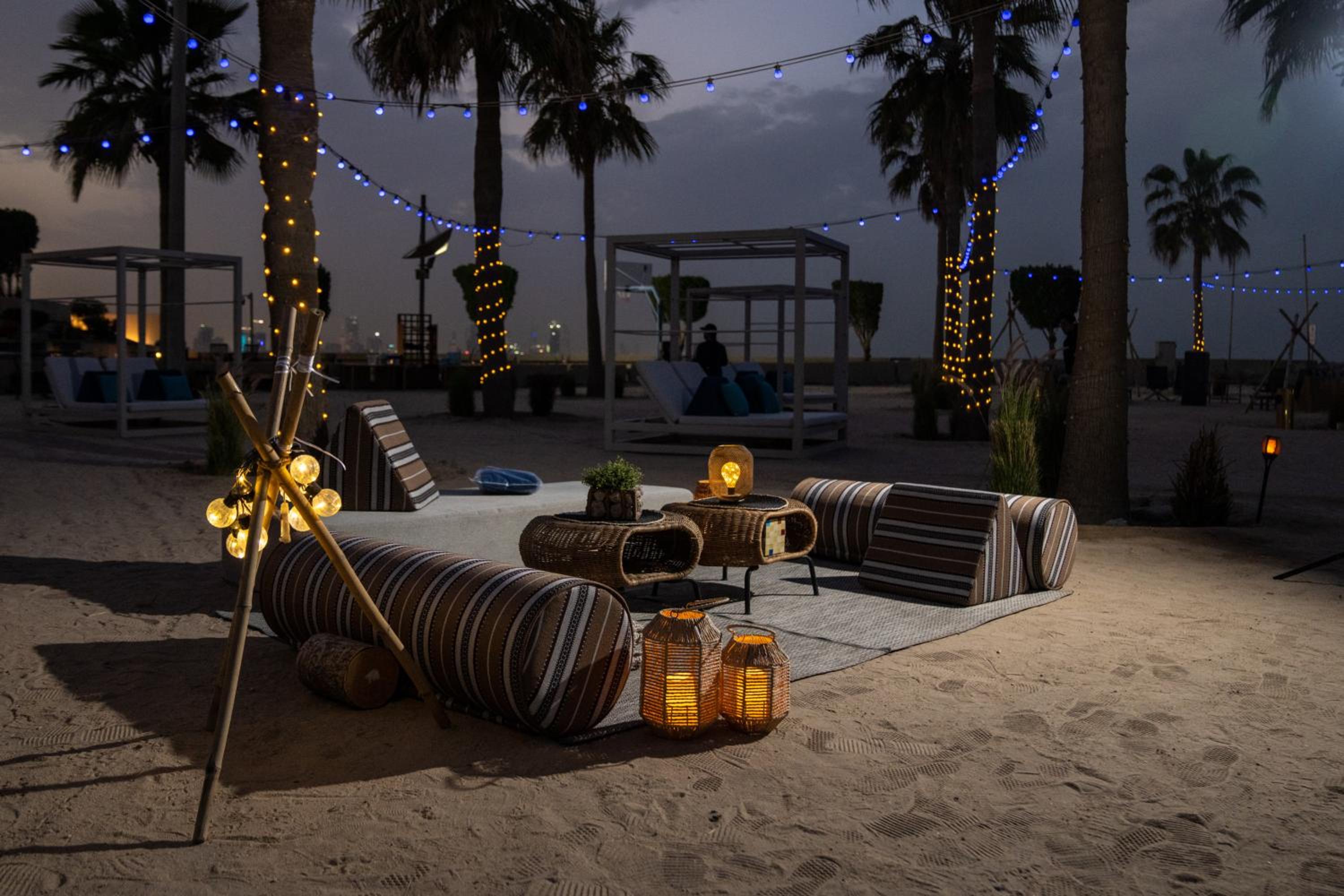 • Visitors are welcomed in the Restaurants & Qahwa Café. If the visitor would like to use the pool / beach facilities , she or he should pay the Blue Beach Fees.