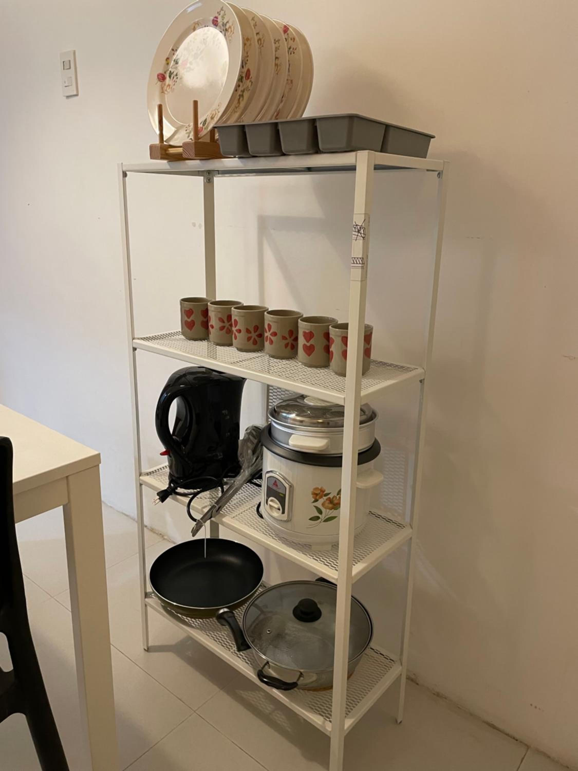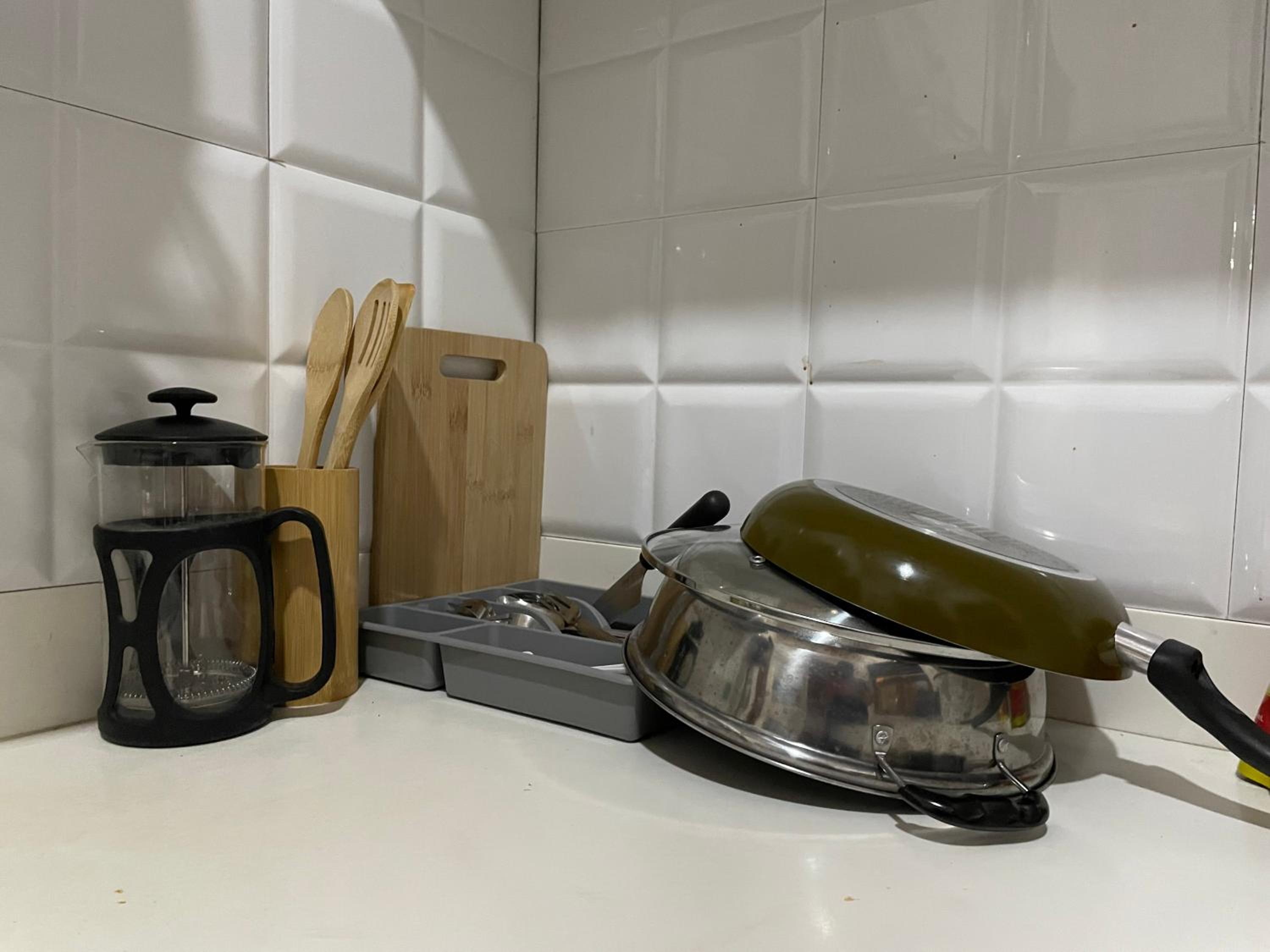 Kitchen tools and appliances are complete .