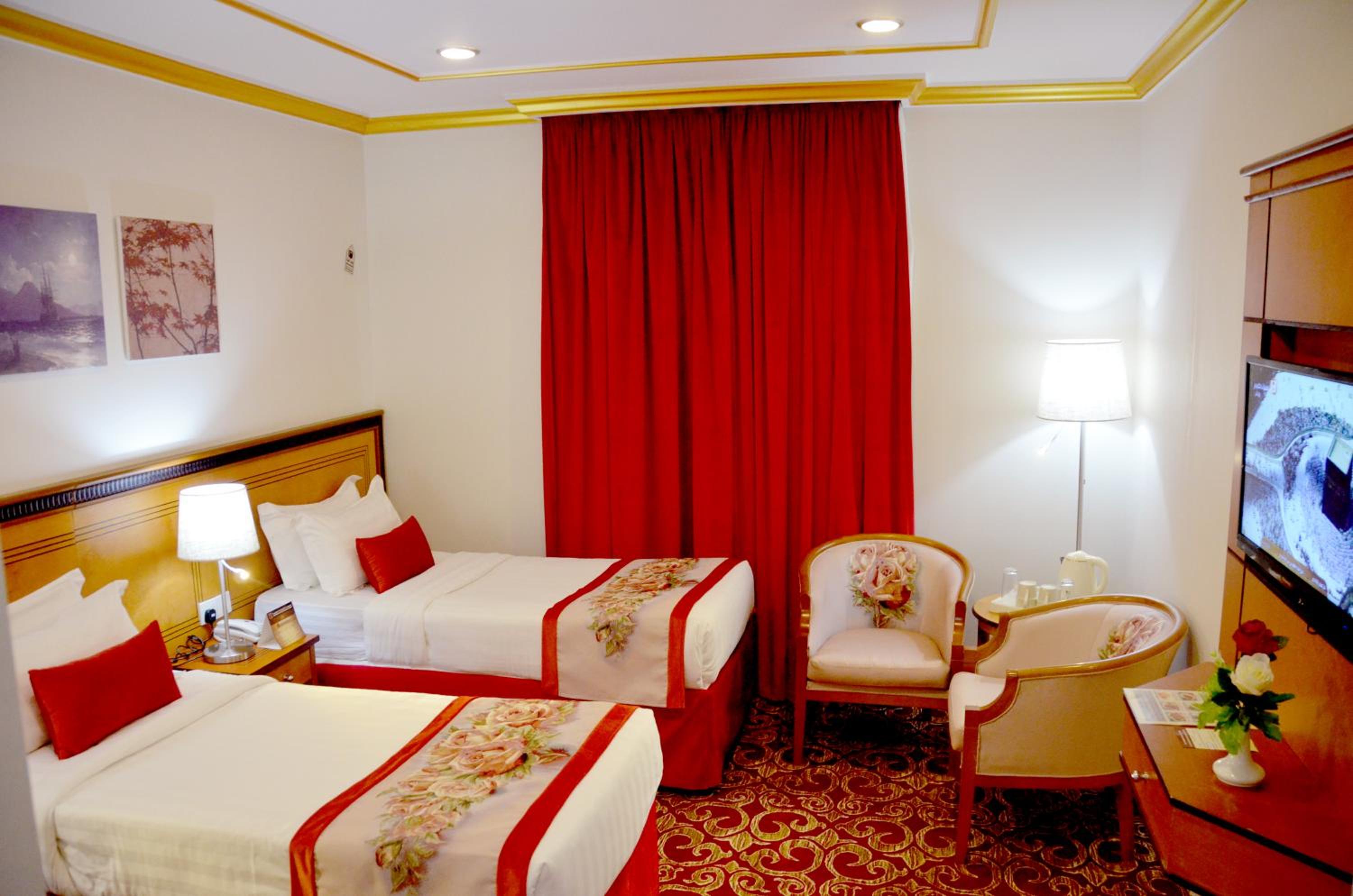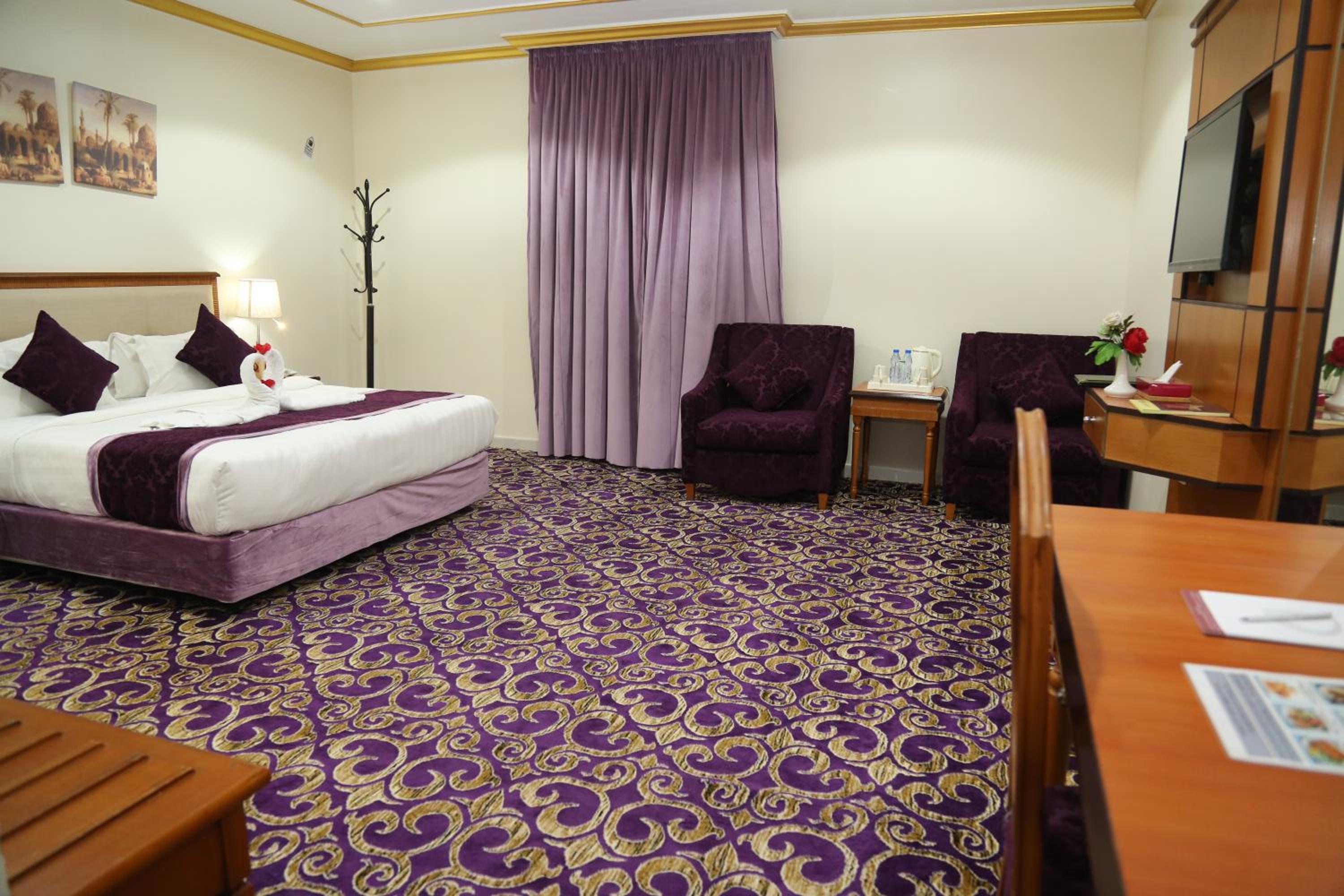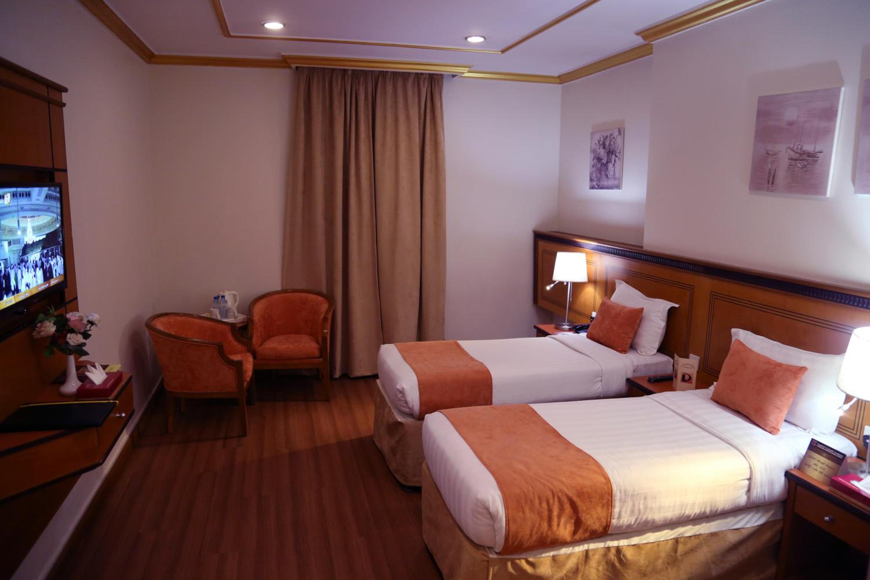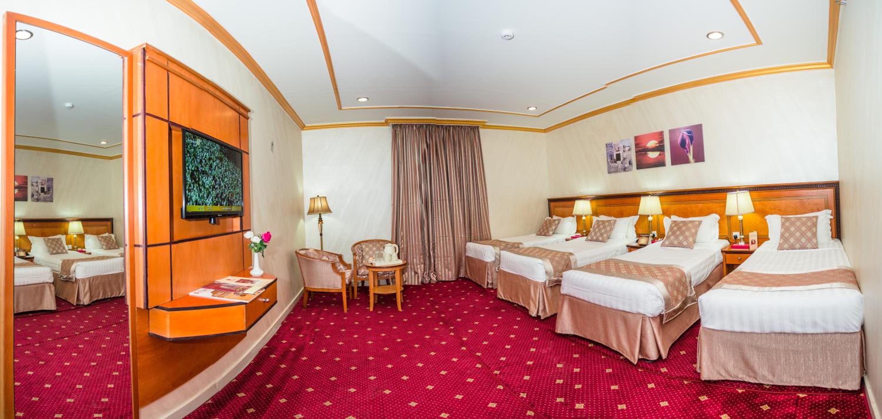 Experience luxury and convenience at our hotel in Tayseer district near King Abdullah Holy Mosque. Enjoy free WiFi, on-site restaurant, and 24-hour room service in each air-conditioned room. Featuring a flat-screen TV and well-equipped kitchenette, our rooms offer comfort and relaxation. Take advantage of our free shuttle service, 24-hour front desk, and on-site shops. With city views and satellite channels, your stay with us will be unforgettable. Book now for a memorable experience at Amjad Al Diyafah Hotel.
