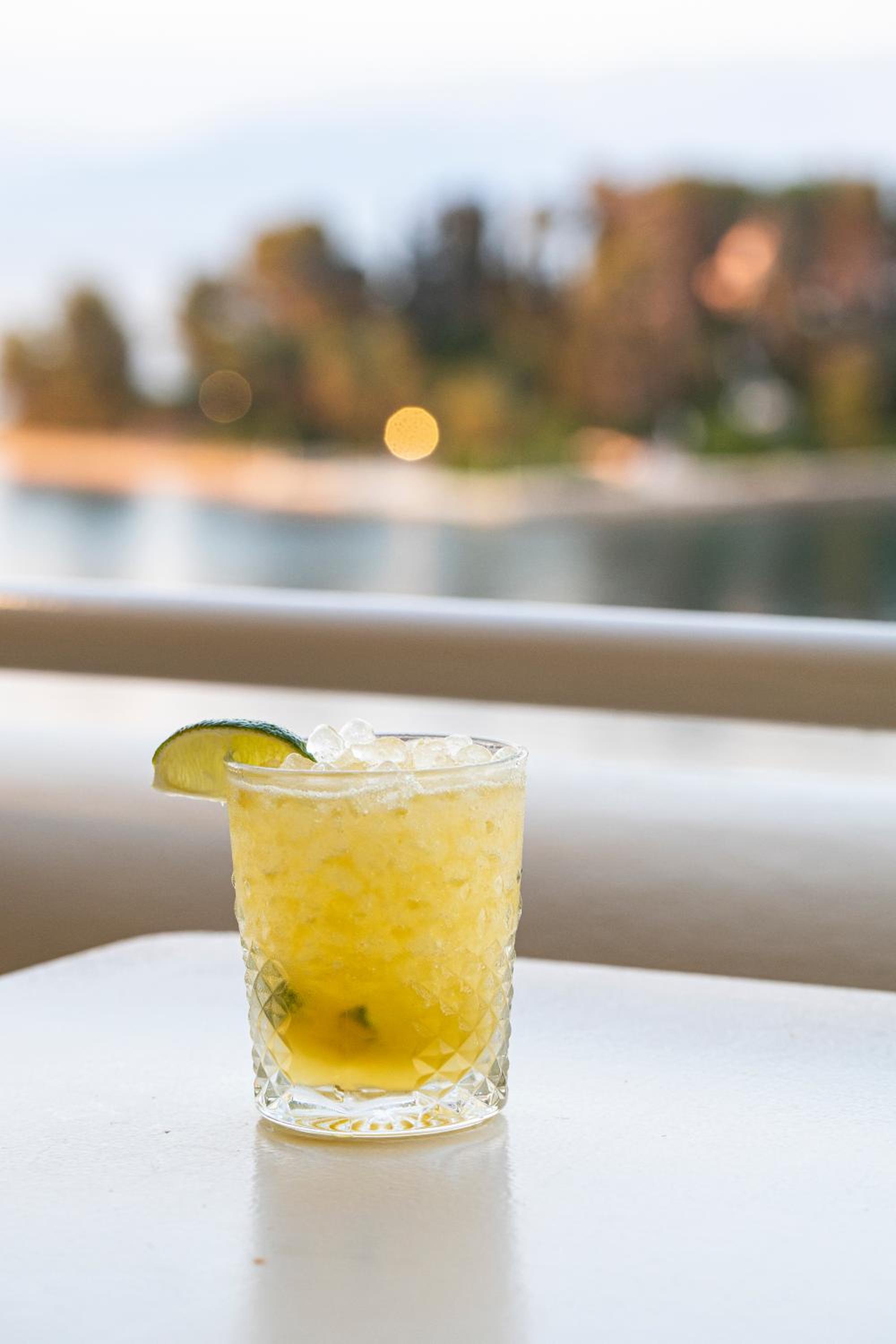 The hotel had its own private beach , along with a pool . A lounge upstairs with drinks and food.