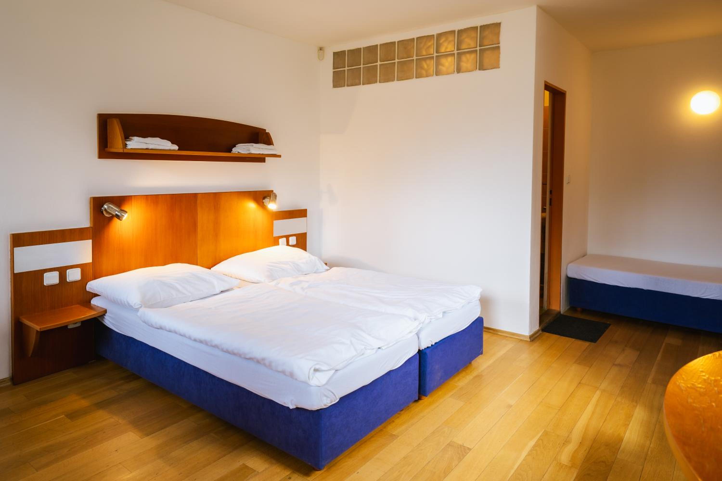 Byla jsem ubytovaná s pejskem na jednu noc, jde o bungalovy ve sportovním areálu. I když mrzlo, na pokoji bylo teplo, snídaně výborná, dostatečný výběr, na recepci příjemný personál. V pokoji je malá lednice, bohužel chybí varná konvice. Pejsek je ubytován za poplatek 200,- Kč na noc.