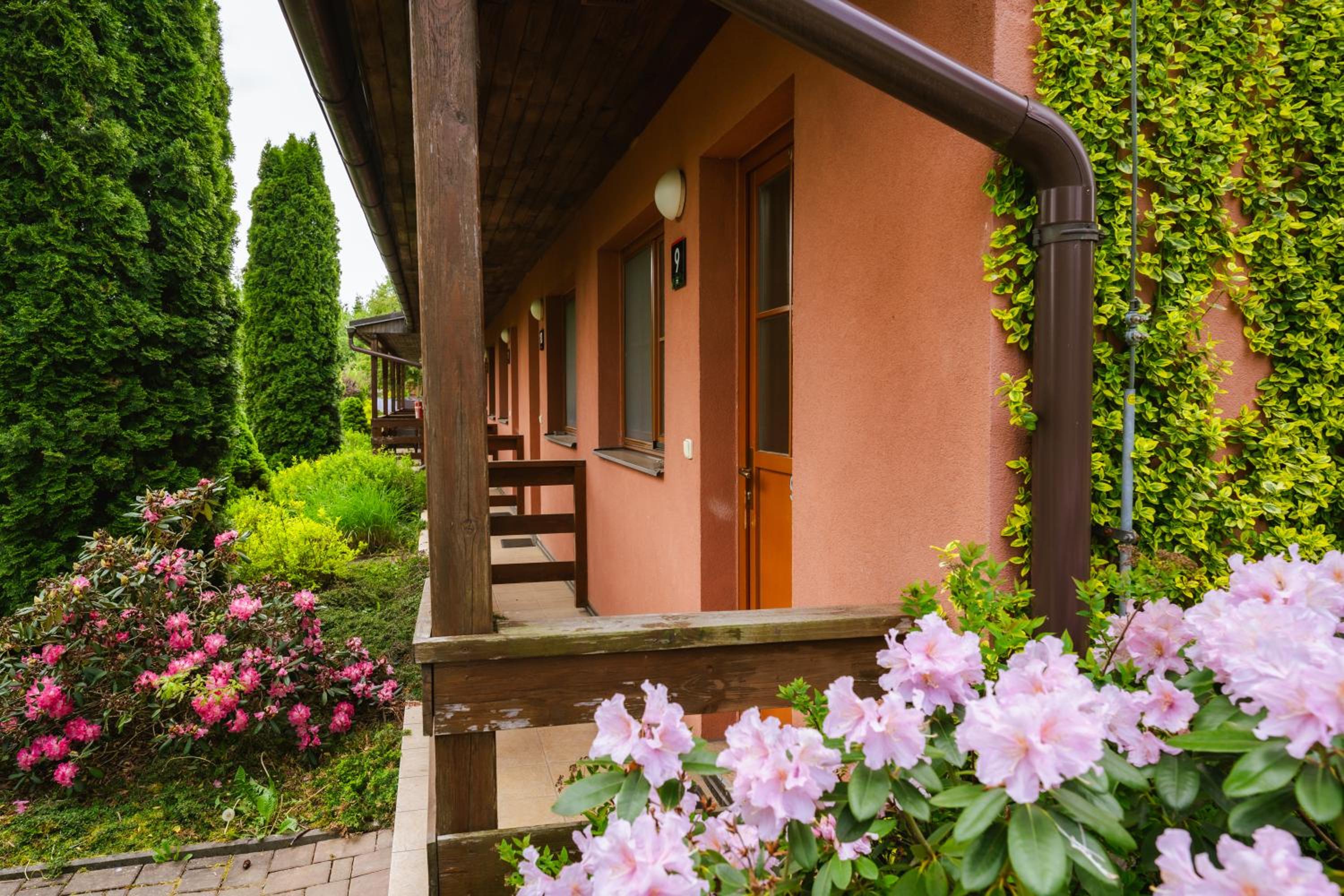 The charming rooms at Oaza Ricany are housed in separate wooden buildings, offering a unique and cozy stay surrounded by greenery and sports facilities.