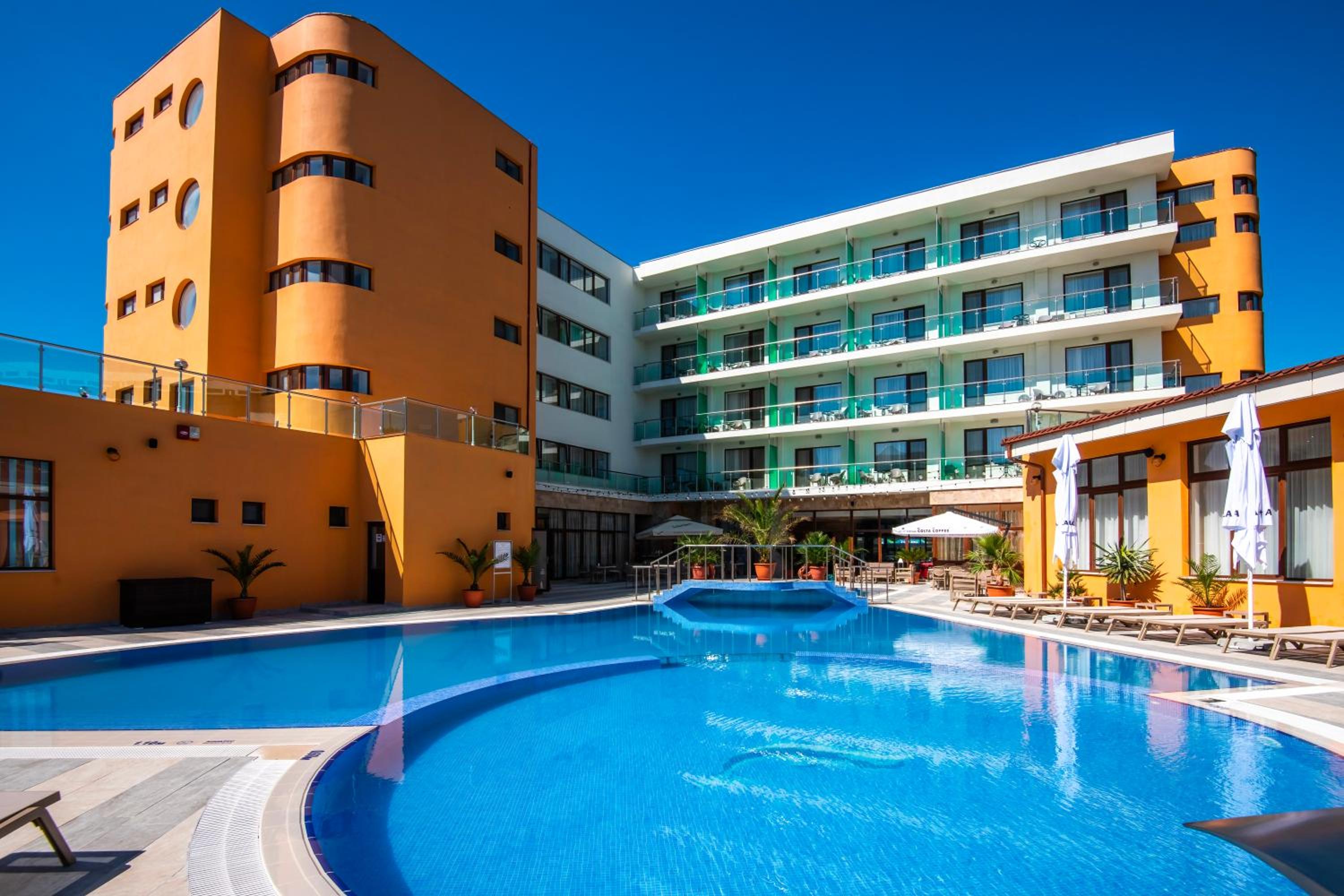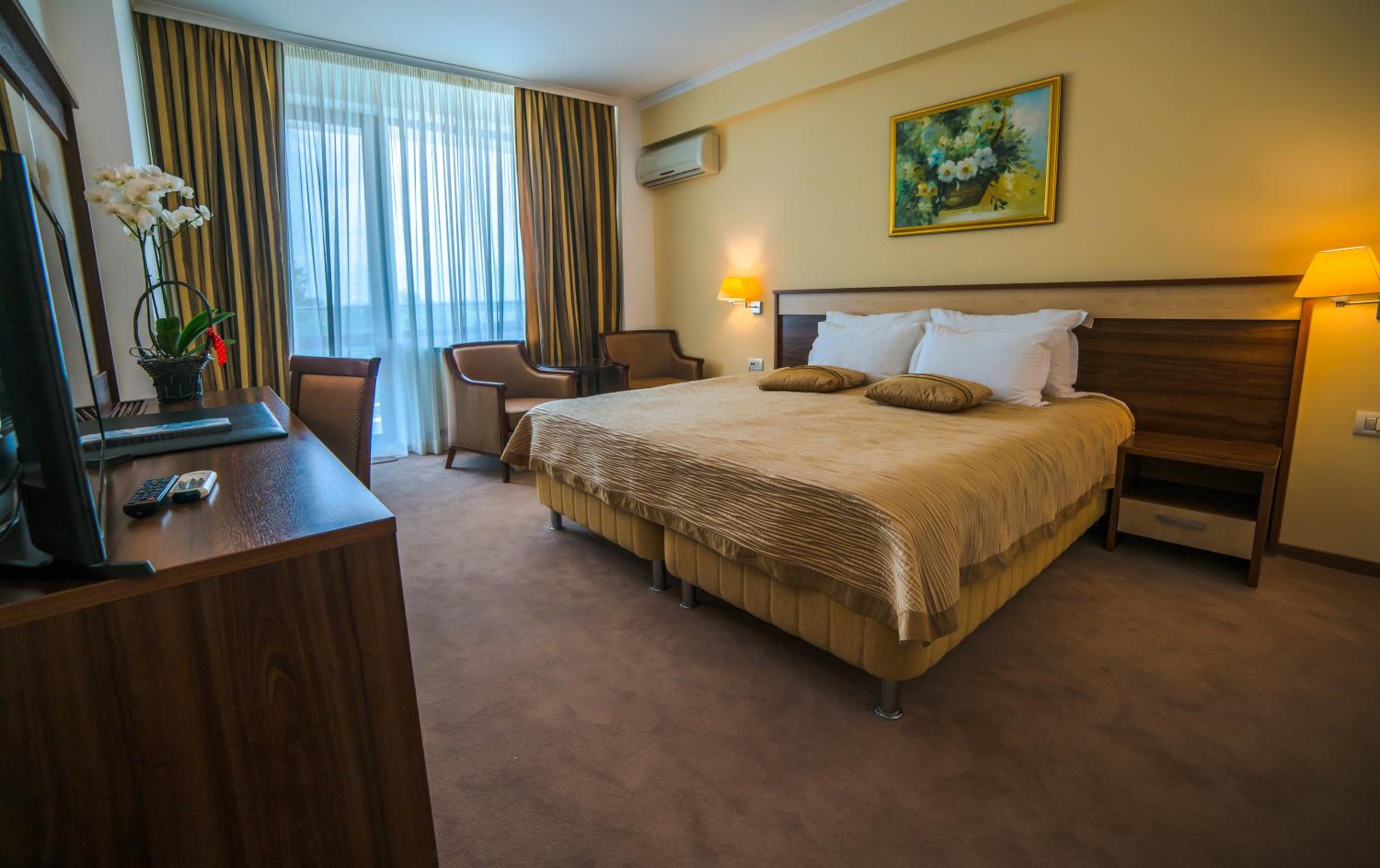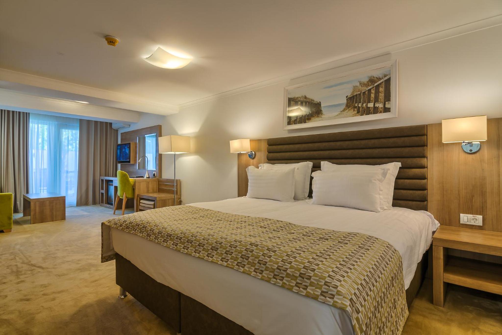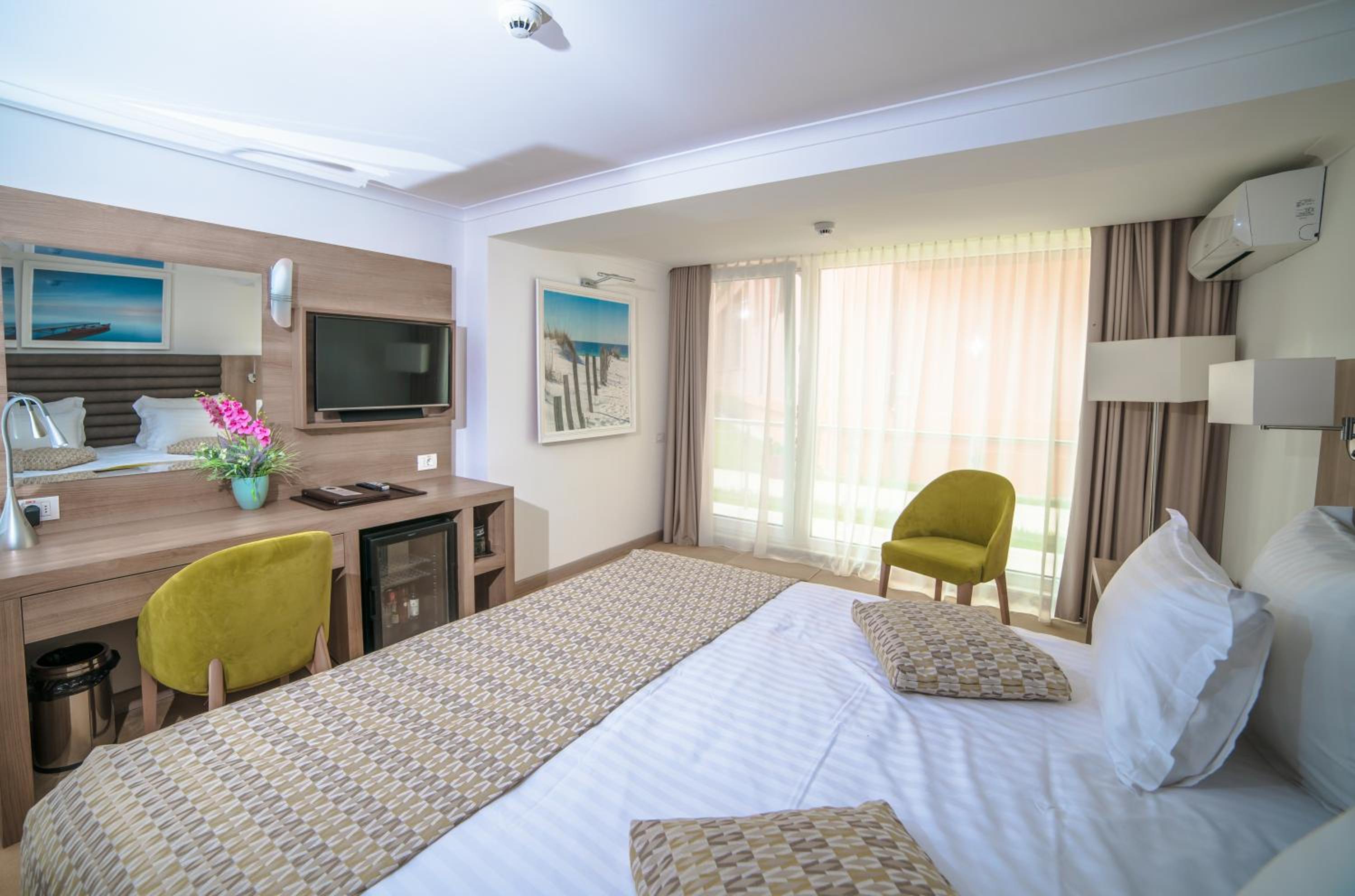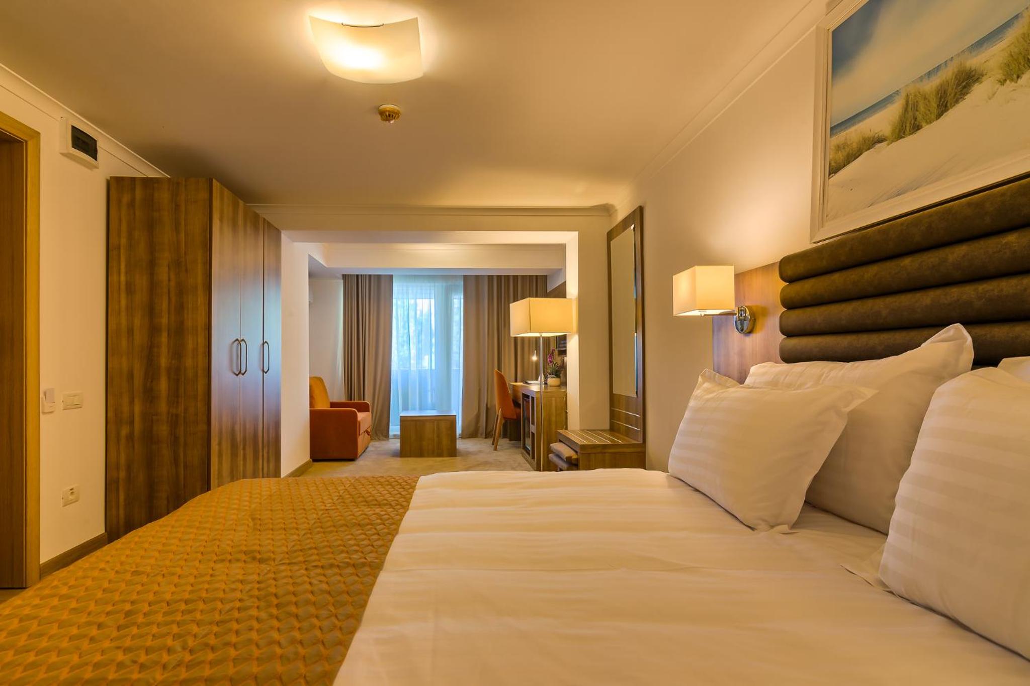 Cât de cât, aproape de mare. Plaja privata, unde mai mult de jumătate din clienți nu sunt din hotel, am auzit preț de 30 lei per șezlong/ zi. Pt clienții hotelului șezlong gratuit. Patul confortabil, 1 set de prosoape de plaja ( la 5 * se schimba dupa fiecare ieșire la mare, aici rămân aceleași tot sejurul). Minifrigider cu băuturi.