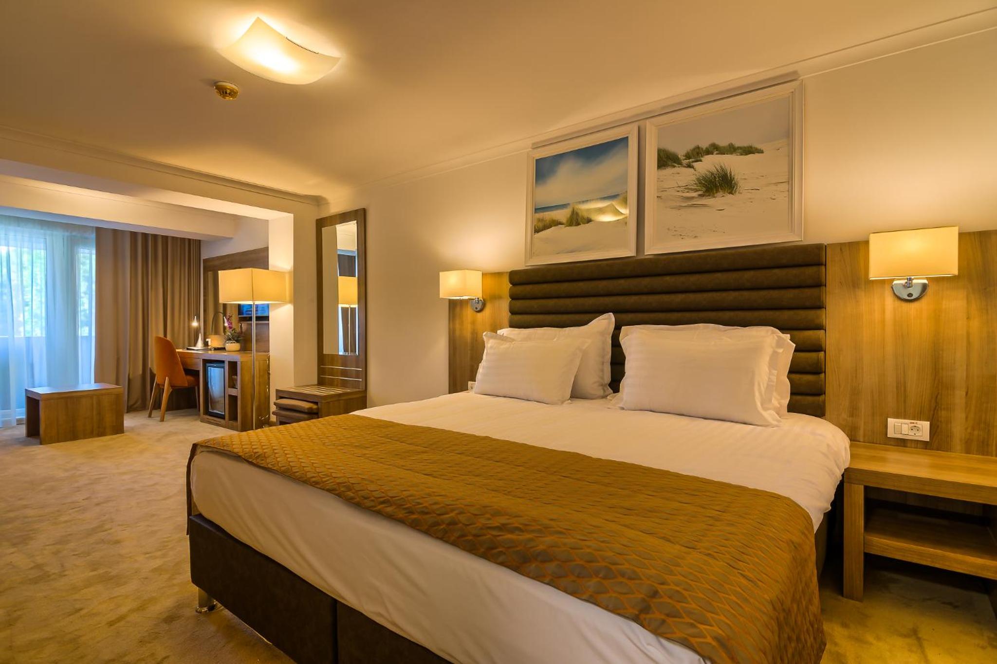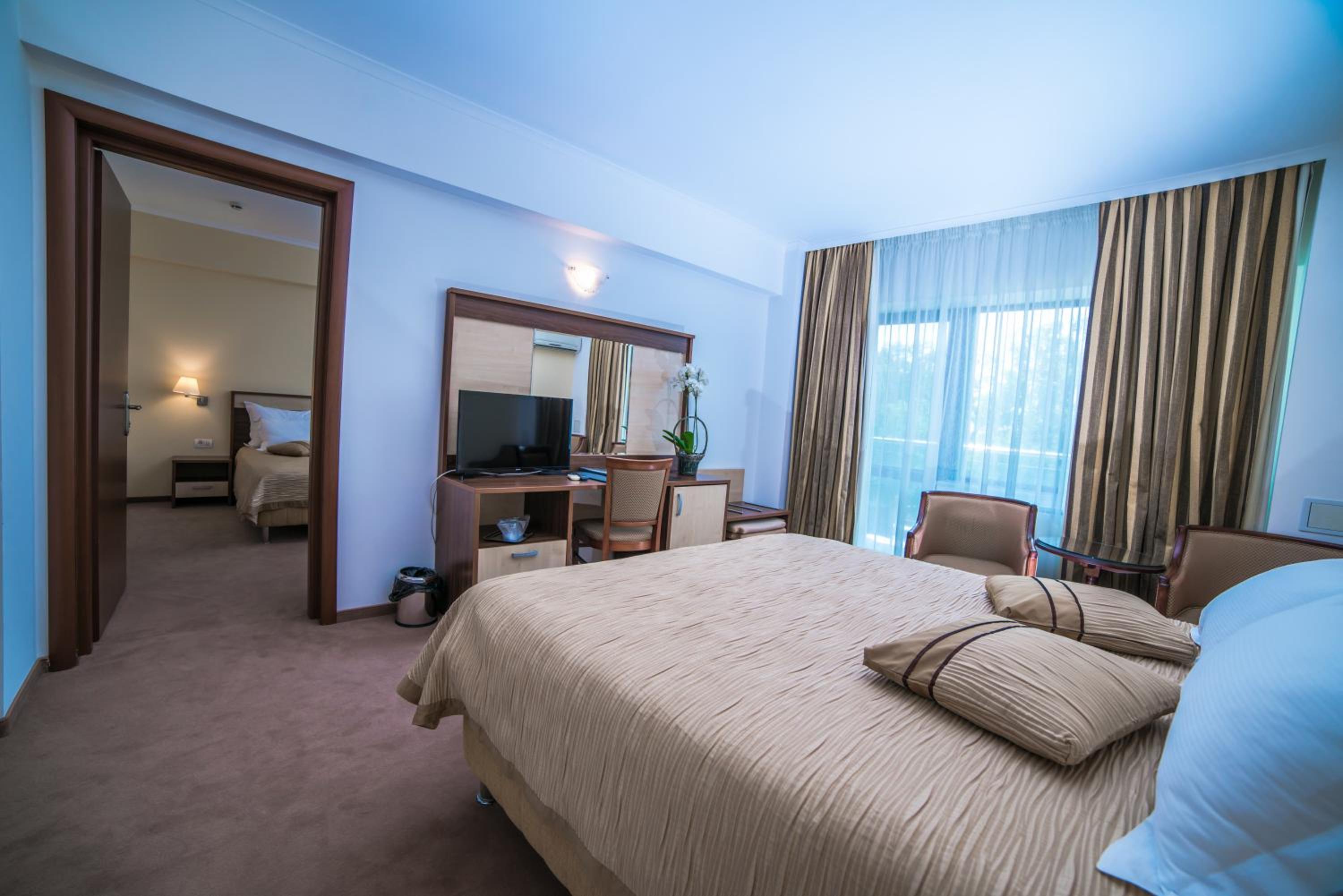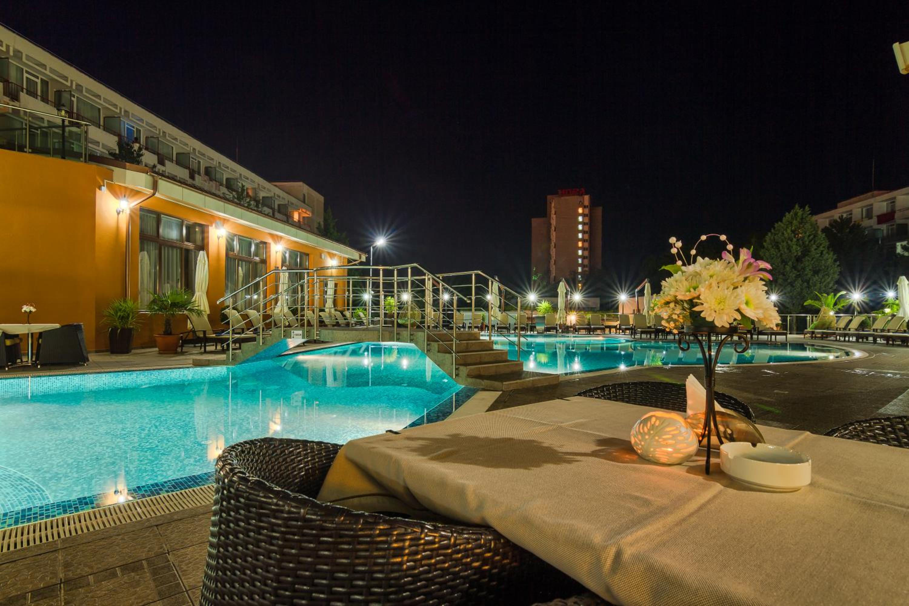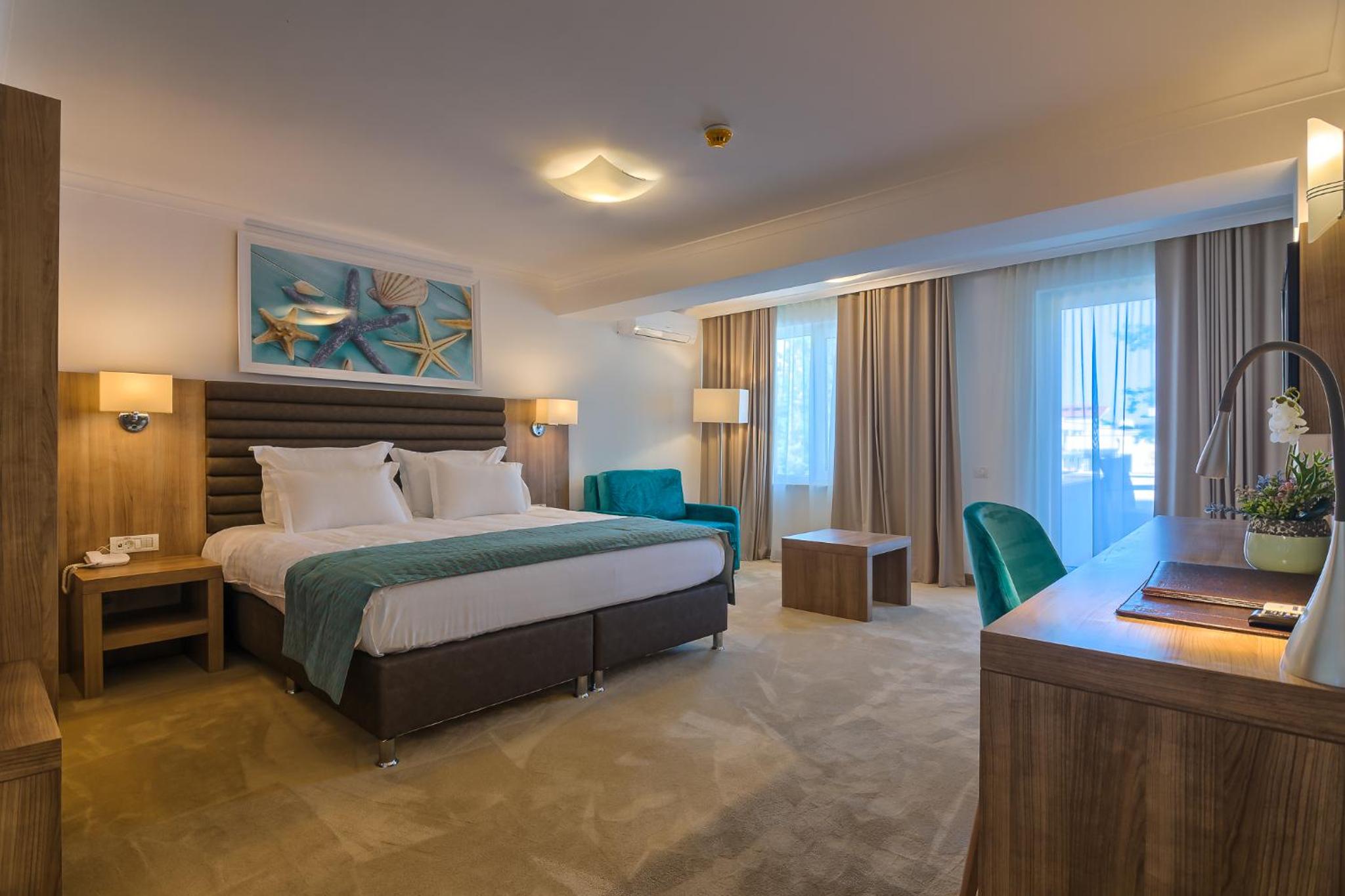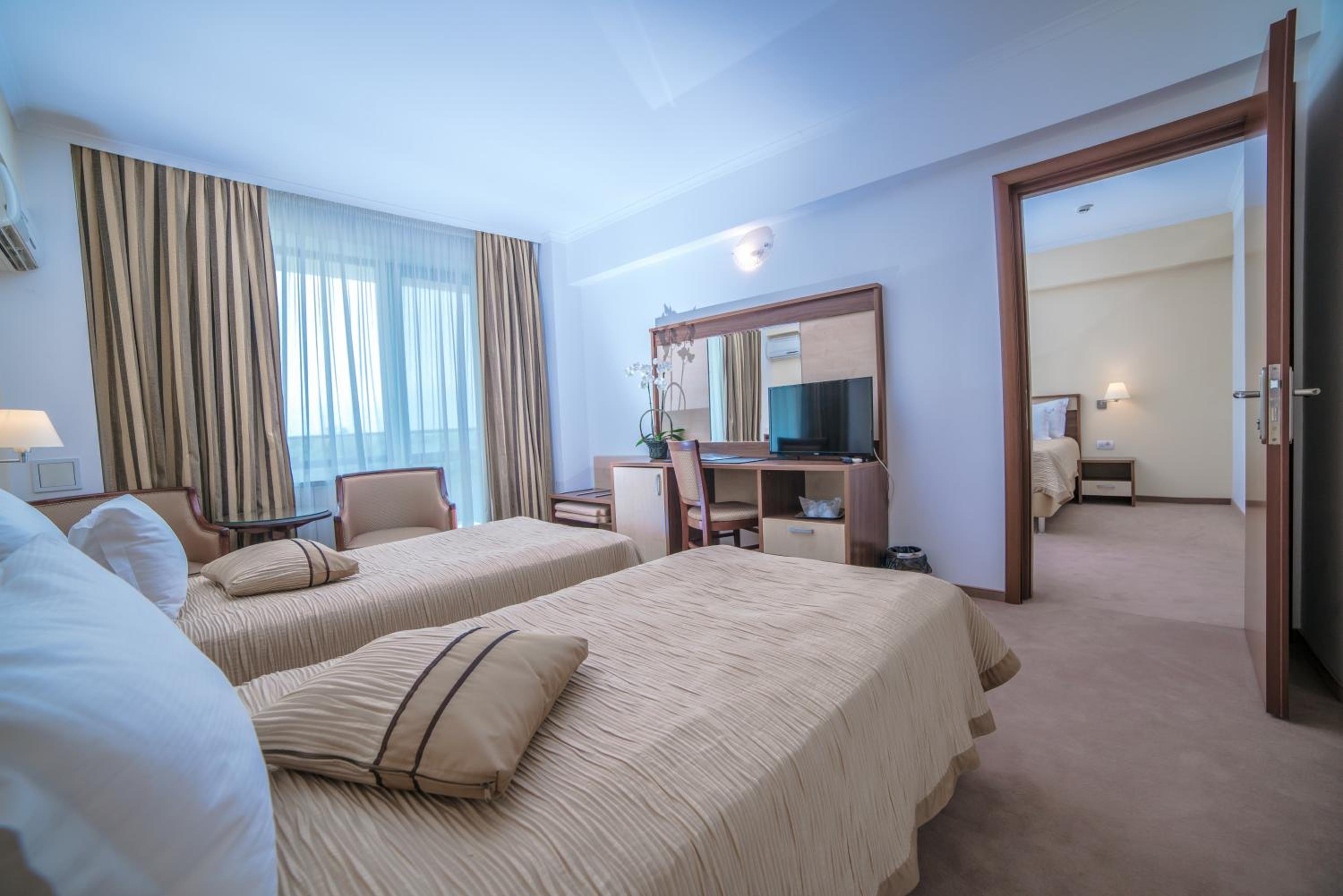 Cât de cât, aproape de mare. Plaja privata, unde mai mult de jumătate din clienți nu sunt din hotel, am auzit preț de 30 lei per șezlong/ zi. Pt clienții hotelului șezlong gratuit. Patul confortabil, 1 set de prosoape de plaja ( la 5 * se schimba dupa fiecare ieșire la mare, aici rămân aceleași tot sejurul). Minifrigider cu băuturi.