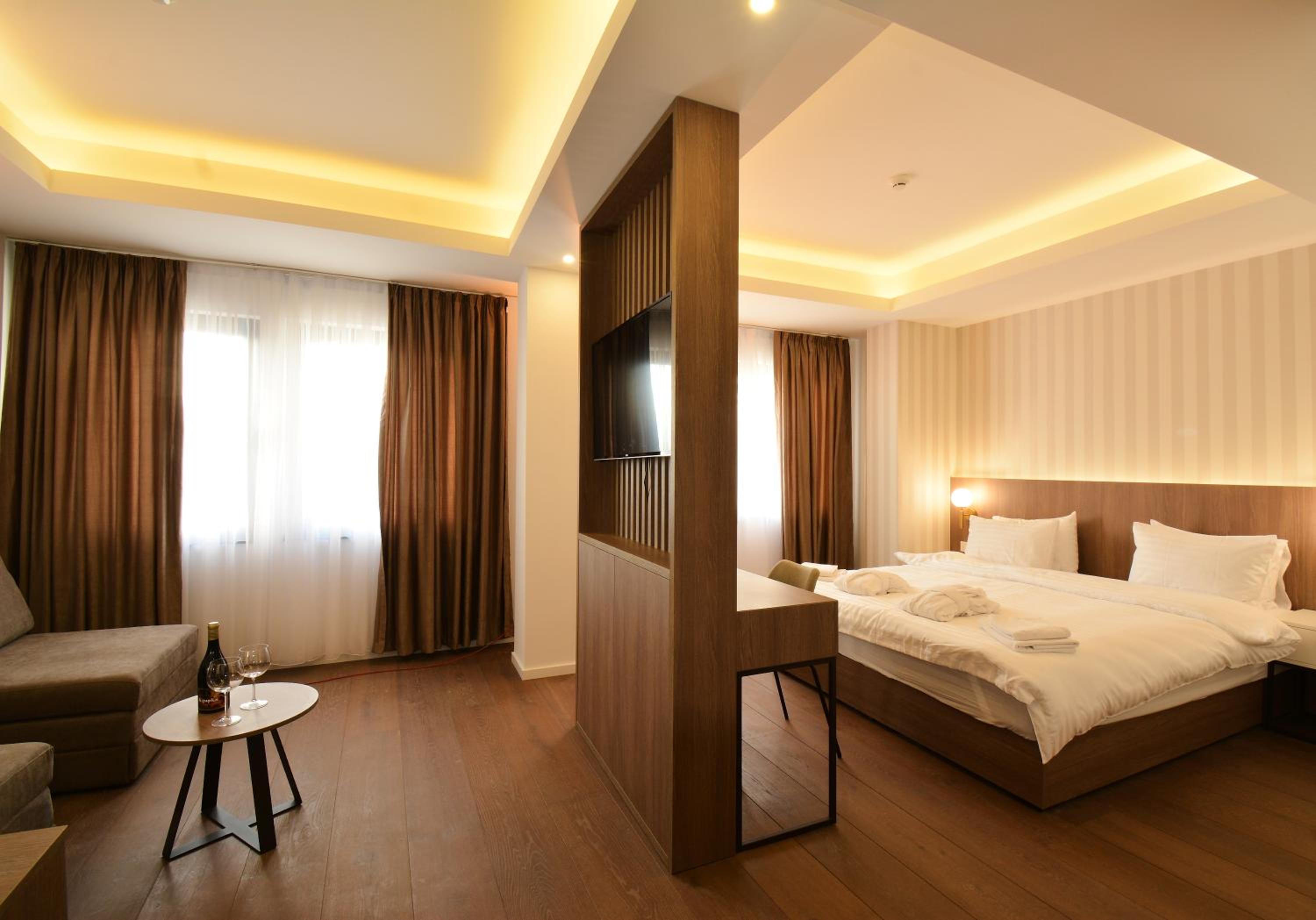 Geen heel groot Hotel, maar dat maakt het juist 'cosy'. In het centrum van Struga, maar daar krijg je in de kamer niets van mee. Alles op loopafstand. De prijs was super zeker in verhouding wat er geboden werd. Sauna klein maar fijn, misschien een klein nadeeltje, als je de sauna uitloopt staat je meteen in de gym. Bij het 'zout bad' zit je 'in de kijker' van de gym.
