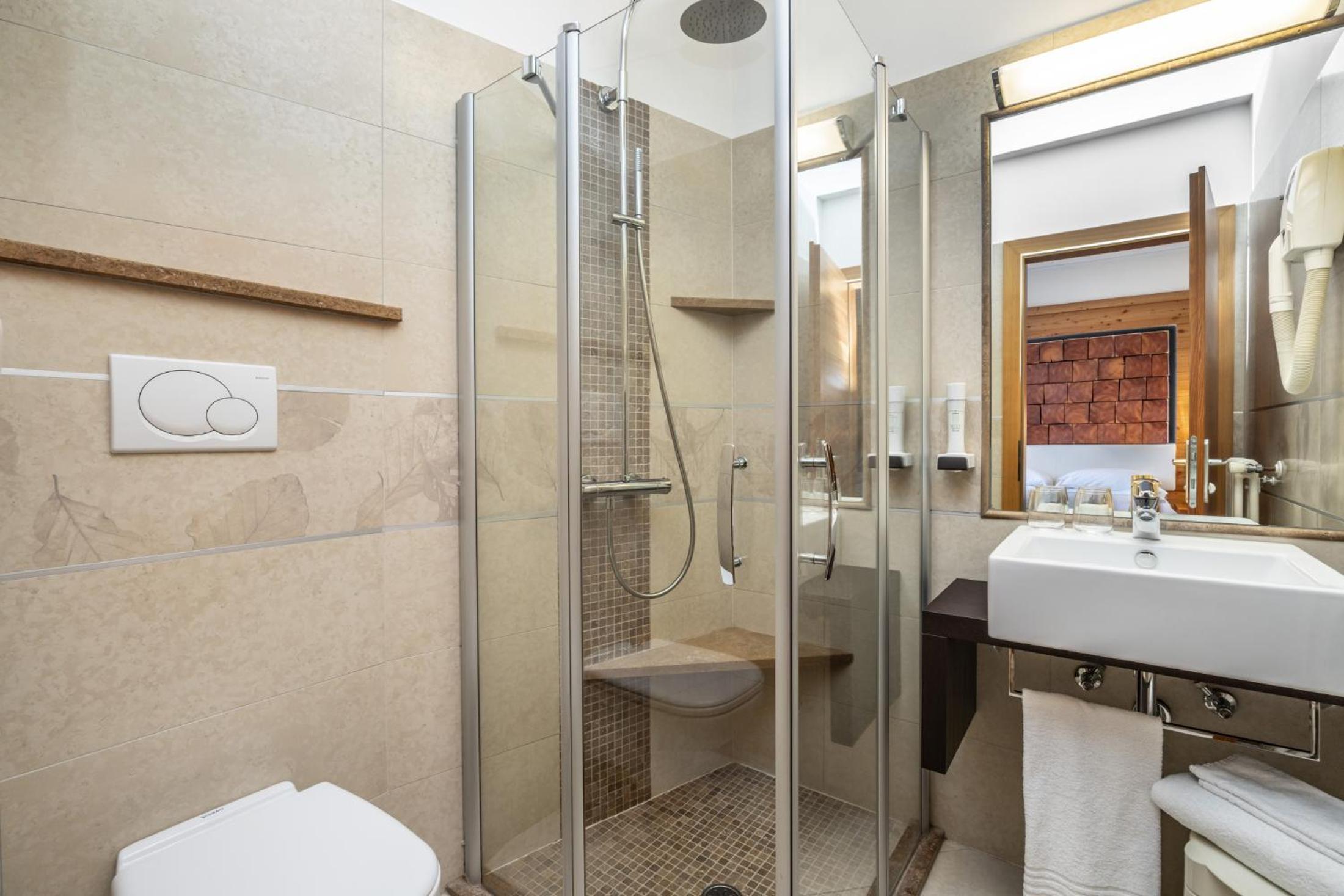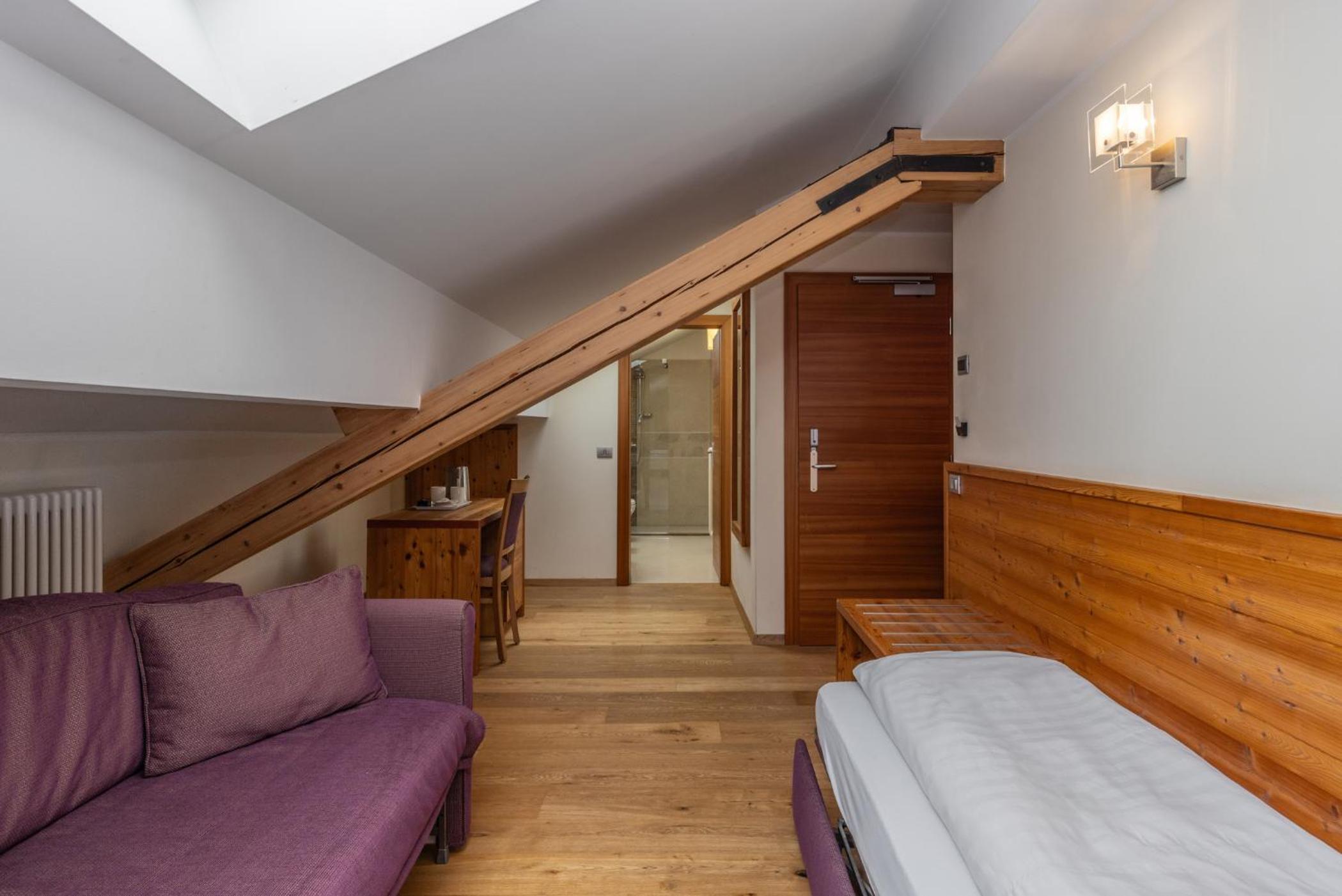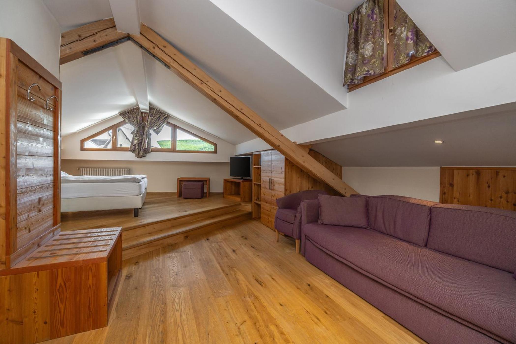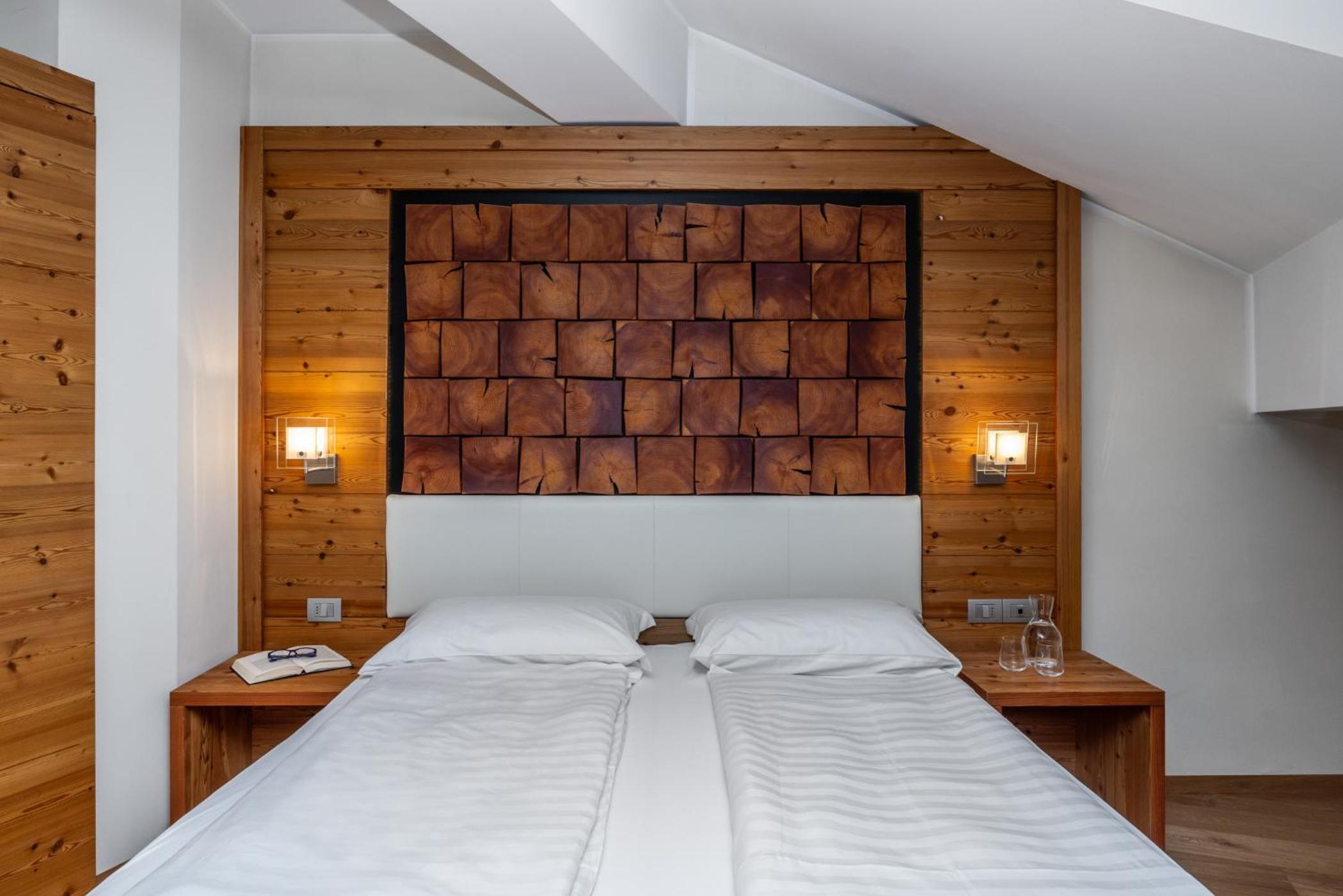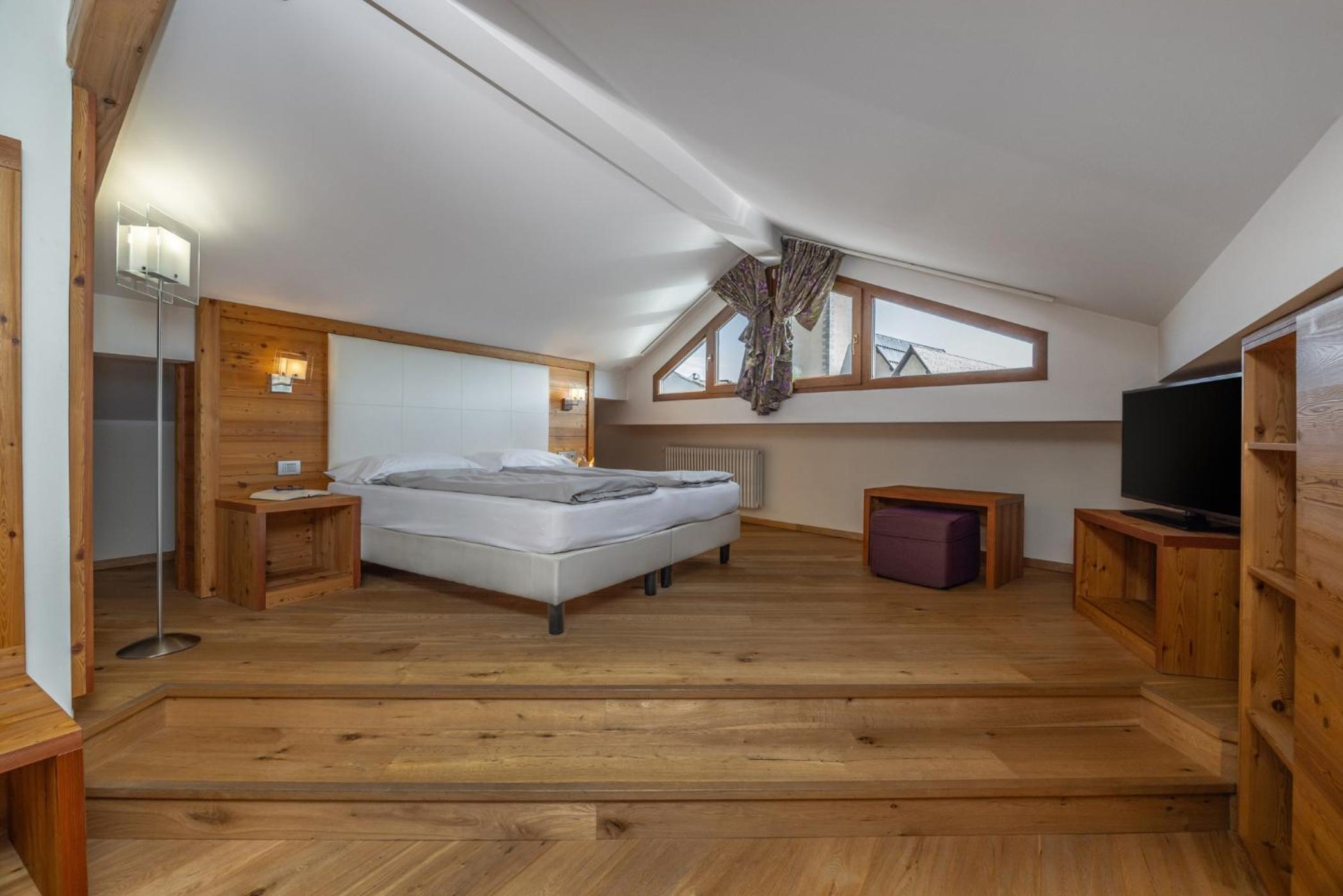 Luxurious Accommodations: Enjoy the comfort of modern Alpine rooms with flat-screen TVs and free Wi-Fi, all elegantly decorated with light wood furniture.