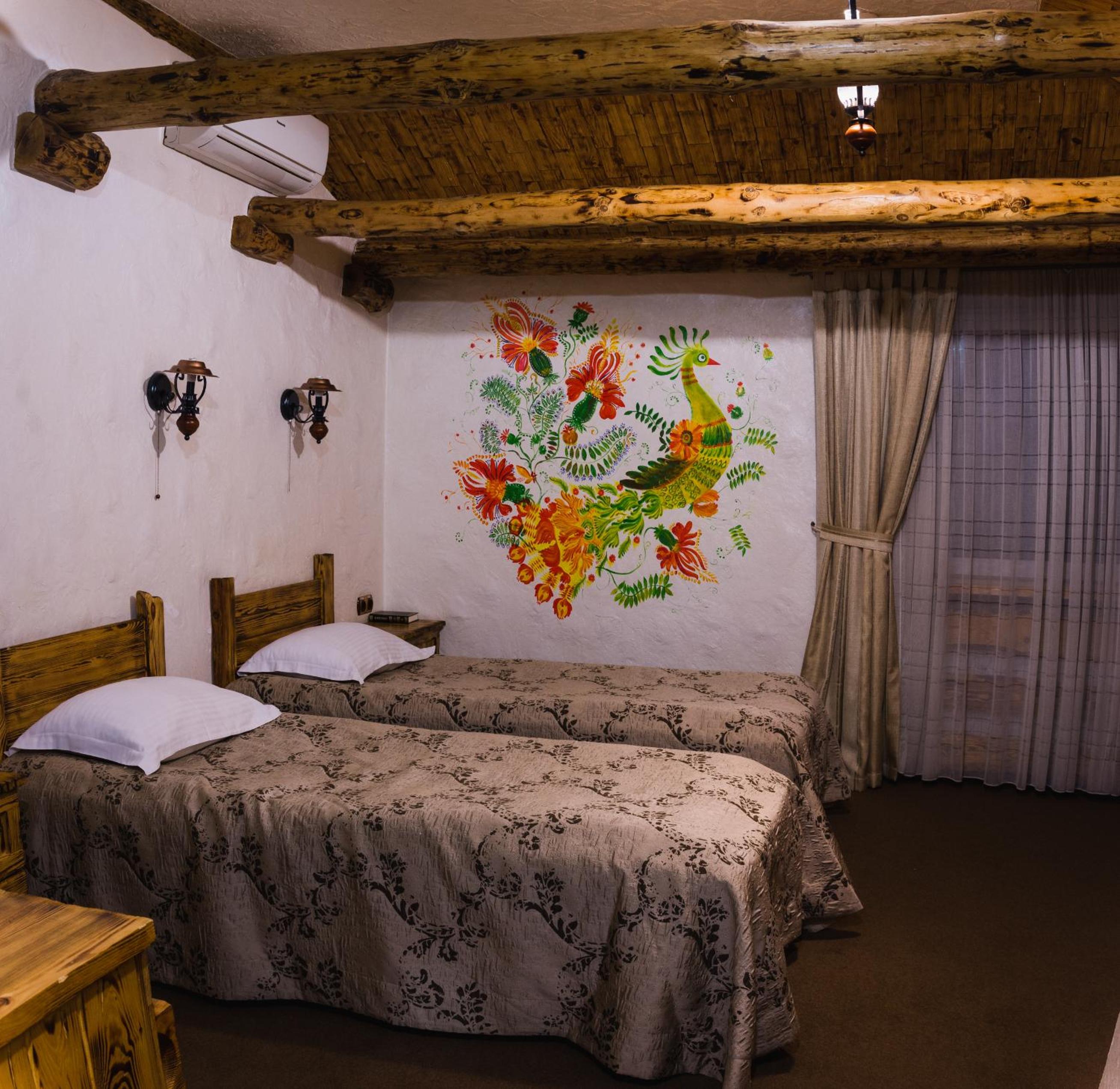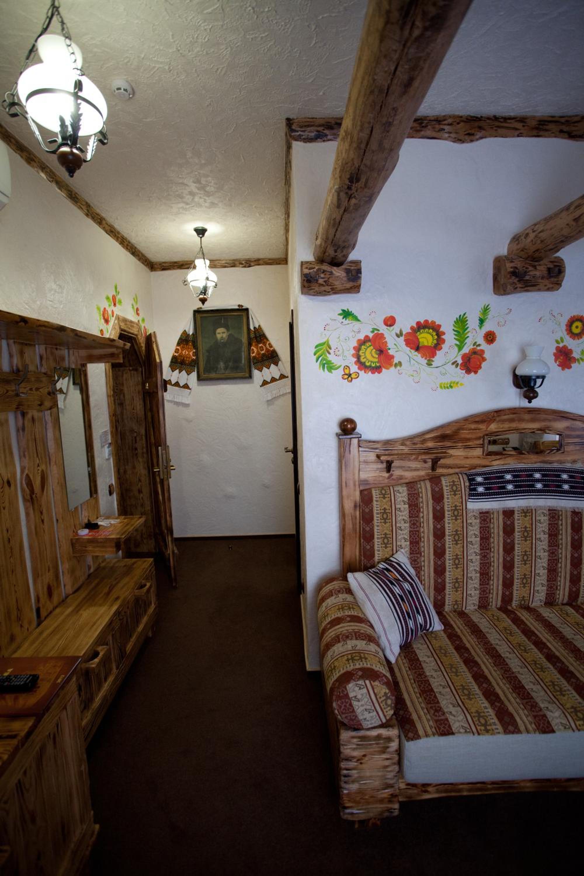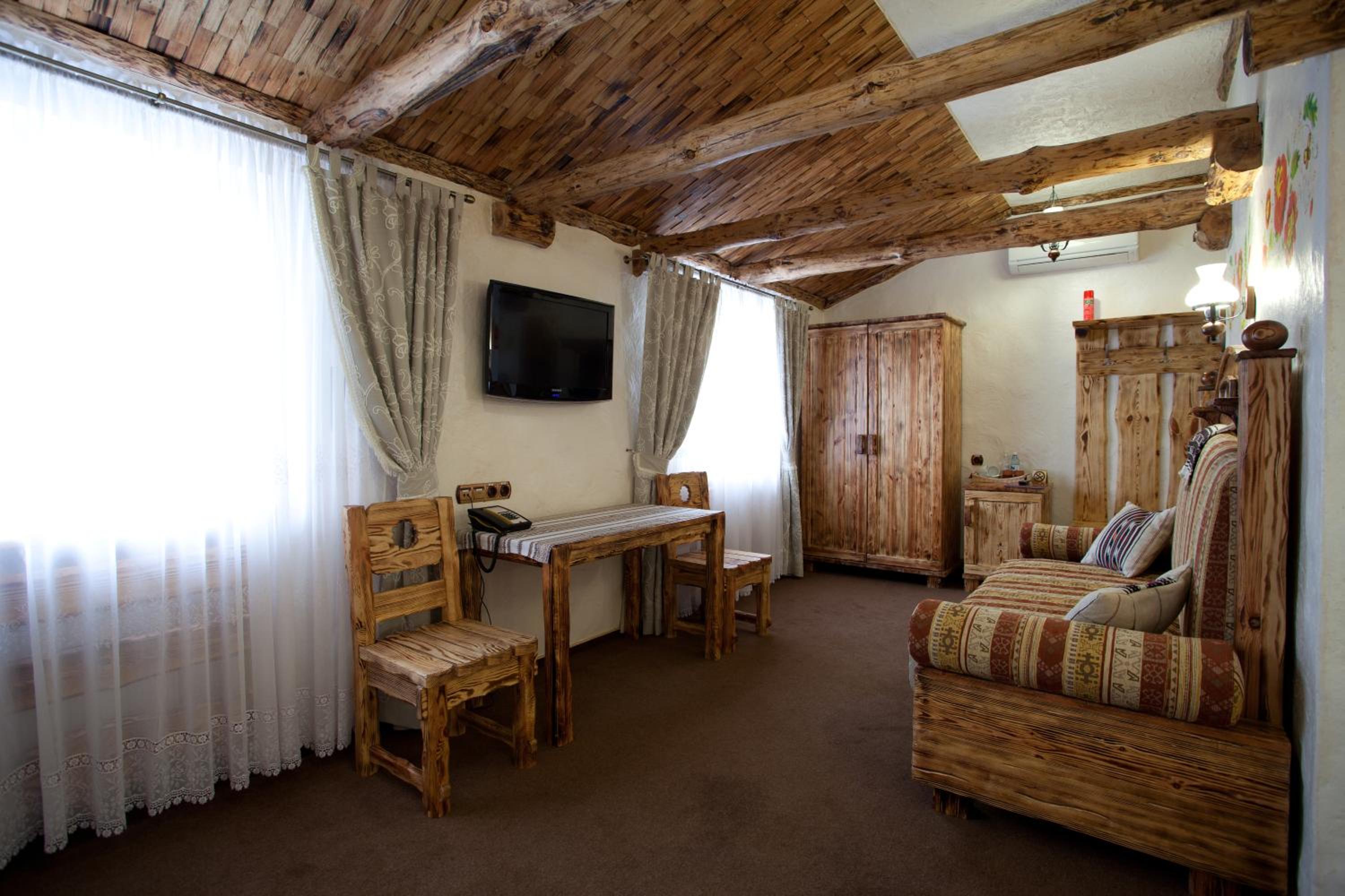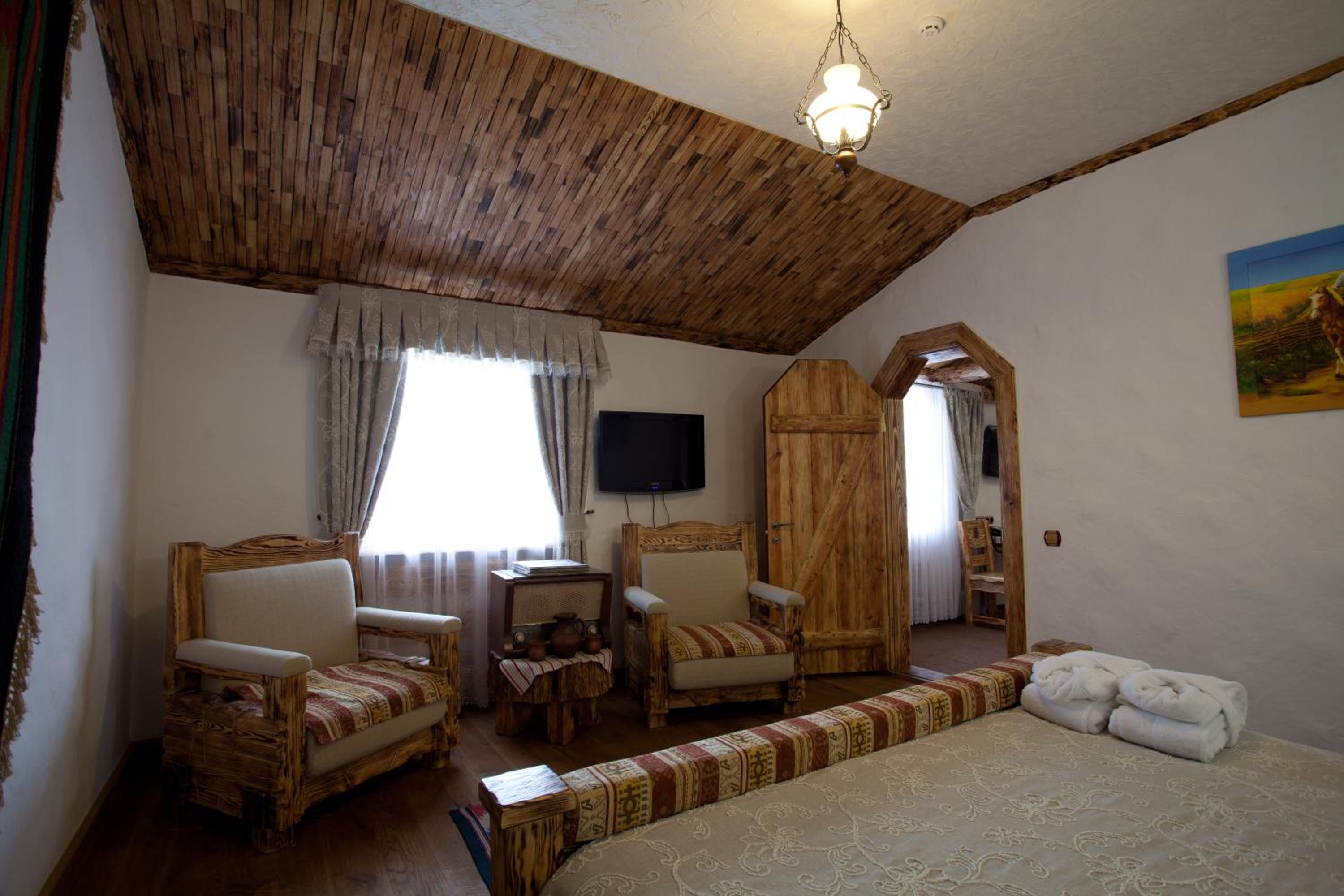 Each uniquely decorated room at Pidkova comes equipped with modern amenities such as a kettle, fridge, hairdryer, and slippers, ensuring a comfortable stay for every guest.